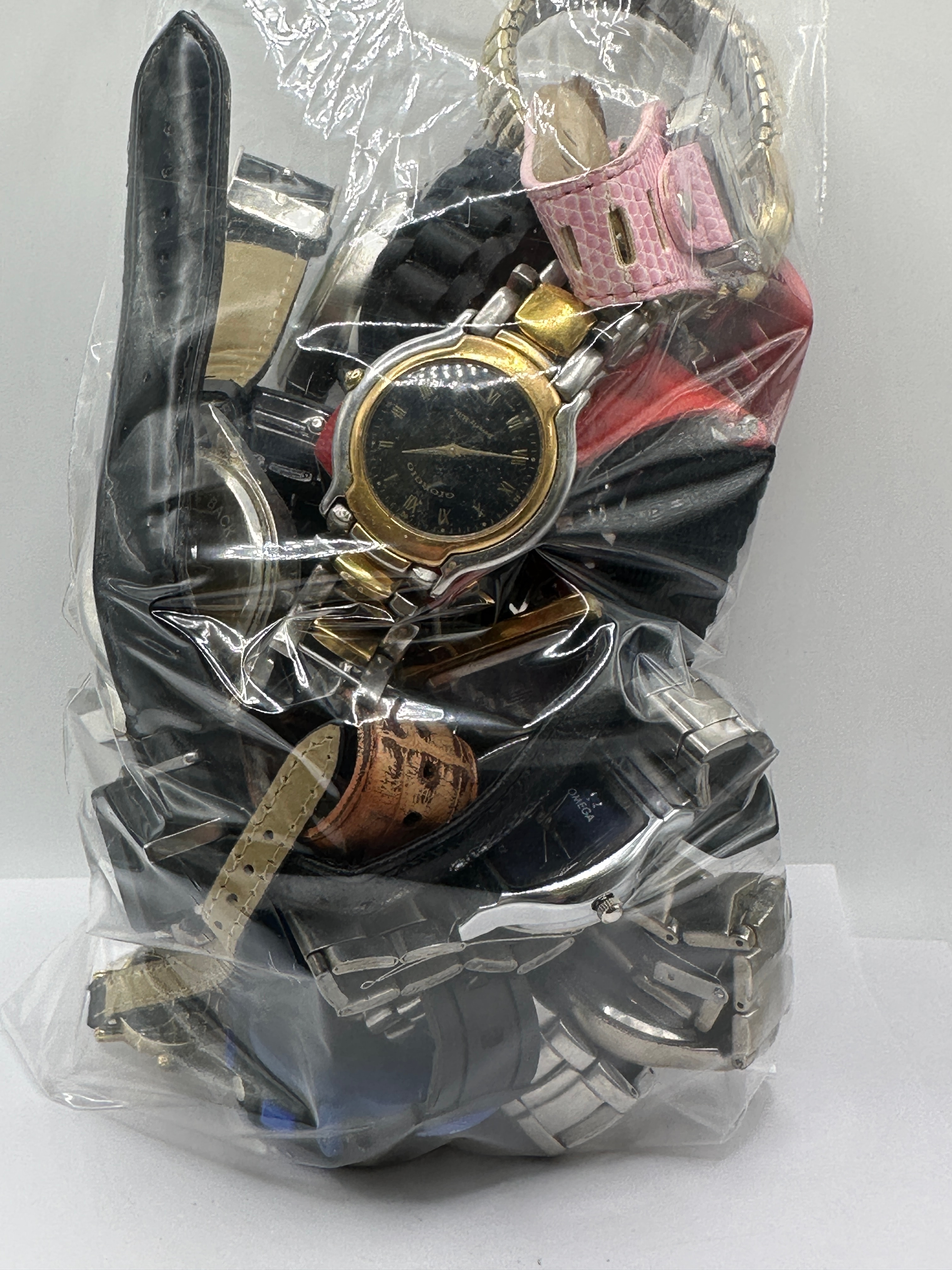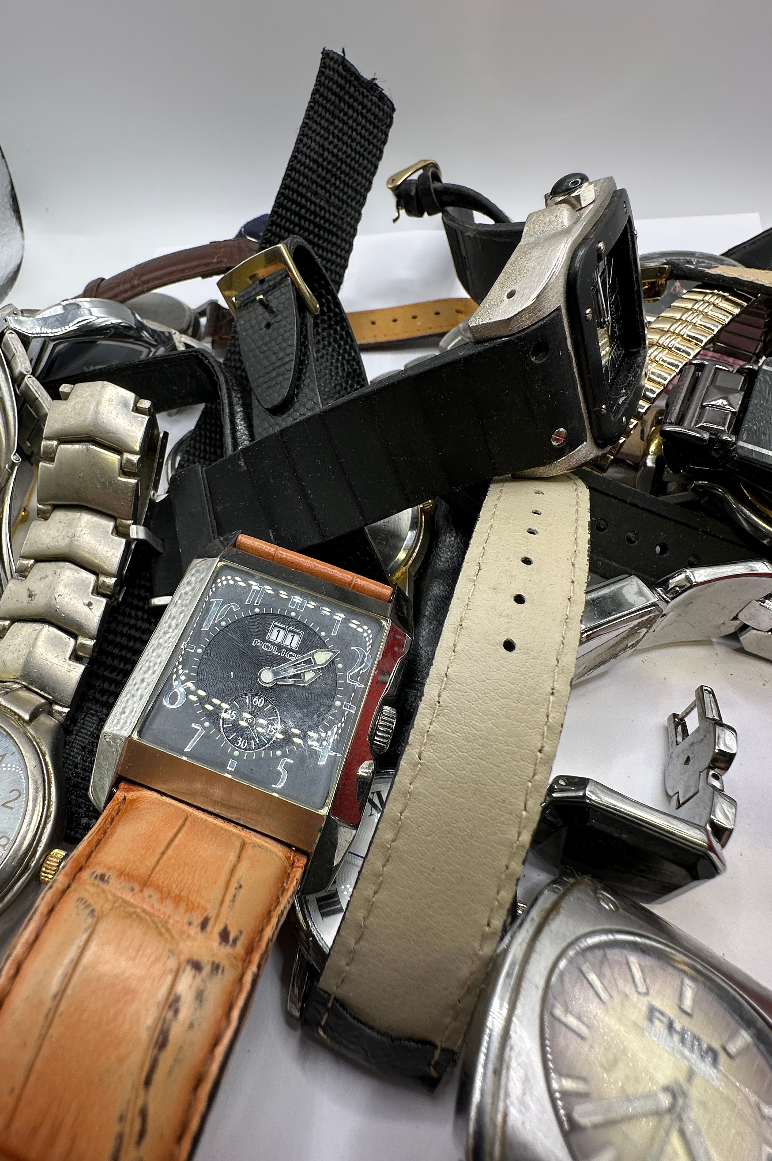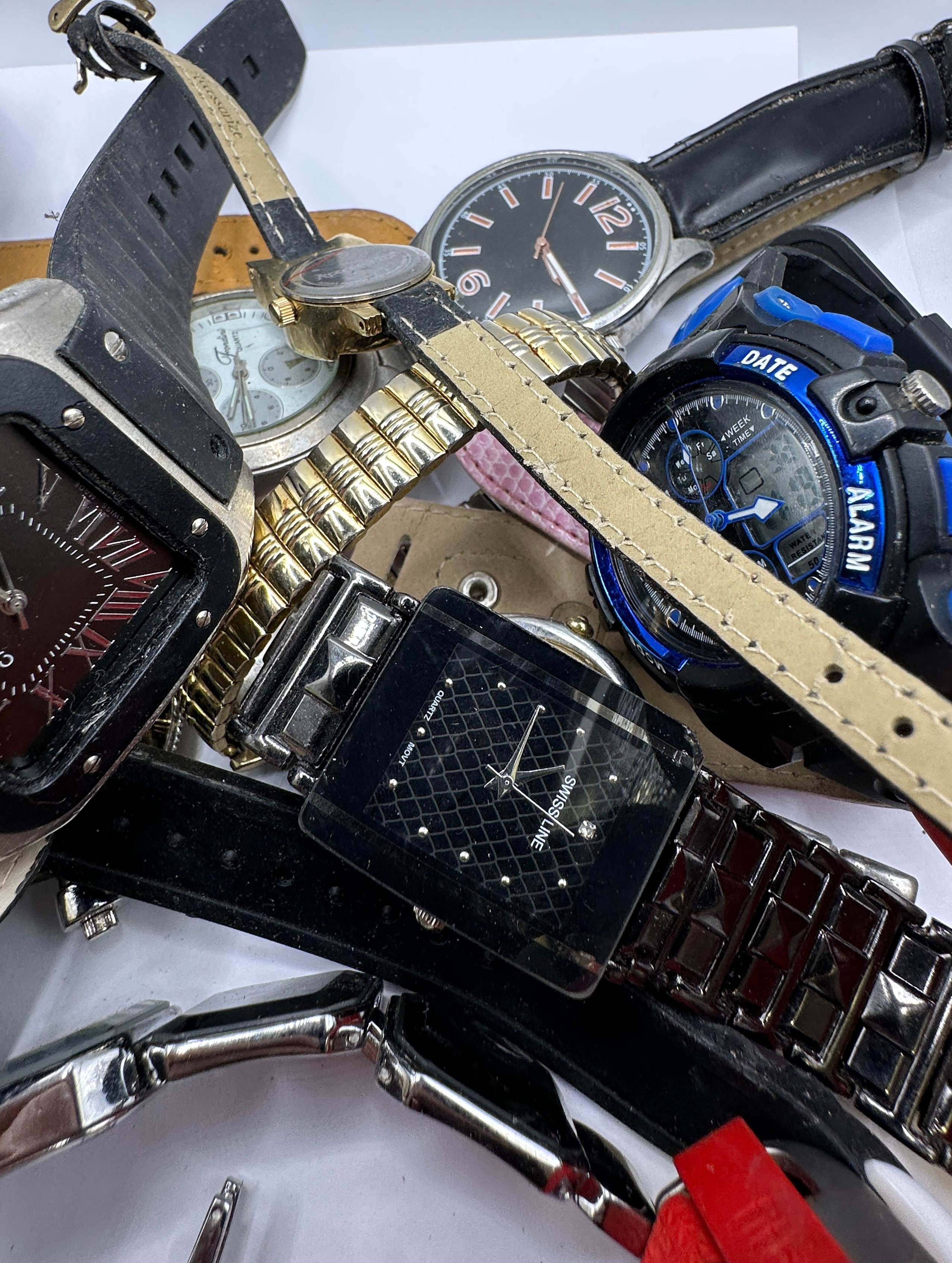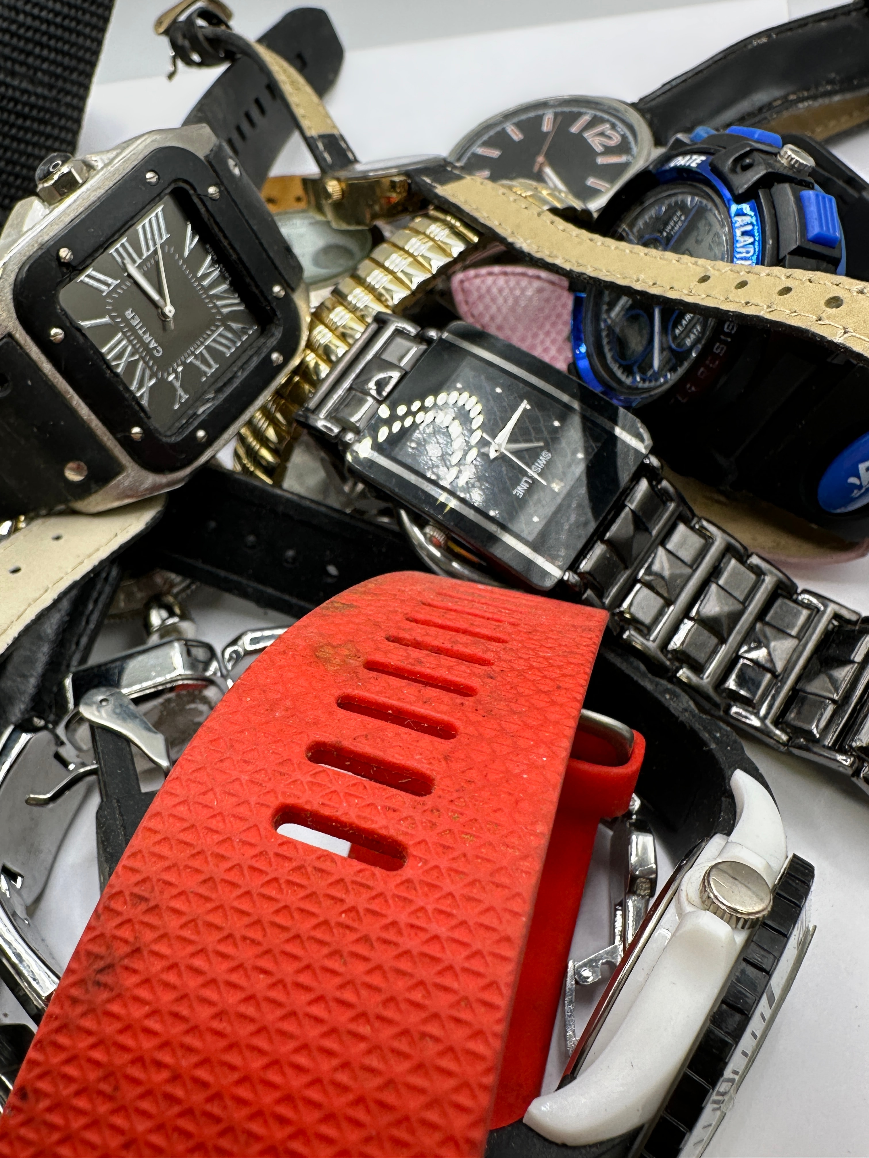 A collection of numerous assorted wristwatches, consistent with market listings for parts or repair lots. The collection exhibits a wide range of styles, from classic dress watches to modern casual and sports models, featuring both analog and digital displays. Various dial types are present, including Roman and Arabic numerals, and stick markers. Materials predominantly include different metals such as stainless steel, gold-tone, and silver-tone finishes for cases and bracelets, alongside straps made of leather, silicone/rubber, and textile. Visible brand names and markings include “CARTIER,” “SWISS LINE,” “BROGLIO,” “FHM,” “DATE,” “ALARM,” and “OROLOGIO.” The watches are consistent with late 20th to early 21st-century production.
