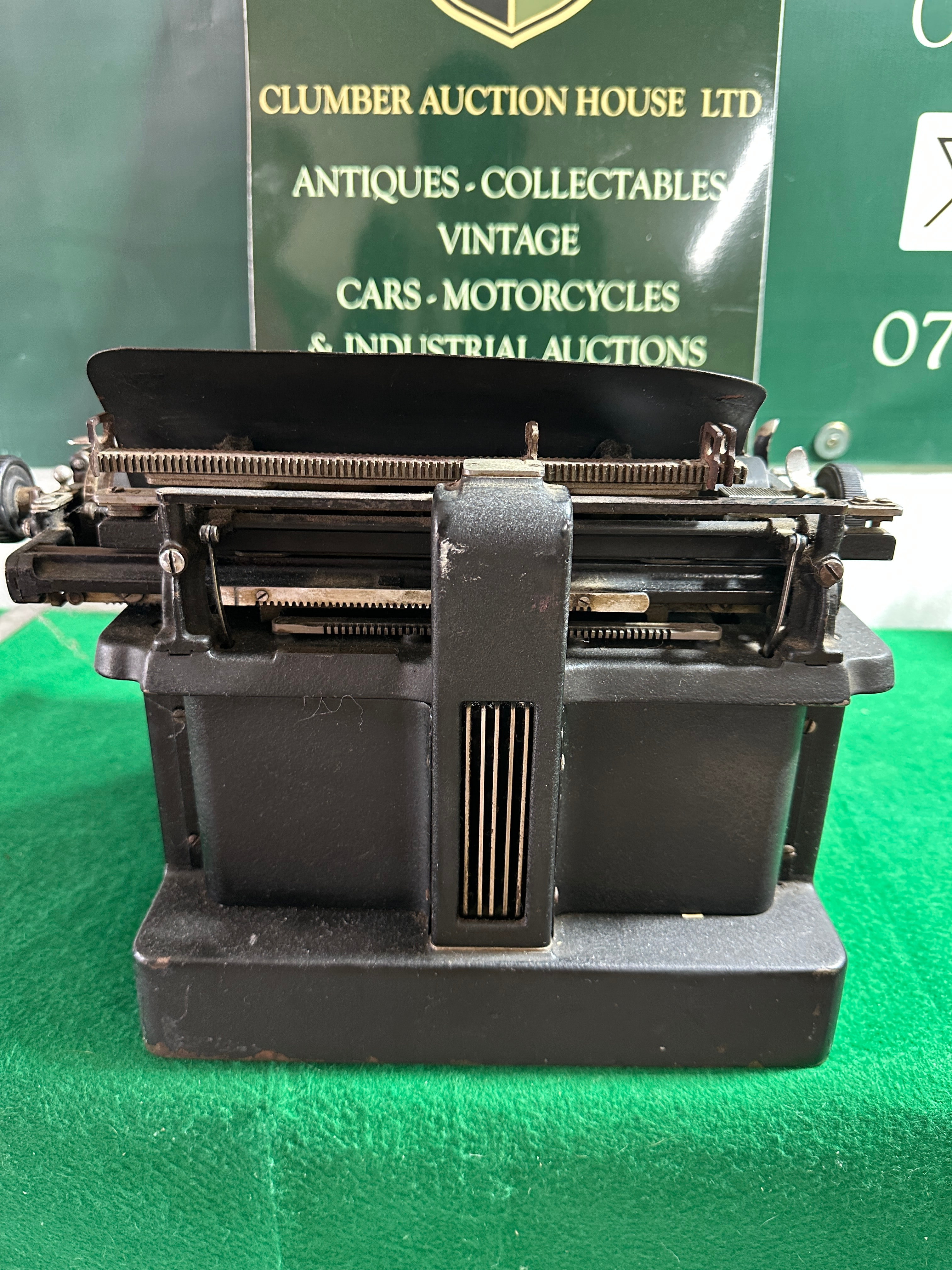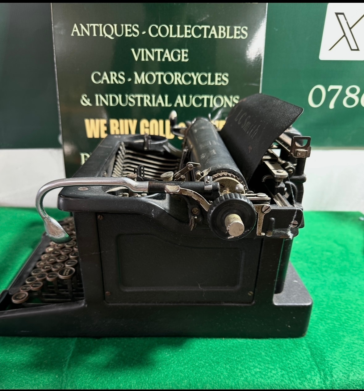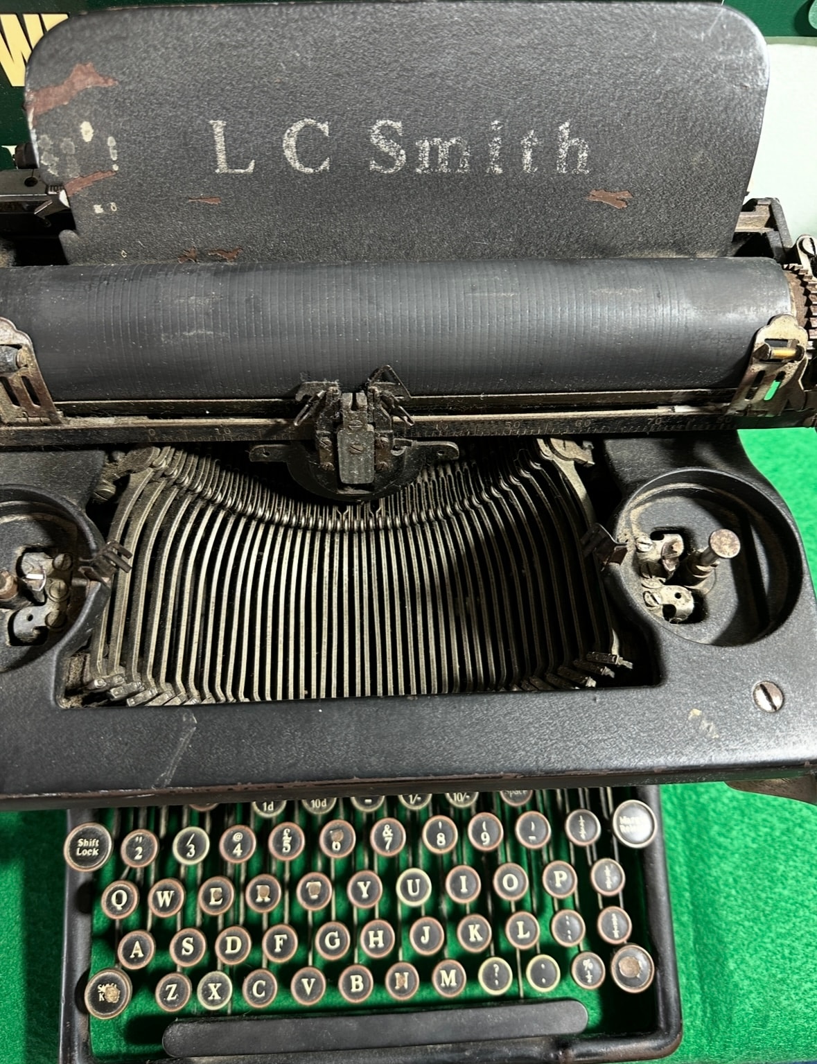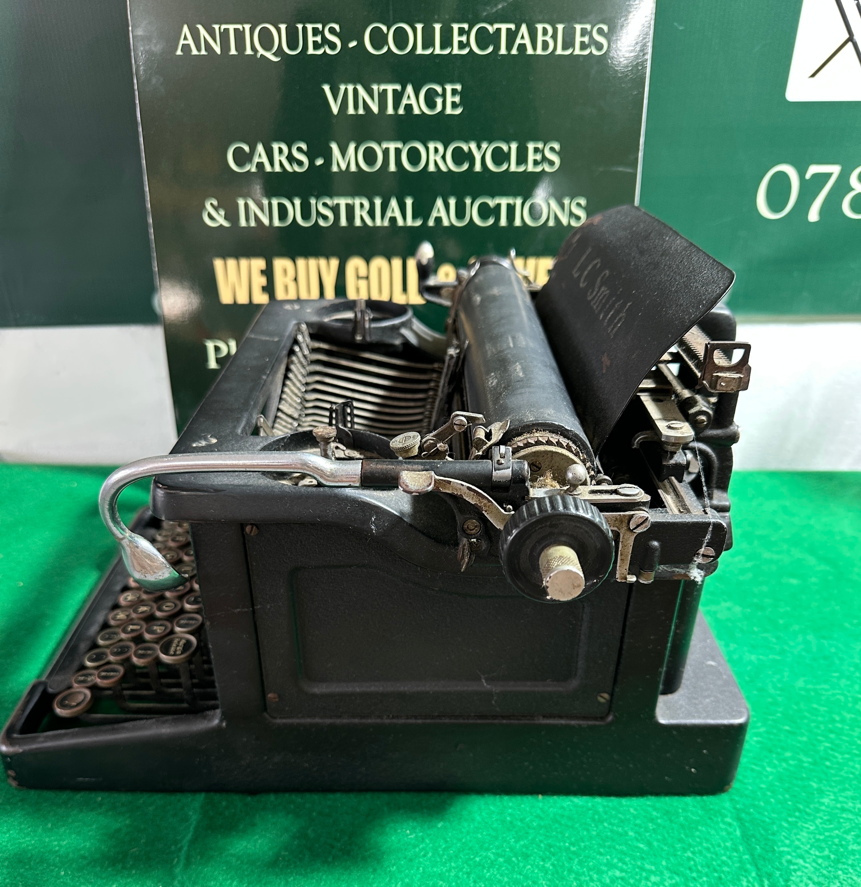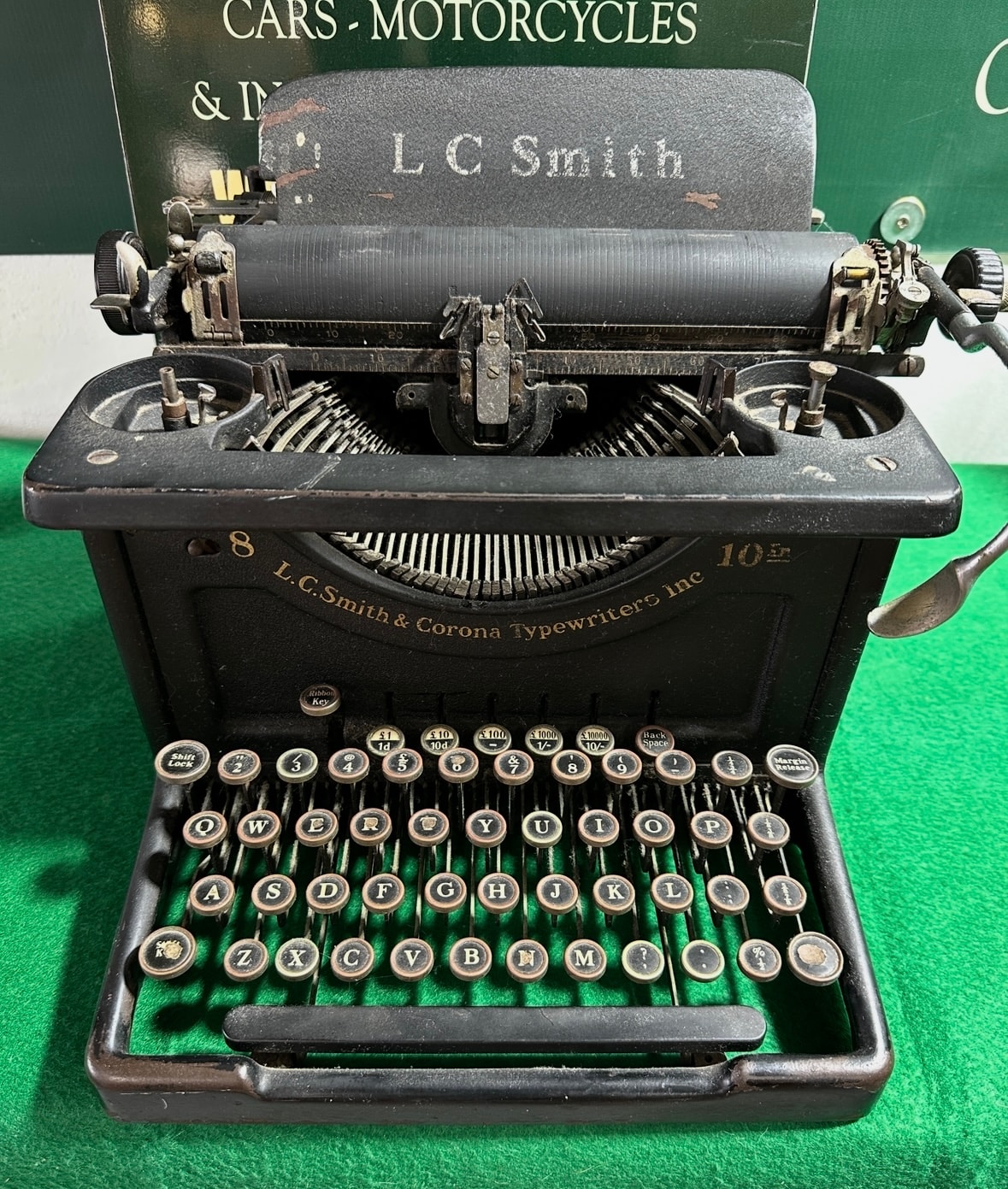 A vintage L. C. Smith & Corona No. 8 desktop typewriter, primarily constructed from black-painted metal with visible chrome or nickel-plated internal mechanisms and a rubber platen. The machine features a standard QWERTY keyboard. Clearly visible markings include “L. C. Smith” on the back paper guide and “L. C. Smith & Corona Typewriters Inc” on the front frame, alongside a visible “8” and “10” marking.