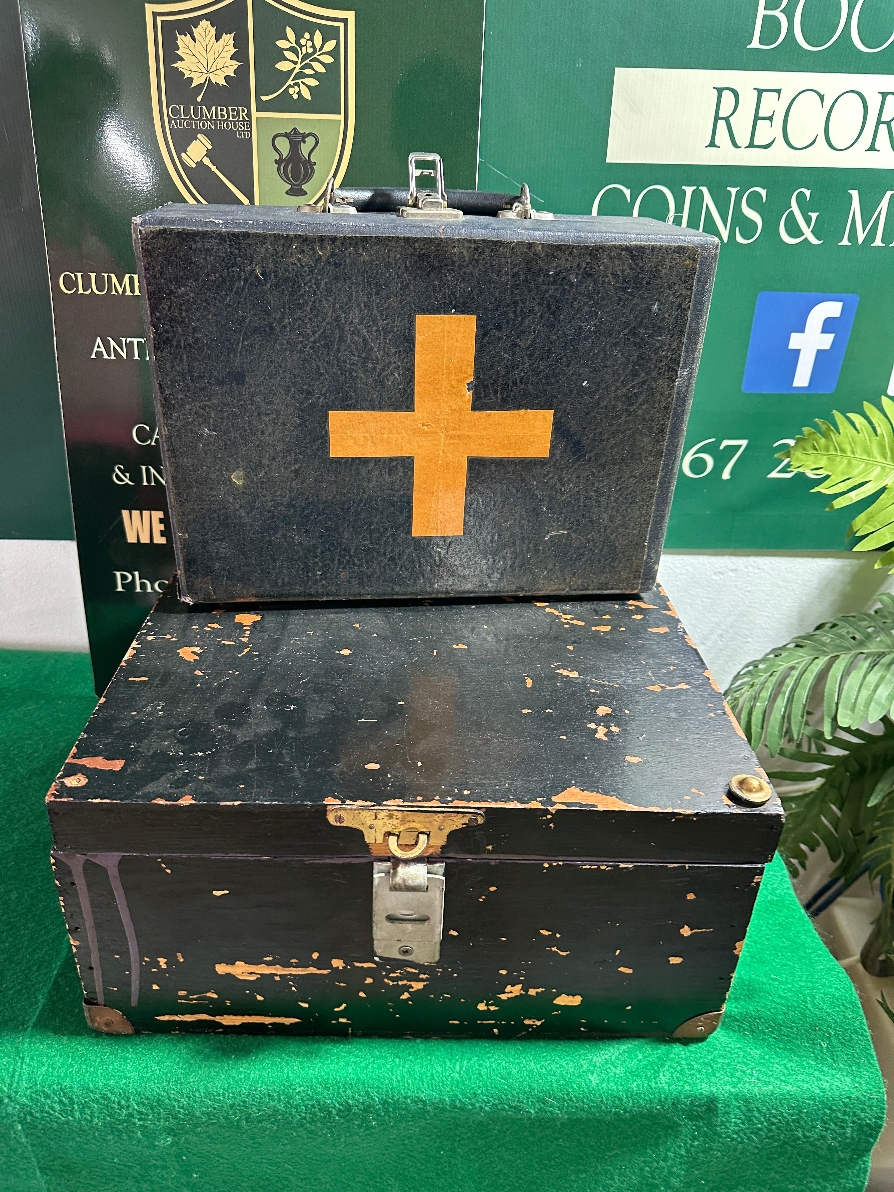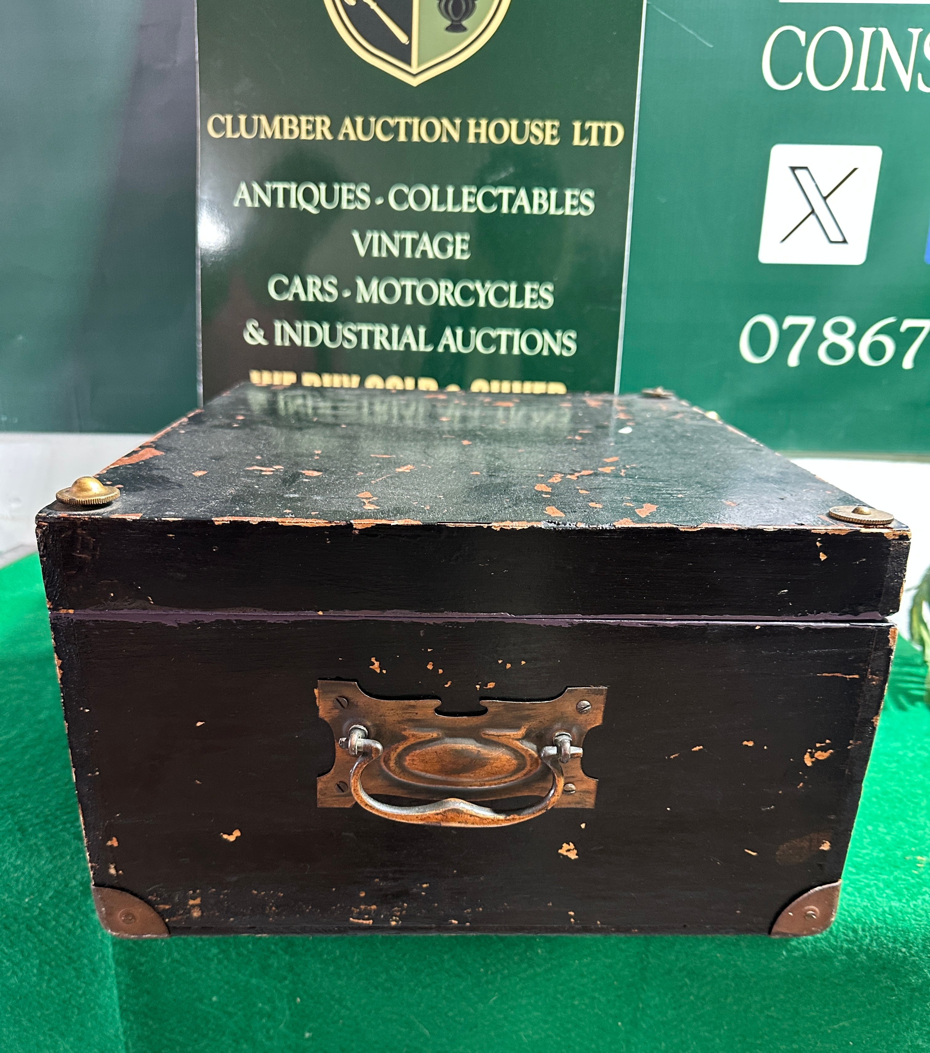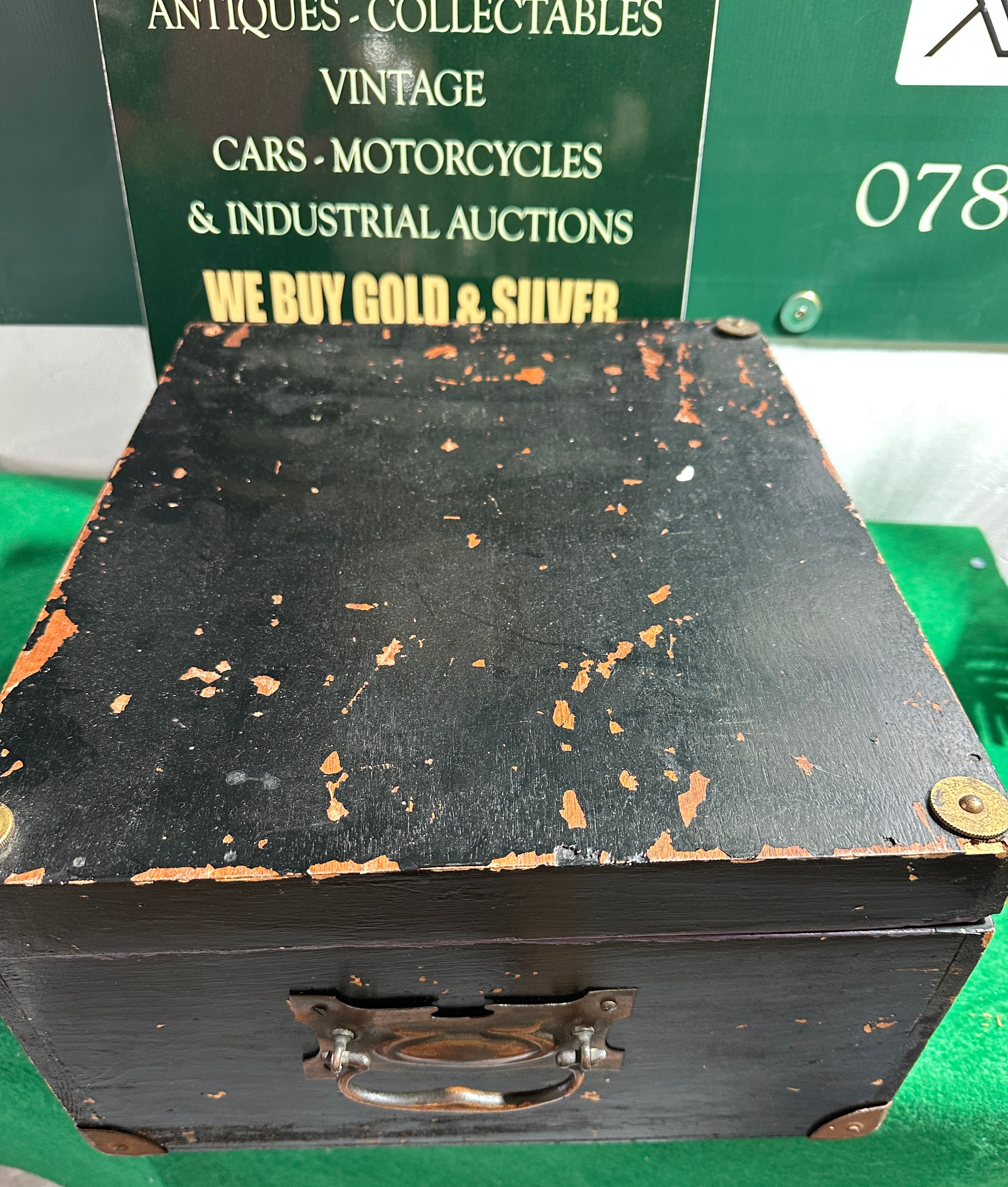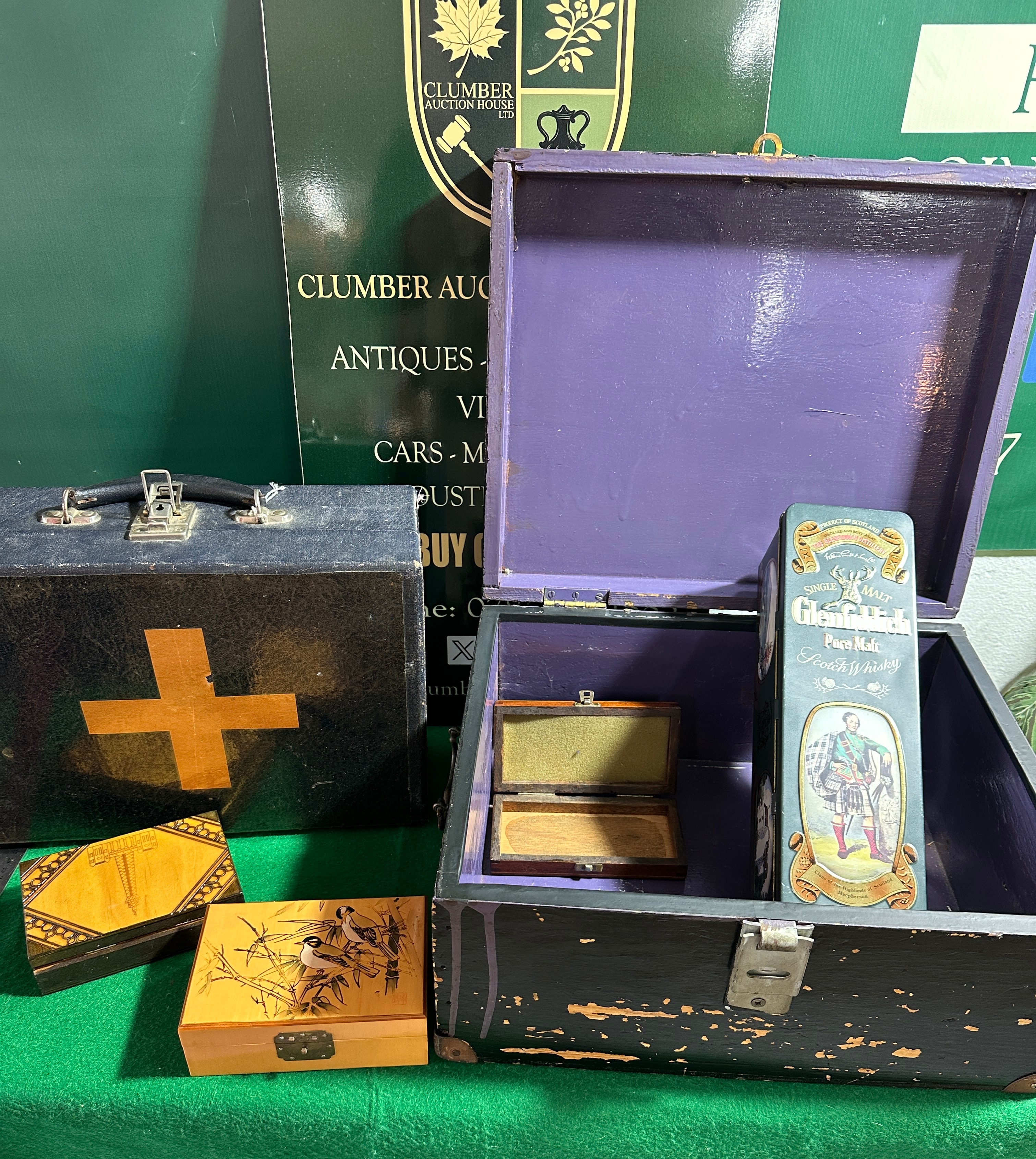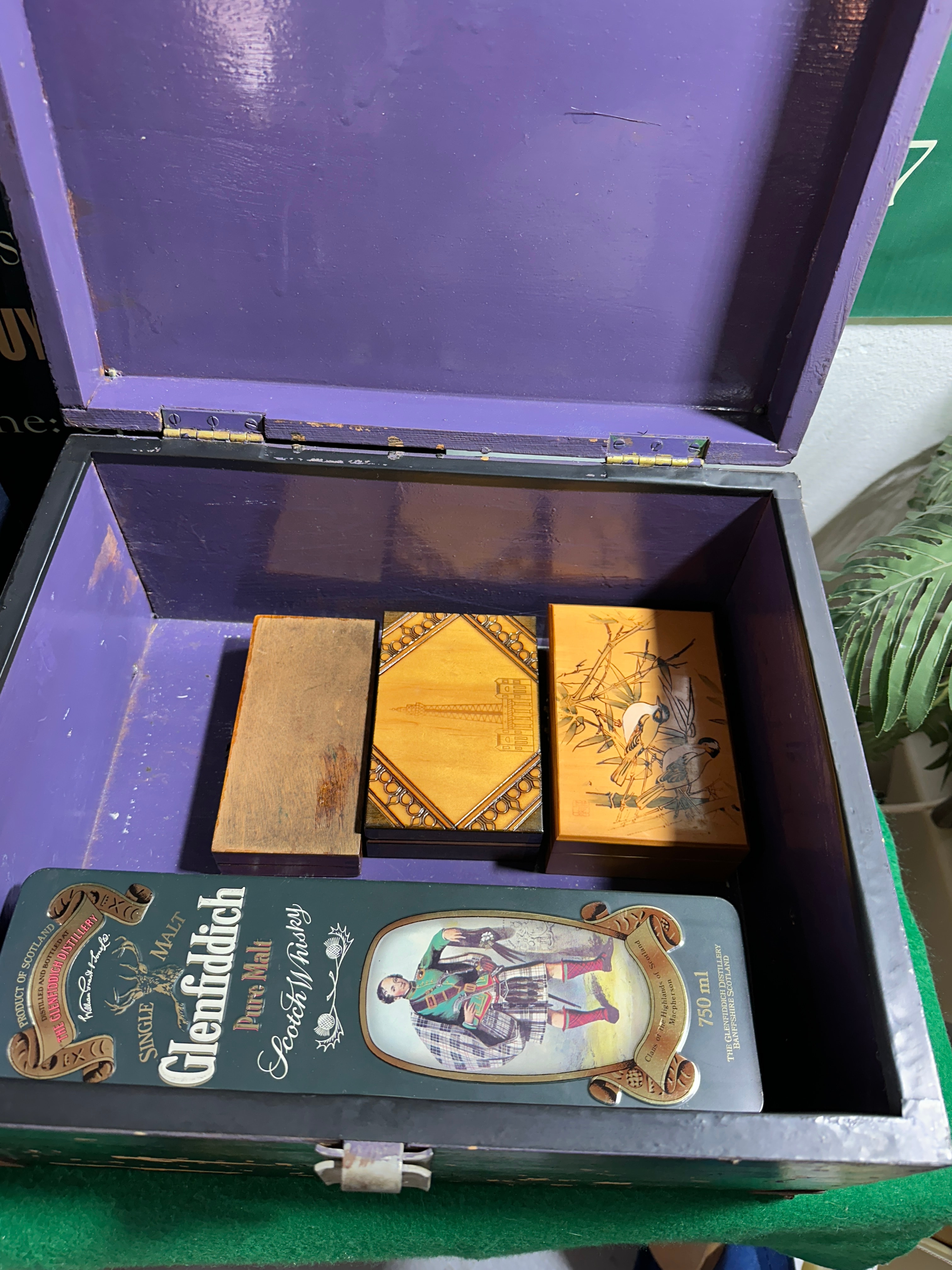 This lot presents an eclectic collection of vintage storage and decorative items. The primary piece is a large wooden trunk, painted black externally with significant paint loss revealing orange wood beneath, and a vibrant purple painted interior. It is equipped with metal hardware, including a front latch and corner protectors. Resting on top is a smaller vintage attaché-style case, likely leatherette, with a prominent orange cross on its exterior and an internal label reading “BREXTON MADE IN ENGLAND.” Within the larger trunk and nearby are three smaller wooden boxes, including a marquetry-style box, one with geometric carving, and another featuring an Asian-inspired etched bird motif. Also included is a metal Glenfiddich Single Malt Scotch Whisky presentation tin, bearing English text and an image of a Highlander.