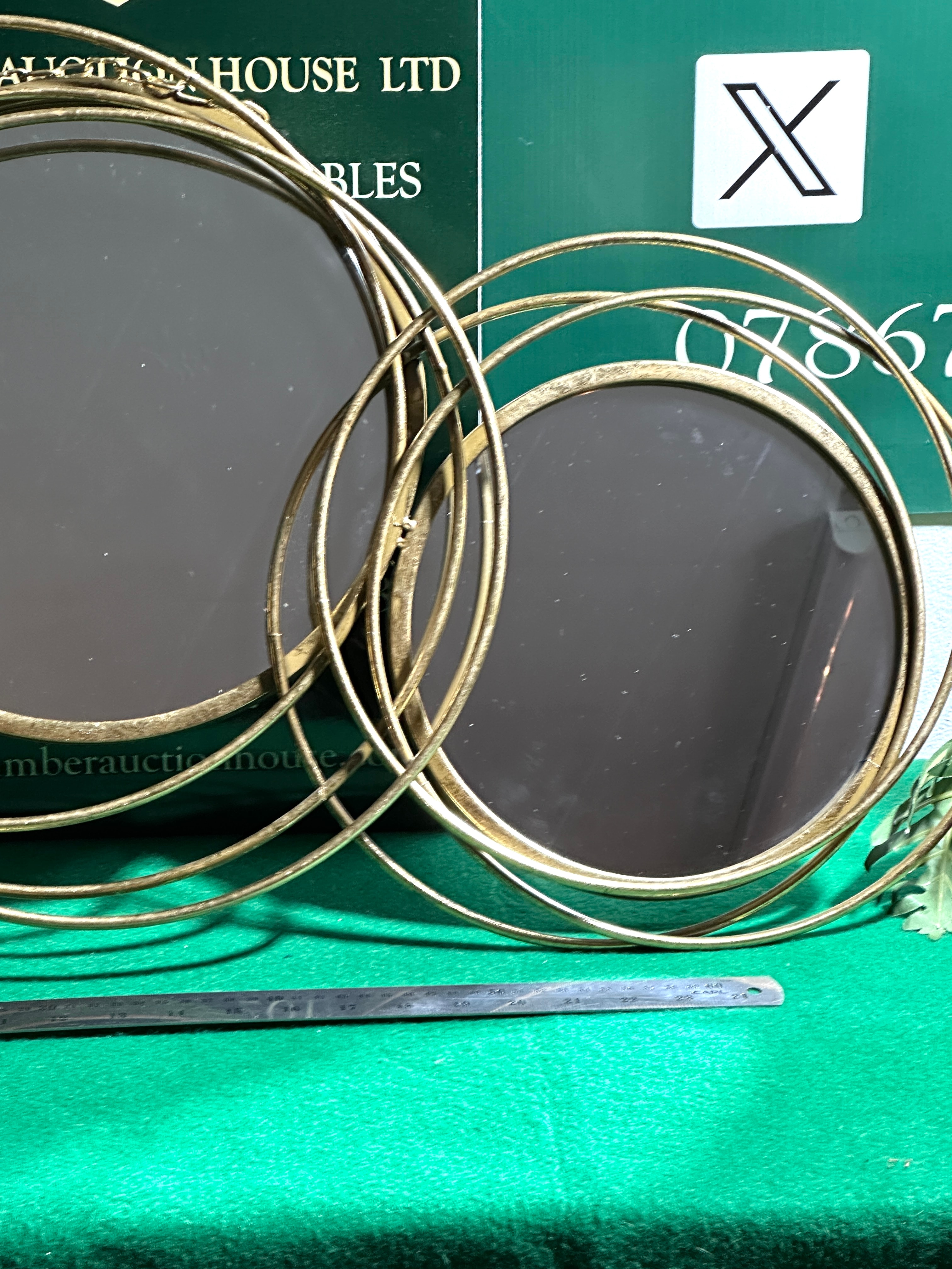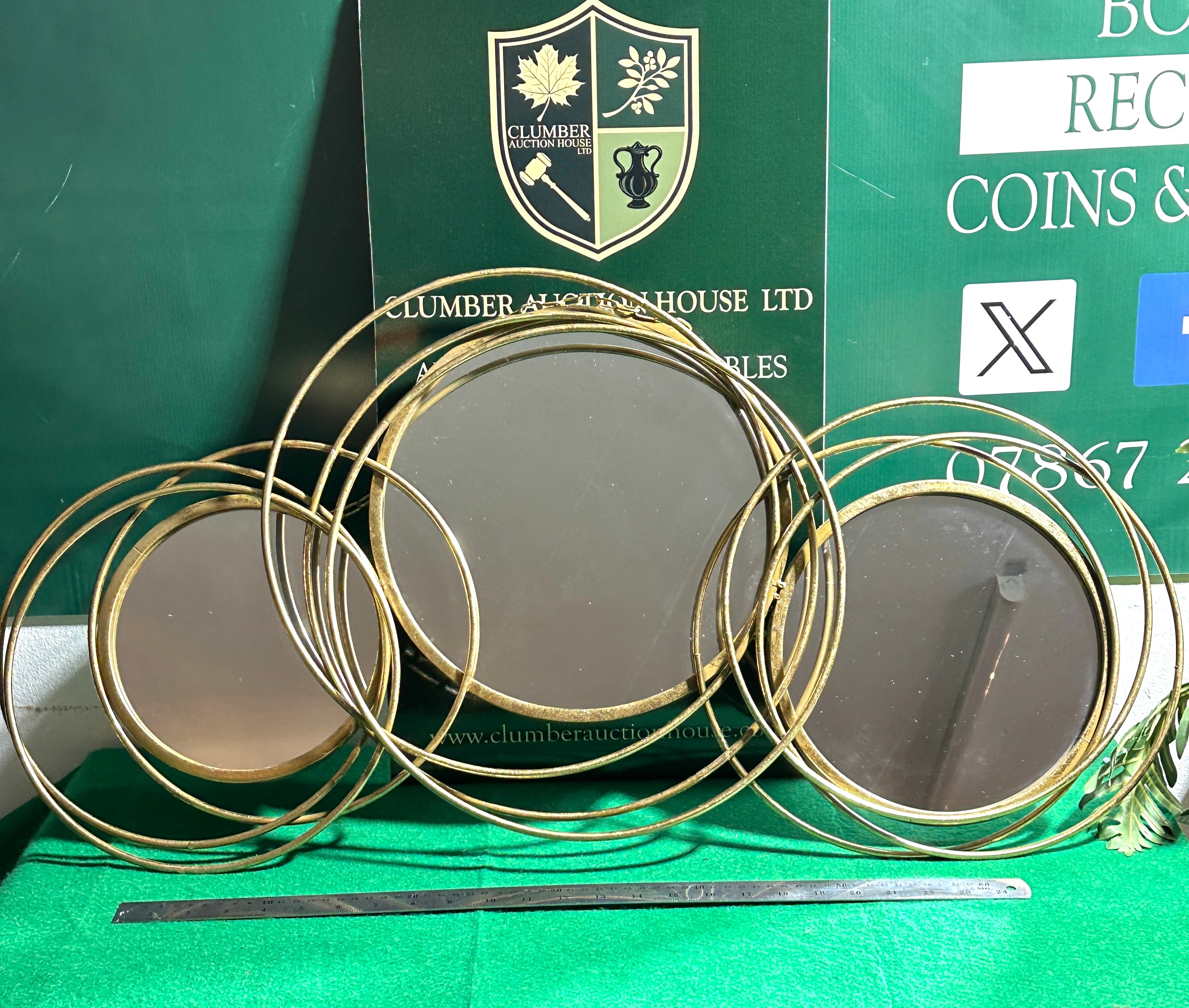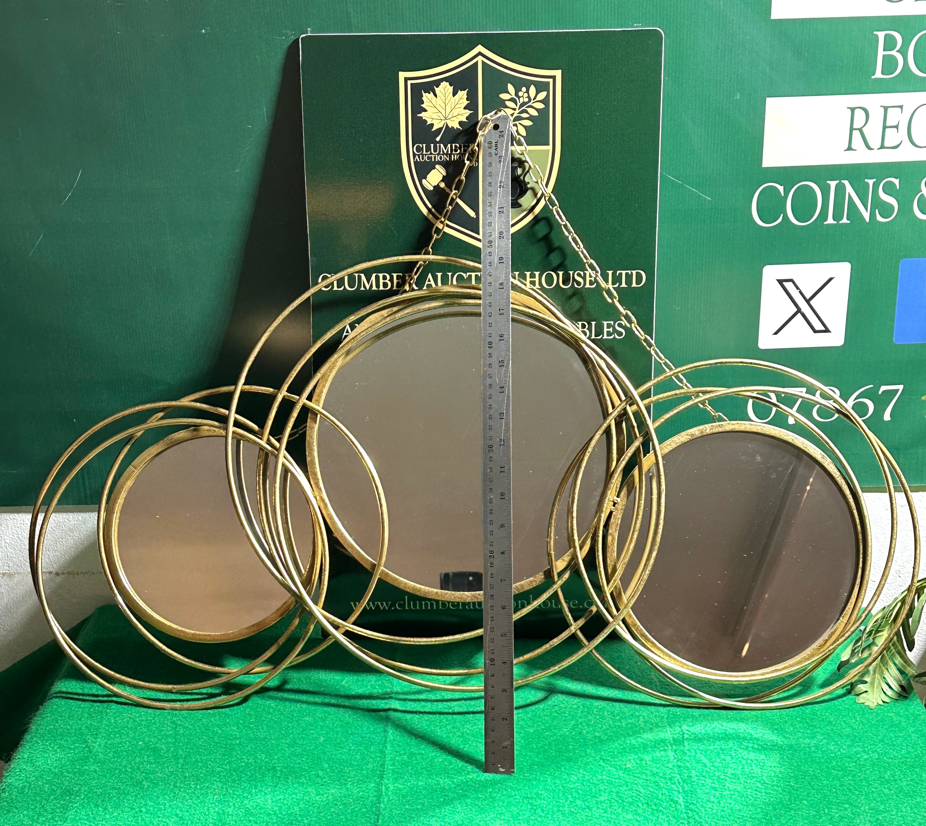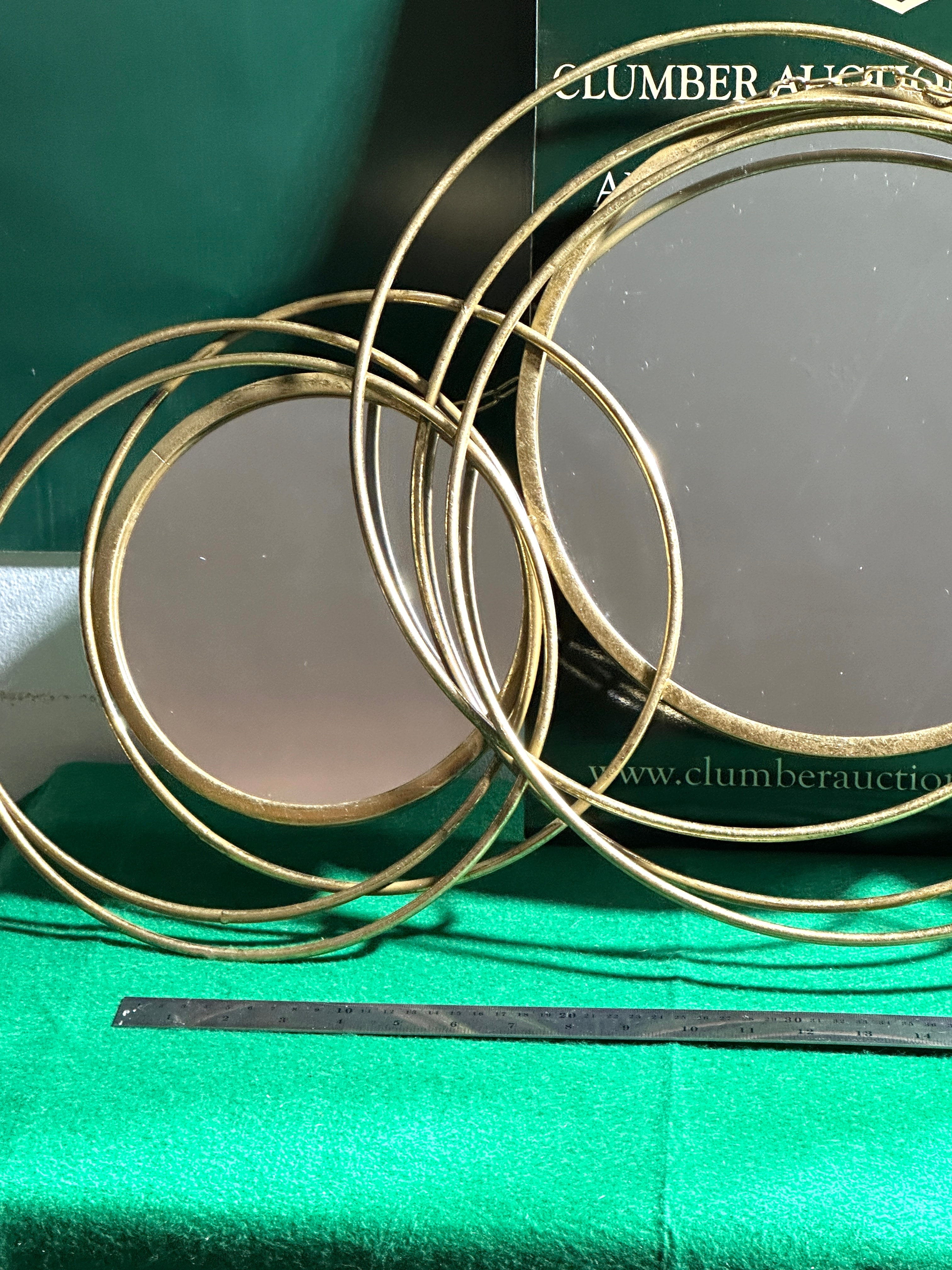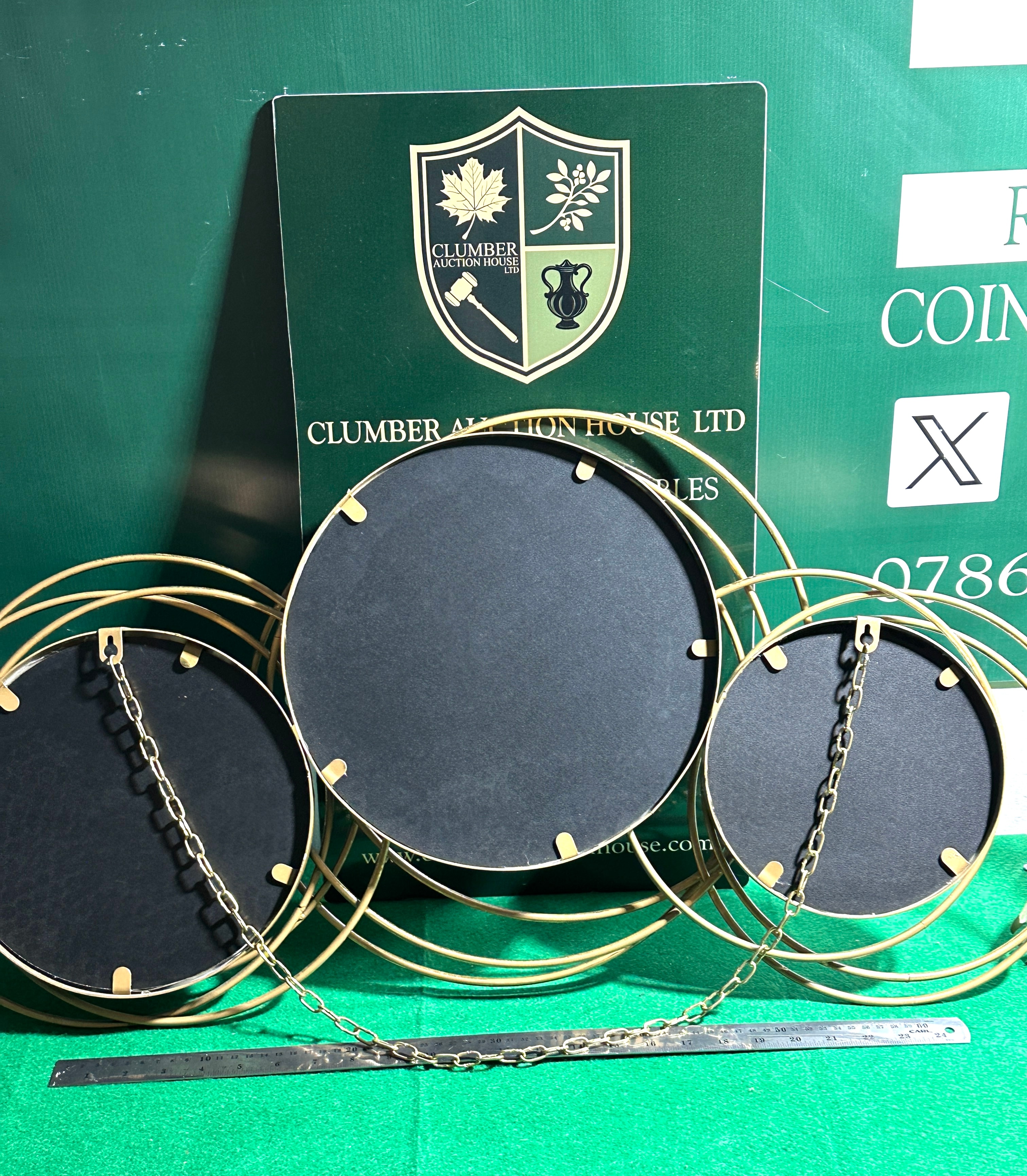 This horizontally oriented contemporary decorative wall mirror features three circular mirrors of varying sizes. The mirrors are set within an intricate, abstract frame constructed from intertwining gold-tone metal rings, likely tubular, forming an overall cohesive design. The reverse shows black board backings for the mirrors and two metal chains for hanging.