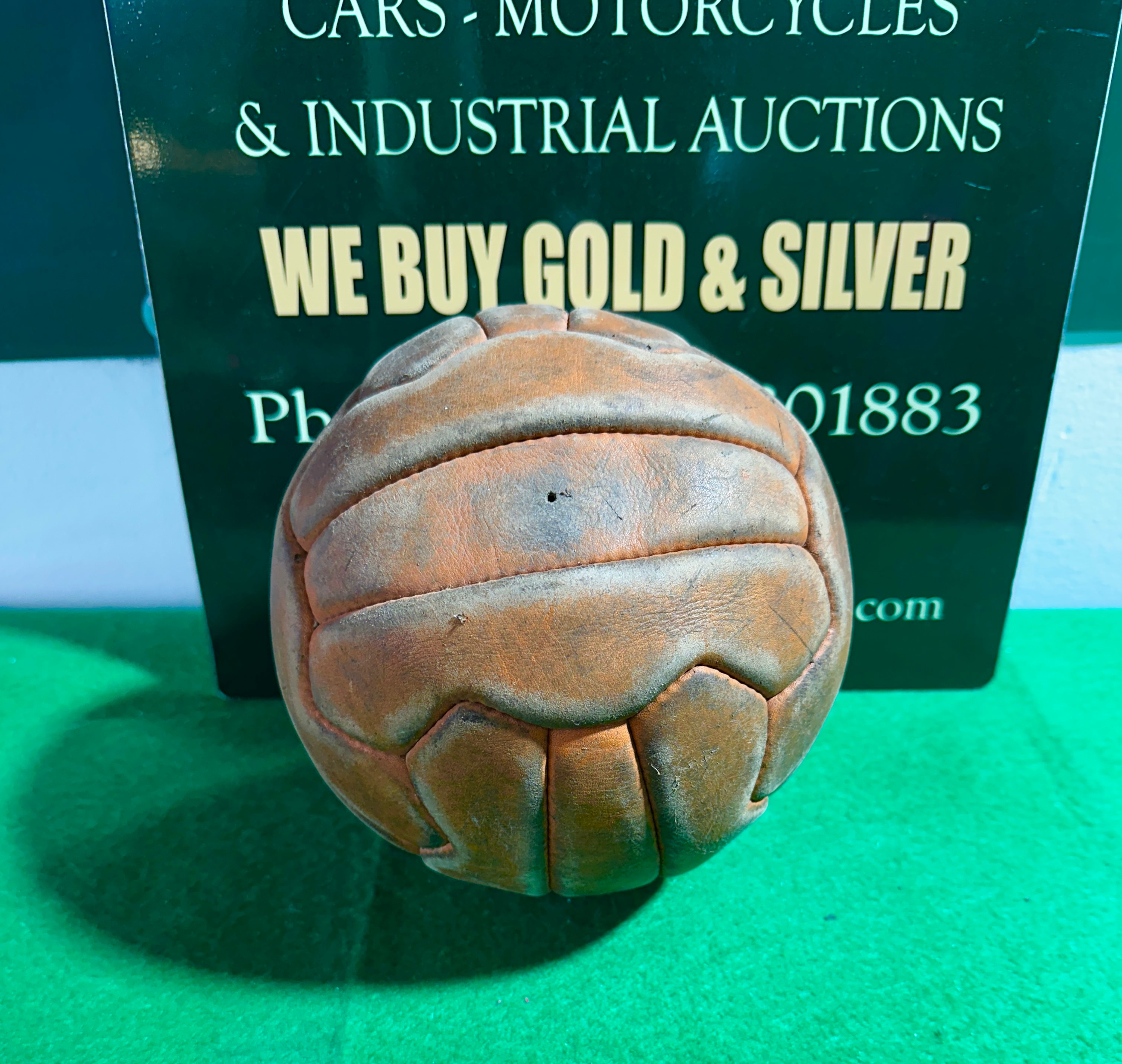 A vintage leather football, also known as a soccer ball, constructed from multiple, irregular panels of aged brown leather, featuring prominent visible seams. The style and material suggest a mid-20th century or earlier origin. The ball appears deflated and exhibits extensive surface abrasions, notable discolouration, and visible cracking on the dried leather. No specific manufacturer’s marks or text are discernible.