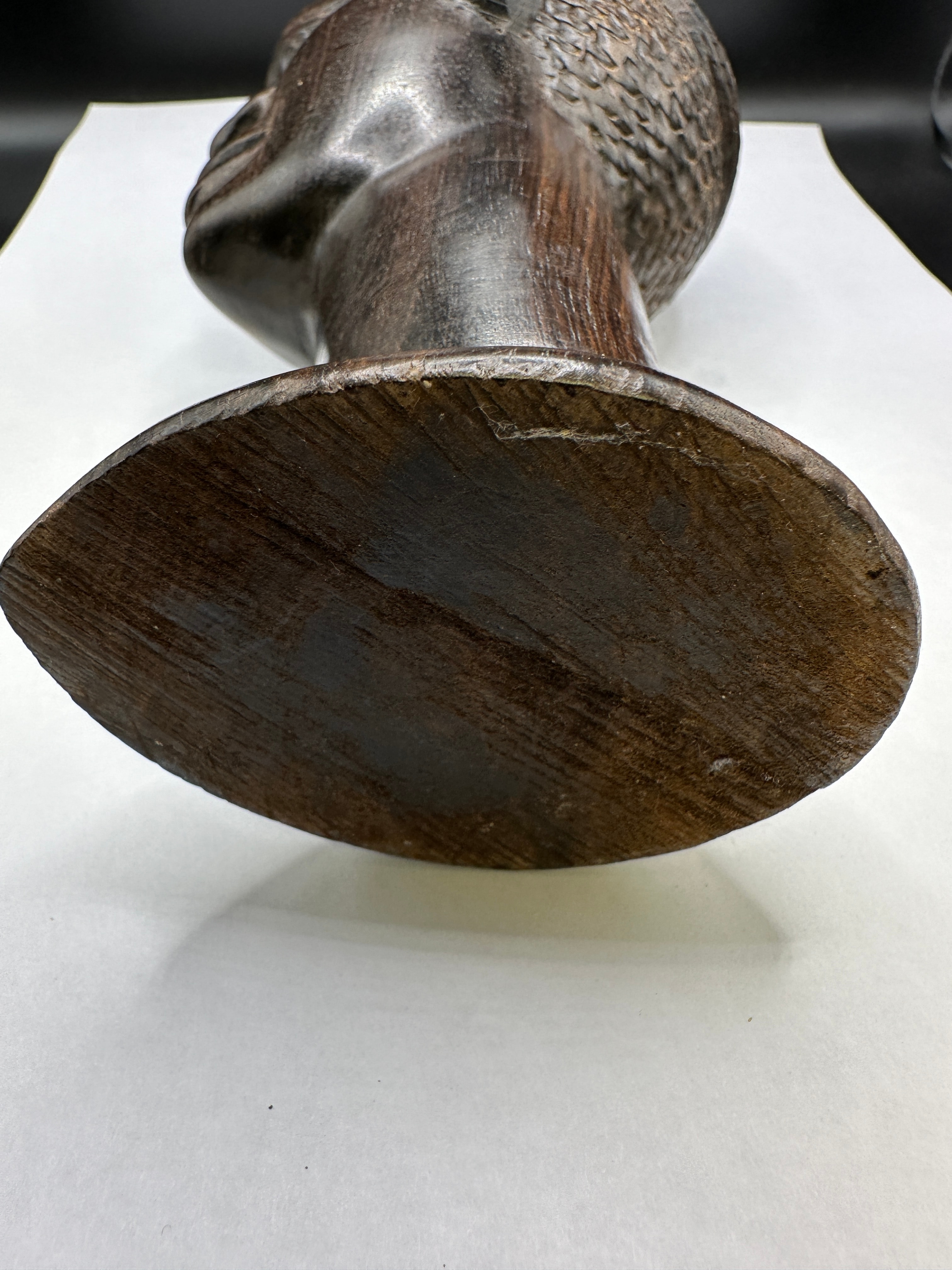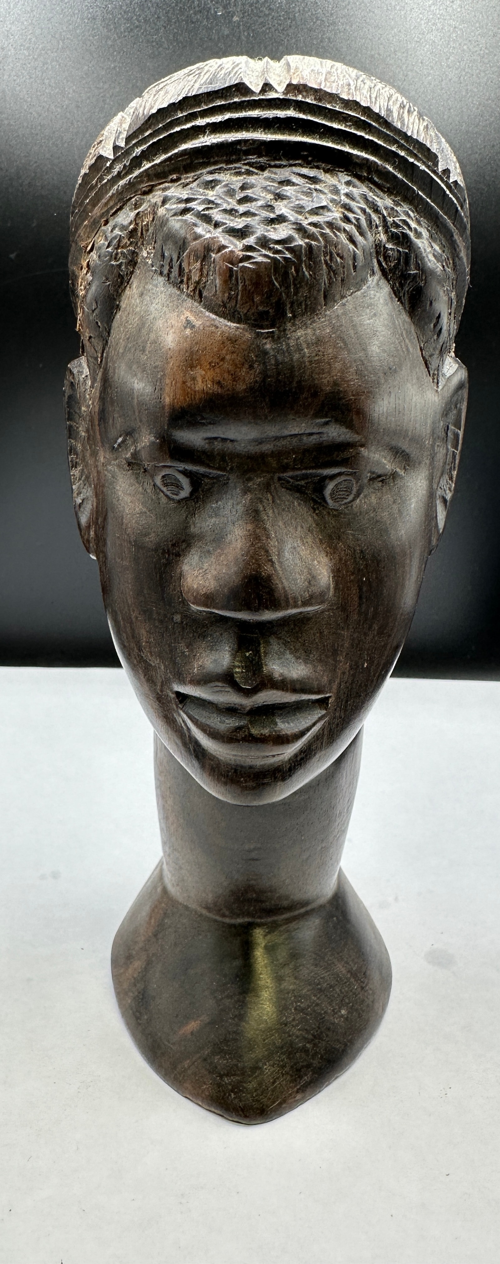 An African hand carved ebony wood male head bust. The dark brown wooden bust depicts a male head with defined facial characteristics, an elongated neck, and a flared base. The hair or headwear is intricately carved with textured patterns, including a criss-cross motif on the top and finer stippling on the sides. There are no visible text or identifying markings.