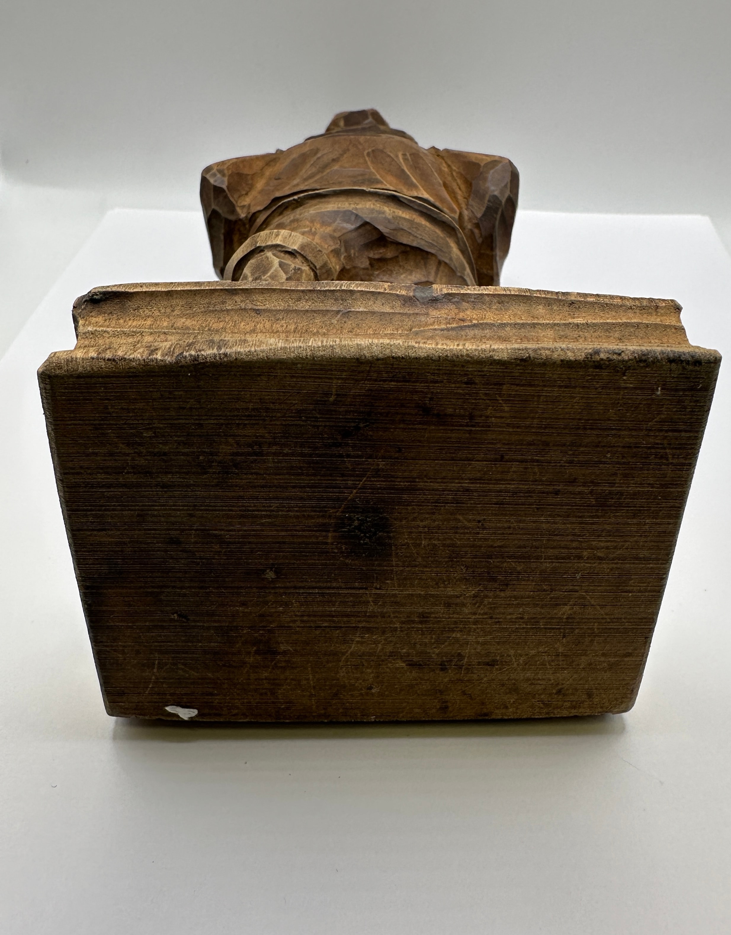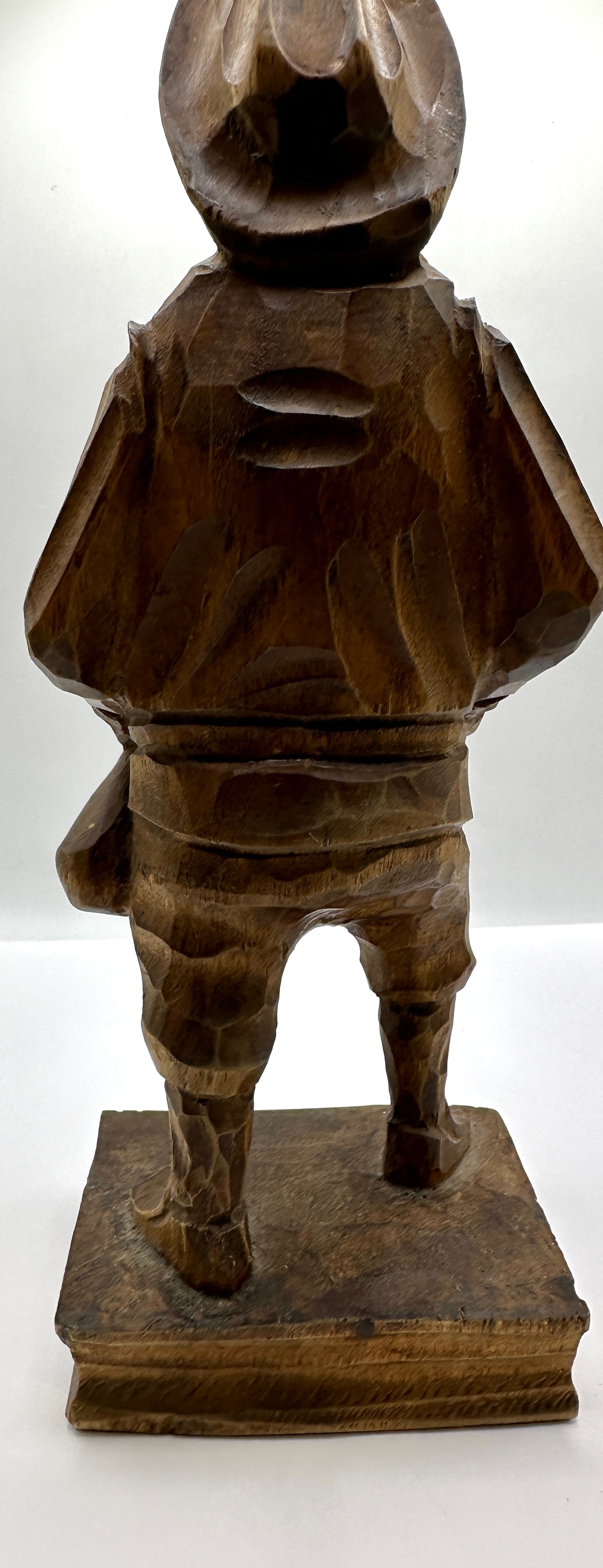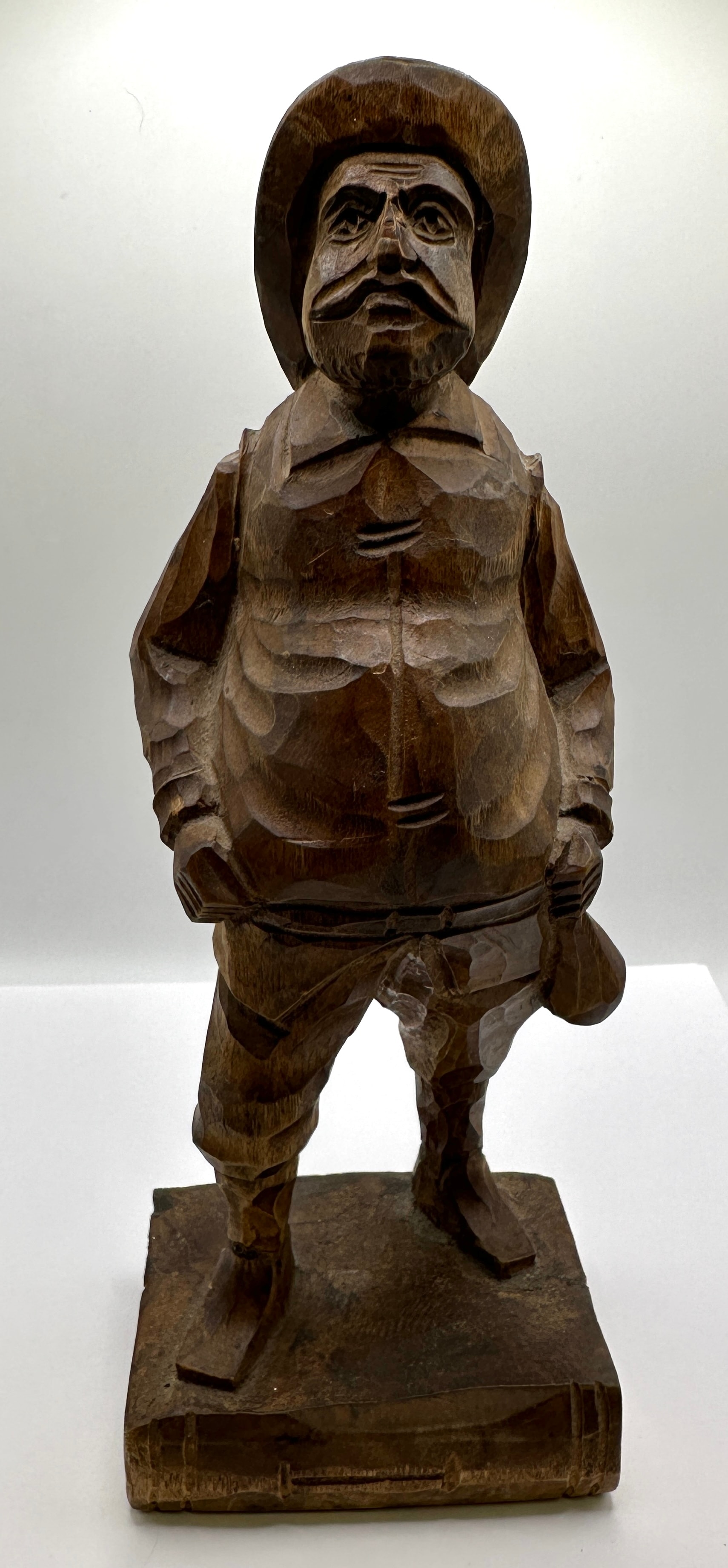 A carved wooden figural sculpture depicting Sancho Panza, attributed to Artesania, made in Spain. This folk art or rustic style carving features a stout male figure wearing a broad-brimmed hat, jacket, trousers, and boots, with a prominent mustache and defined facial features. He stands on an integral rectangular base. The figure holds an unidentifiable object, possibly a pouch or small tool, in his left hand (from his perspective), while his right hand rests on his hip or side. Visible tool marks are evident across the entire surface, indicating its hand-carved nature. No visible text, signatures, or other markings are discernible on the piece.