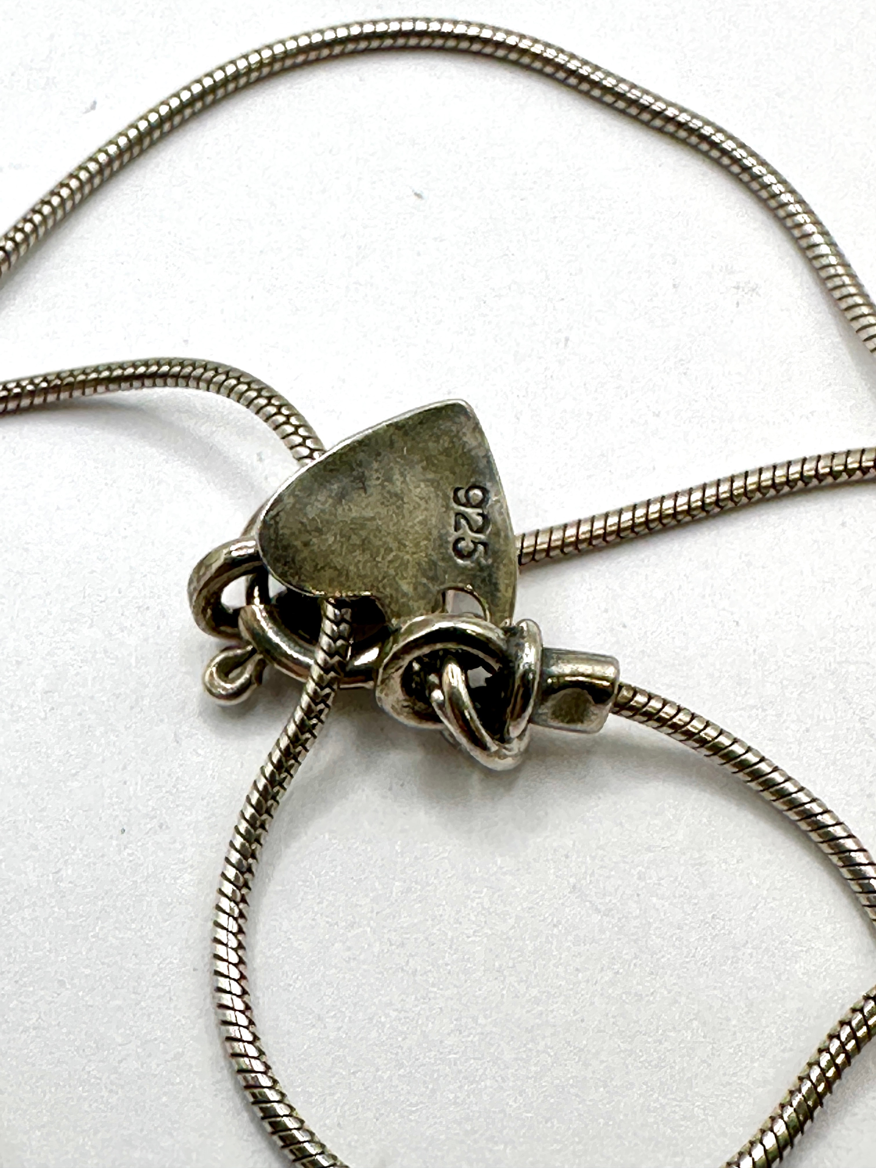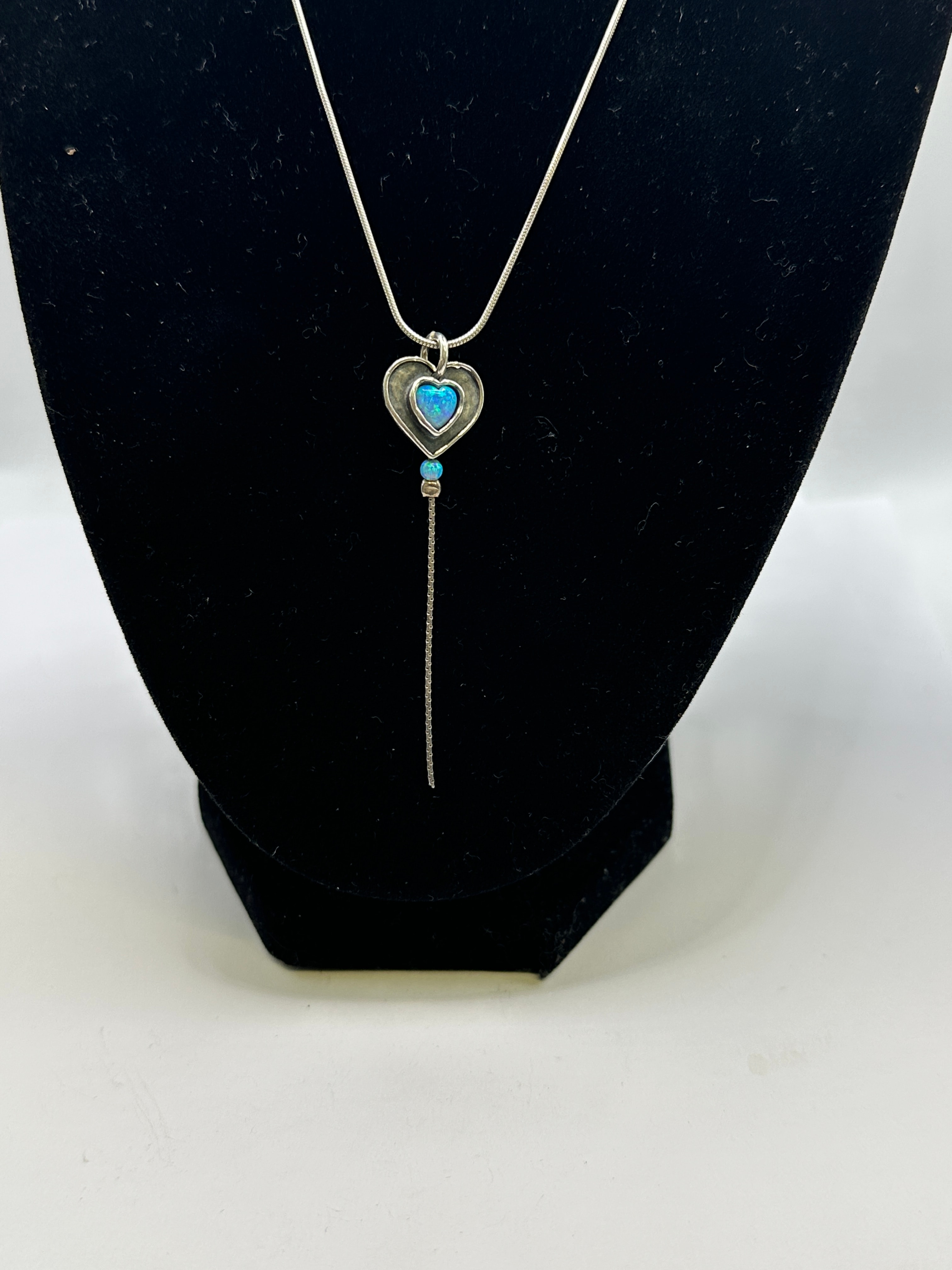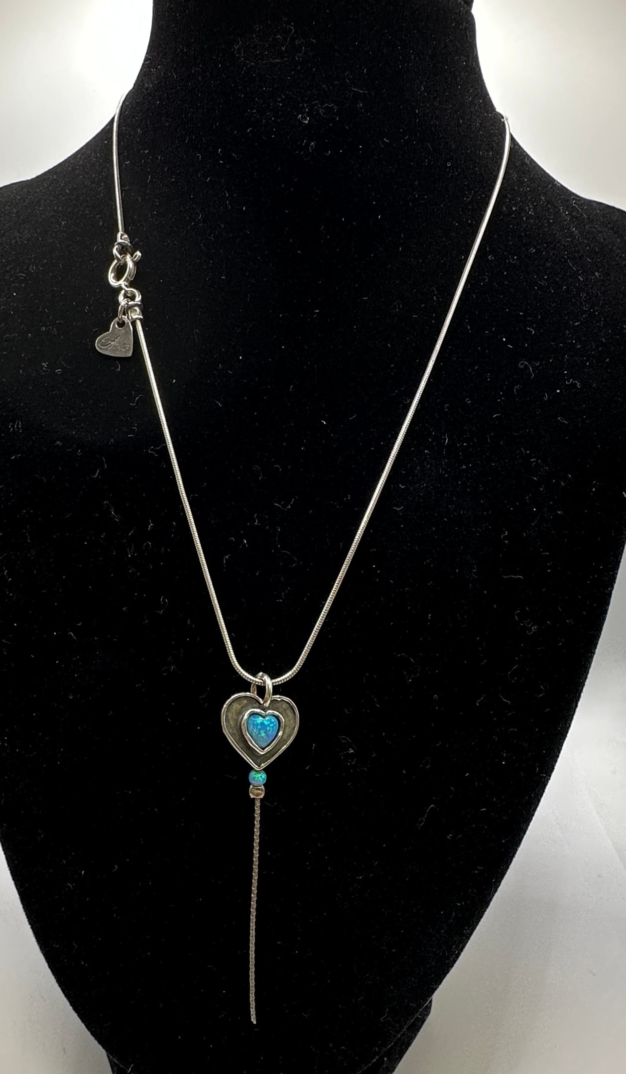 A sterling silver necklace featuring a snake chain and a heart-shaped pendant. The pendant frames a central heart-shaped inlay of iridescent blue and green material, identified as turquoise. A small blue bead and a delicate chain dangle from the bottom of the pendant. The necklace is secured by a lobster clasp, adjacent to which is a heart-shaped tag marked “925”.