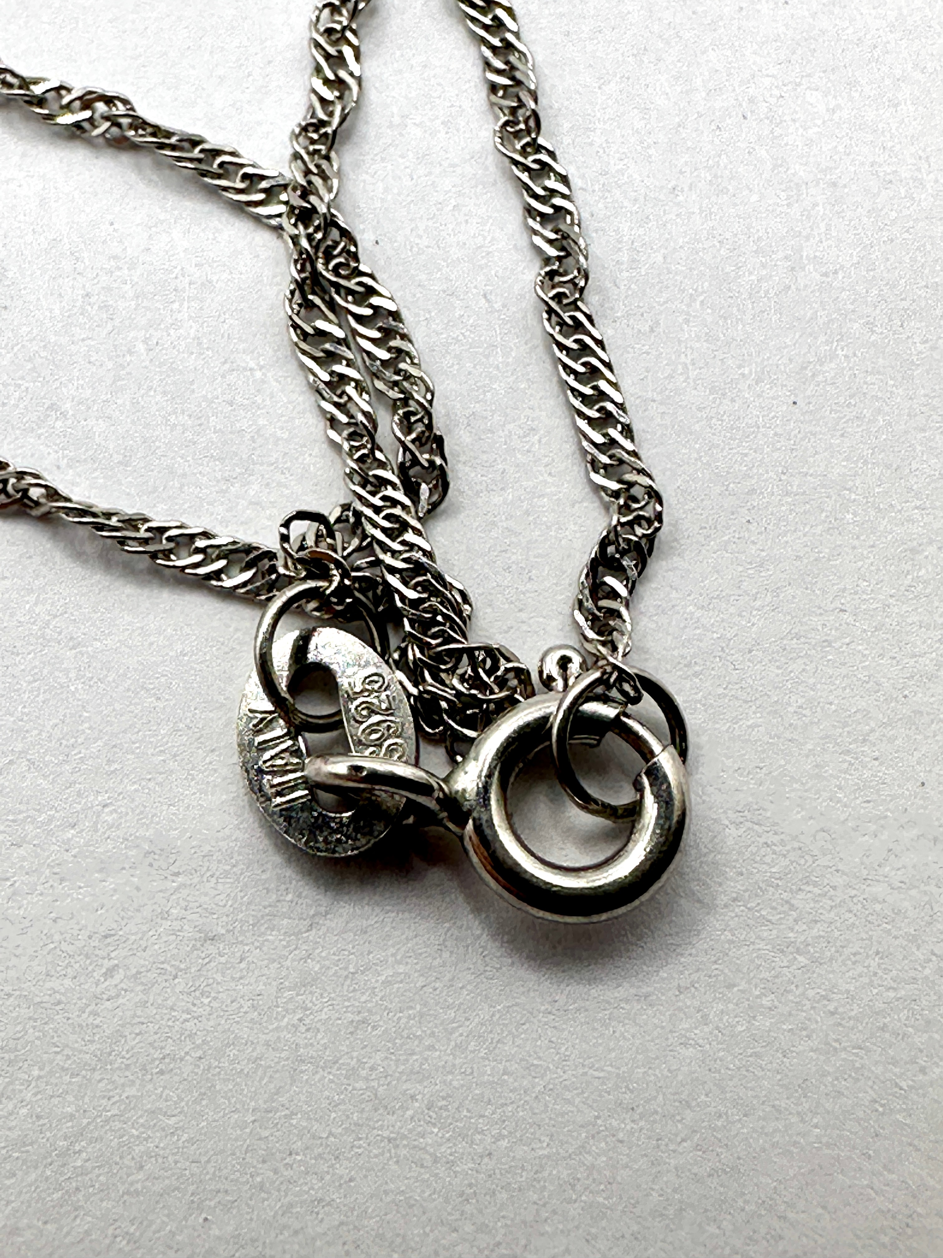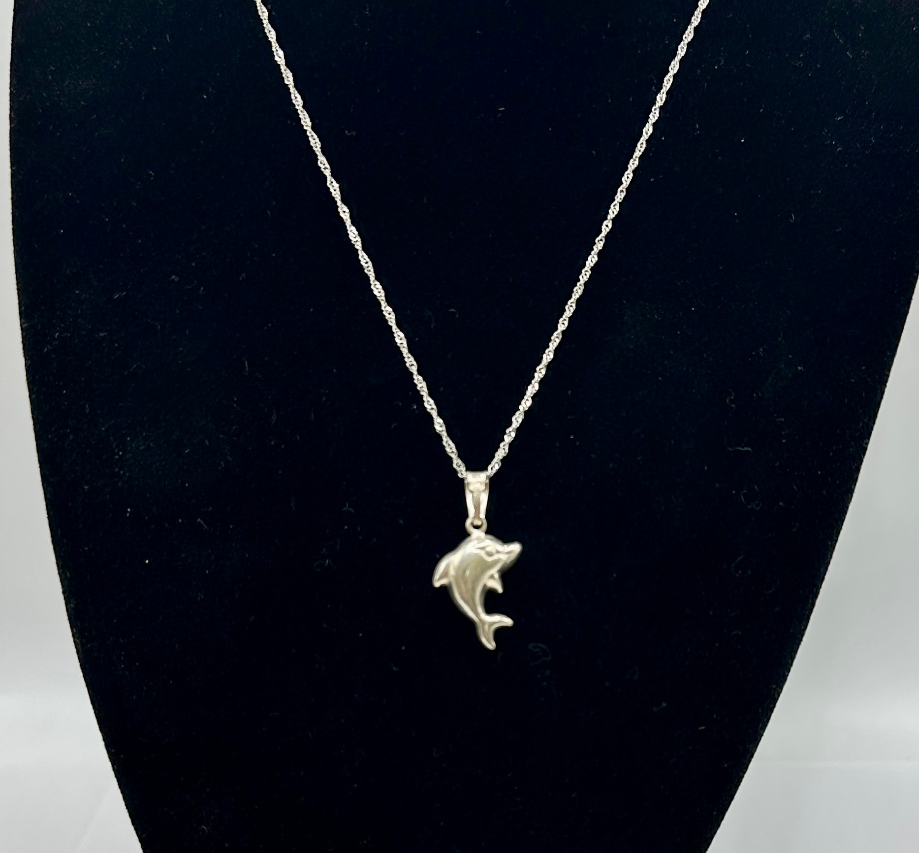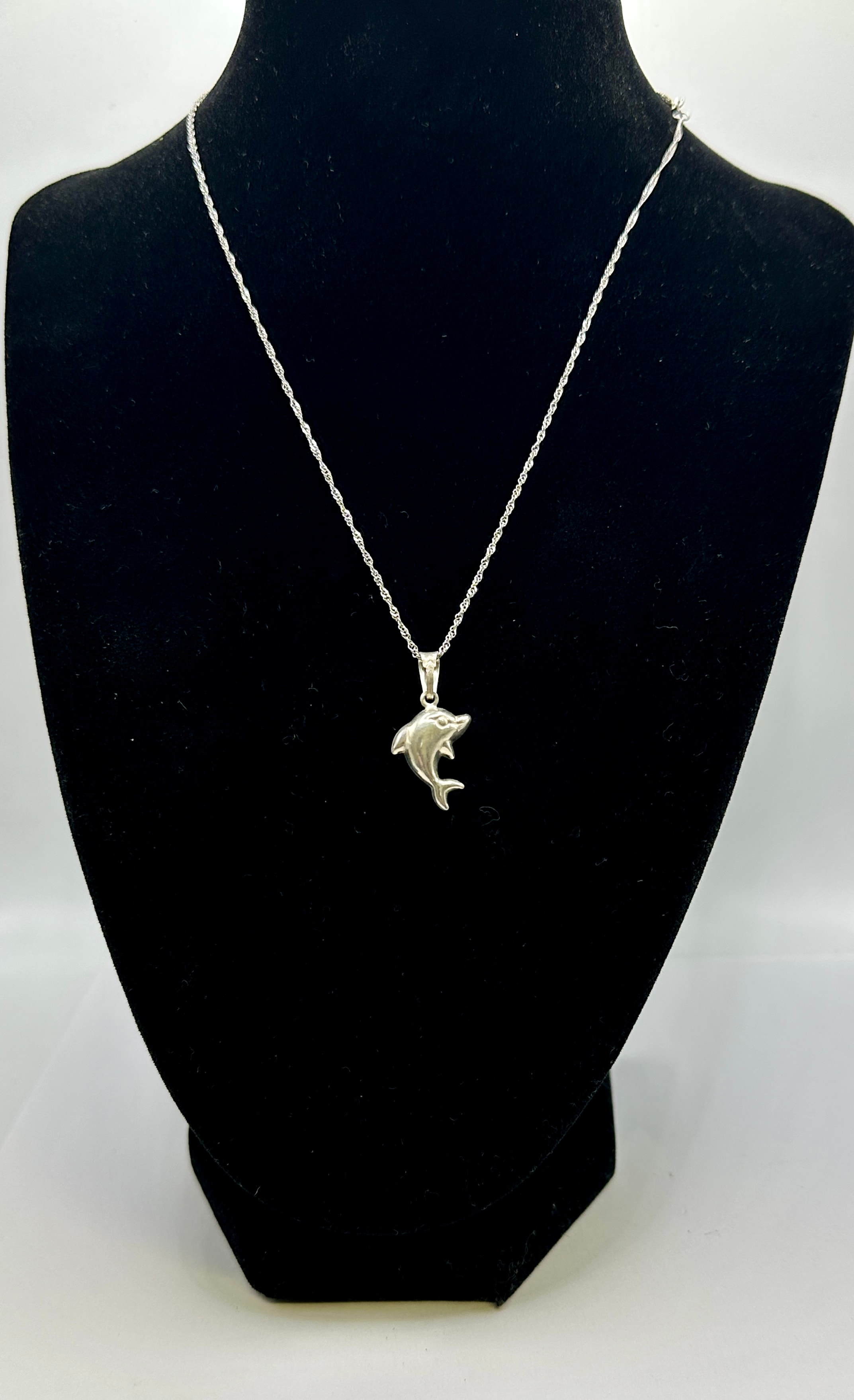 A modern sterling silver necklace featuring a three-dimensional dolphin pendant suspended from a twisted link chain. An oval tag near the spring-ring clasp is clearly stamped “925” and “ITALY,” confirming its sterling silver composition and Italian manufacture.