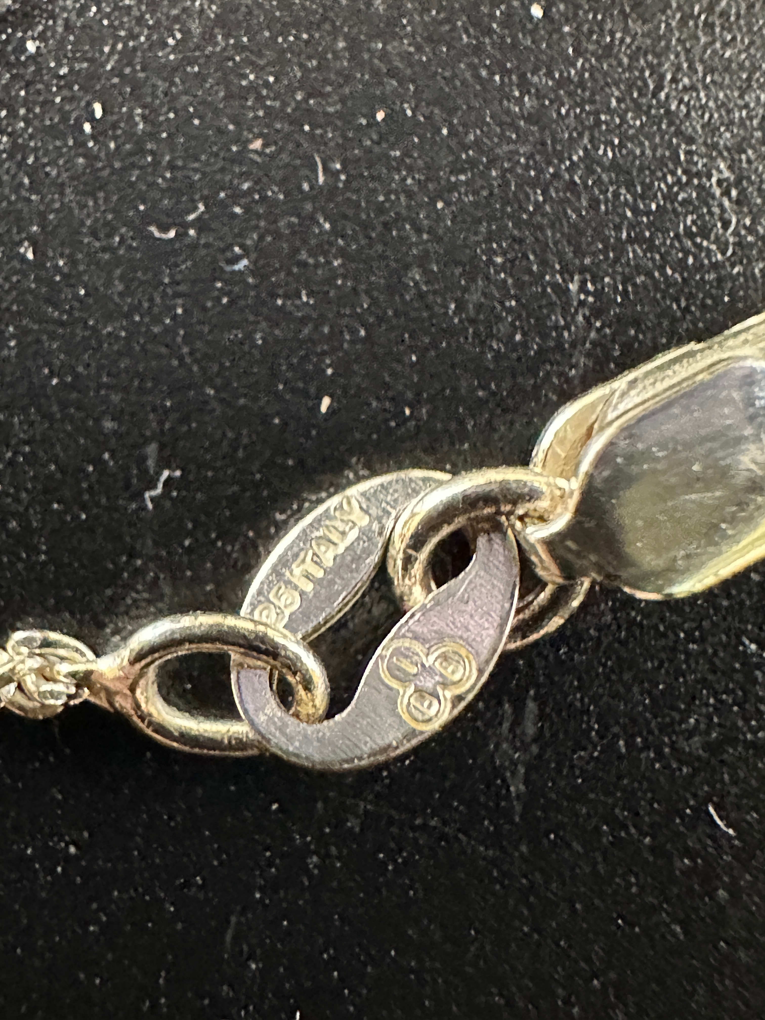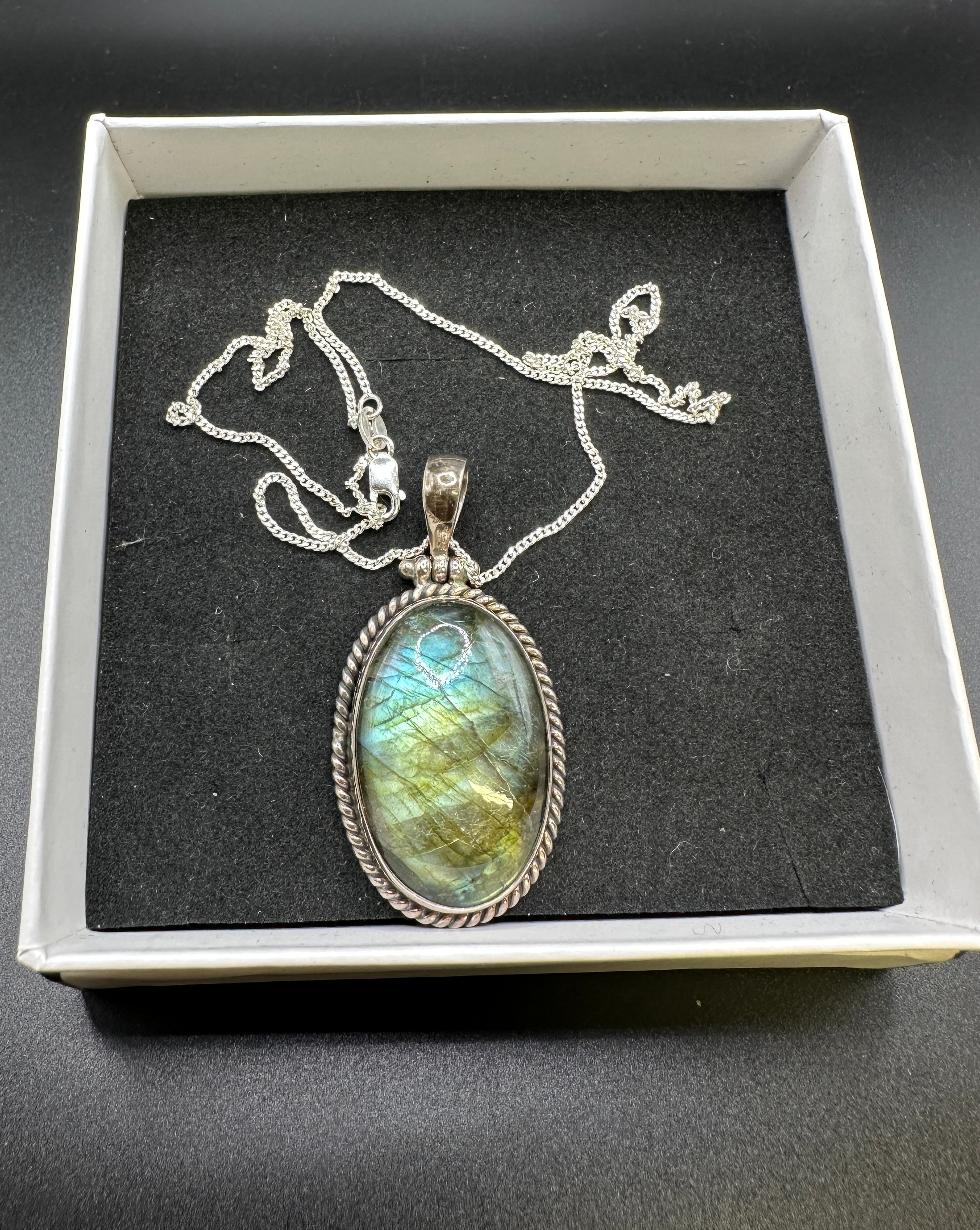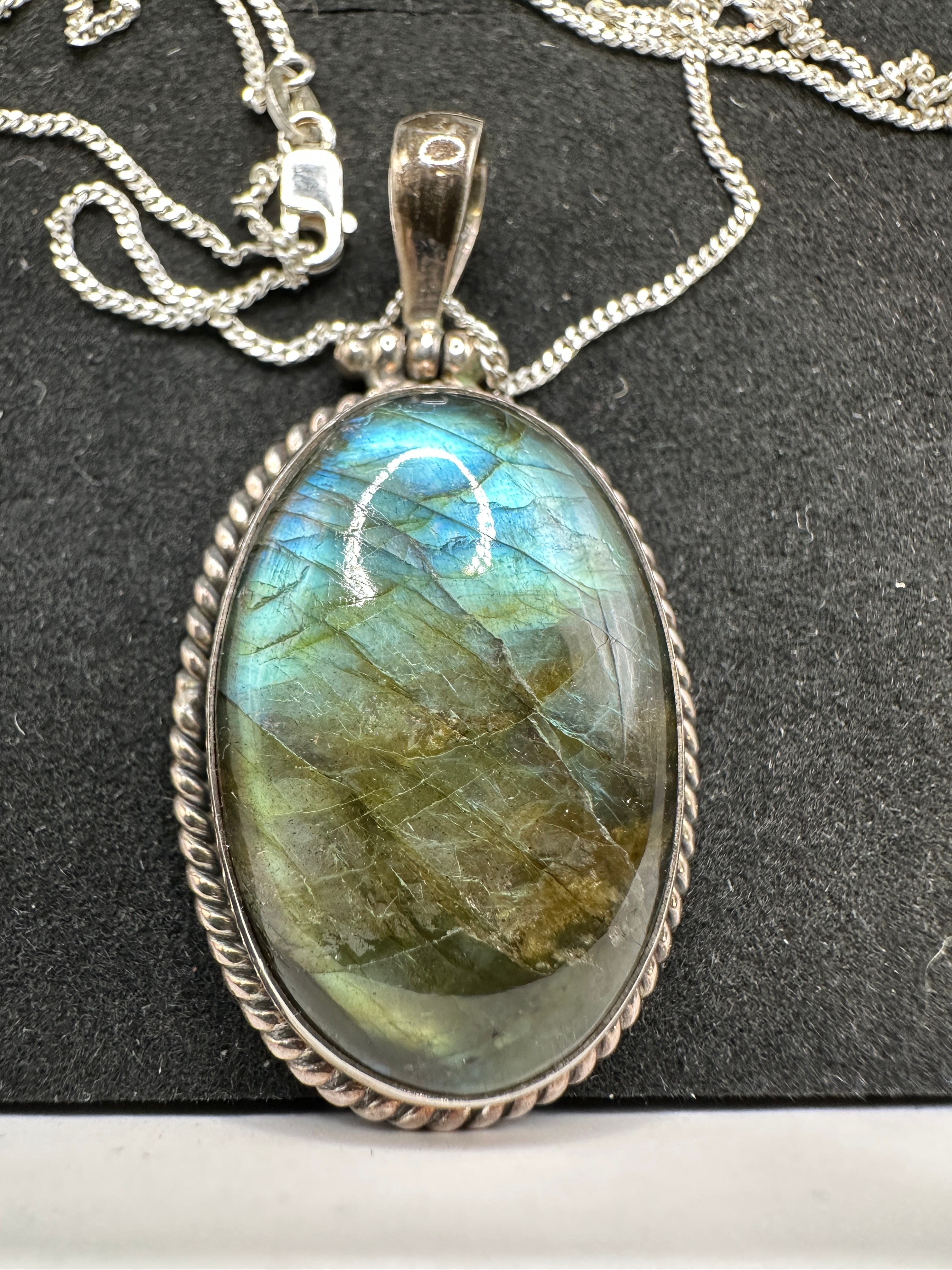 A modern sterling silver necklace featuring a large oval cabochon labradorite pendant, exhibiting prominent blue, green, and gold labradorescence. The gemstone is set within a twisted rope-design bezel and suspended from a simple bail. The fine link chain is secured with a lobster clasp clearly marked “925 ITALY,” denoting its sterling silver composition and Italian origin.
