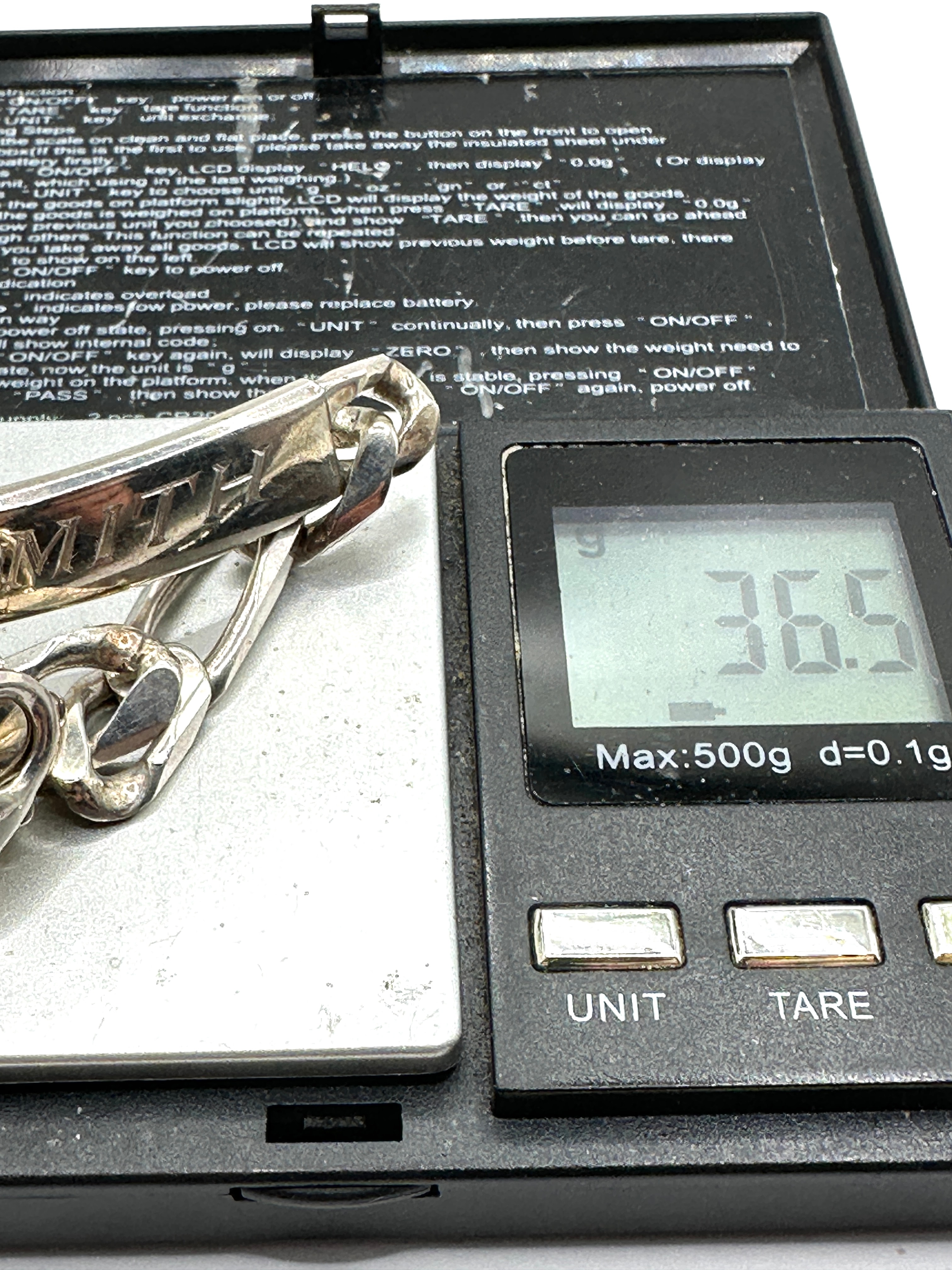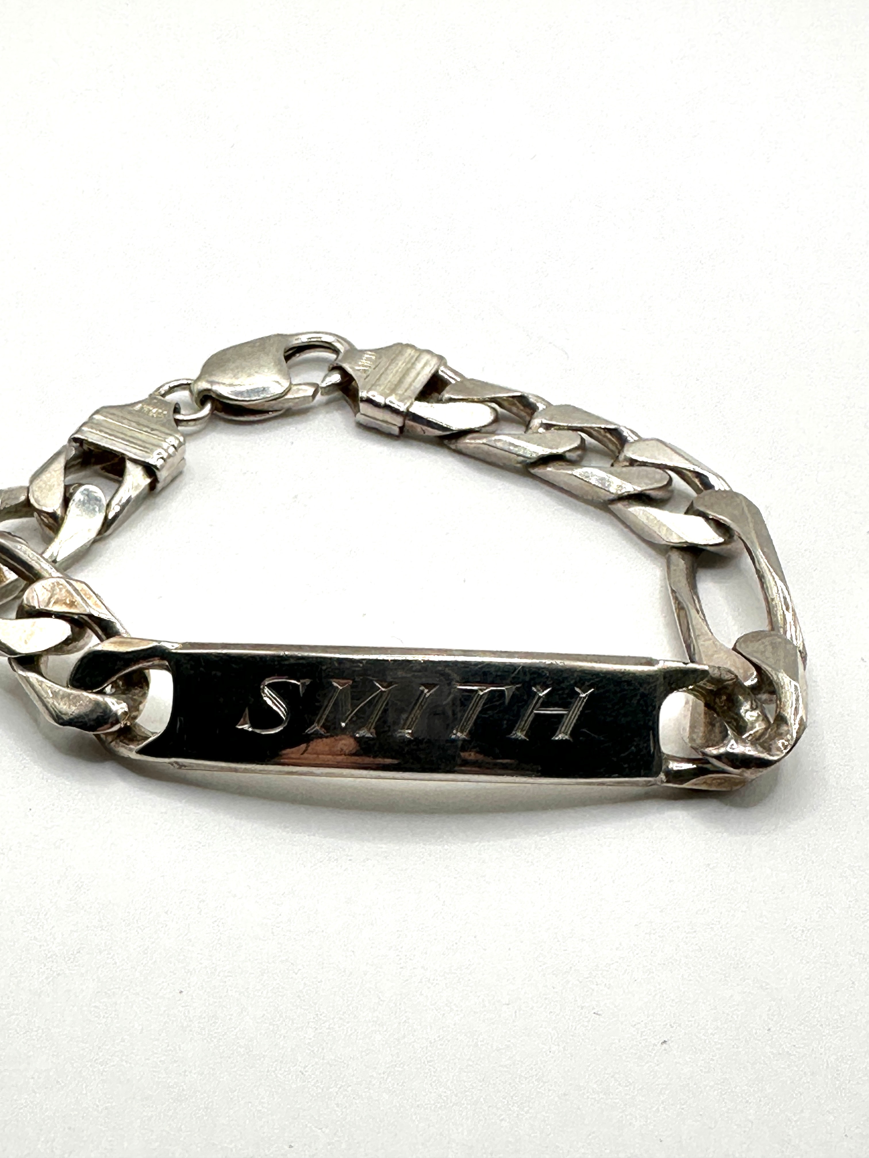A vintage sterling silver Figaro ID bracelet. The silver-toned metal bracelet features a Figaro link chain and a rectangular ID plate. The plate is engraved with the name ‘SMITH’ in a serif font. It is secured by a lobster claw clasp.