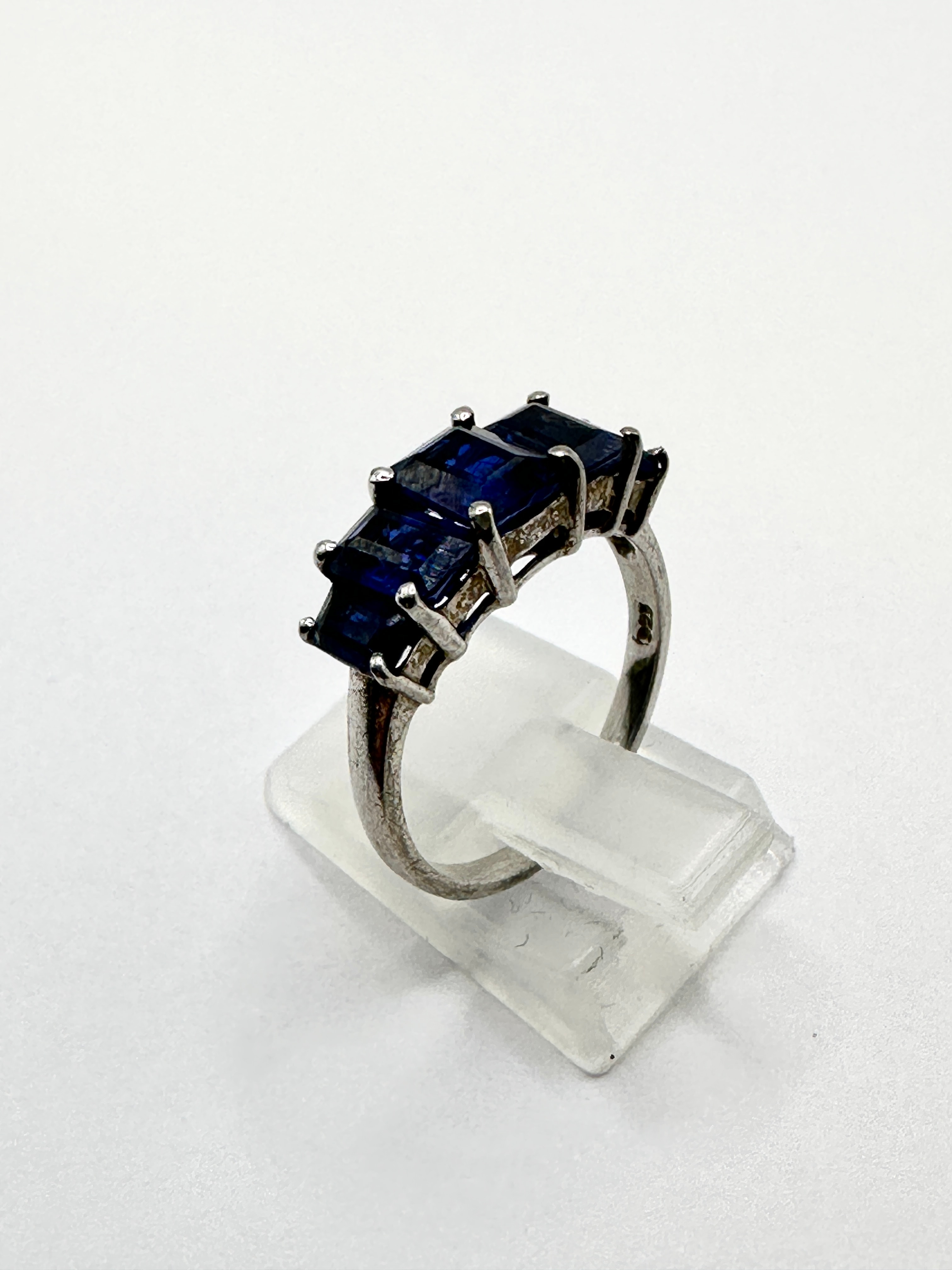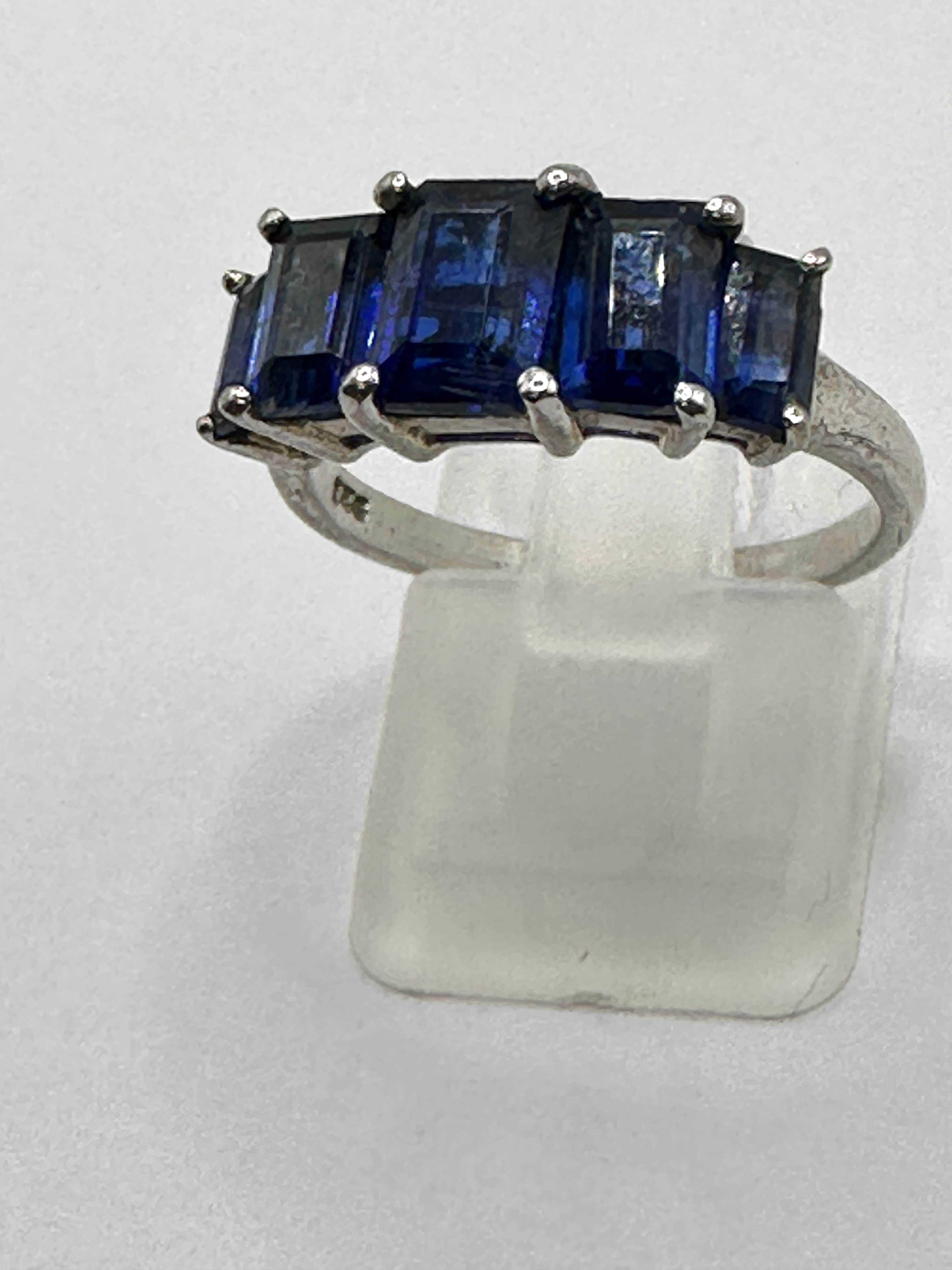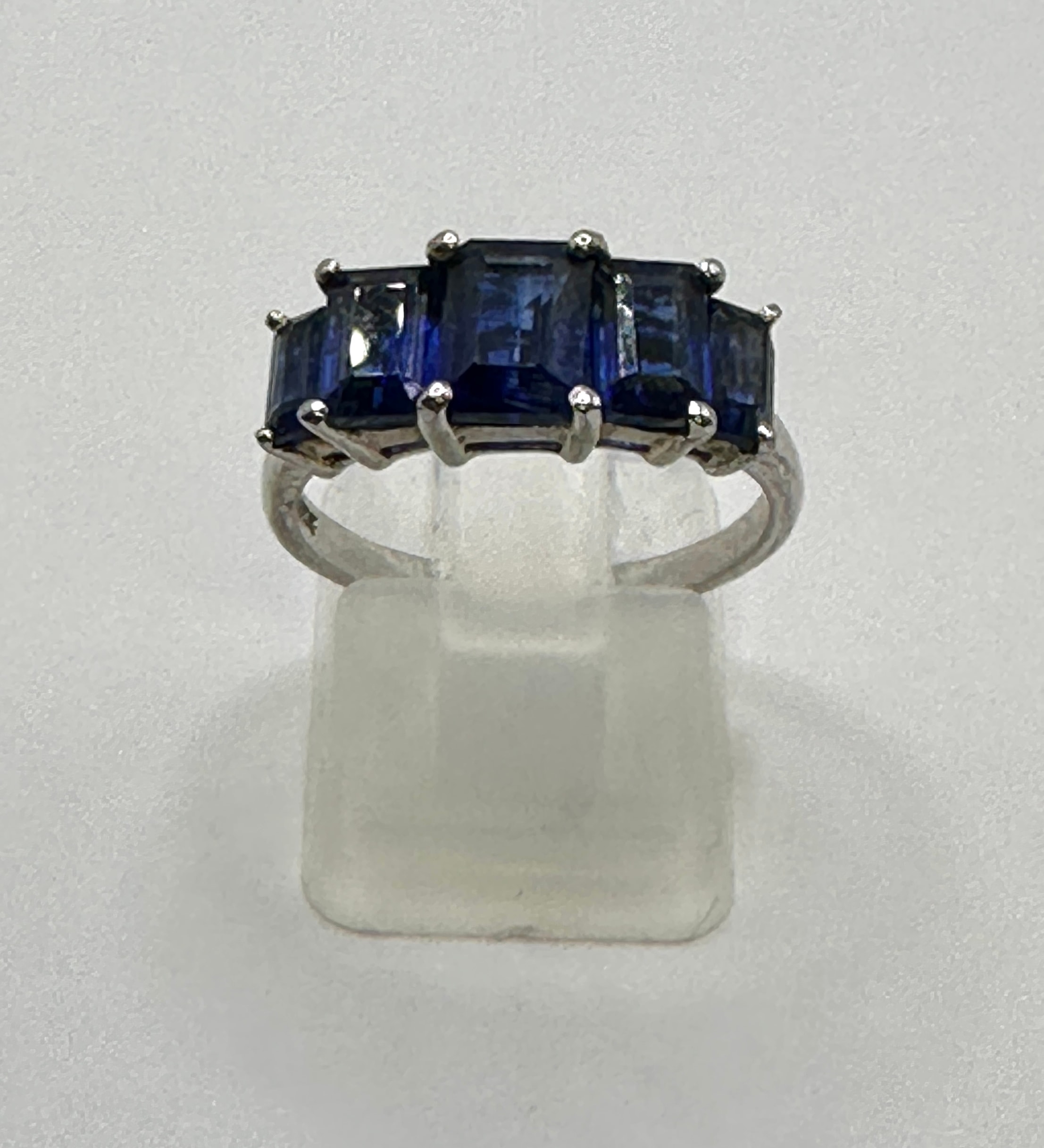A sterling silver five stone ring featuring five graduated, rectangular, step-cut dark blue gemstones, individually prong-set across the top of the band. The central stone is the largest, flanked by two progressively smaller stones on each side. A ‘925’ or ‘S925’ mark, indicating sterling silver, is visible on the inner band.