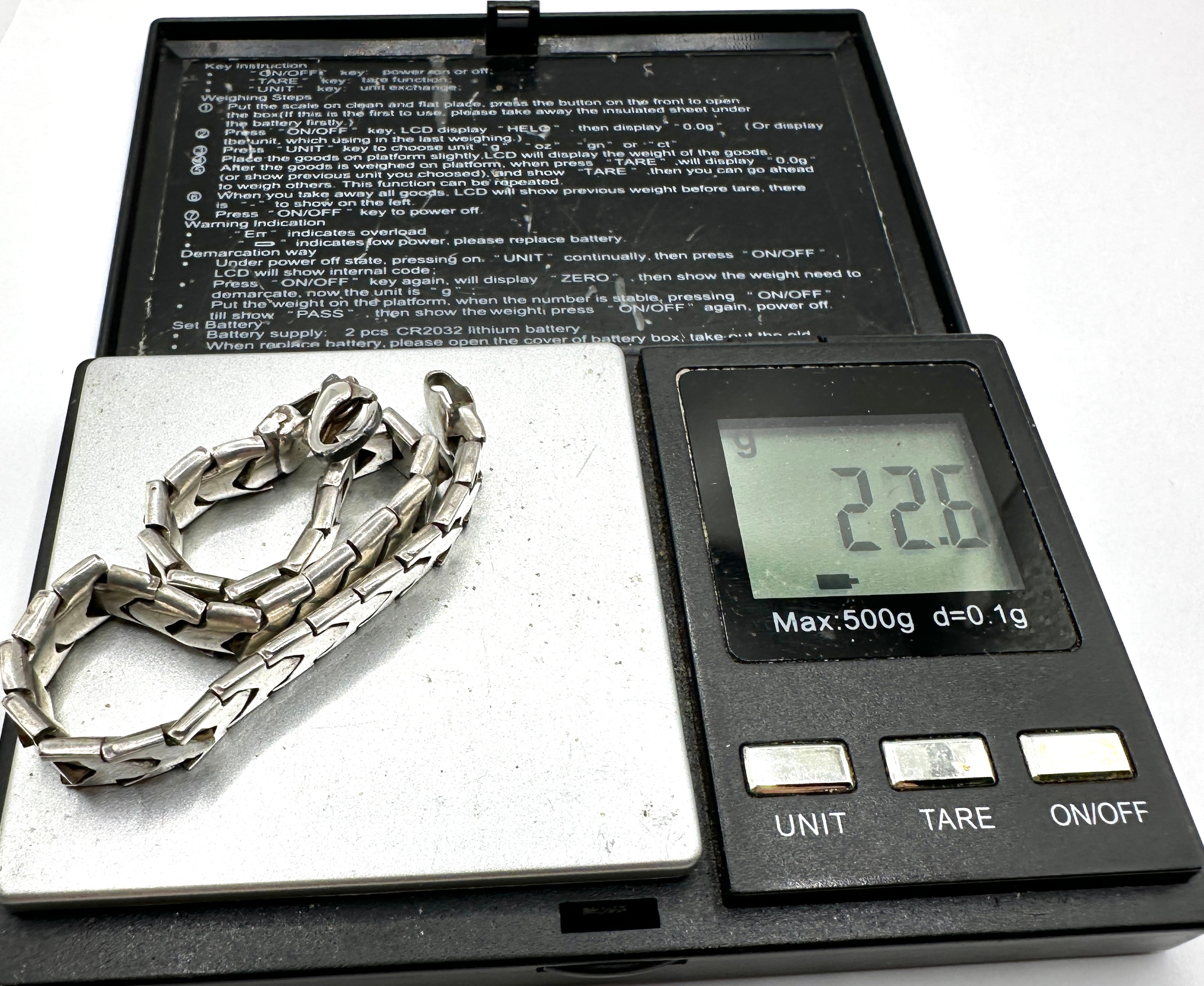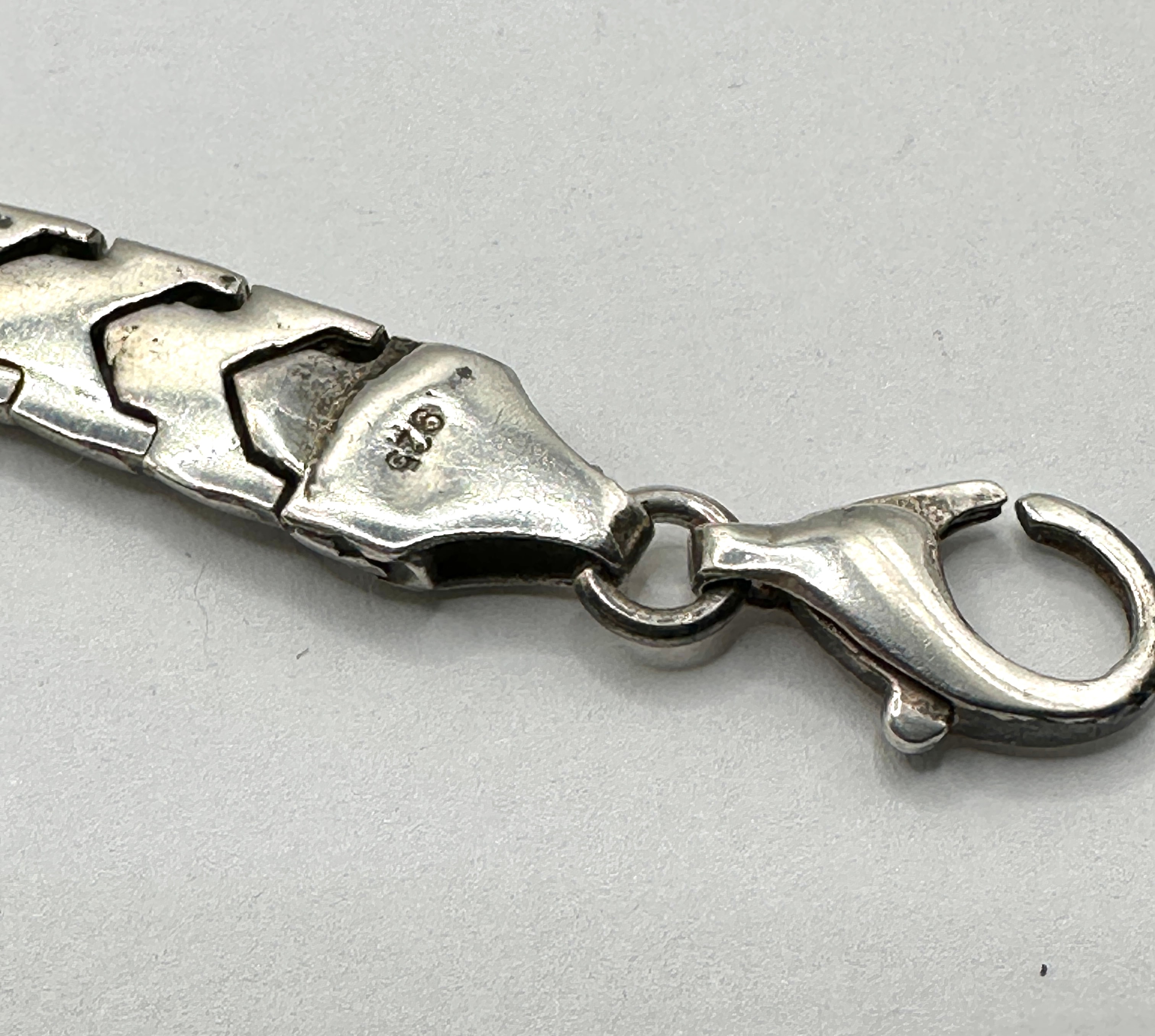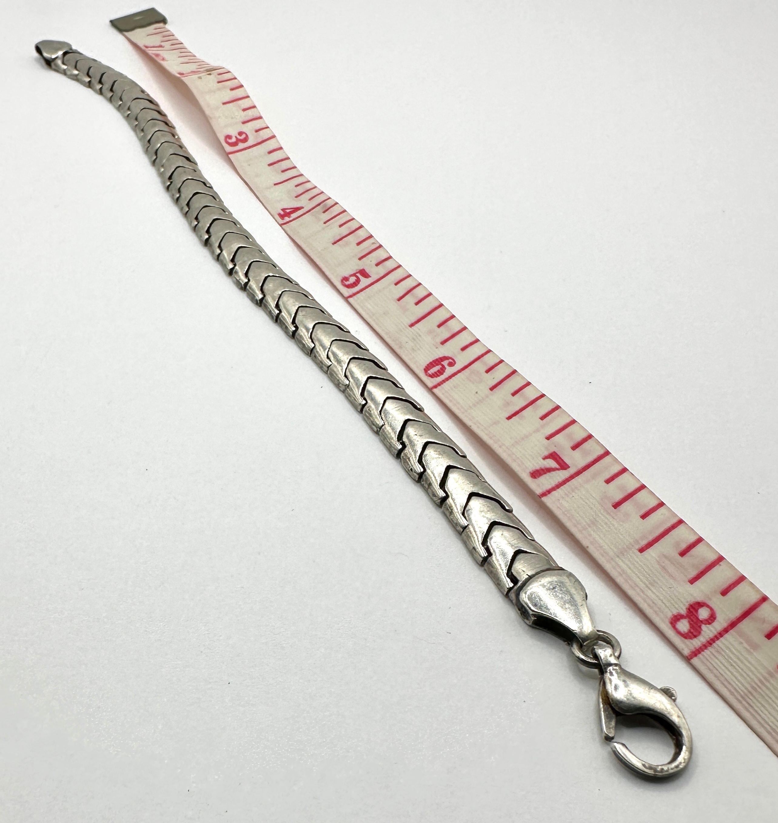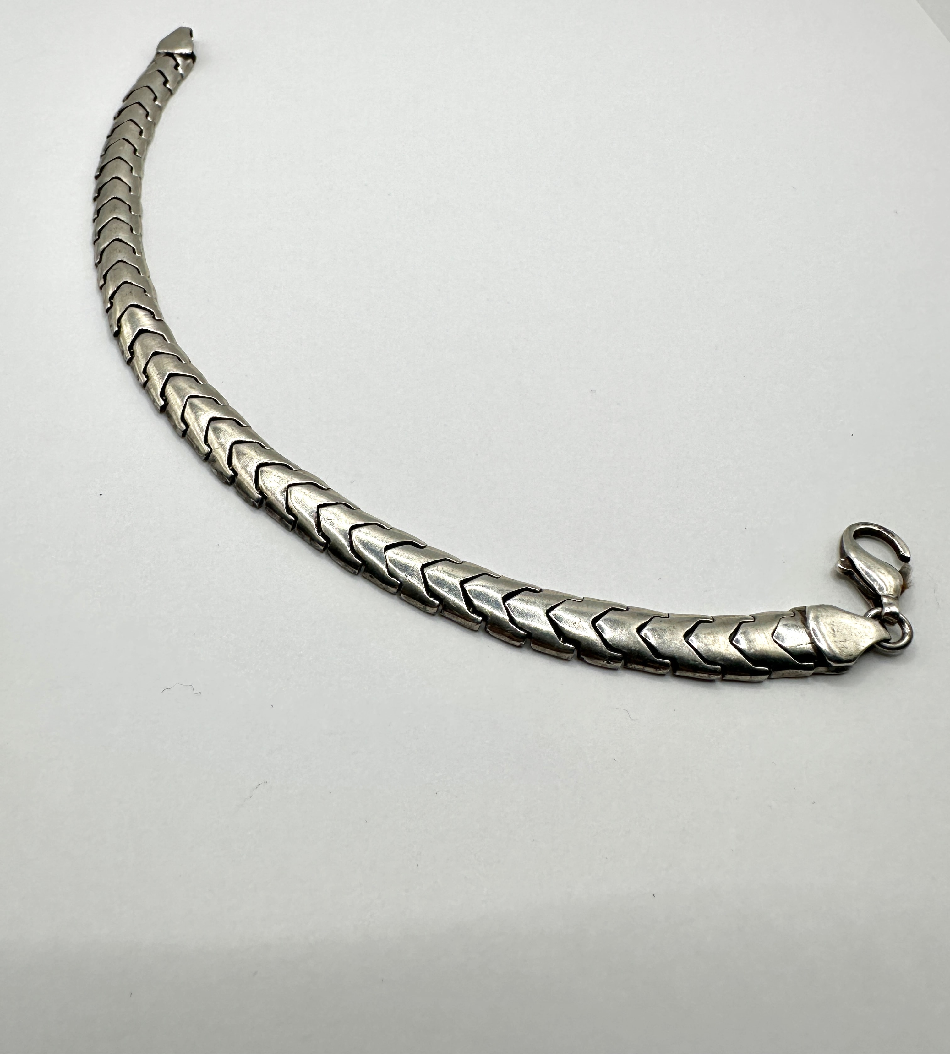 A silver-tone metal bracelet crafted from sterling silver, indicated by a clear “925” hallmark on the terminal near the clasp. The design features a flat, articulated chain composed of interlocking chevron or V-shaped links, secured by a lobster clasp.