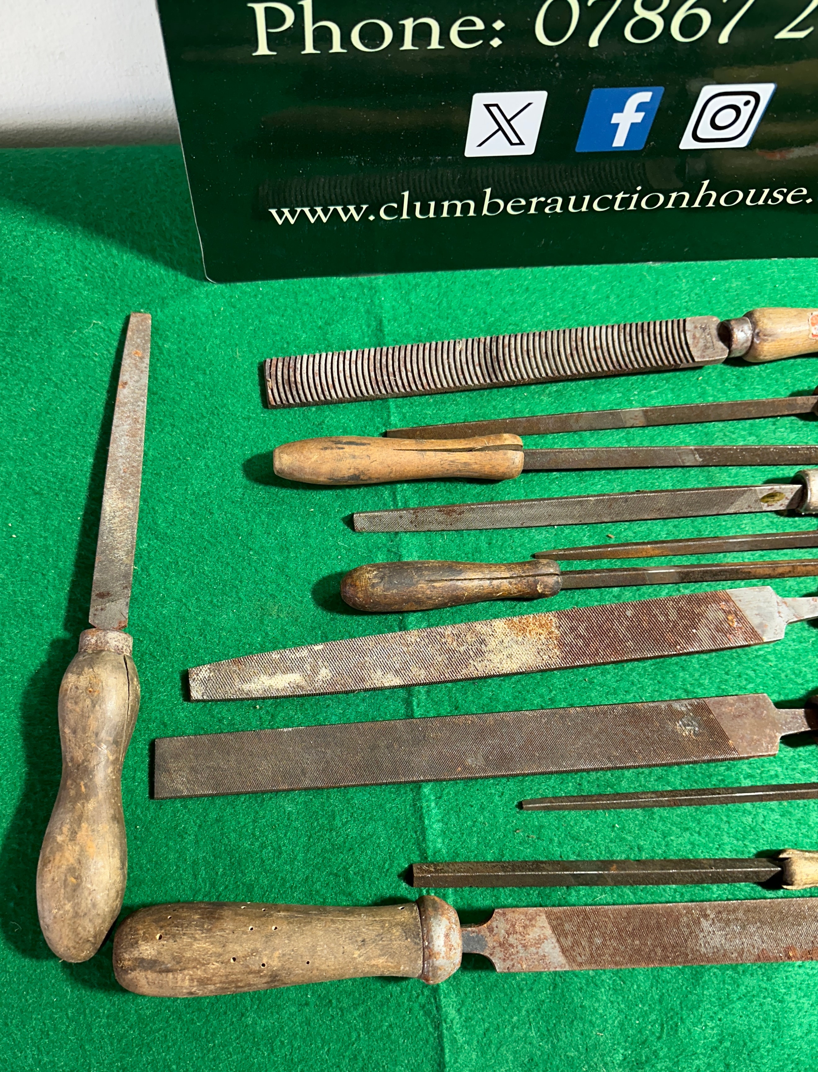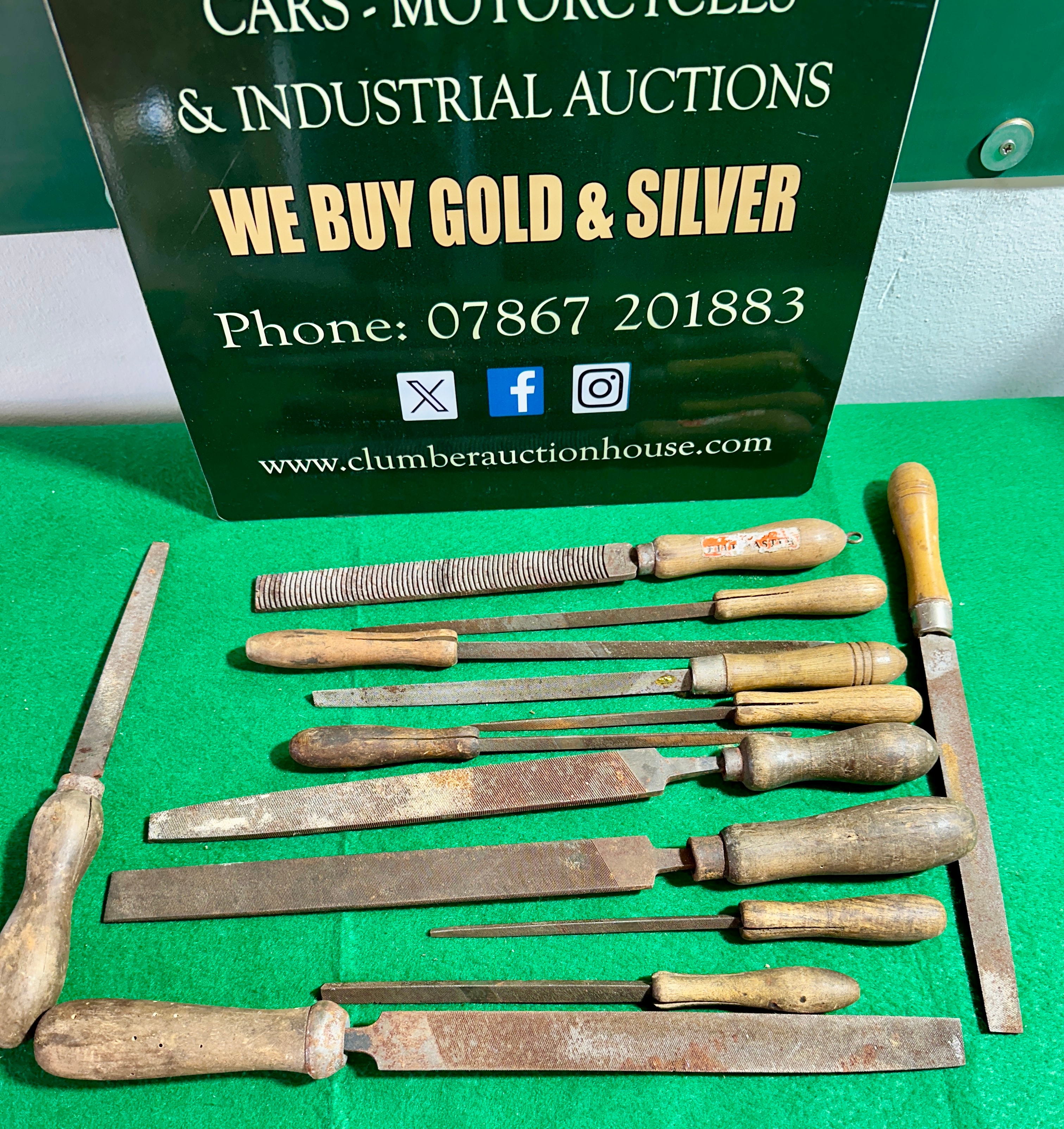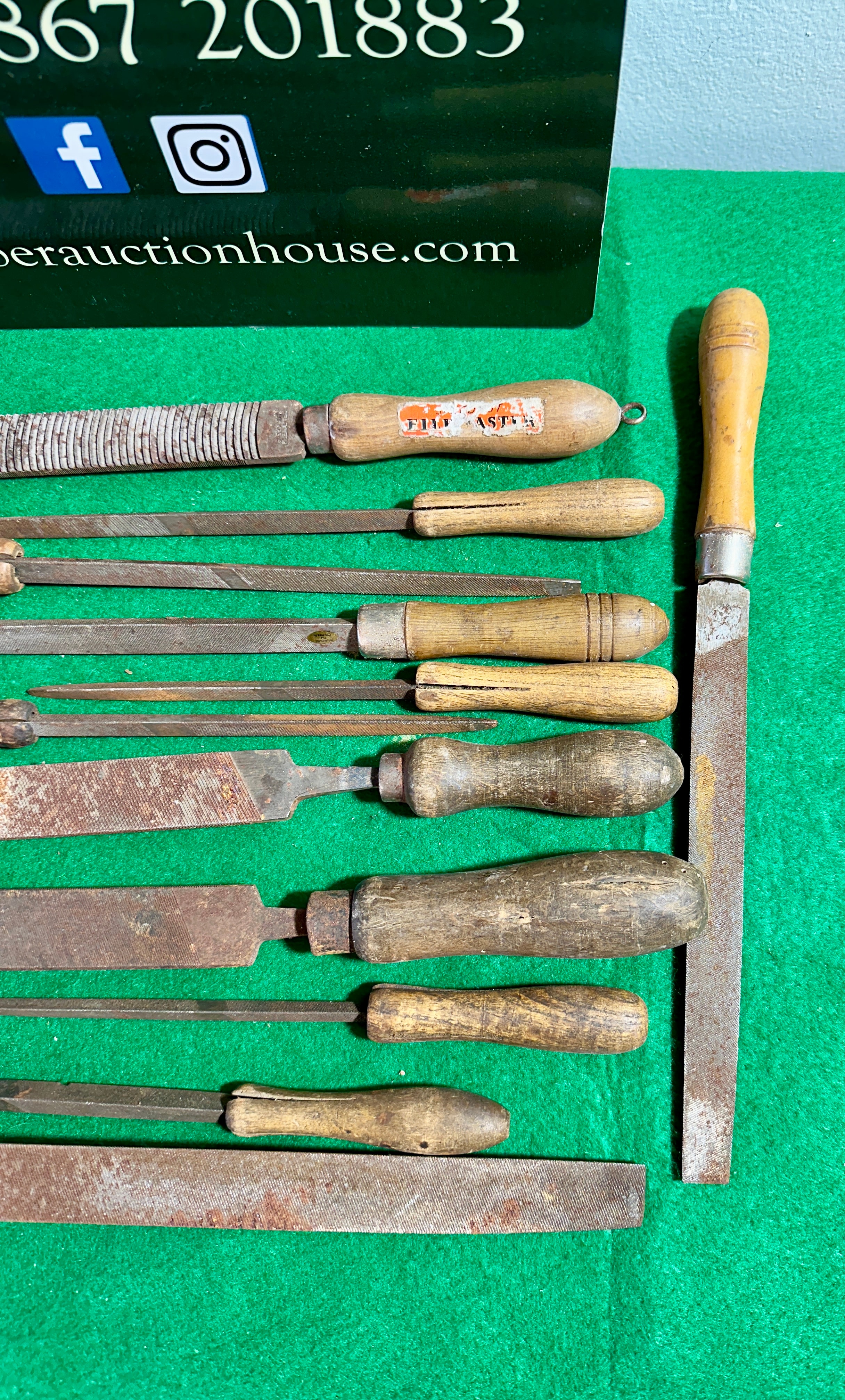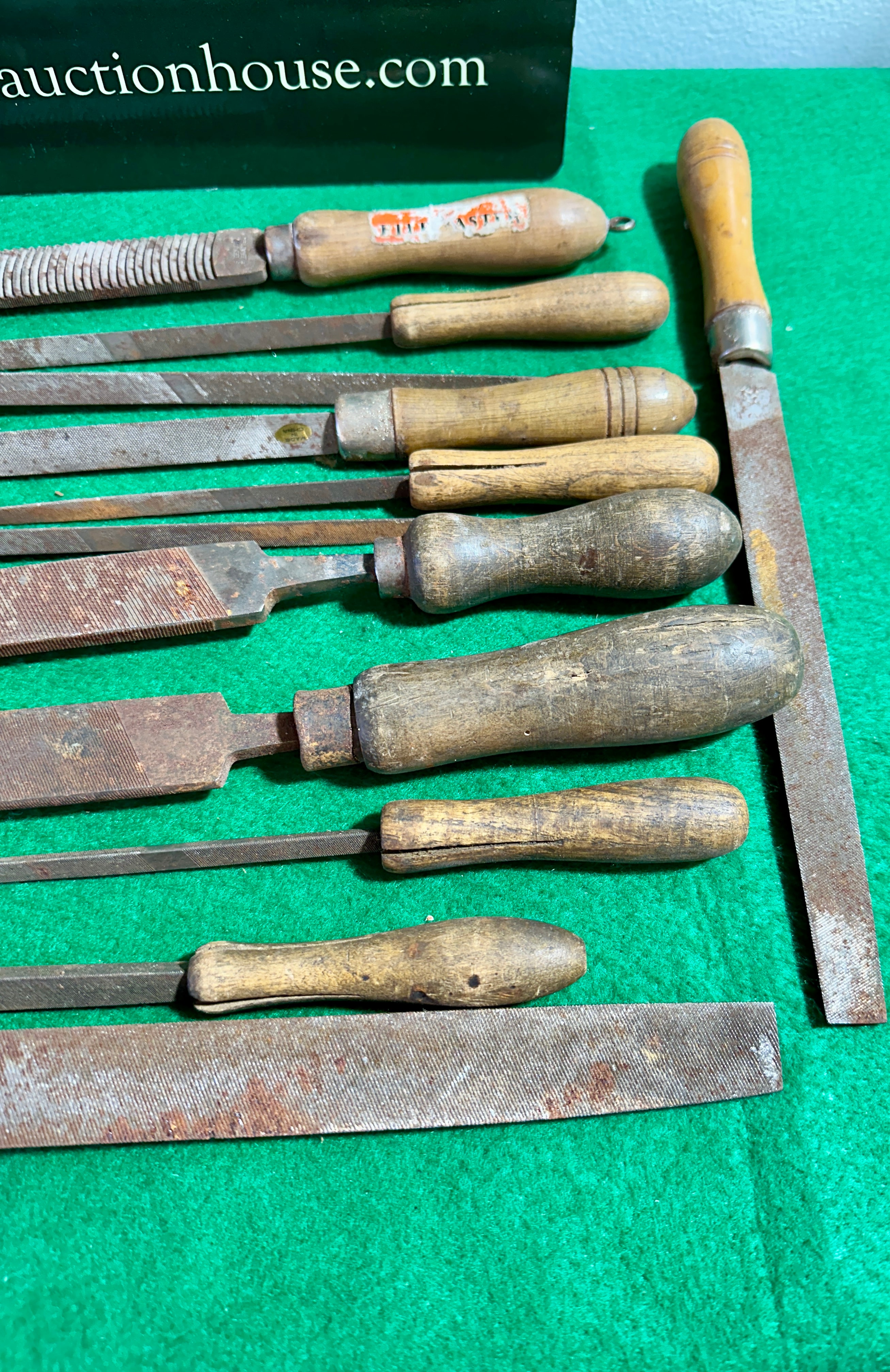 A collection of twelve Kearney & Foot K&F USA hand files and rasps. Each tool features a carbon steel blade with diverse tooth patterns and profiles, including flat, half-round, and round. They are attached to natural wooden handles, some incorporating metal ferrules. One handle bears a partially legible red and white sticker with visible text including “ARTHUR” and “BRITAIN”.