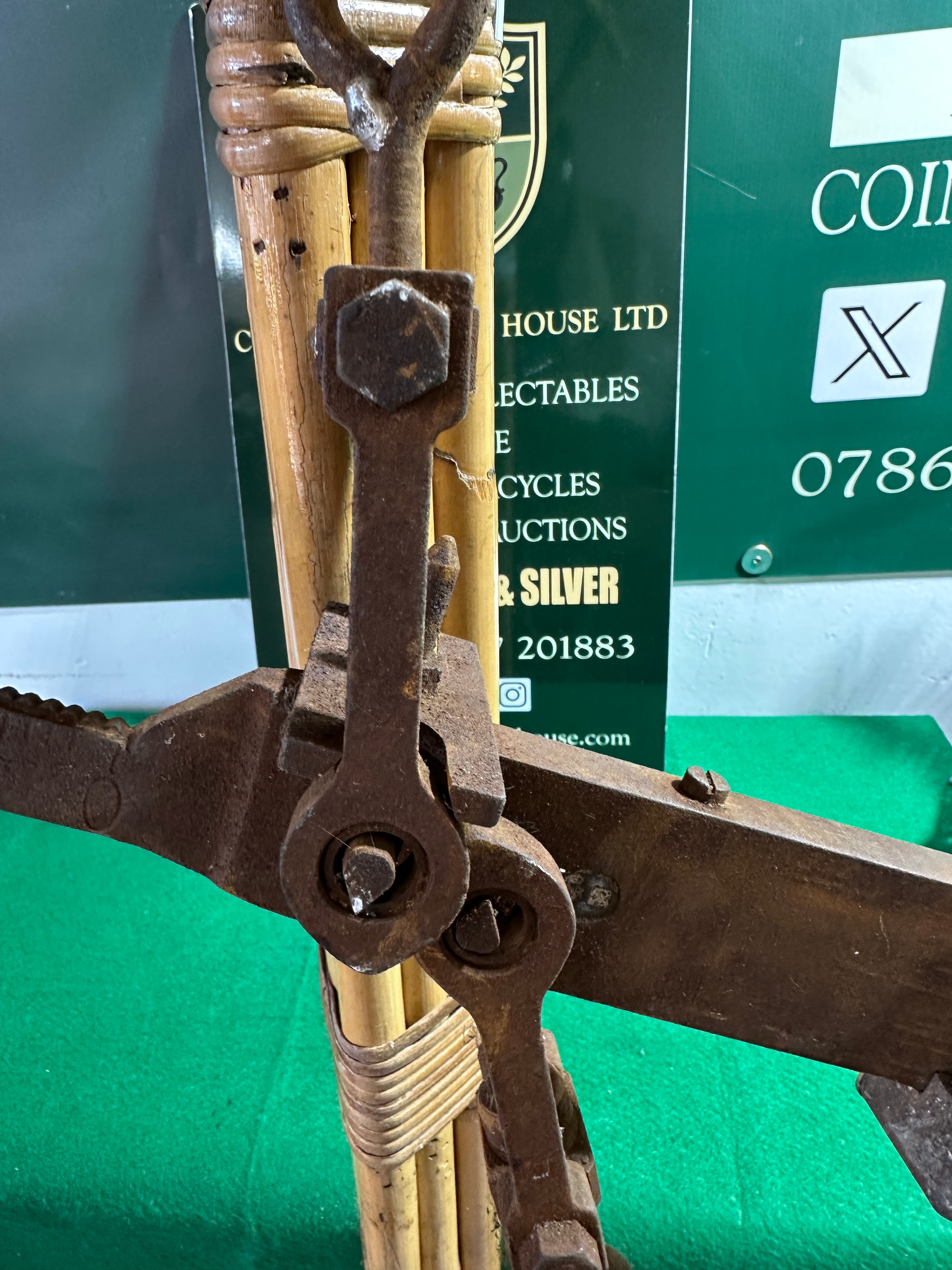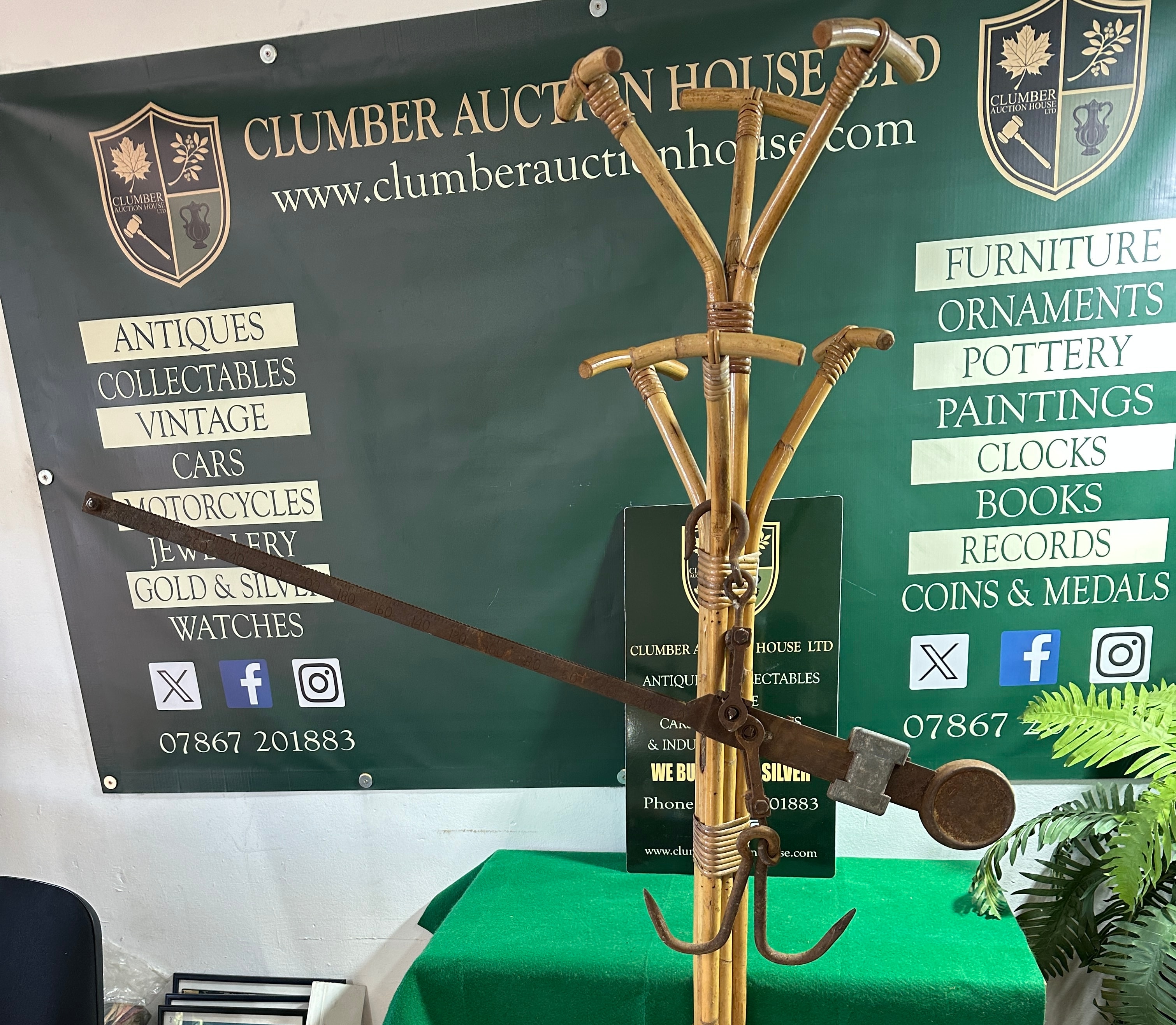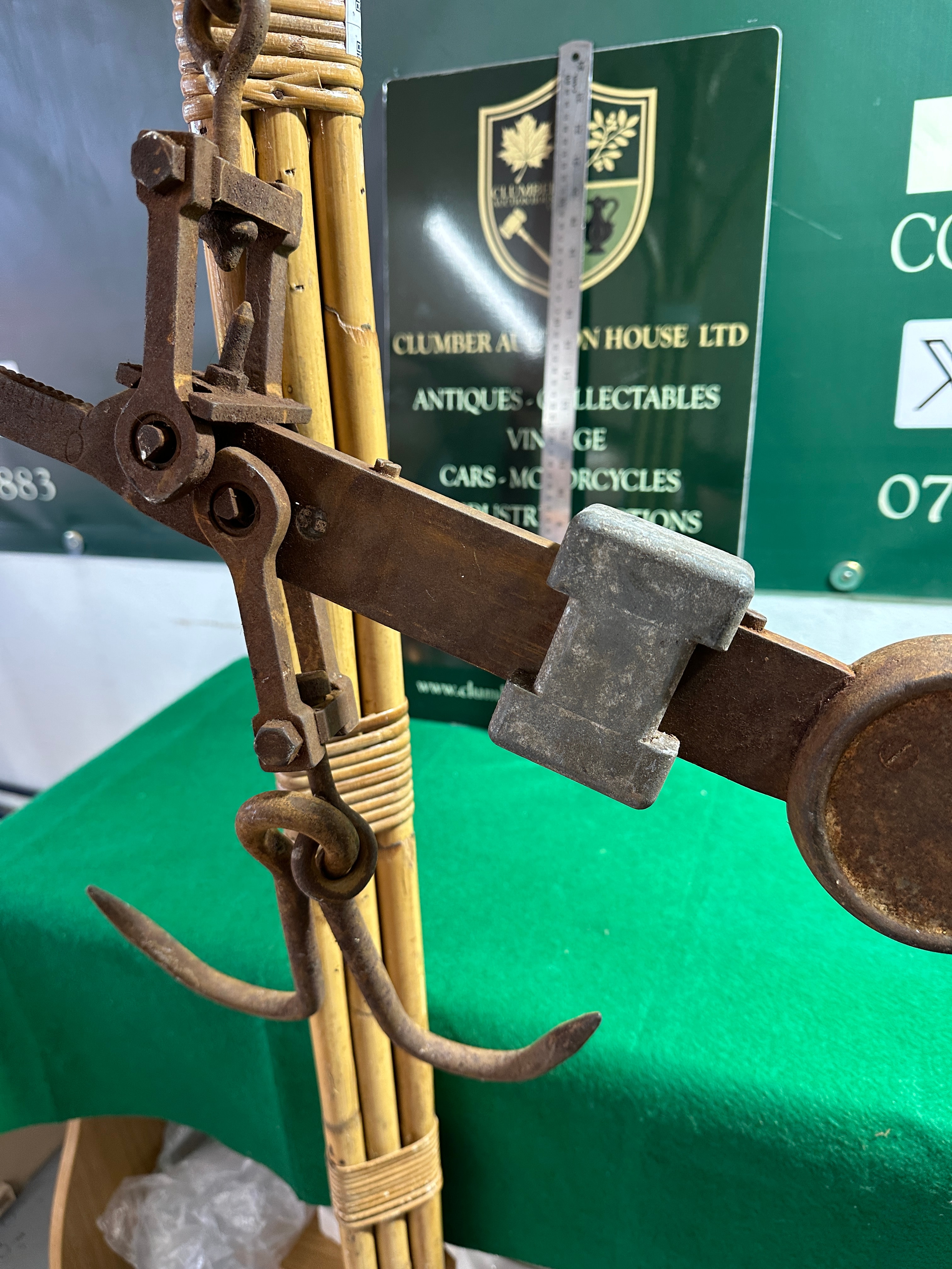 An antique steelyard scale, also known as a Roman balance. Constructed predominantly from iron or steel, it features a long, rectangular metal beam with a movable poise (sliding weight) and a fixed counterweight on one end. A robust metal hook is present for suspending items. The design suggests a utilitarian or industrial application.