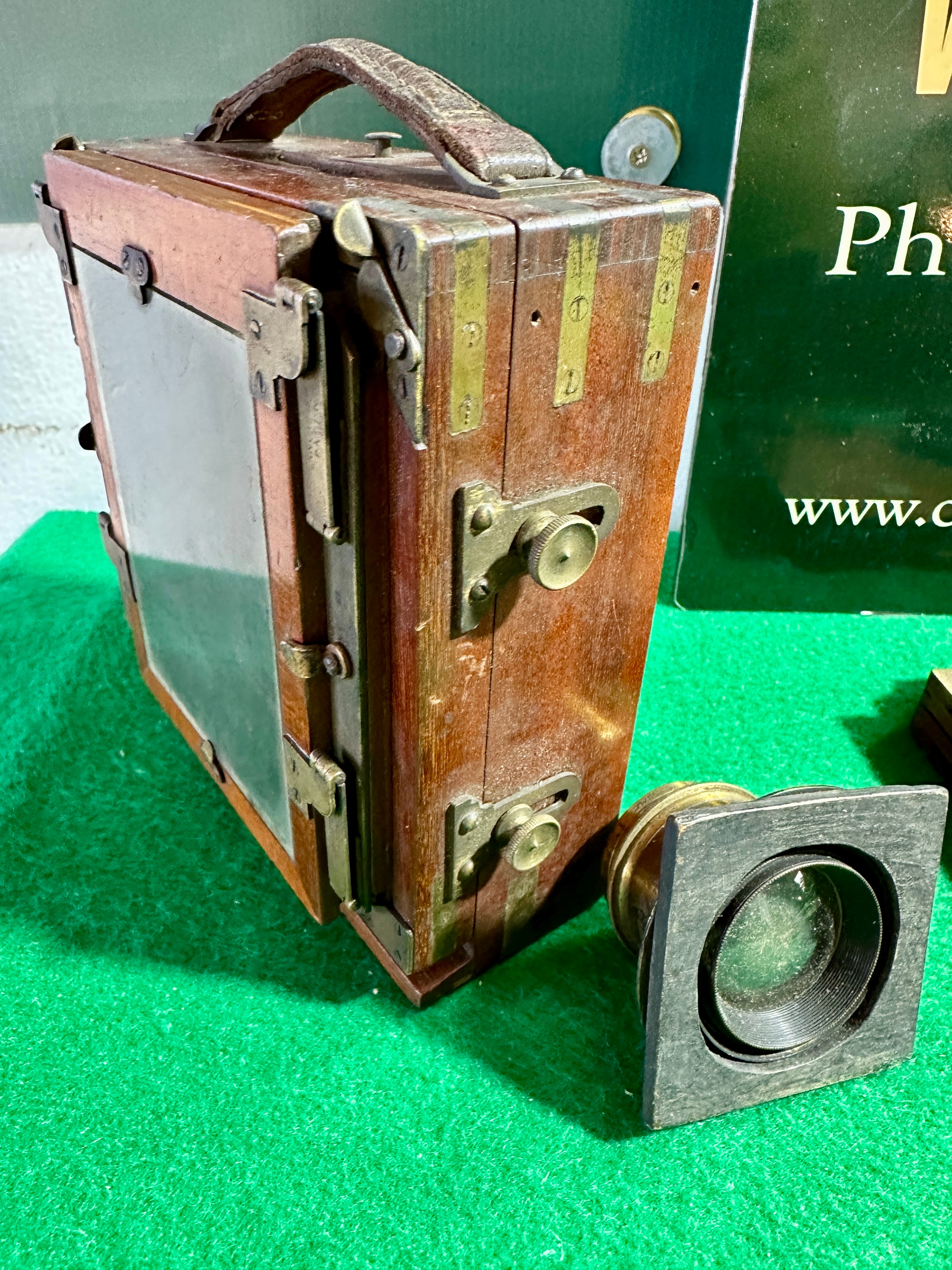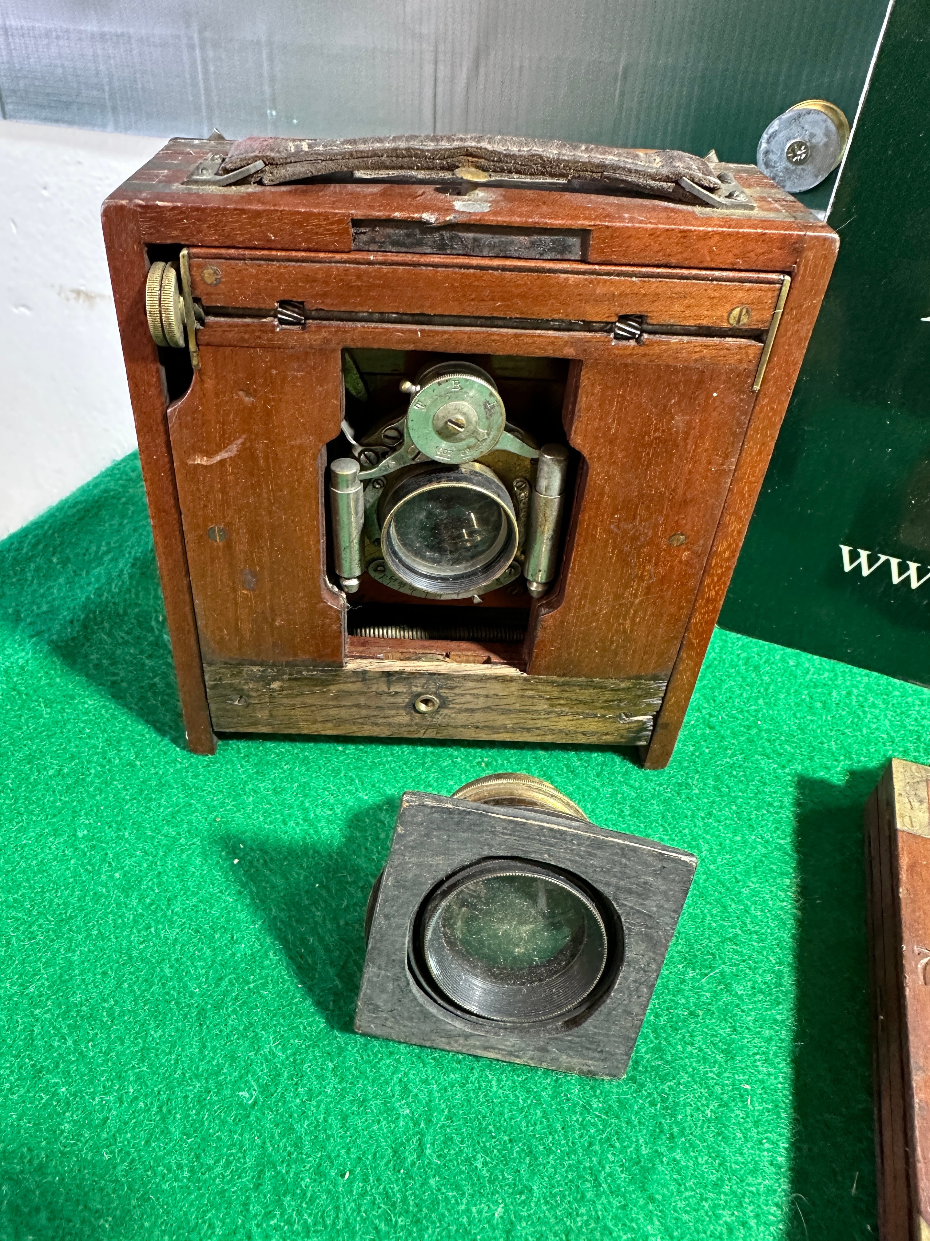 A vintage, possibly late 19th or early 20th-century, “The Imperial Hand Camera” by C.J.C. Manufacturing Co. The box-style hand camera is constructed from dark-stained wood with brass hardware, including corner reinforcements and a leather carrying handle. Accompanying the camera are five wooden plate holders, each with brass hinges and escutcheons. A small, dark brown case, likely leather or imitation leather, is present and legibly marked with “THE IMPERIAL HAND CAMERA / C.J.C. MANUFACTURING CO / 99, QUEEN VICTORIA ST / LONDON E.C.”. The collection also includes an additional camera lens set in a square wooden mount and several flat, dark metal plates, likely dark slides or unused photographic plates.