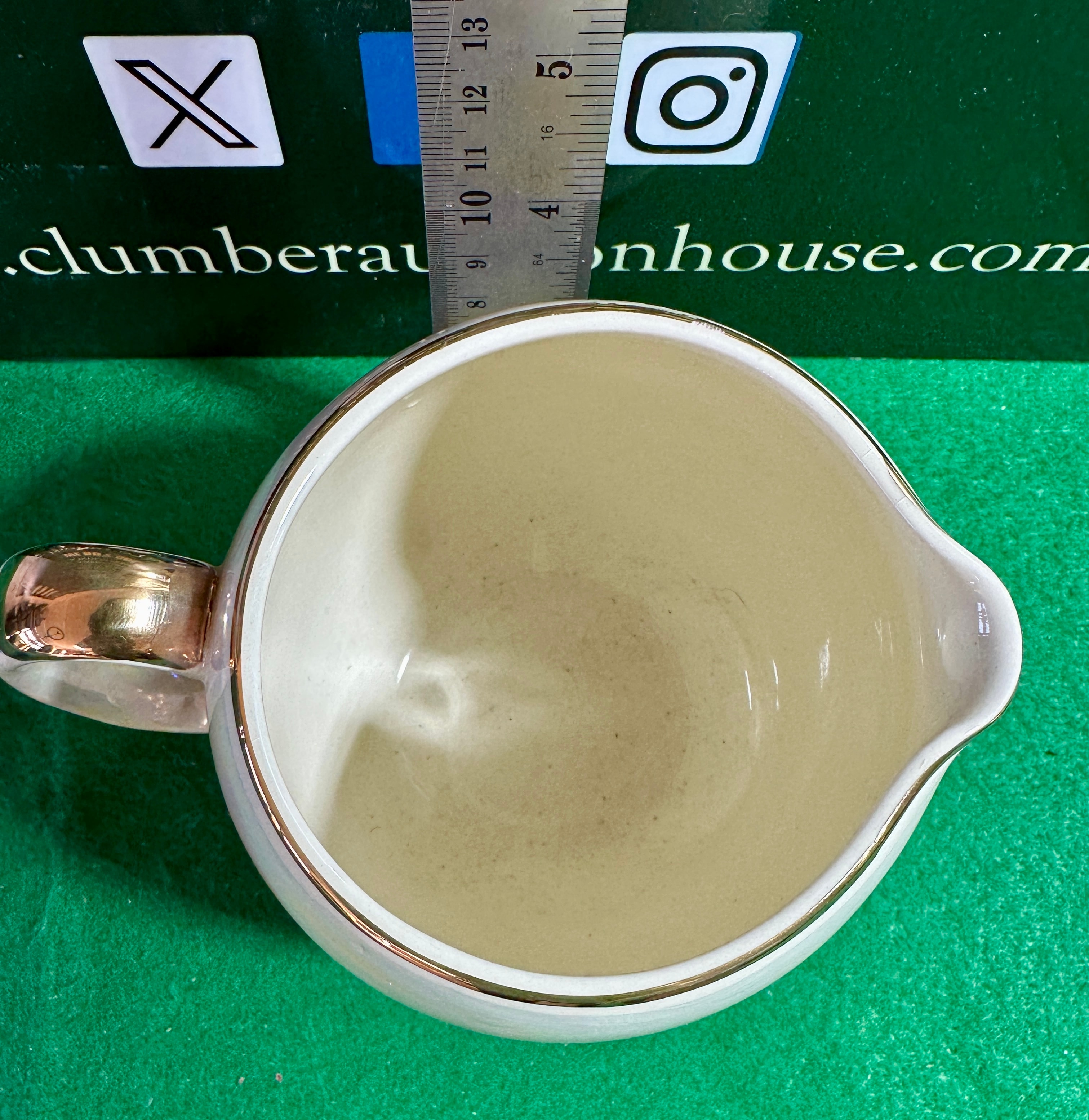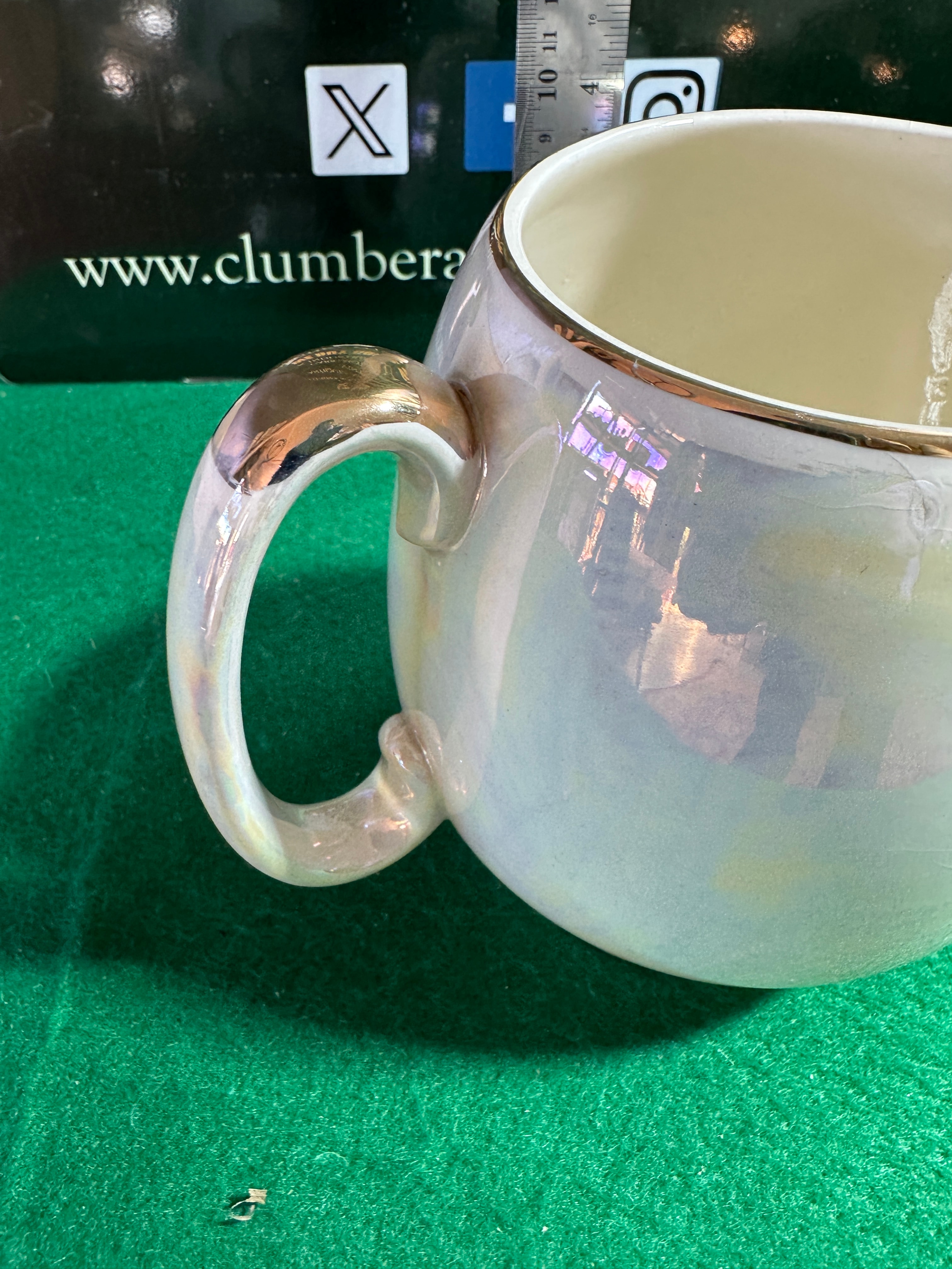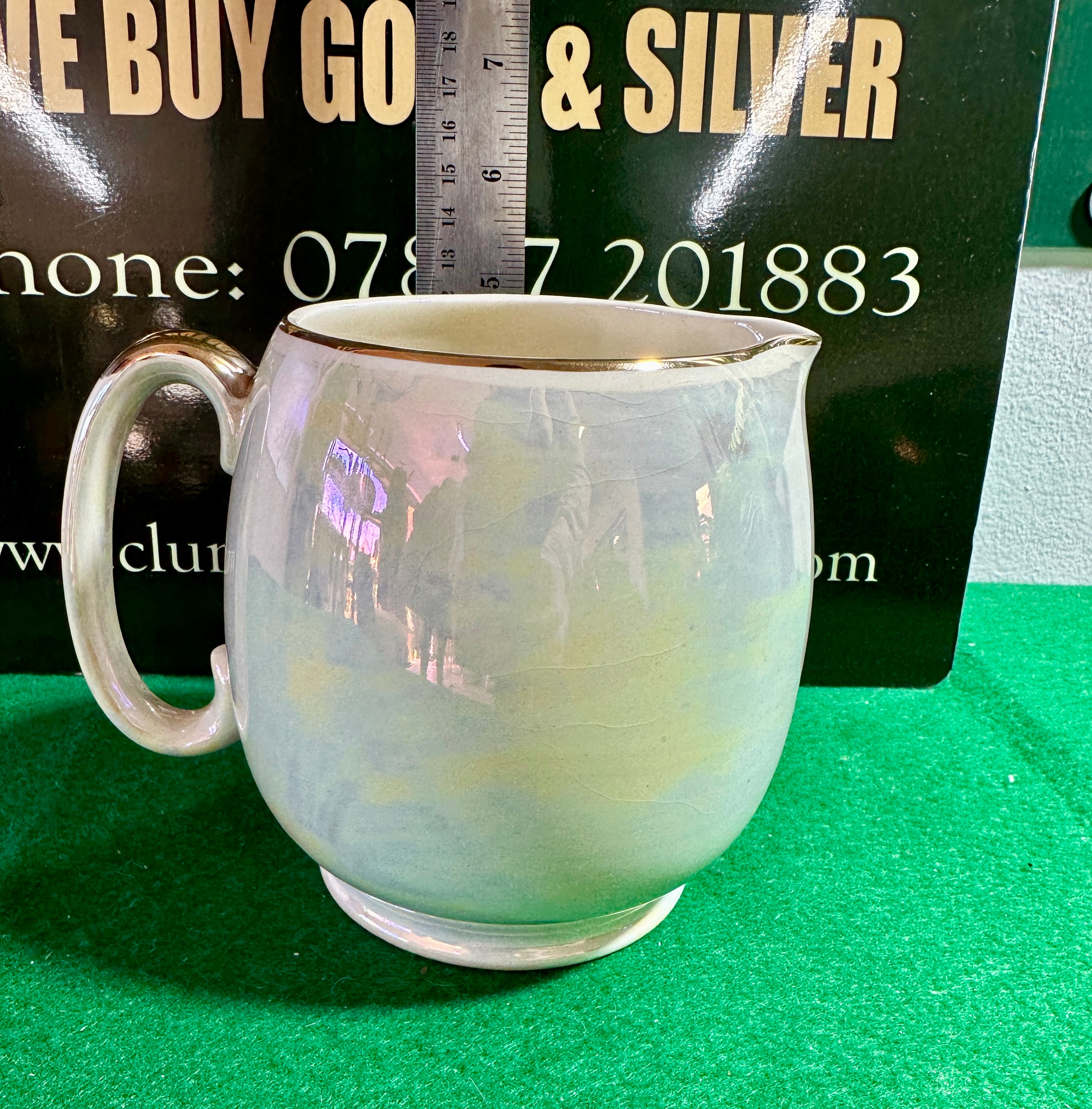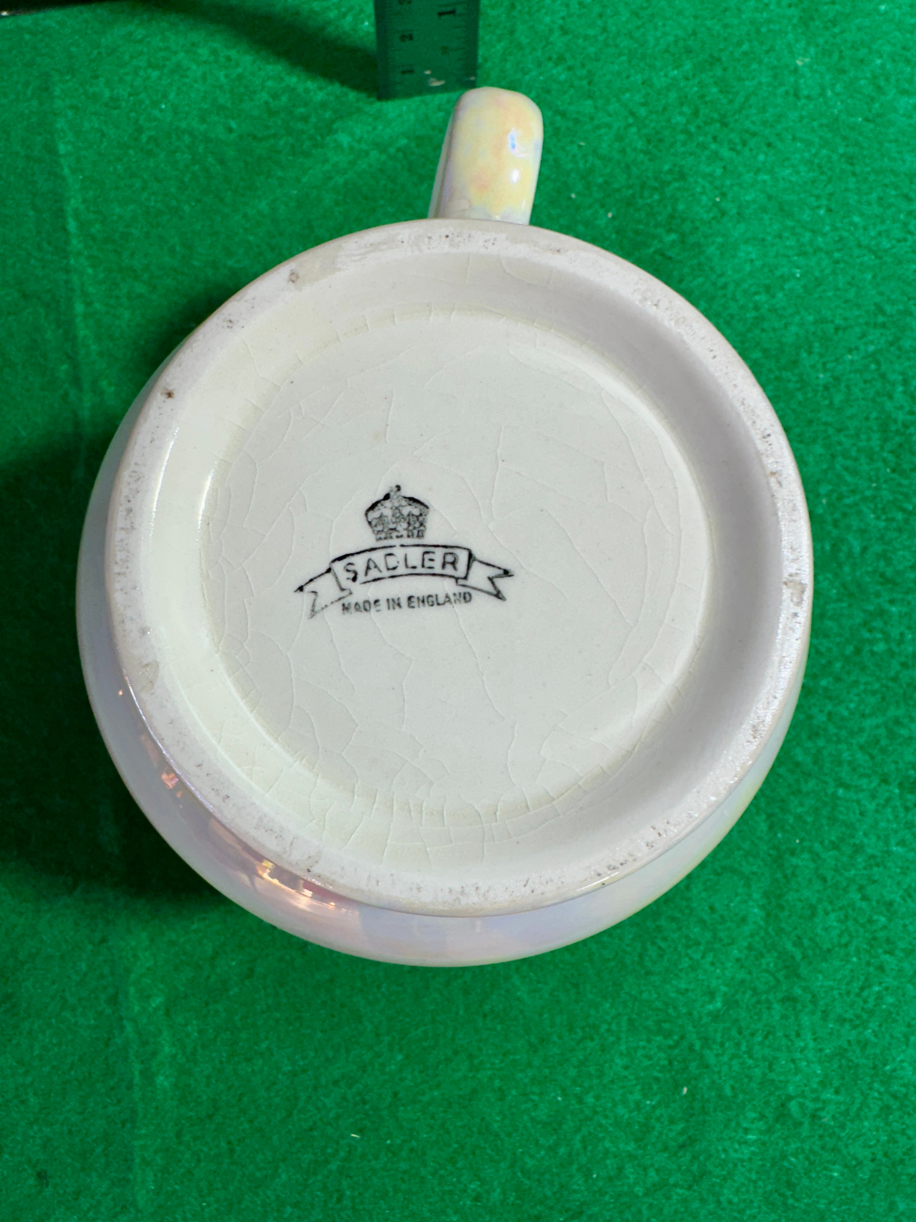 A SACLER Made in England iridescent luster creamer or milk jug. The ceramic body features a rounded, globular form with a simple pouring spout and a C-scroll handle. It is finished with an iridescent, pearlescent luster glaze. Gilt accents adorn the rim and the top of the handle. The base is marked with a crown motif above a banner displaying ‘SACLER,’ with ‘MADE IN ENGLAND’ printed below.