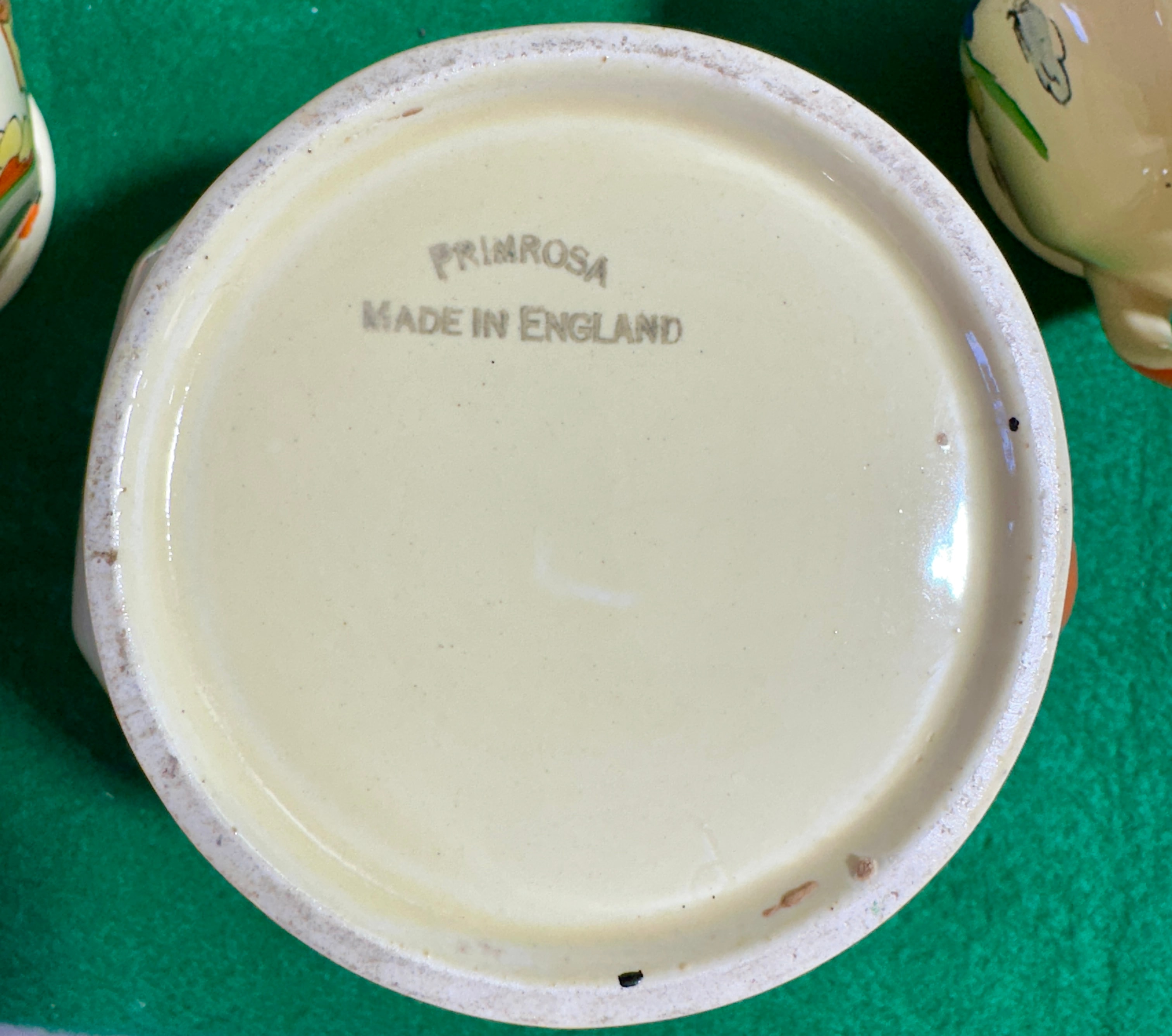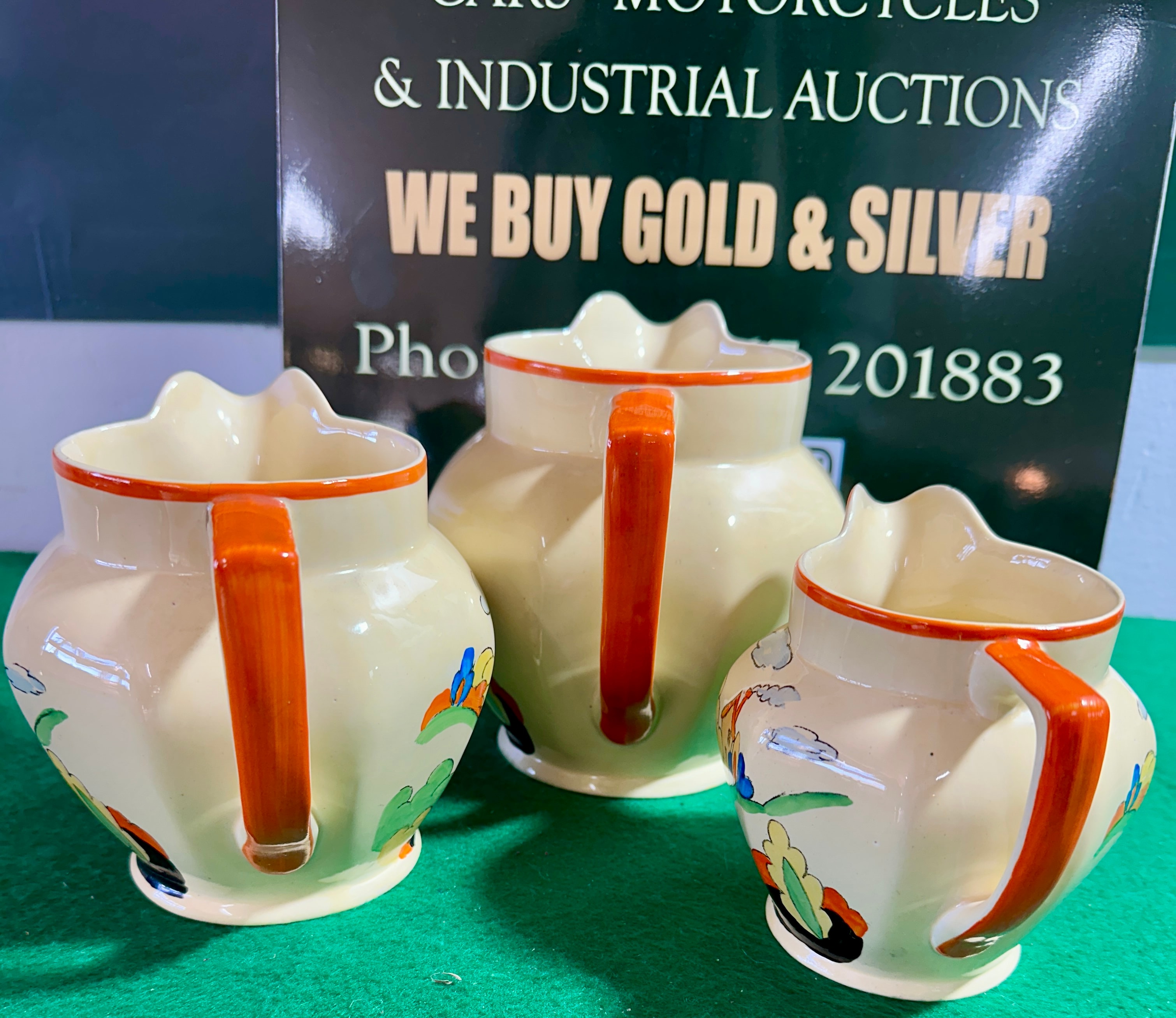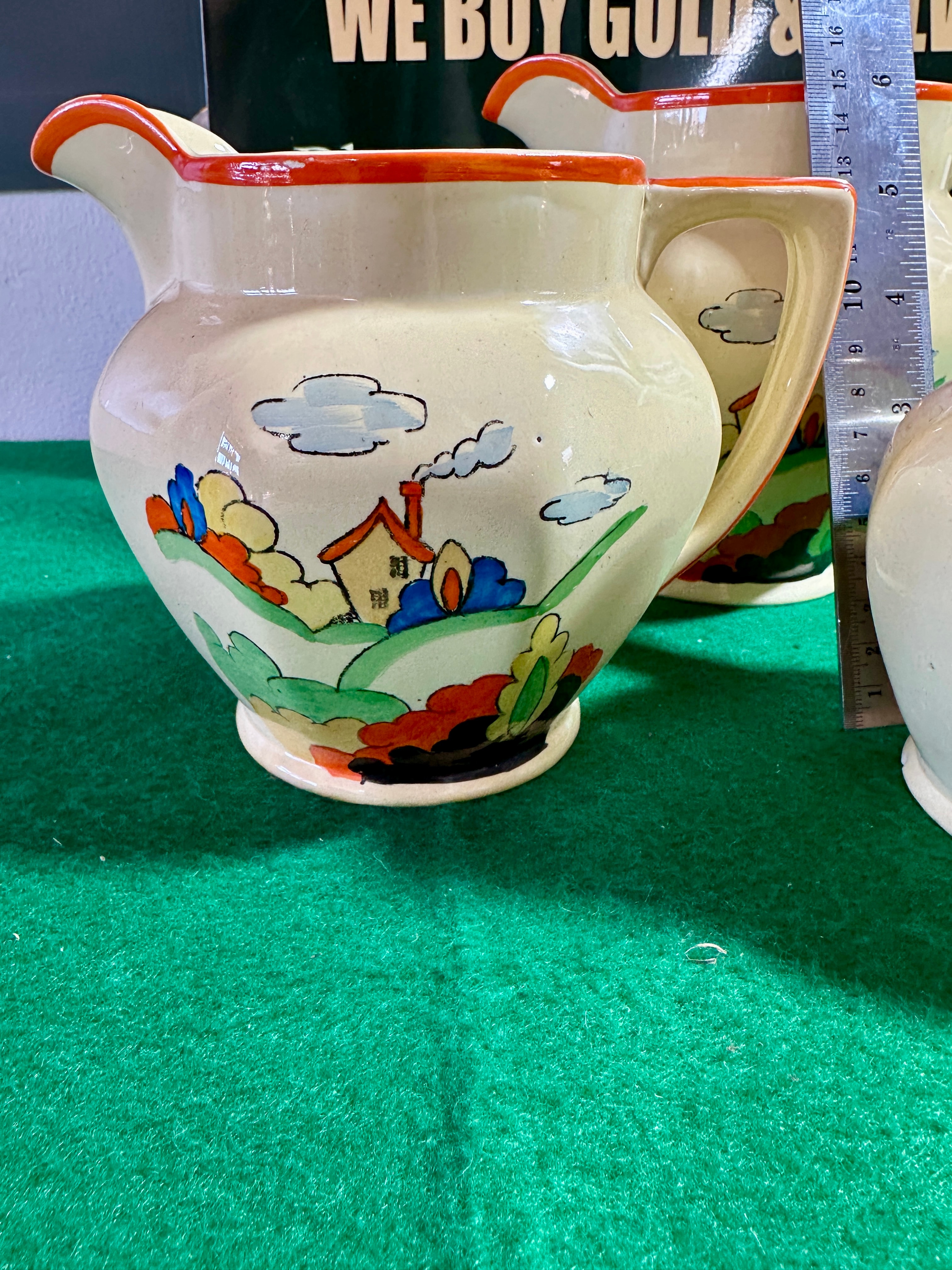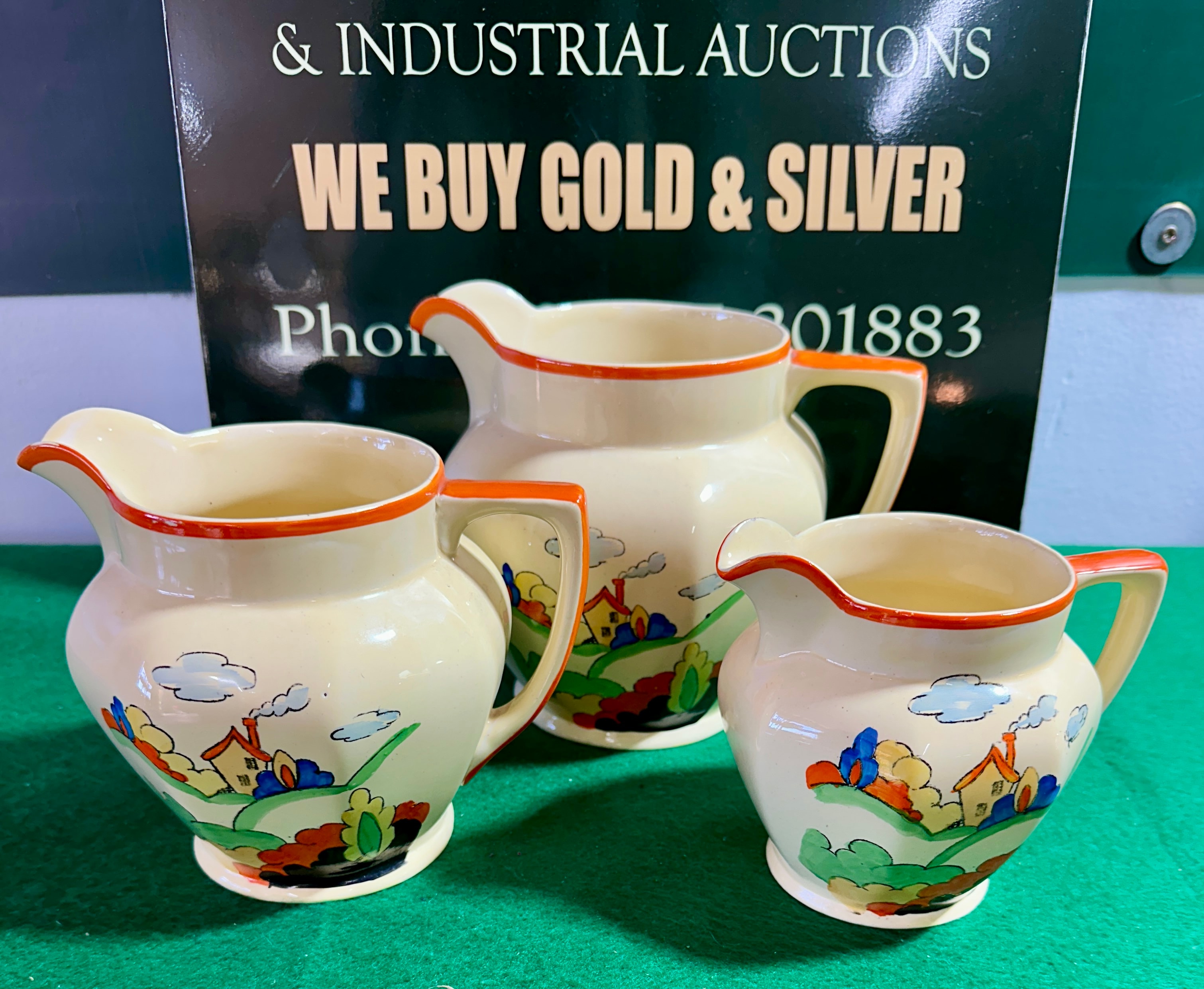 A set of three graduated ceramic jugs by Homer Laughlin in the ‘Mexicana’ pattern, dating to the circa 1940s. Each jug features a stylized, colorful landscape decoration depicting houses, rolling hills, trees, and clouds in a palette of orange, blue, green, red, and black on an ivory body. Each is accented with an orange-glazed rim and handle. The base of one jug bears the impressed or printed mark “PRIMROSA” and “MADE IN ENGLAND”.