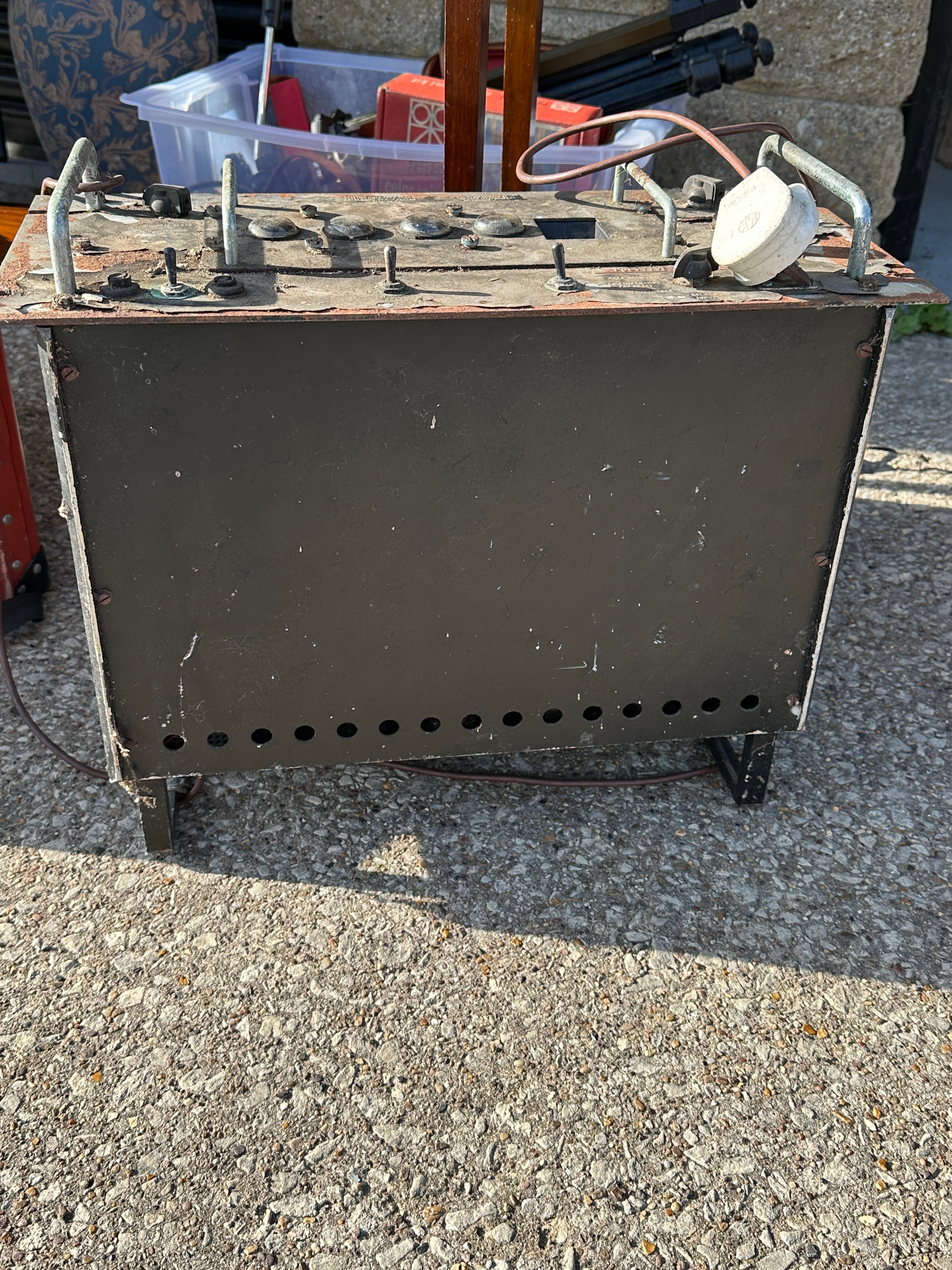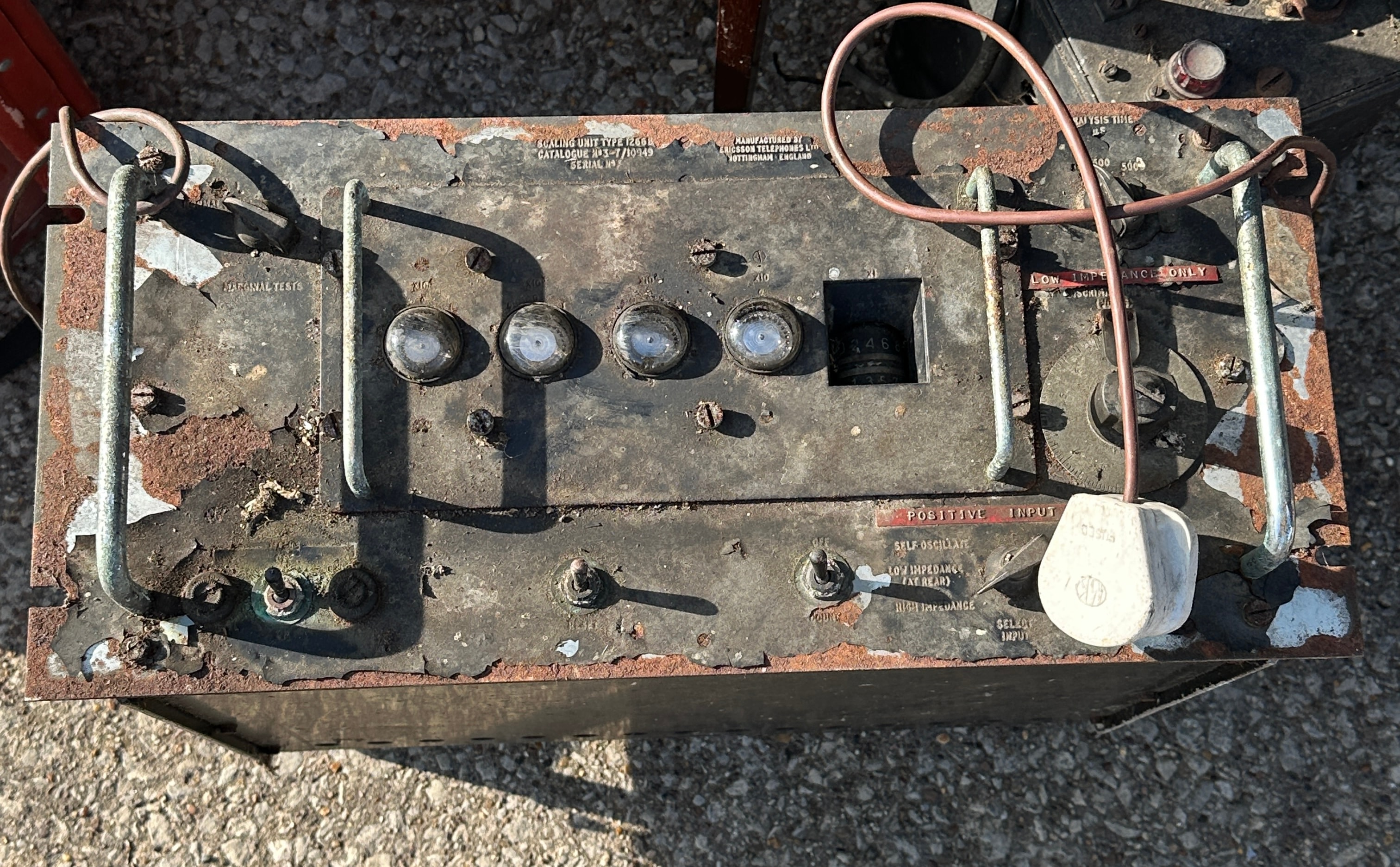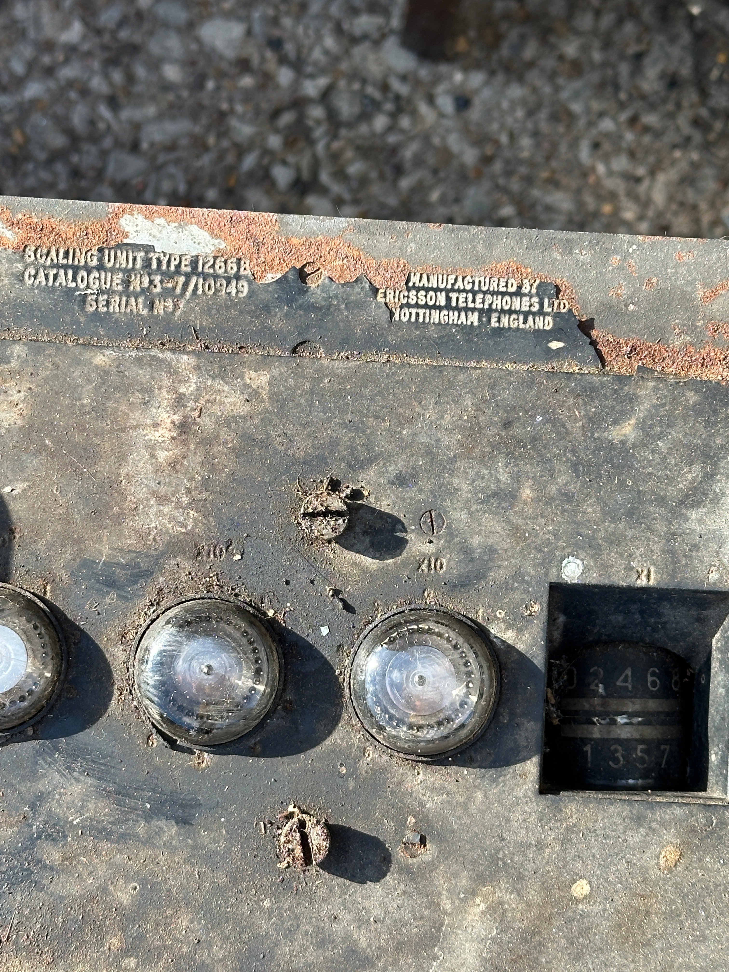A utilitarian, industrial-style electronic device identified as a Scaling Unit Type 1266B, Catalogue No. 3-7/10949, manufactured by Ericsson Telephones Ltd of Nottingham, England. Dating to the mid-20th-century, the unit features a metal casing with a top panel that includes four clear-covered circular indicators, two of which are marked “X10.” A rectangular cutout displays a mechanical counter with visible digits such as “1357” and “2468.” Several toggle switches are present, labeled with functions including “POSITIVE INPUT,” “SELF IMPEDANCE,” and “DELAY INPUT.” A white UK-style three-pin electrical plug is attached via an insulated wire.
