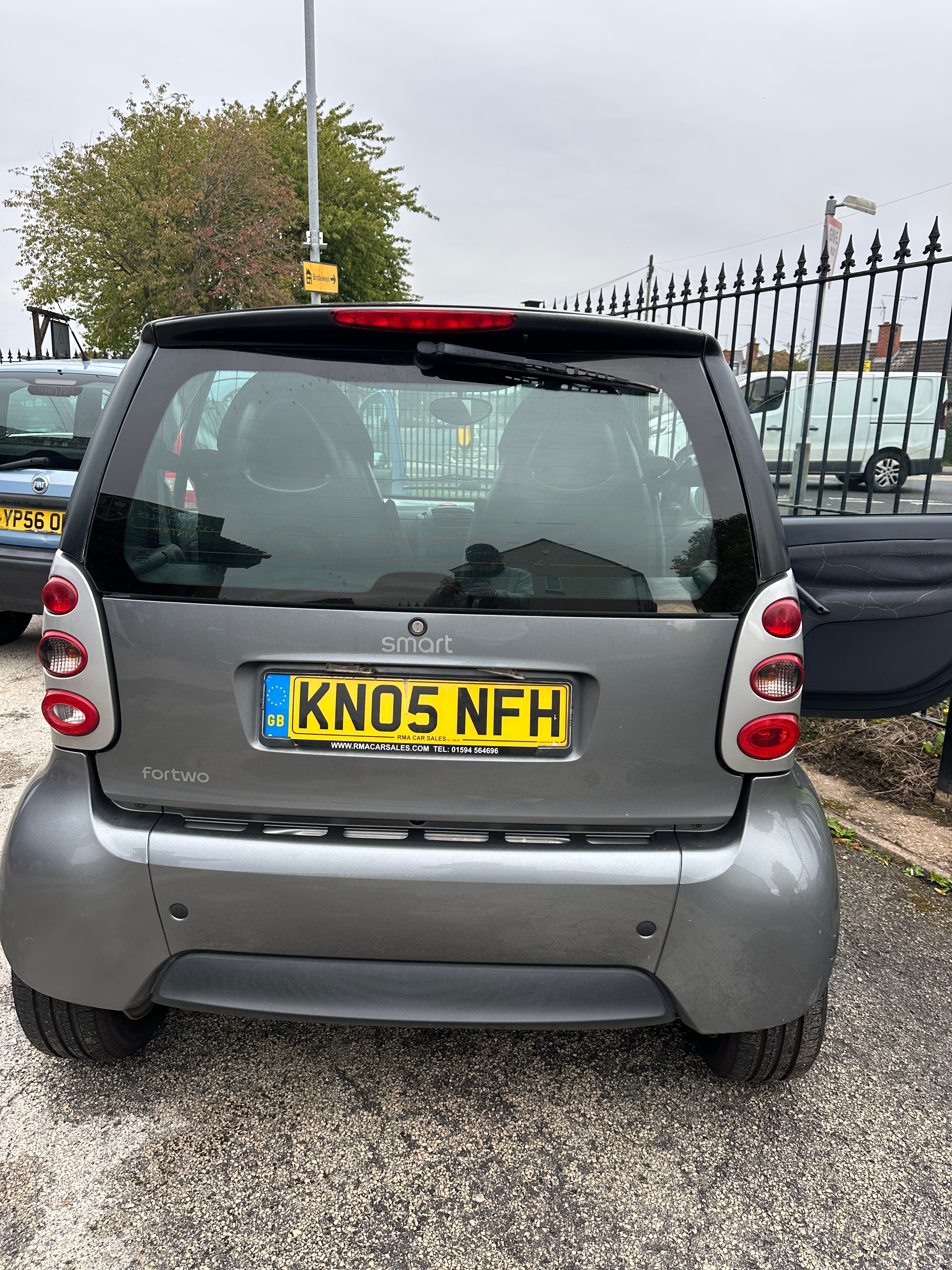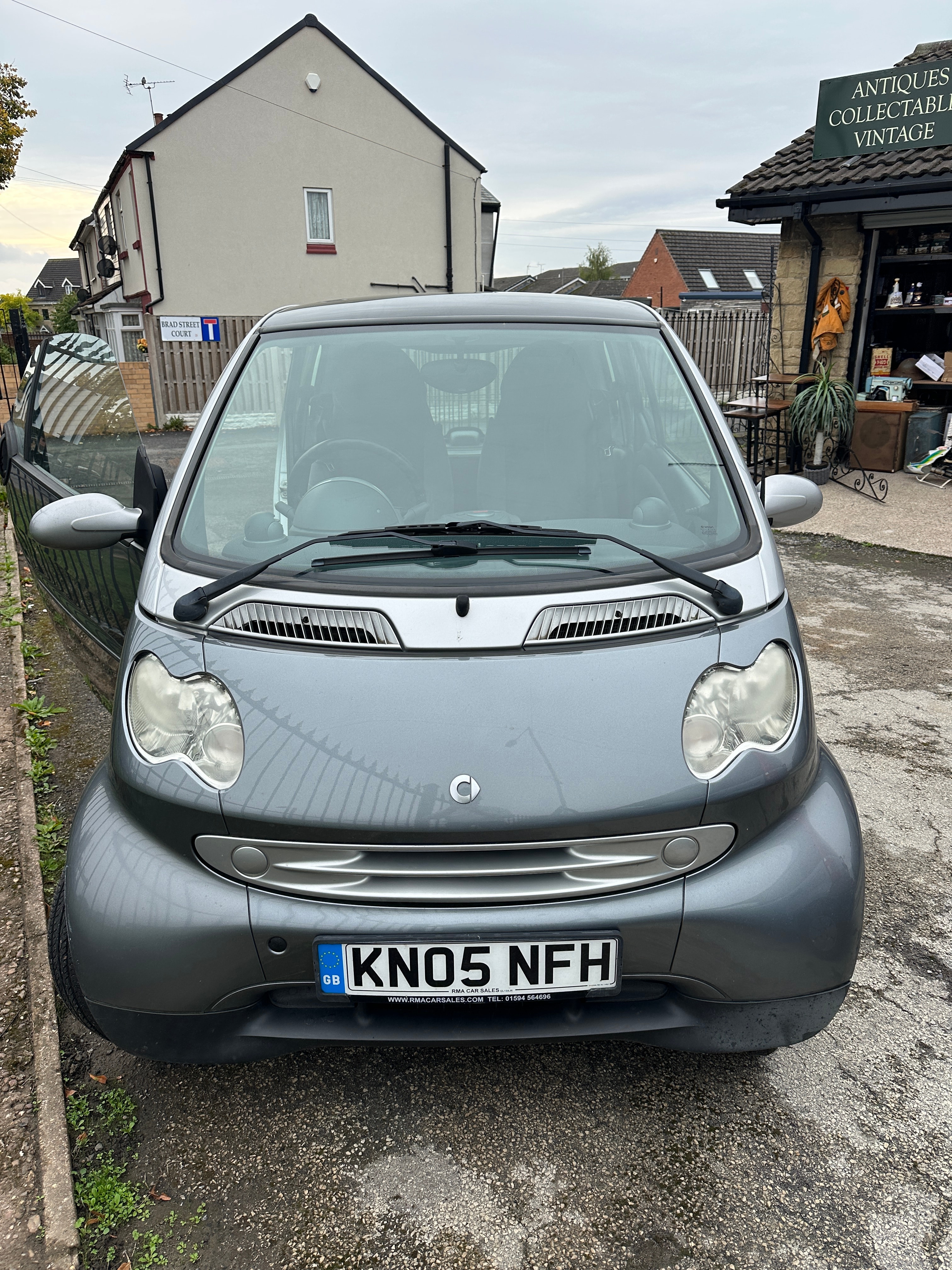 A 2005 Smart Fortwo Coupe, featuring a semi-automatic transmission and a 698cc diesel engine. The vehicle presents in a two-tone grey finish, comprising plastic and metal body panels. It is a two-door model, registered in the UK under the plate ‘KN05 NFH’. The front grille bears the distinctive Smart logo, while the rear is badged ‘smart’ and ‘fortwo’. The interior is fitted with grey patterned fabric seats, a grey plastic dashboard, and the ‘Smart’ logo on the steering wheel. The digital odometer displays a reading of 48,224 miles.