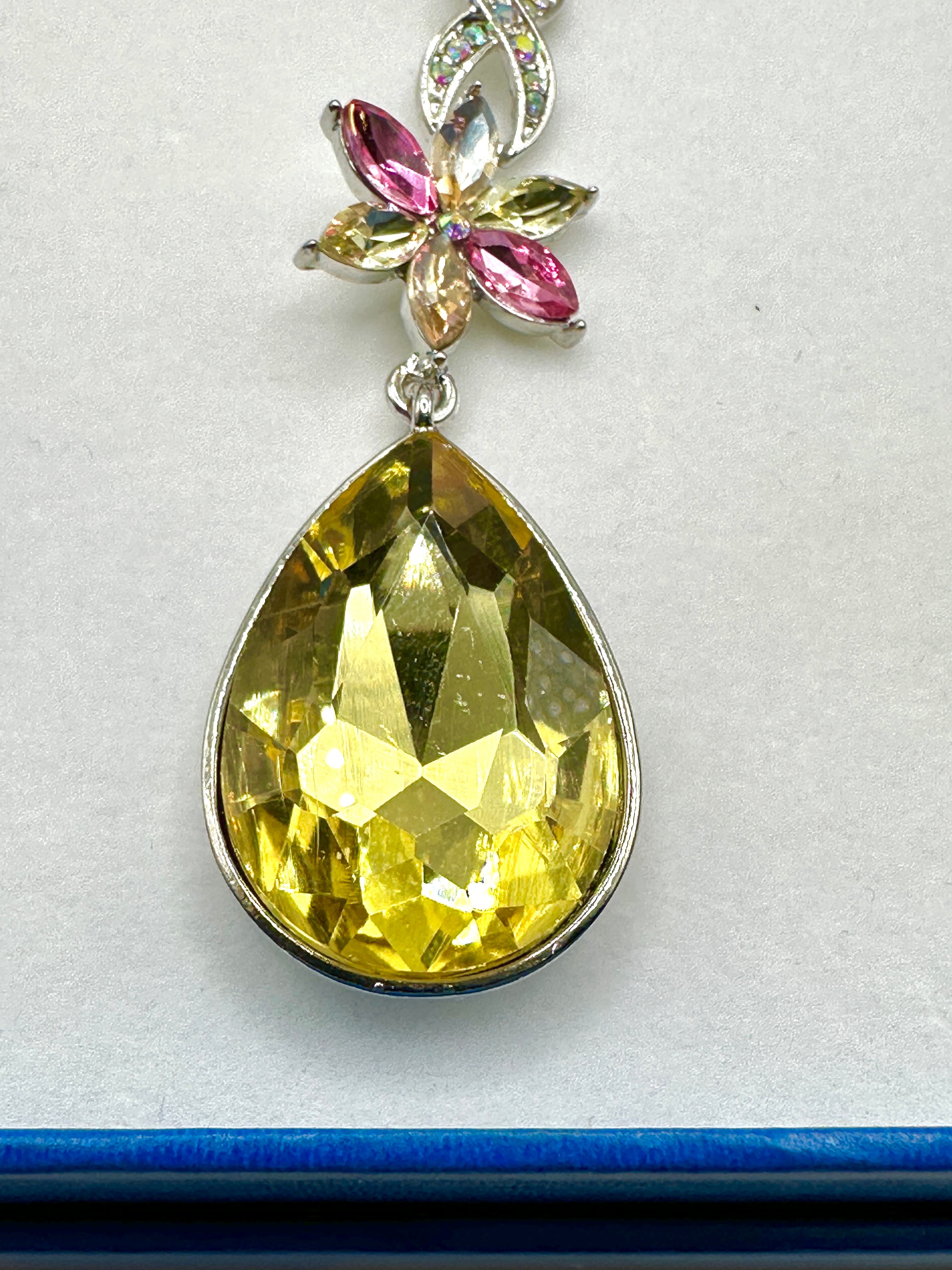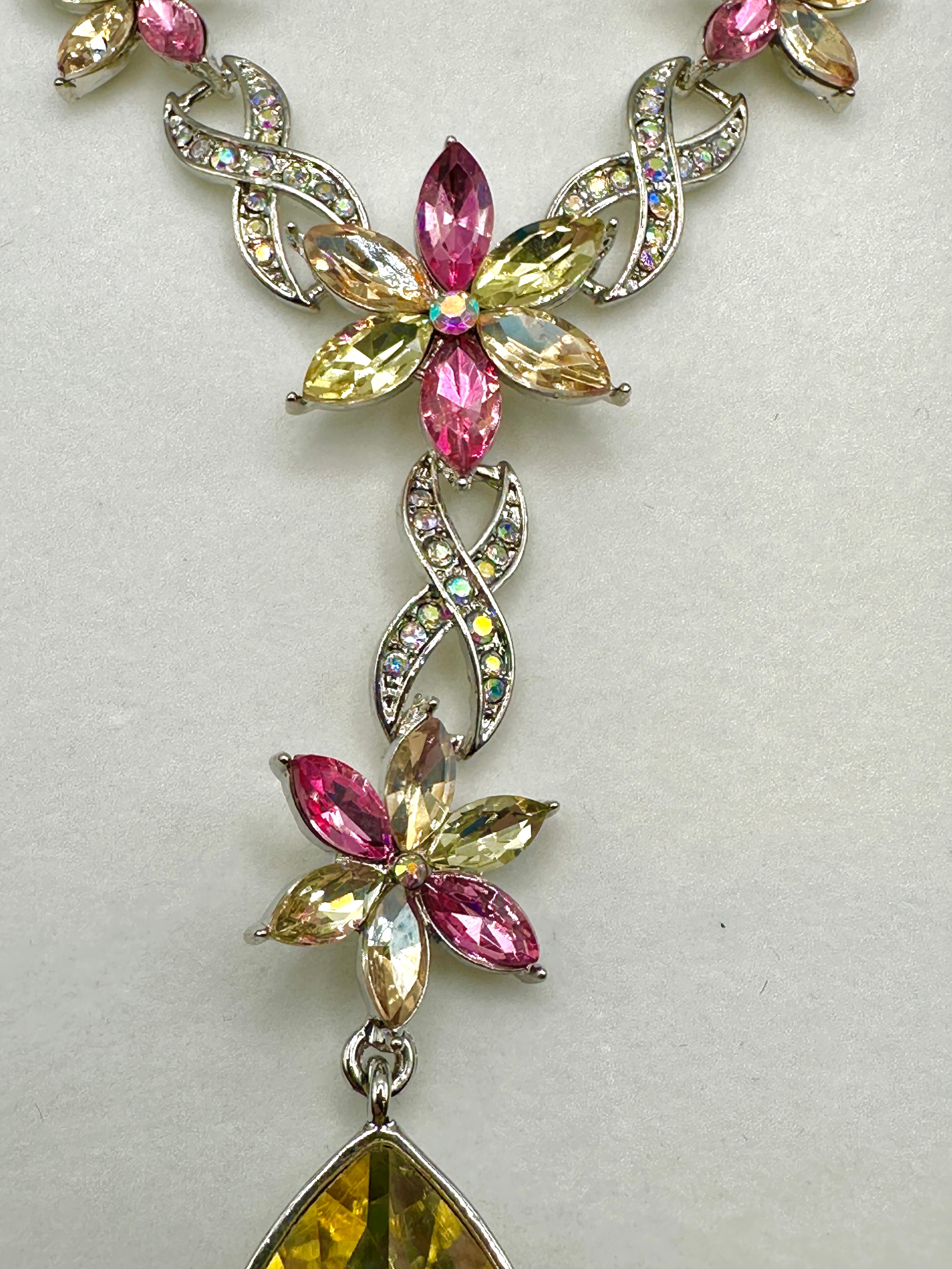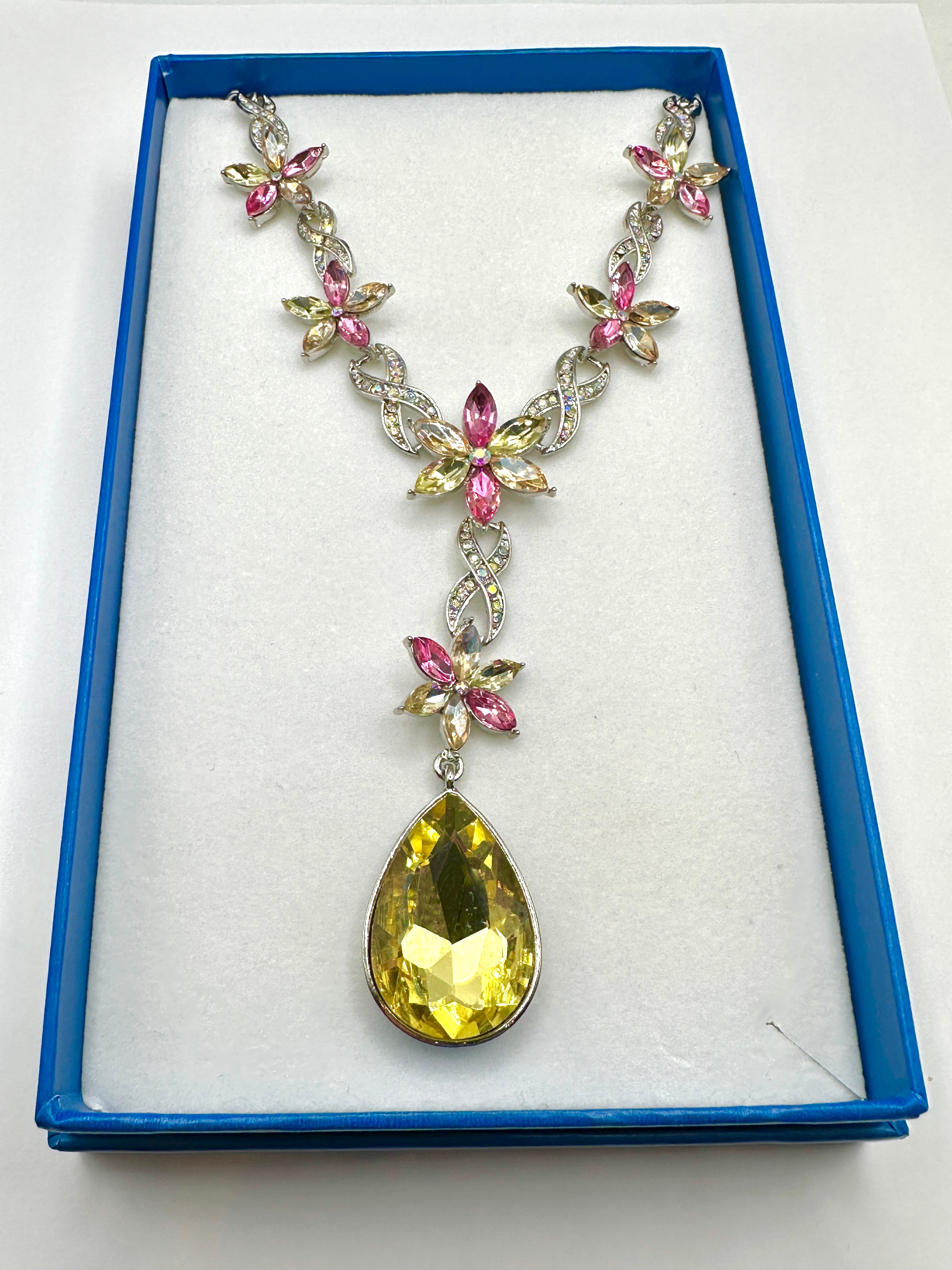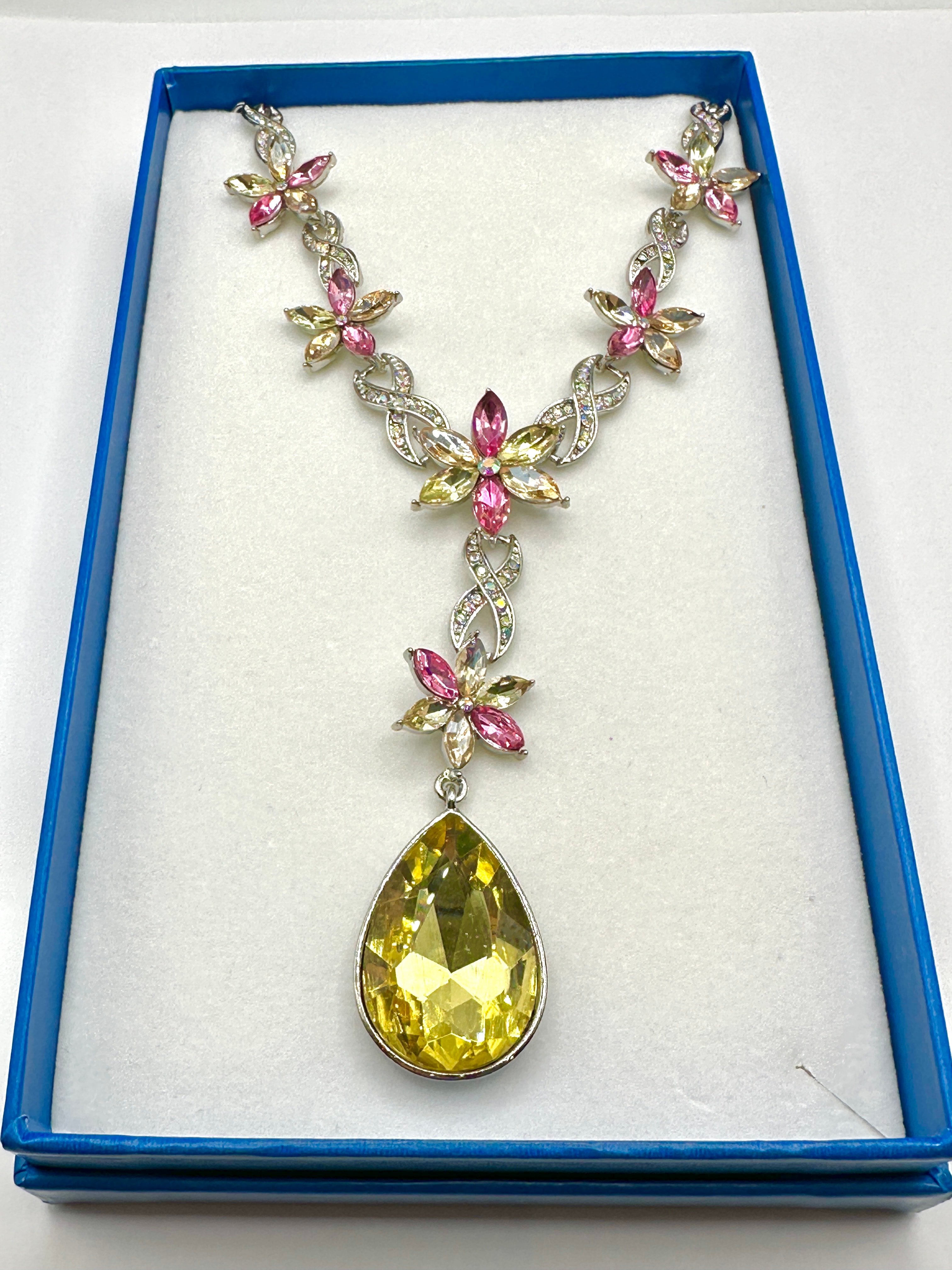 This modern costume necklace features a silver-tone metal construction. The design incorporates a series of floral motifs, each composed of faceted marquise-cut stones in shades of pink and yellow/champagne, accented by smaller clear or iridescent round stones. The central section forms a Y-drop style, with intertwined links embellished with smaller clear stones leading down to a large, faceted yellow teardrop-shaped stone set in a simple bezel. The necklace is presented in a blue-lined gift box.