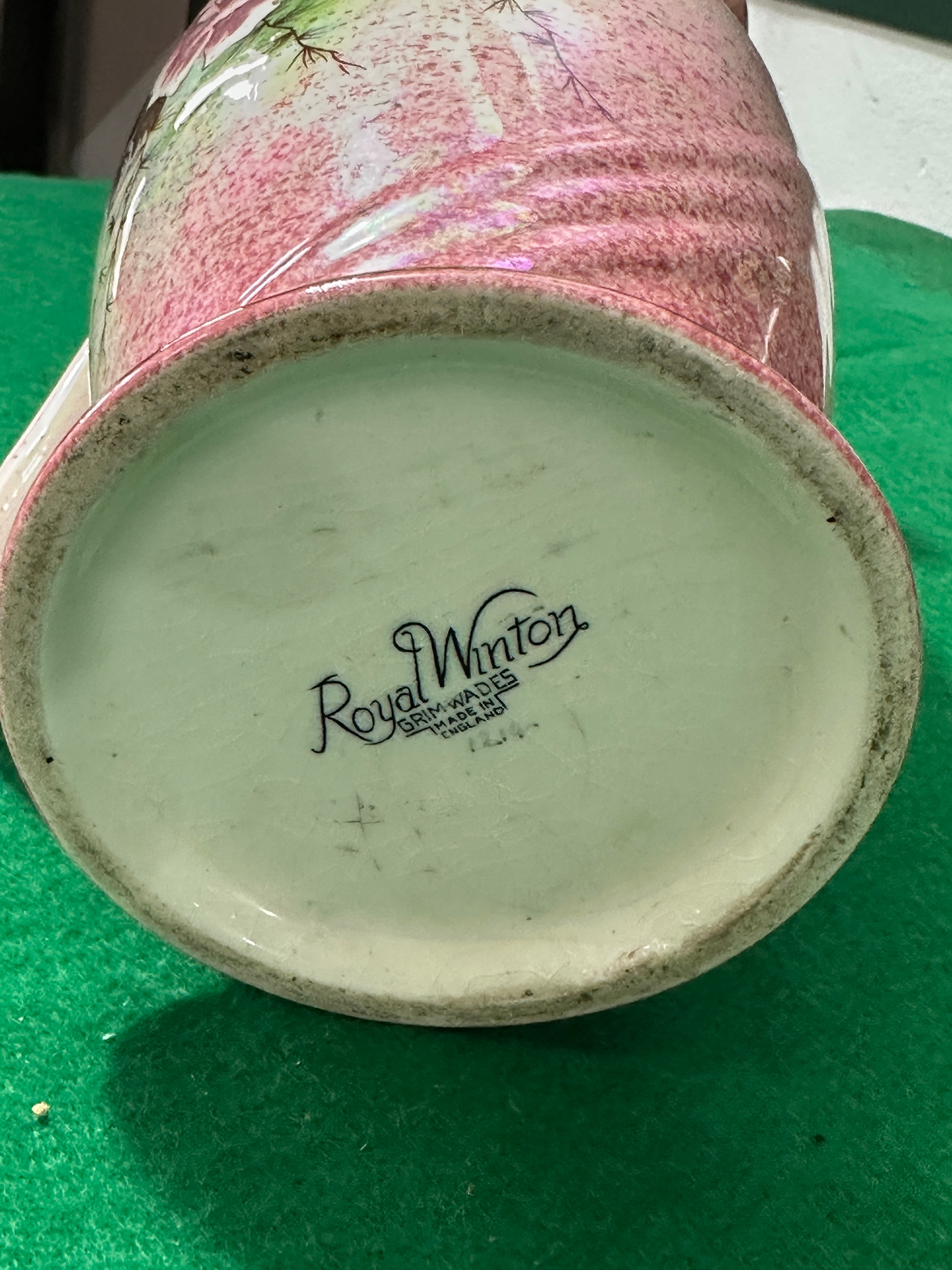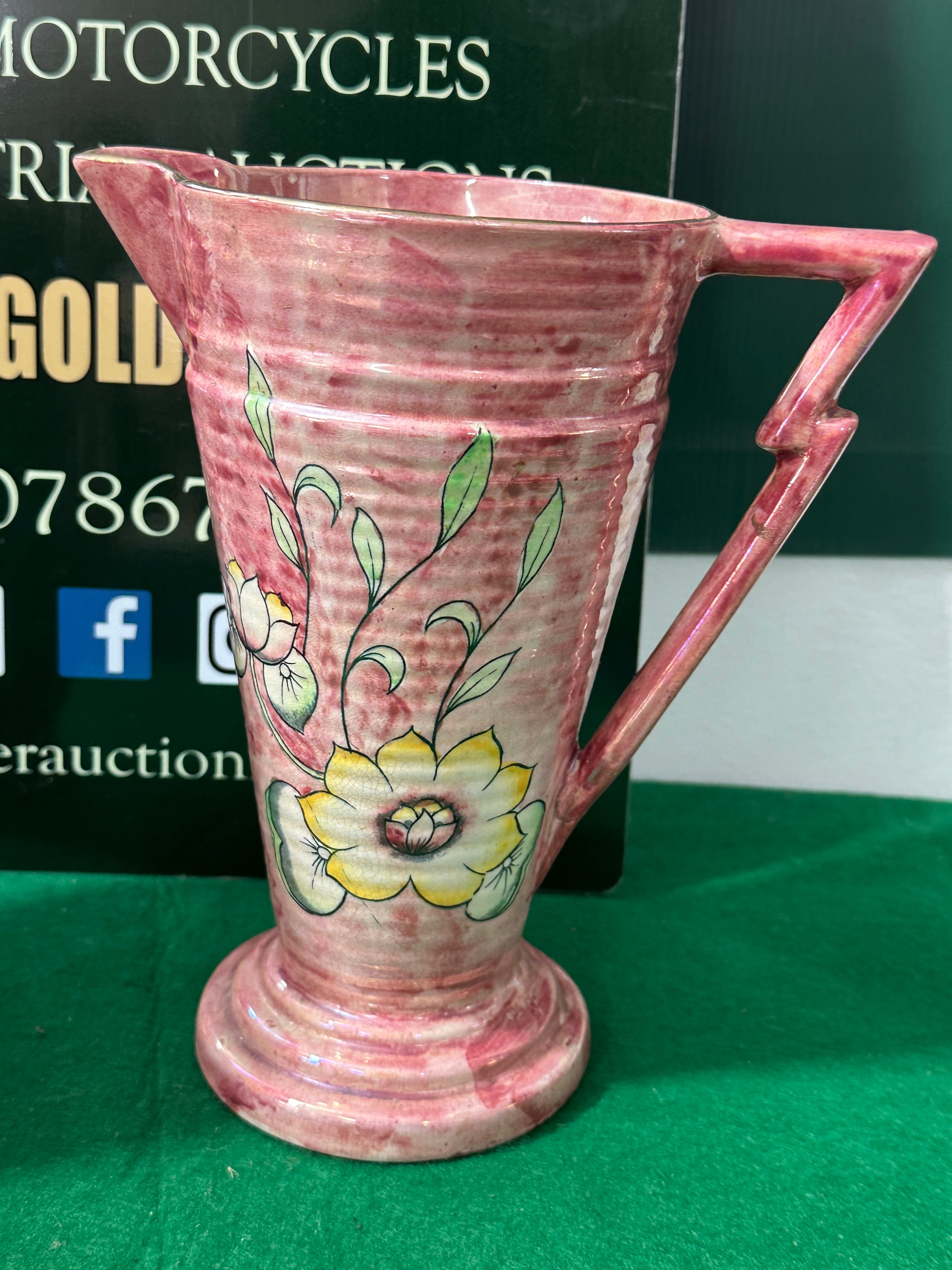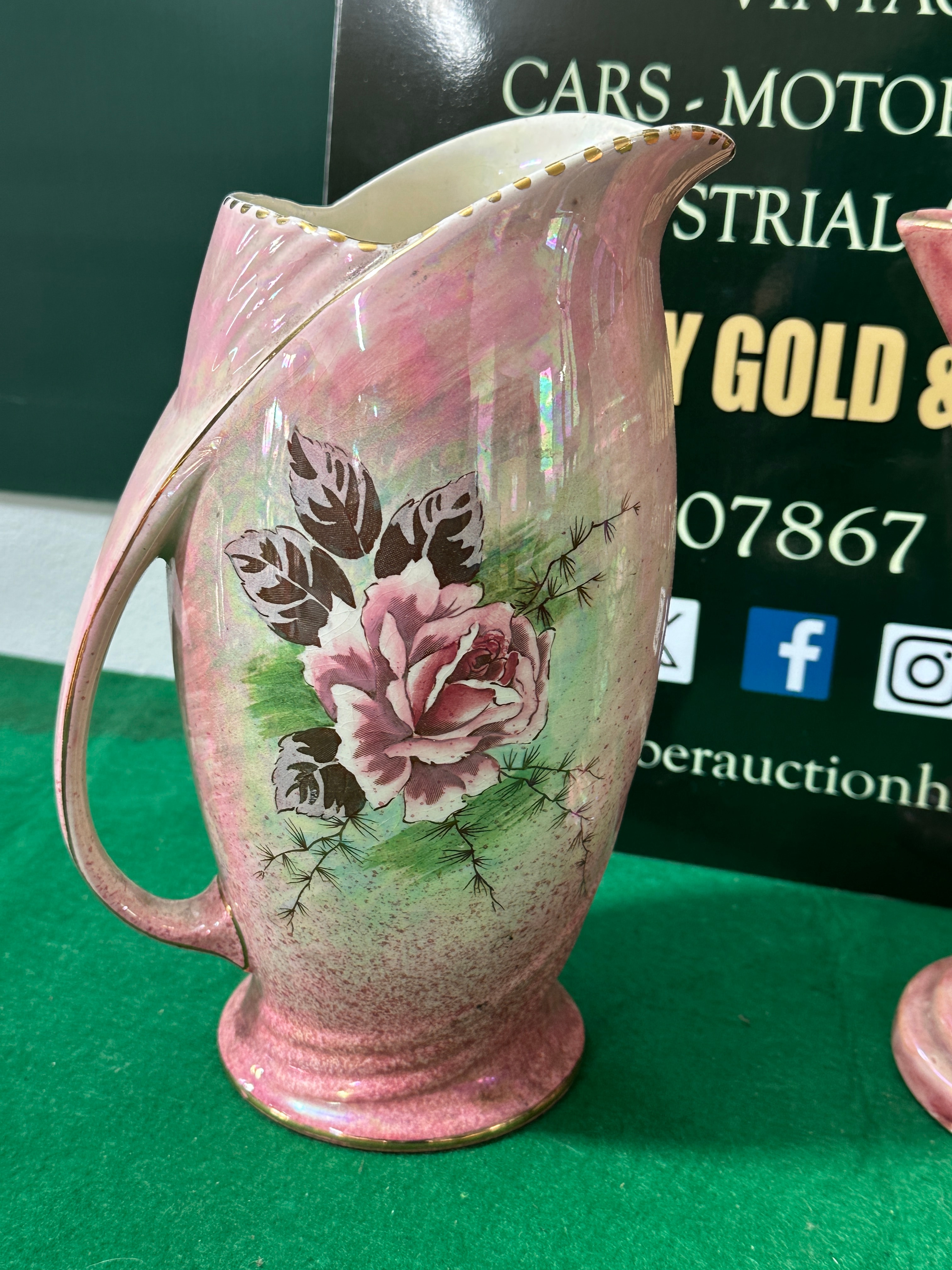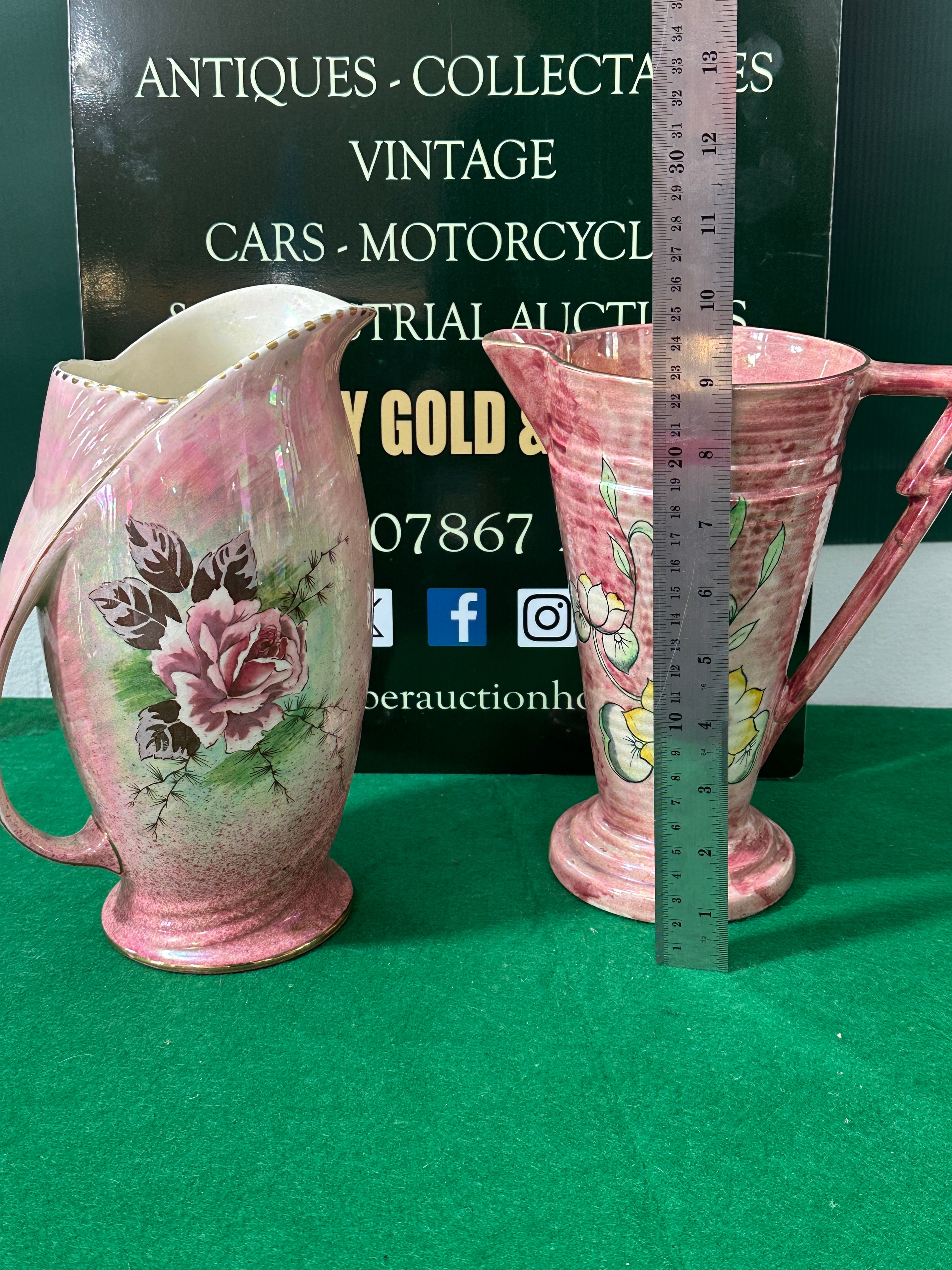 A pair of English ceramic pitchers. The first, by Royal Winton Grimwades, features an iridescent pink luster glaze, a scalloped, gilded rim, and a large central pink rose motif with green foliage. The second, a Kensington-Ware ‘Water Lily’ Art Deco pitcher, has a ribbed pink body, a distinctive angular zigzag handle, and a scattered yellow and green floral decoration.