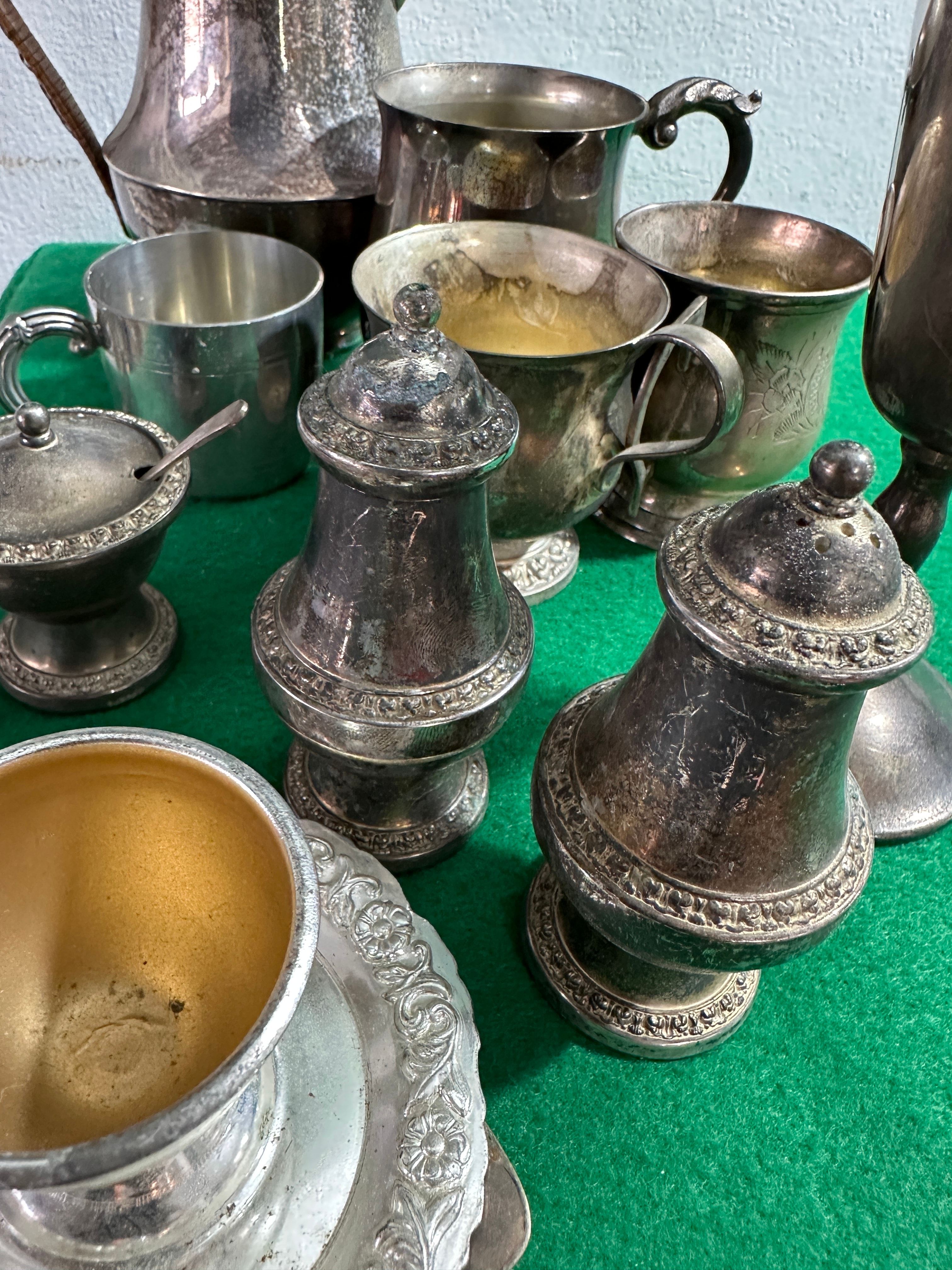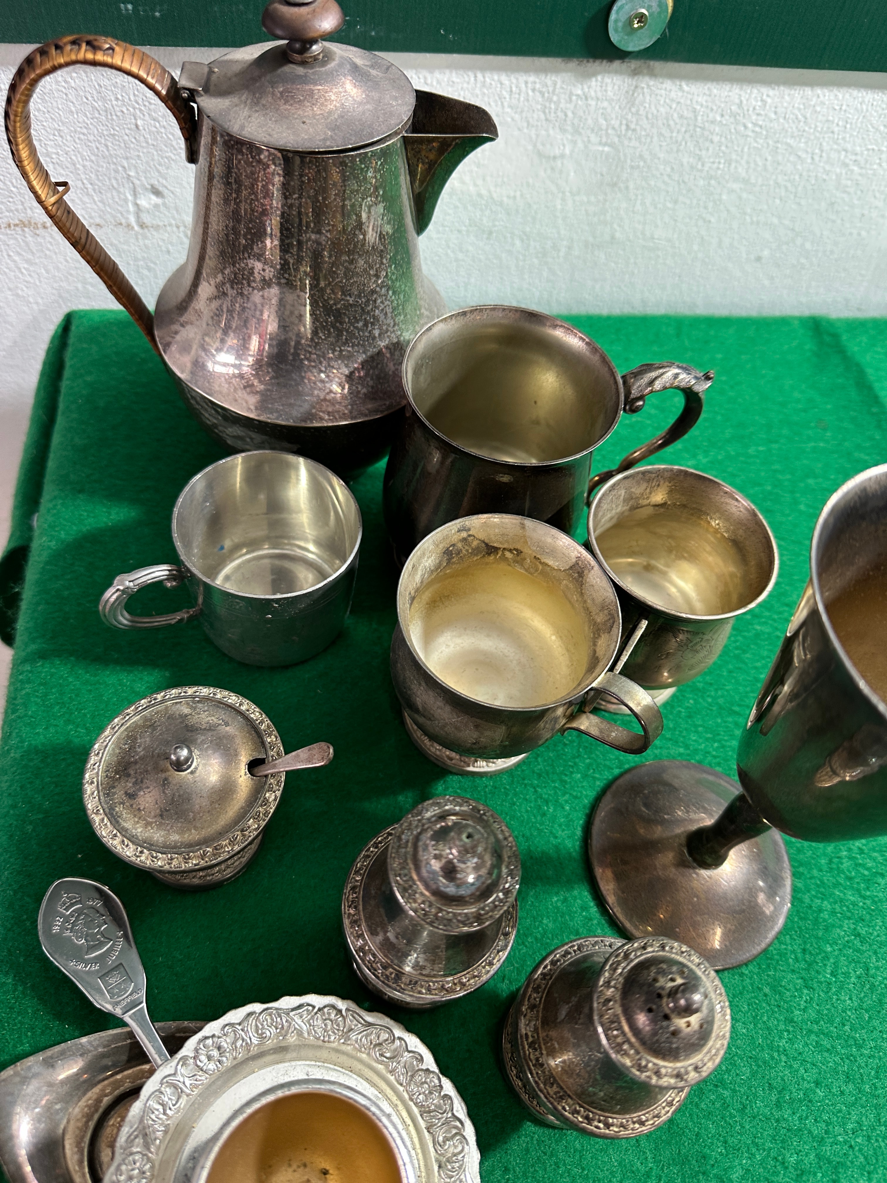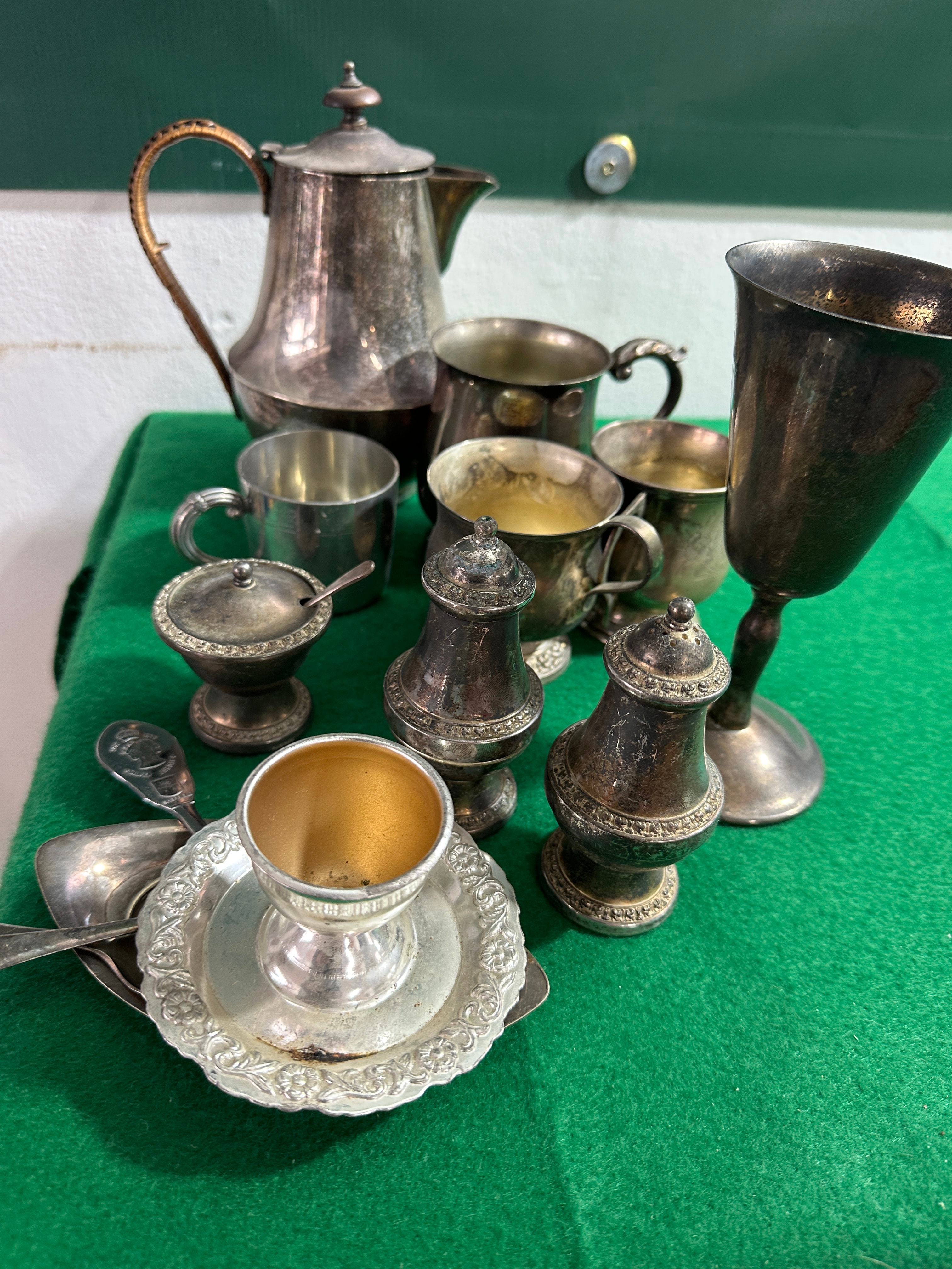 A collection of assorted silver plate tableware, comprising a large teapot or coffee pot with an insulated handle, four smaller handled cups, a lidded sugar bowl with a small spoon, a pair of decorative bell-shaped shakers, a stemmed goblet, an egg cup on a floral-edged saucer, and several additional spoons. The items exhibit a traditional aesthetic, characterized by classic forms and some decorative banding or scalloped edges. No discernible hallmarks or textual markings are immediately visible.