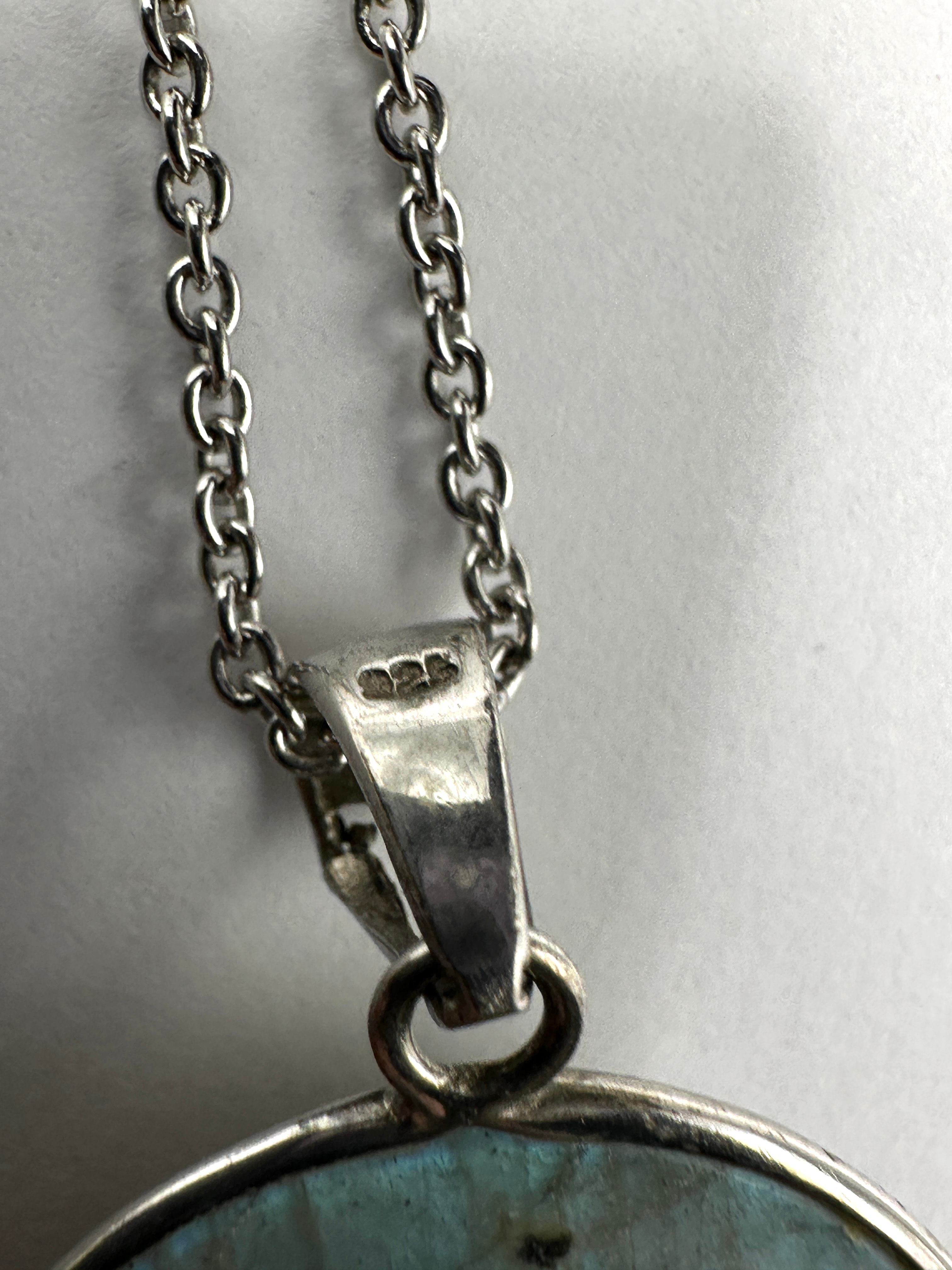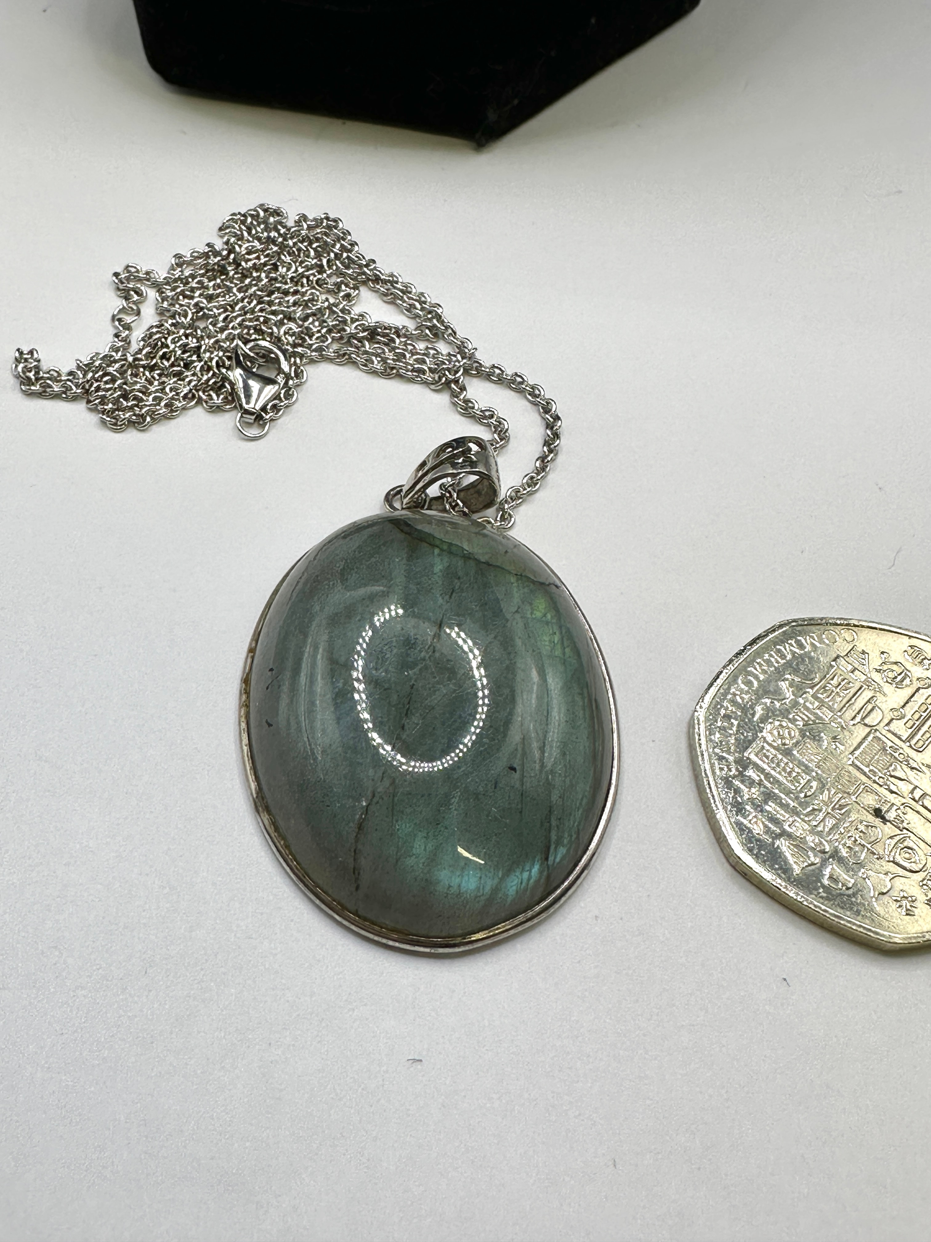 A contemporary necklace featuring a substantial oval cabochon pendant. The metal components, including the chain, the pendant’s bezel setting, and the bail, are marked “925,” indicating sterling silver. The prominent gemstone is a labradorite cabochon, exhibiting a distinct labradorescence with iridescent flashes of blue, green, and gray. The necklace is completed with a silver-tone metal chain and a lobster clasp. A British 50 pence coin is shown for scale.