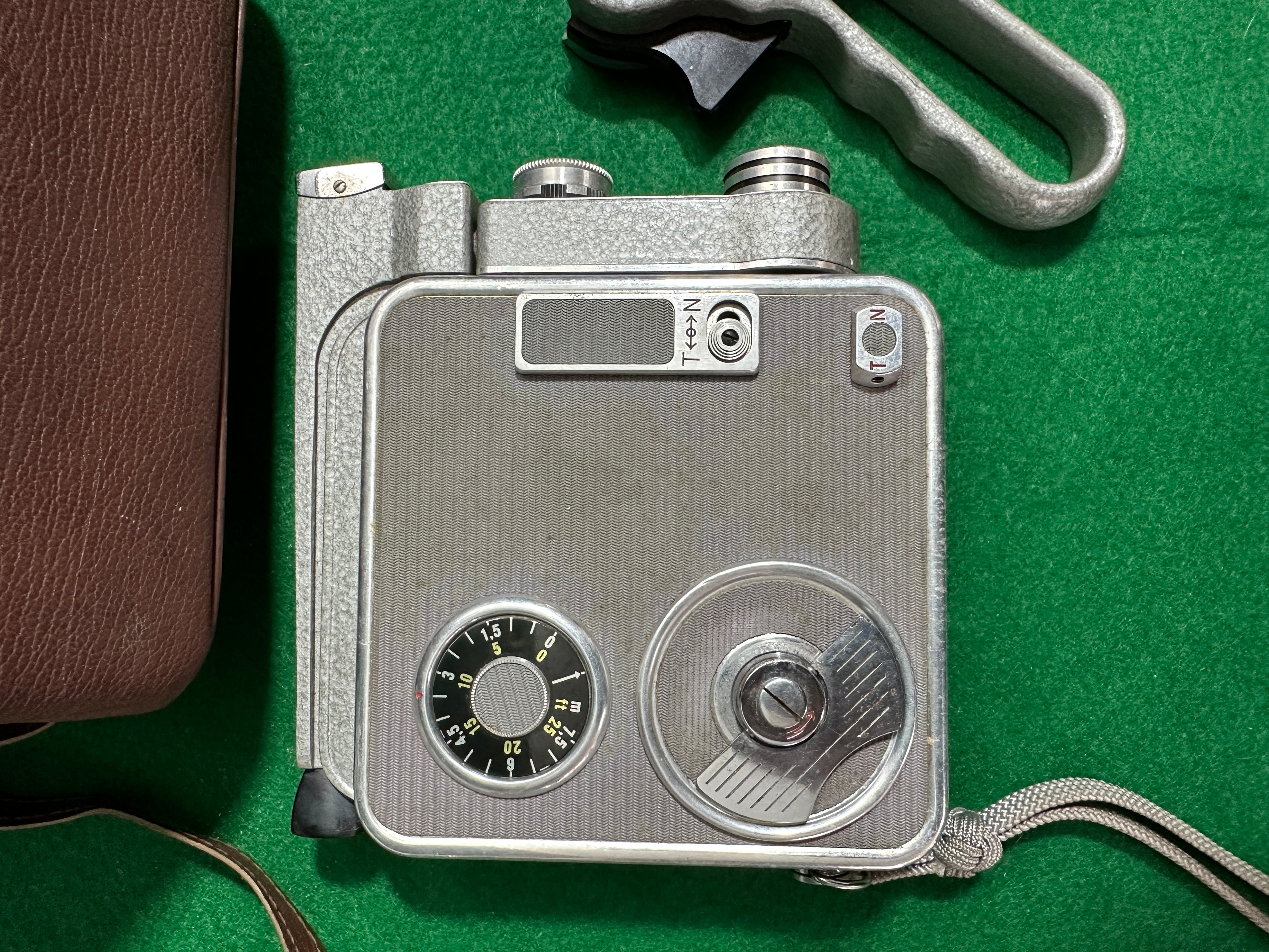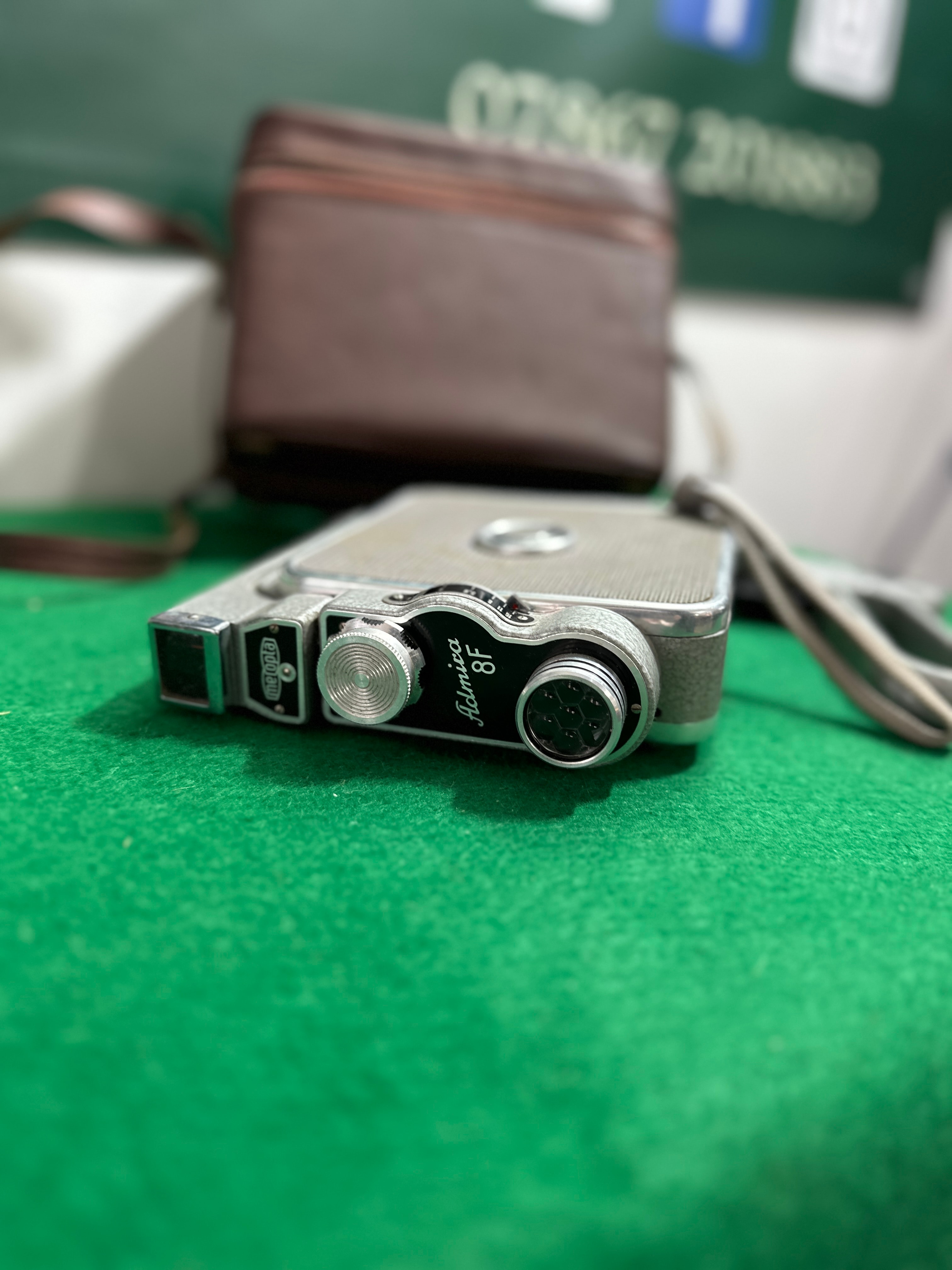 A Meopta Admira 8F 8mm motion picture camera, manufactured in Czechoslovakia, circa mid-20th century. The camera features a textured grey metal body with black and chrome-plated accents. Branded ‘Admirica 8F’ on its front, alongside a prominent ‘C & L’ logo, it includes a removable pistol grip and an attached fabric wrist strap. The viewfinder is marked ‘mapla’. Exposure is controlled via numerical dials (e.g., 1.5, 3, 5, 10, 20), and a sliding focus guide is present, marked in both feet (0.33 to 3.3 ft) and meters (0.33 to 3.3 m). Accompanied by its original brown textured faux leather or leather zippered carrying case, lined with red felt, which also contains an ‘Admirica 8F MOTION PICTURE CAMERA OPERATION’ manual.