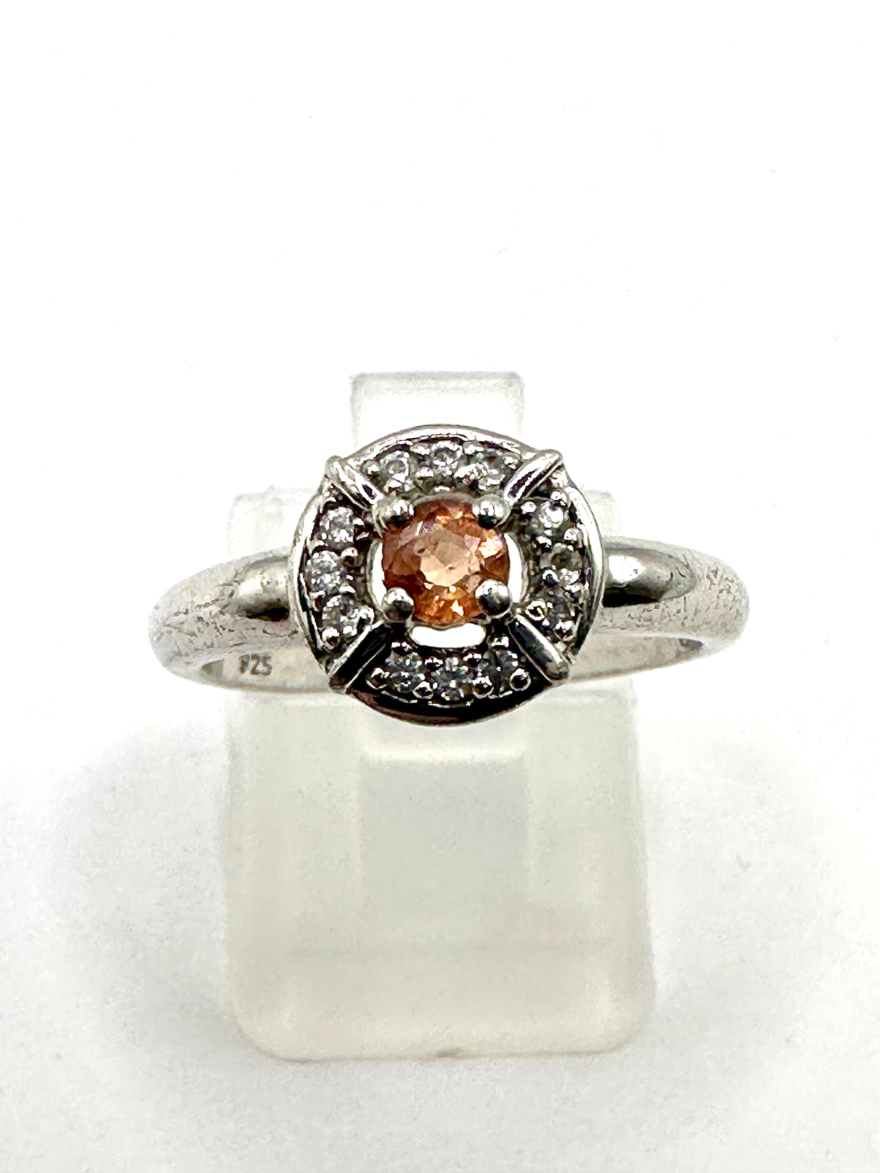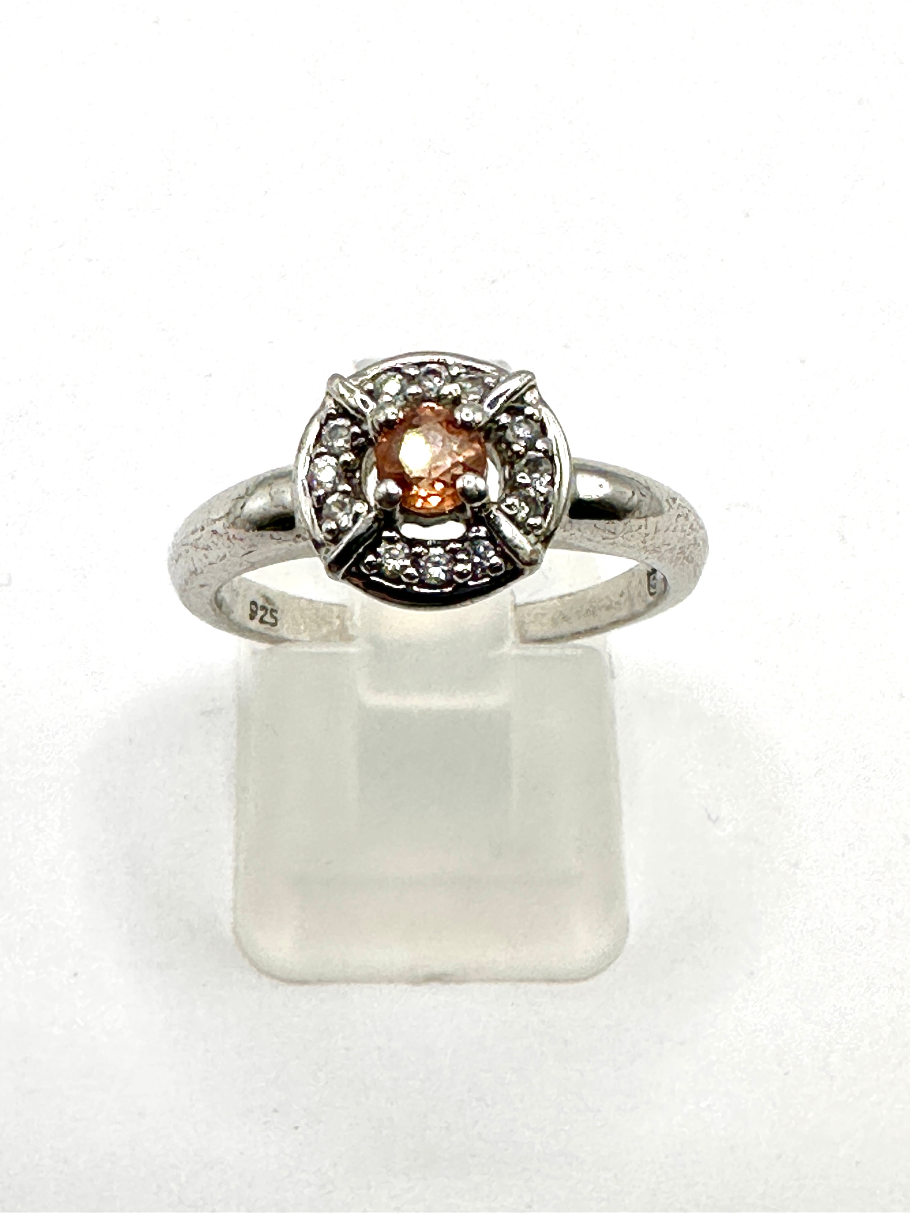 A sterling silver ring featuring a central round, peachy-orange gemstone secured by four prongs. The central stone is encircled by a circular halo of numerous smaller, clear accent stones. The halo design incorporates four distinct structural elements. The band is marked “925” on its interior, indicating sterling silver.