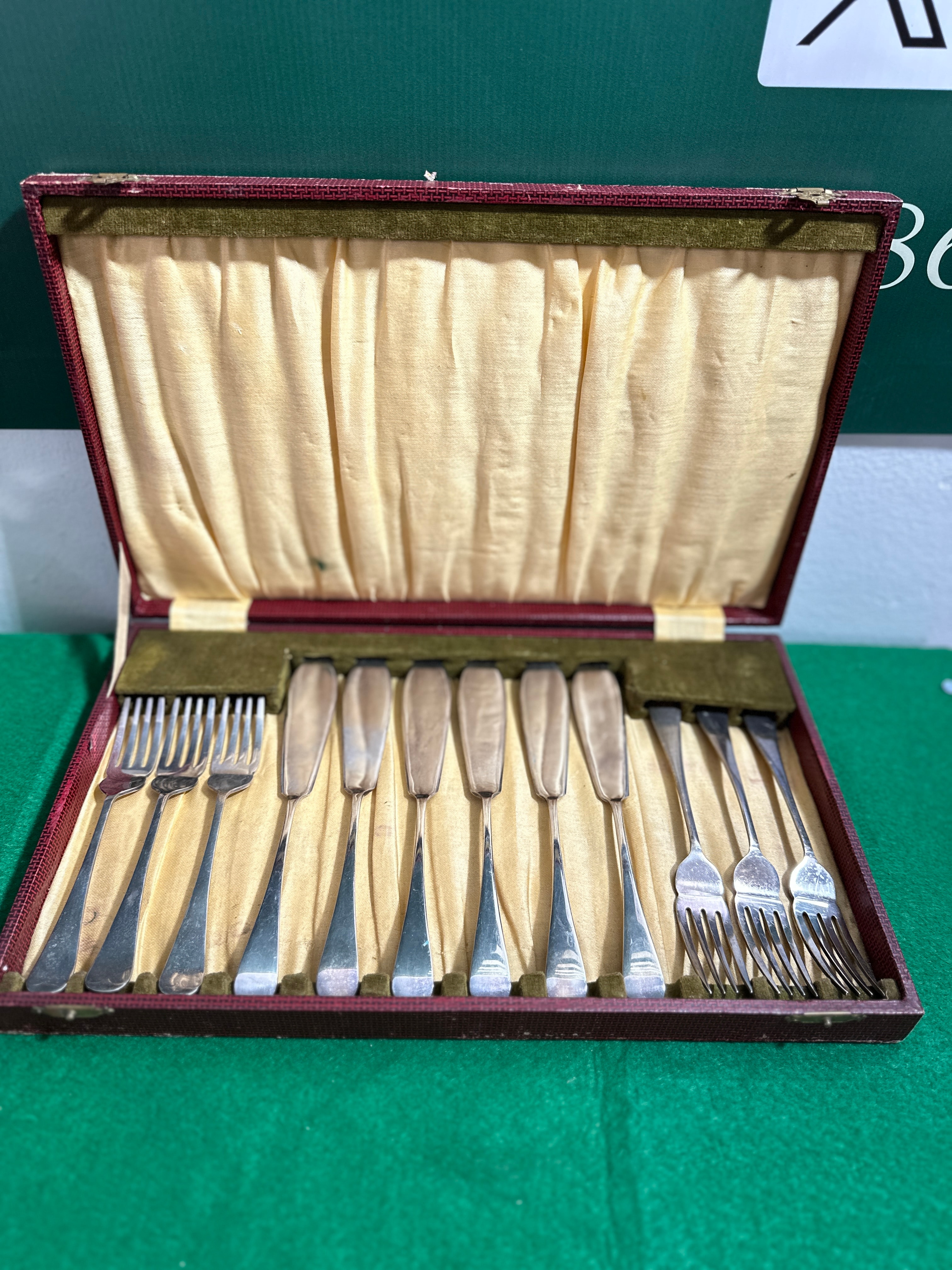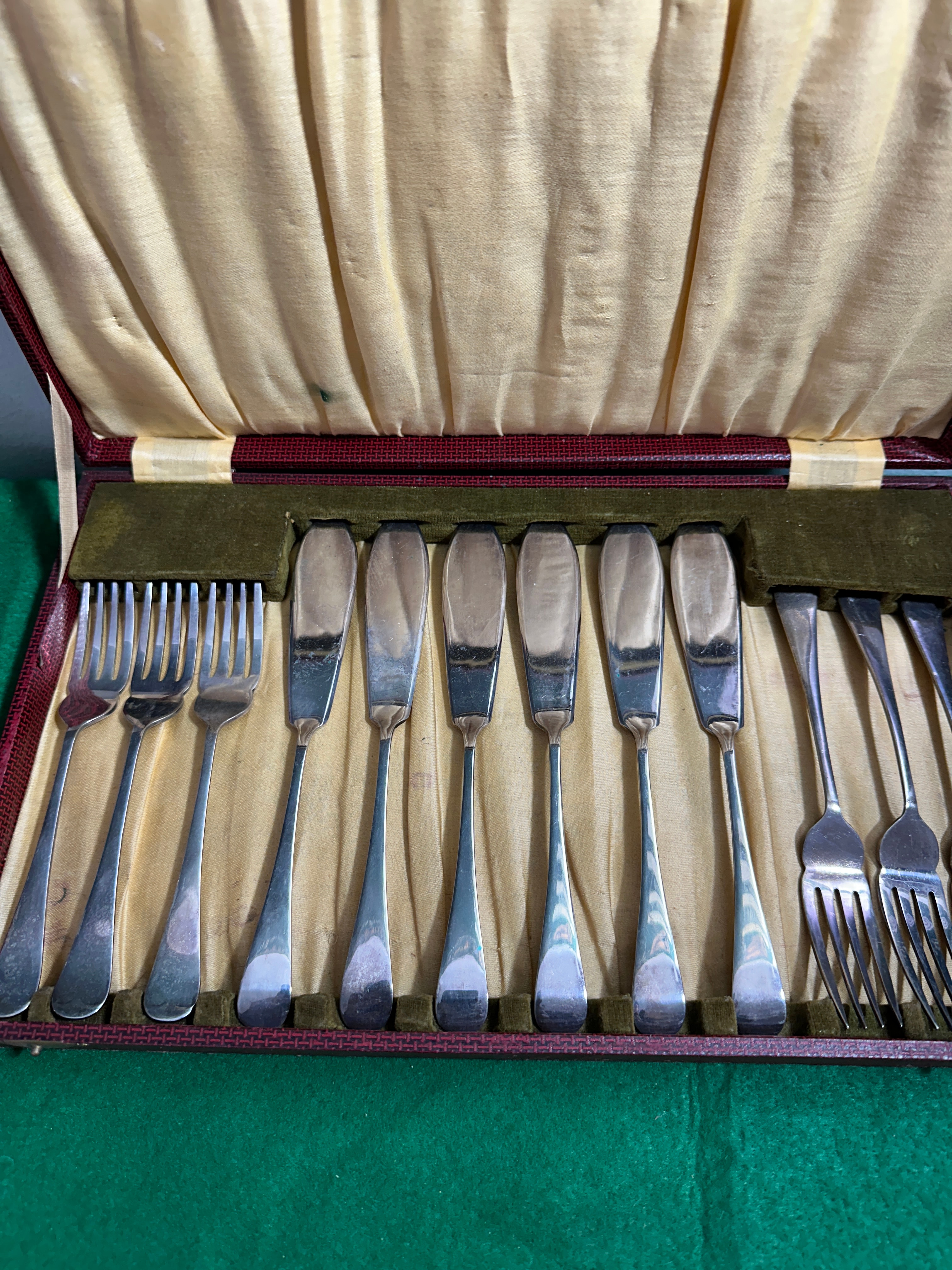 A cased set of twelve English silverplate fish knives and forks, comprising six knives with broad blades and six four-tined forks. The flatware is made of a silver-toned metal, featuring plain, tapering handles with a simple, classic style. It is presented in a rectangular case with a worn, textured dark red fabric exterior, secured by two brass-toned clasps. The interior lid is lined with a discolored, ruched pale fabric, while the base features olive green velvet-like fittings. No specific text or maker’s marks are visible on the flatware.