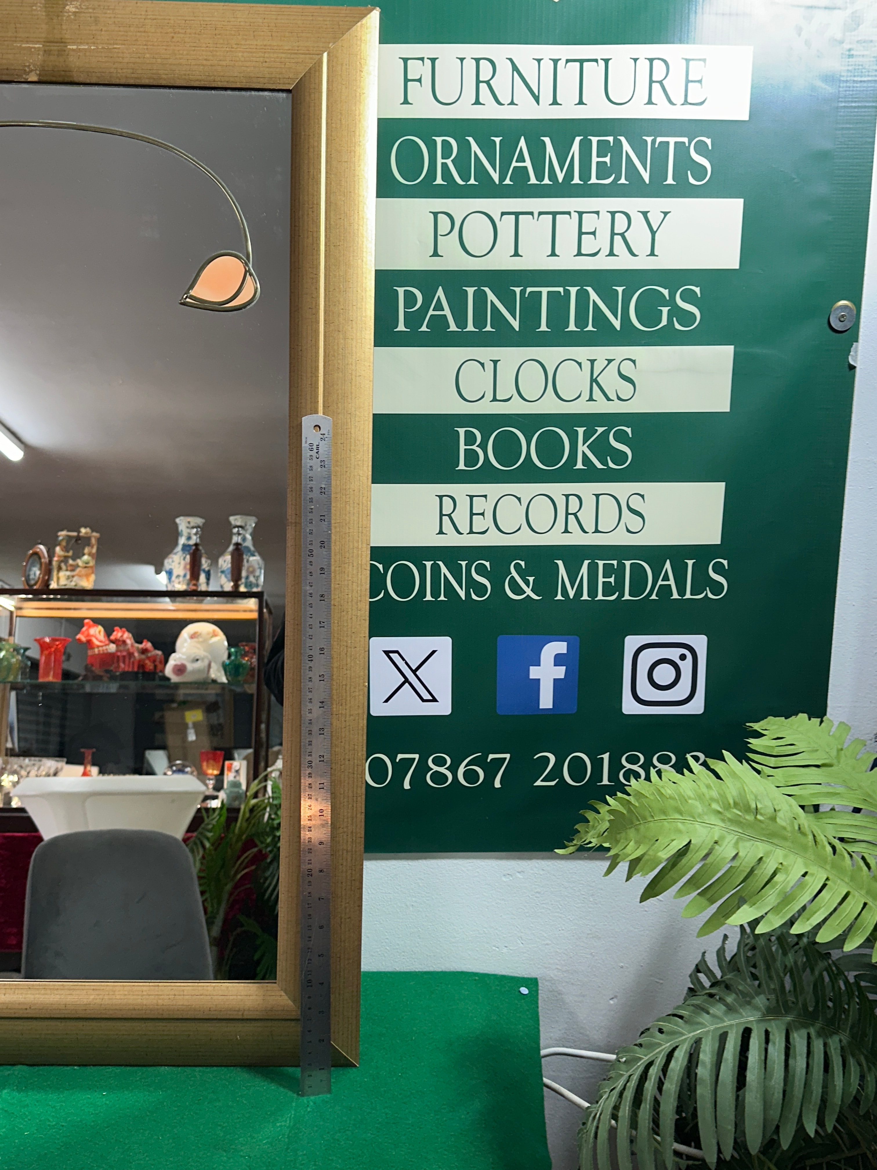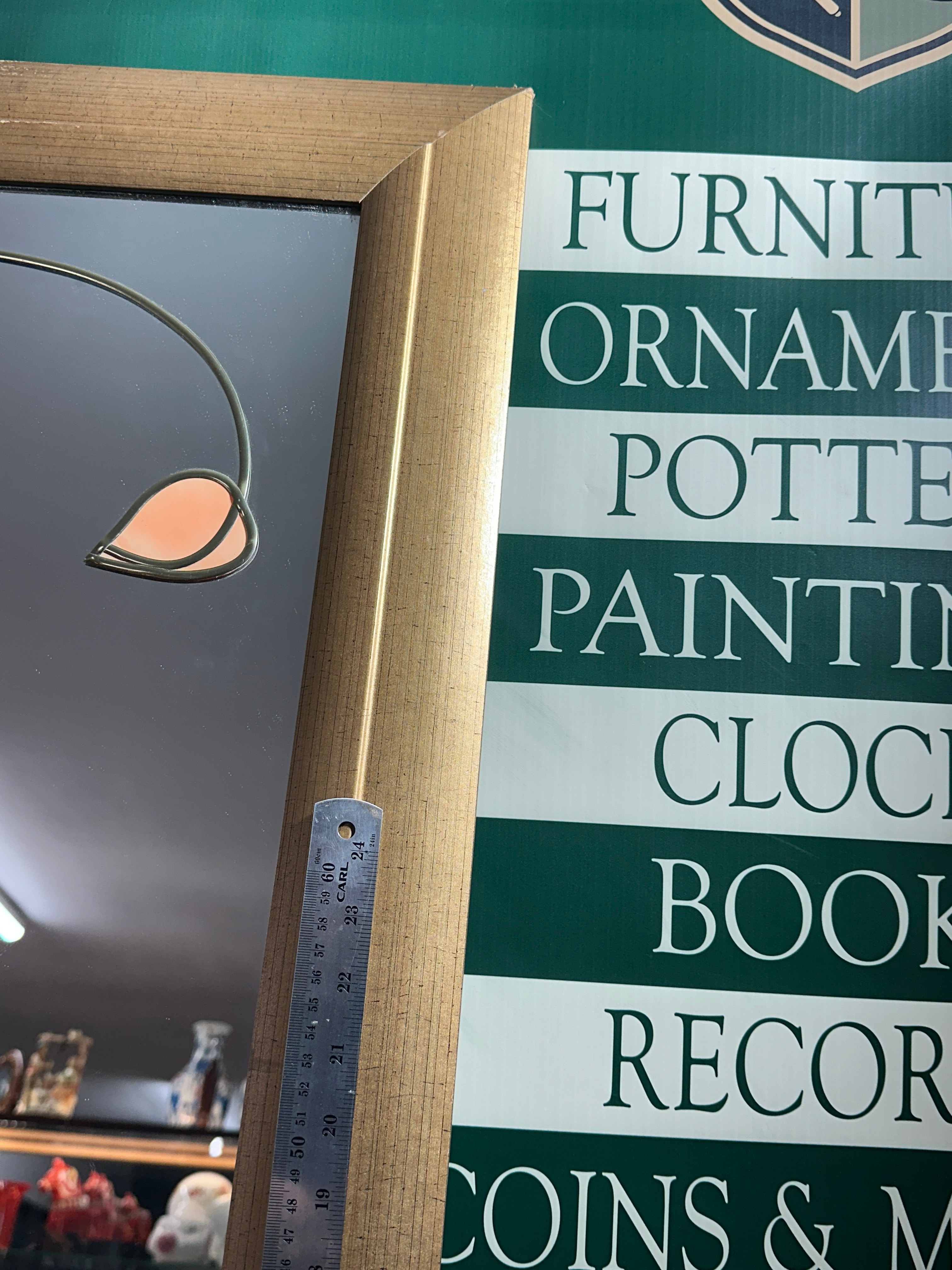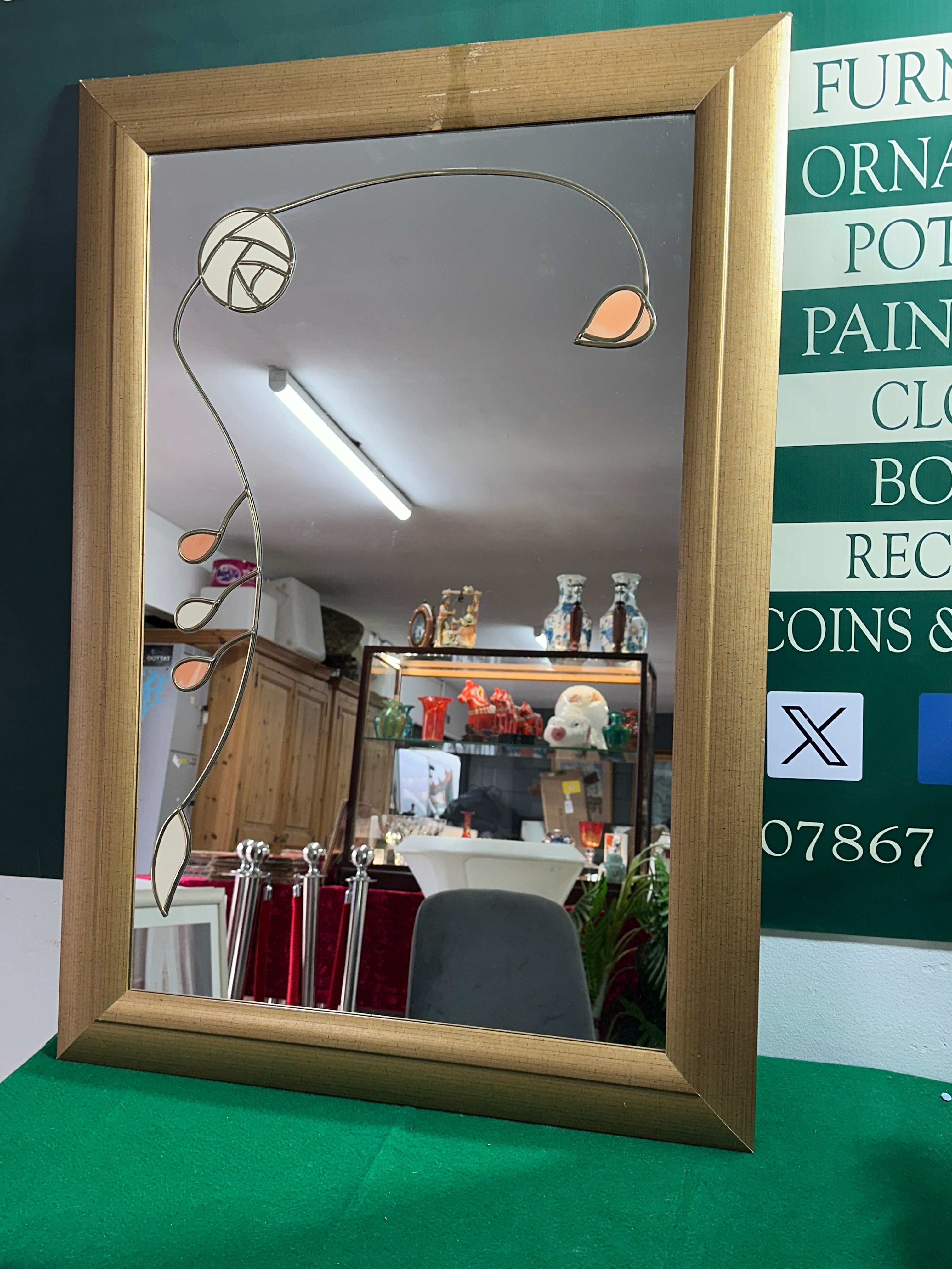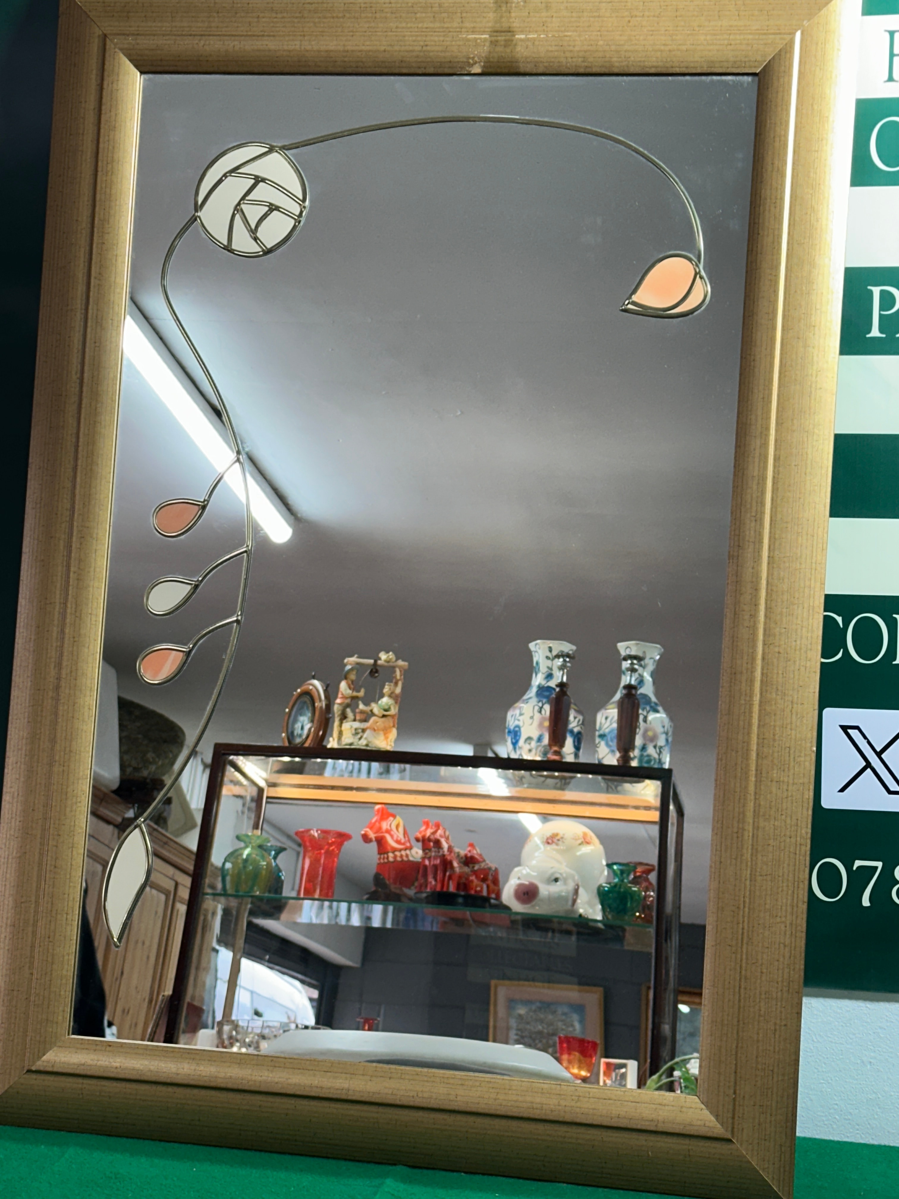 A rectangular wall mirror featuring a light-toned wooden or composite frame with a textured, possibly brushed finish. The mirror glass is adorned with a metallic wire overlay depicting a stylized botanical motif, incorporating opaque white and peach-toned glass or plastic inserts forming leaves and a flower. The style suggests a modern, post-mid-20th century decorative aesthetic. No apparent manufacturer’s marks or textual identifiers are visible.