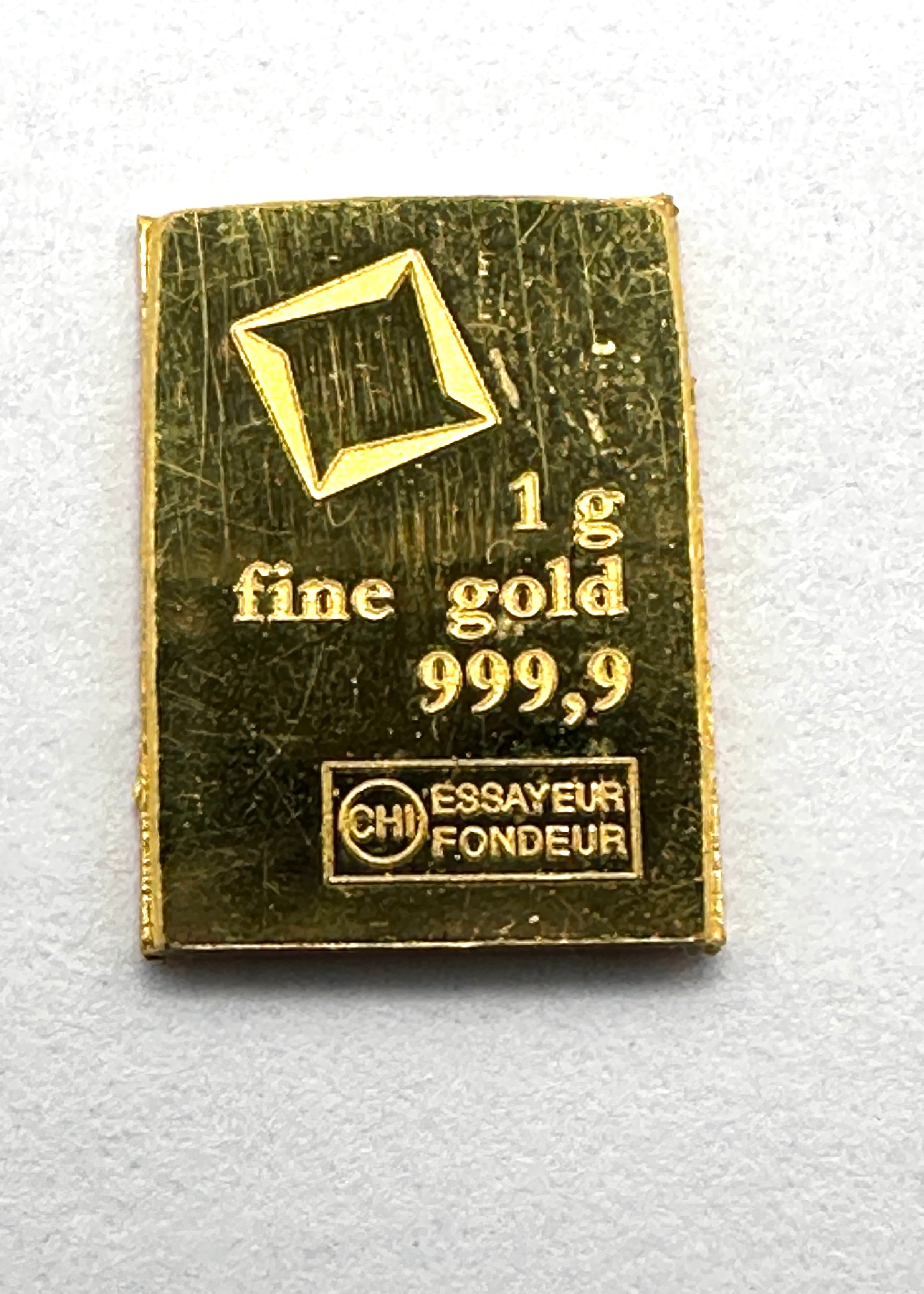A small, rectangular gold bar, marked ‘1 g’ and inscribed ‘fine gold 999,9’, denoting a purity of 99.99%. The bar features a stylized diamond or lozenge logo, a circular ‘CHI’ mark, and the French text ‘ESSAYEUR FONDEUR’, which translates to ‘ASSAYER FOUNDER’.