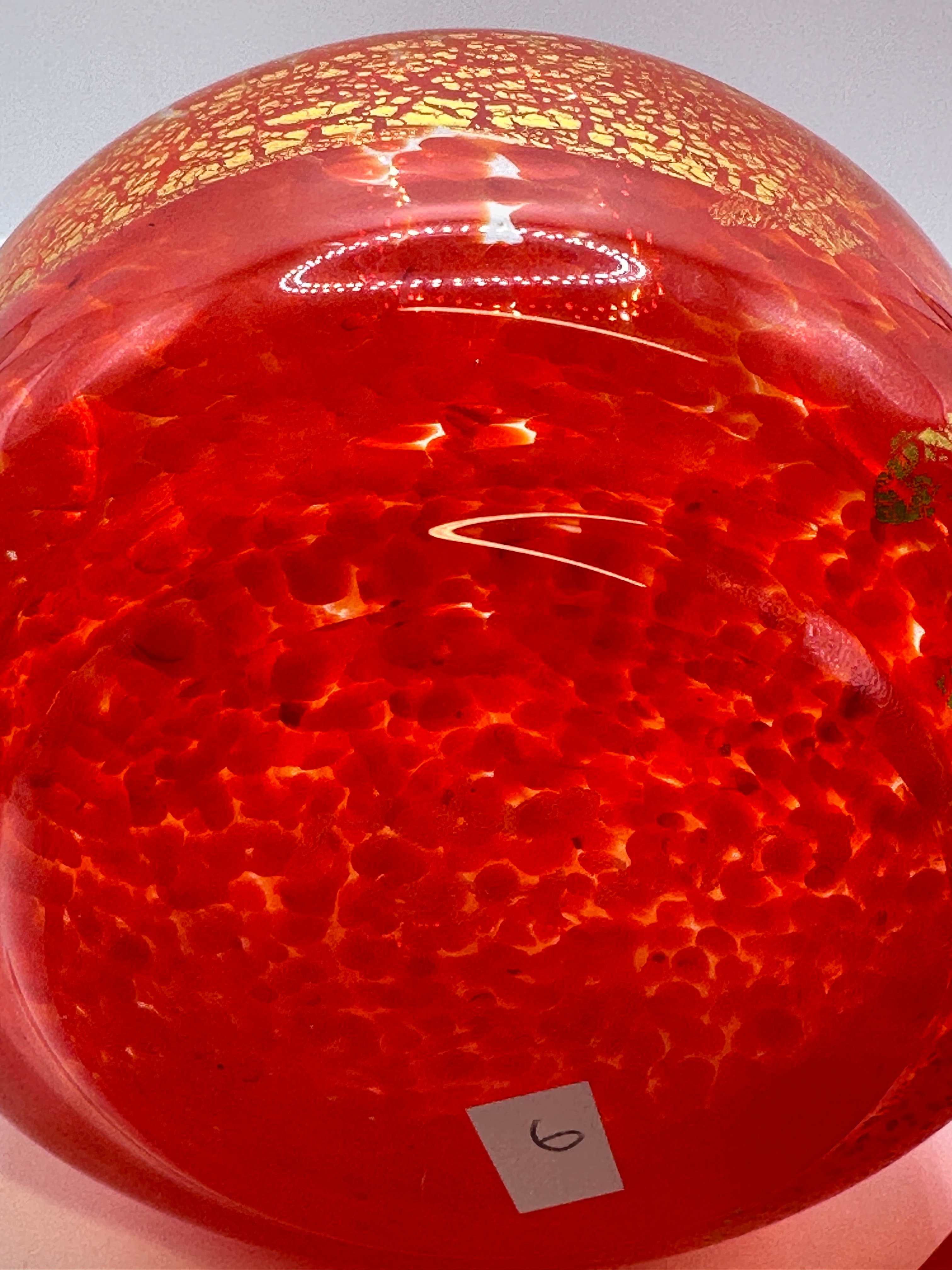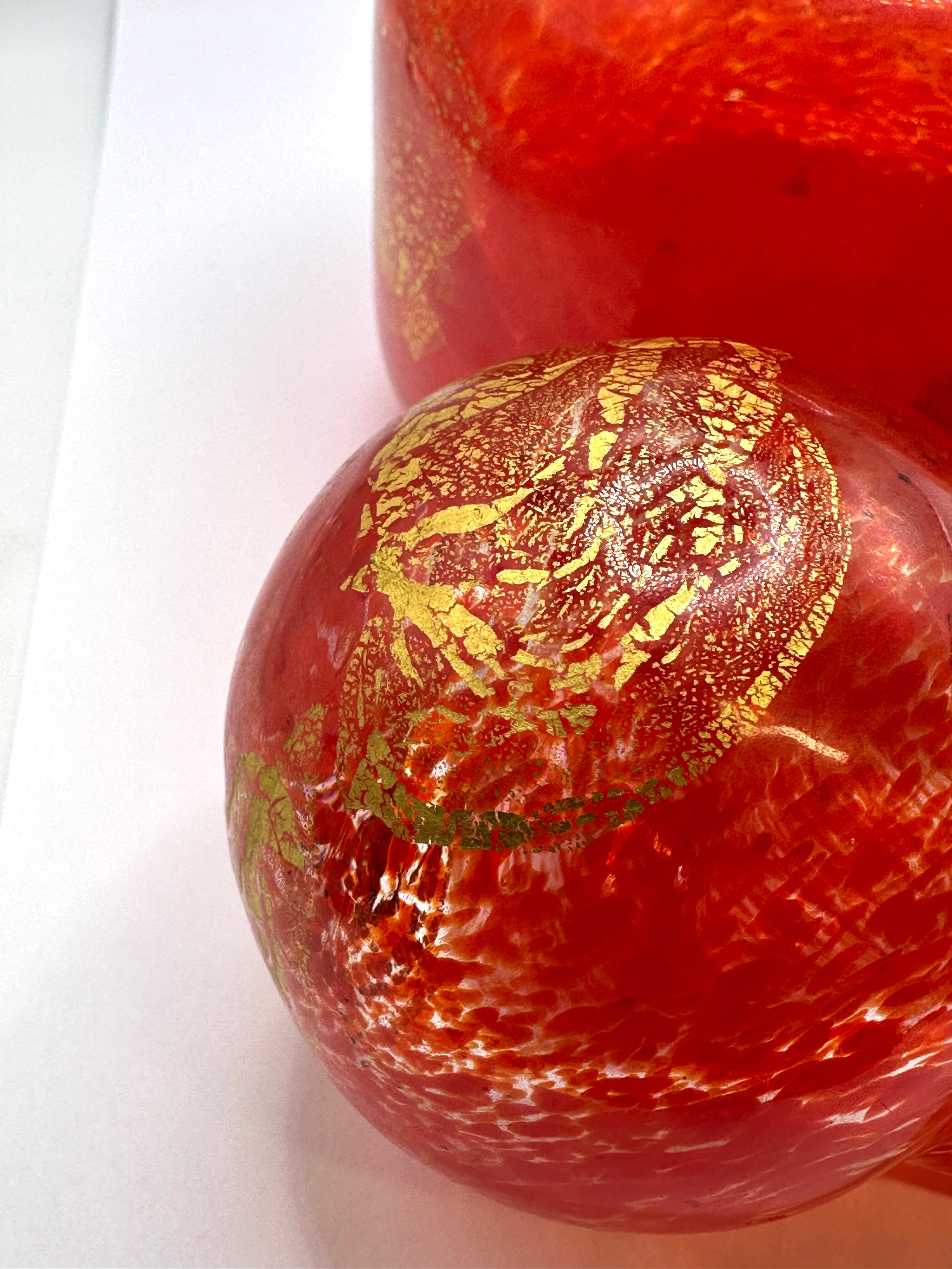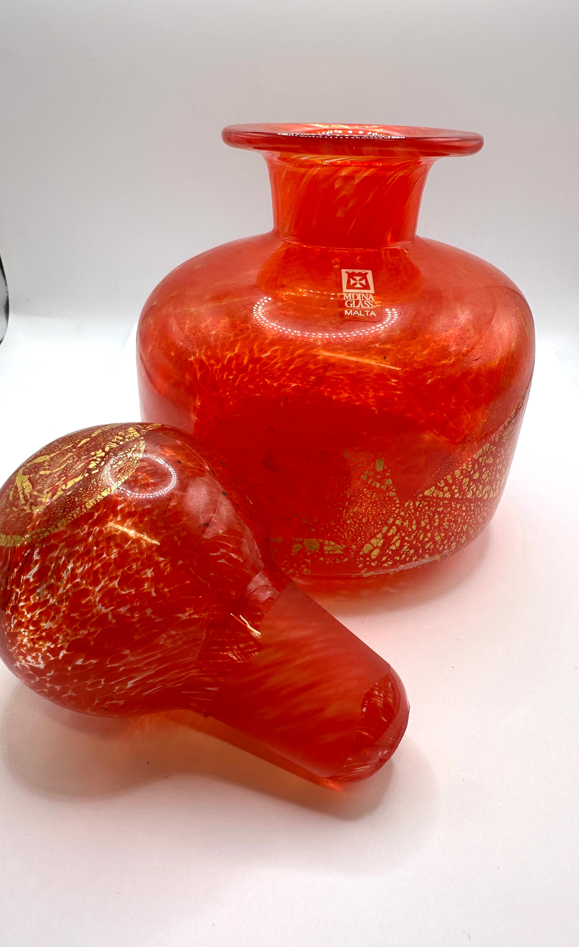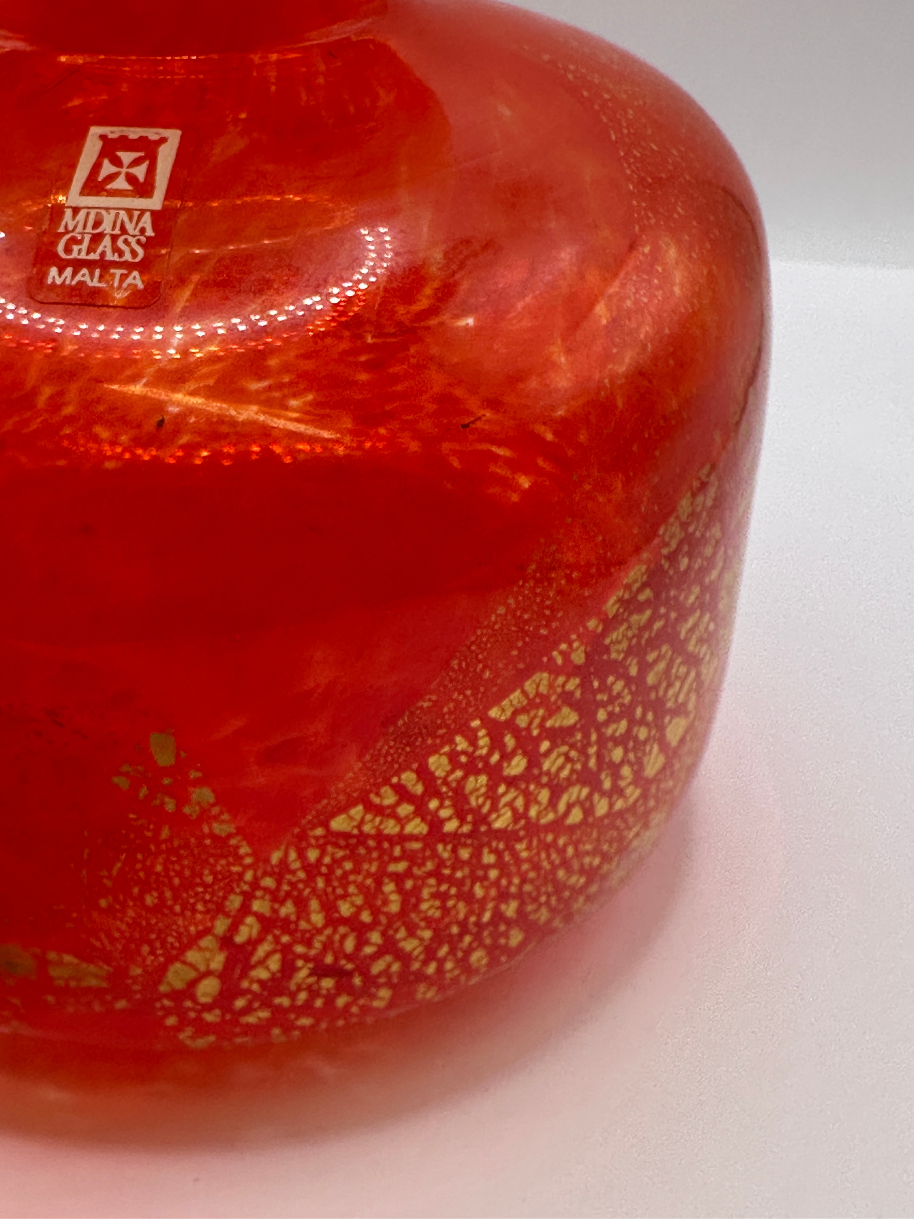 A Mdina Glass art glass vase, dating to the 1970s. This two-piece decorative item features a flattened spherical body and a separate bulbous stopper, crafted from vibrant translucent red glass with extensive internal gold fleck inclusions, creating a textured, fiery effect. A visible white label on the bottle’s shoulder displays ‘MDINA GLASS MALTA’ alongside a stylized cross logo, confirming its origin.