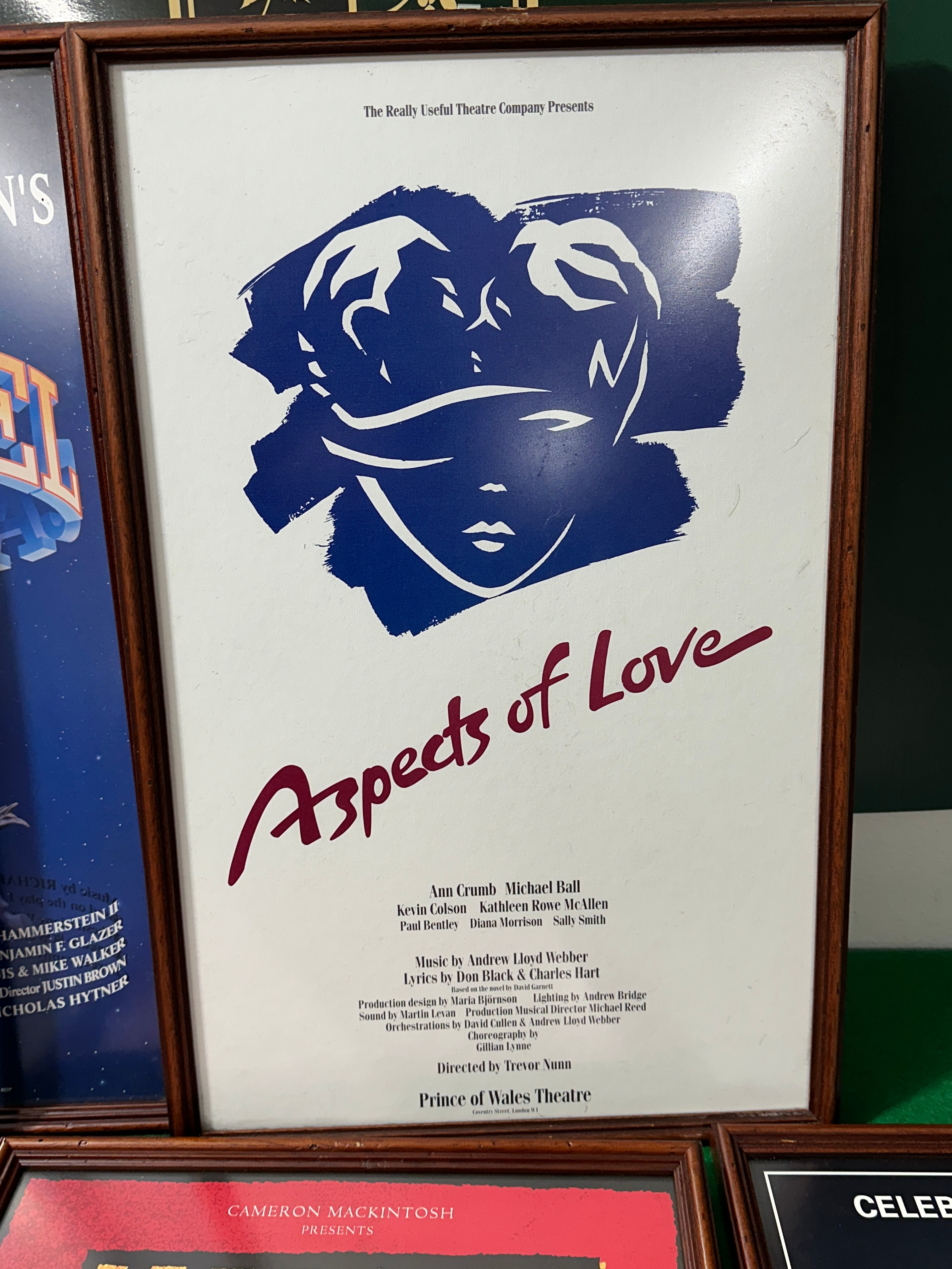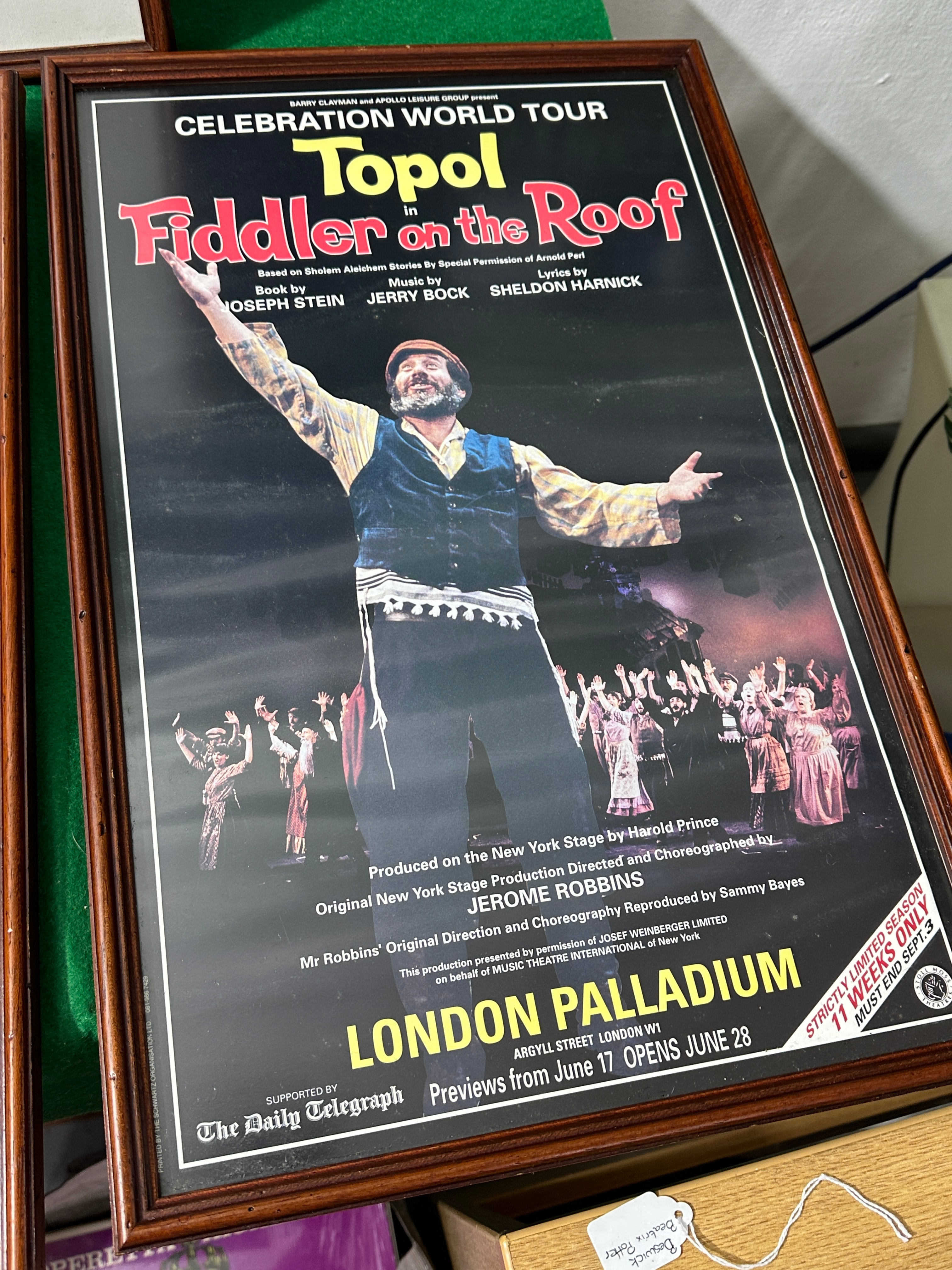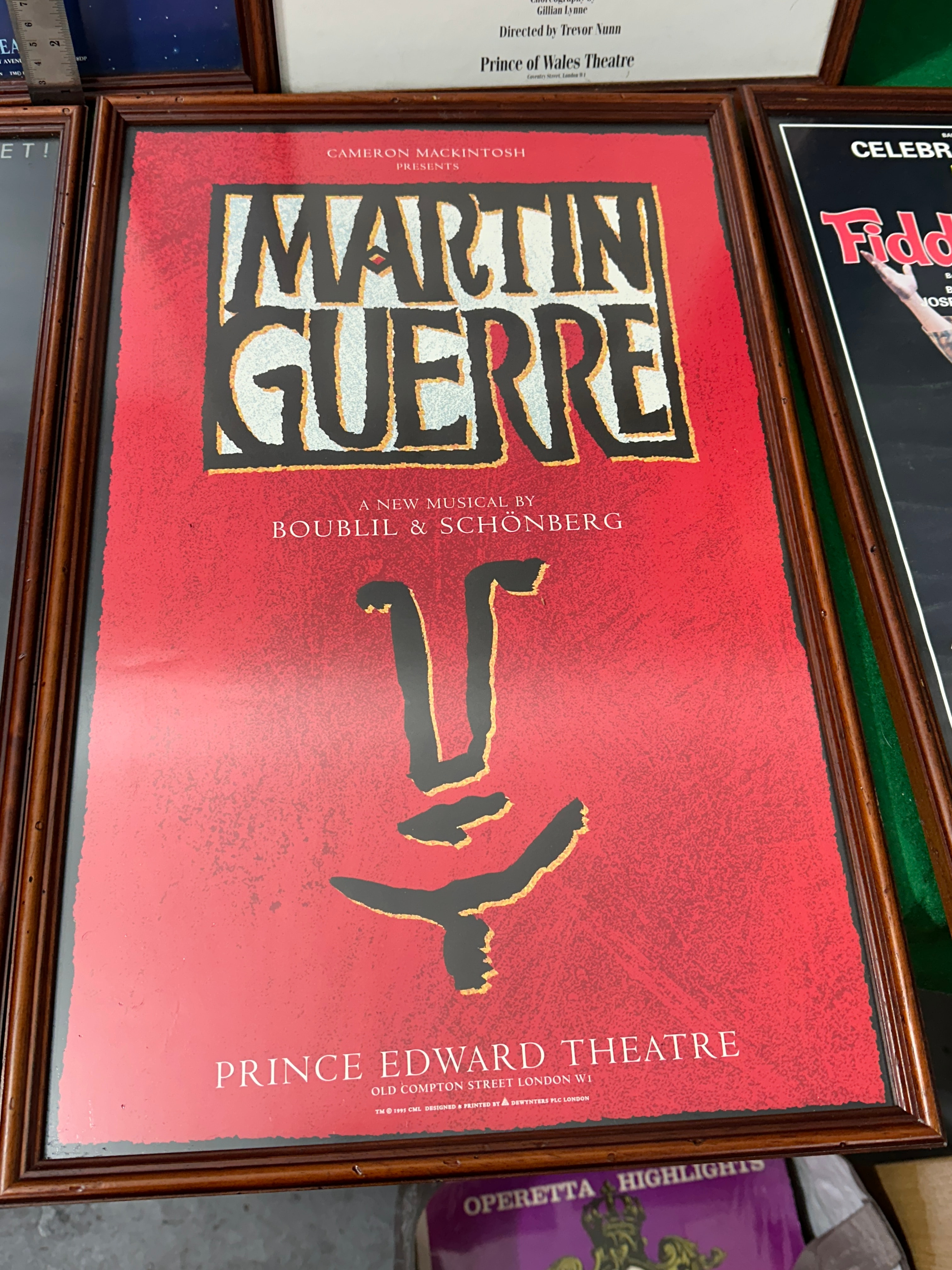 A collection of five framed theatrical posters, each advertising a prominent London West End musical production from the late 20th to early 21st century. The posters include “CAROUSEL” (Cameron Mackintosh, Shaftesbury Theatre), “Aspects of Love” (The Really Useful Theatre Company, Prince of Wales Theatre, featuring Michael Ball and associated with Andrew Lloyd Webber), “JOLSON The Musical” (starring Brian Conley, Victoria Palace Theatre), “MARTIN GUERRE” (Cameron Mackintosh, Prince Edward Theatre), and “Fiddler on the Roof” (starring Topol, London Palladium). Each poster is printed on paper and preserved under glass, housed in matching dark wood-effect frames. All visible text is in English.