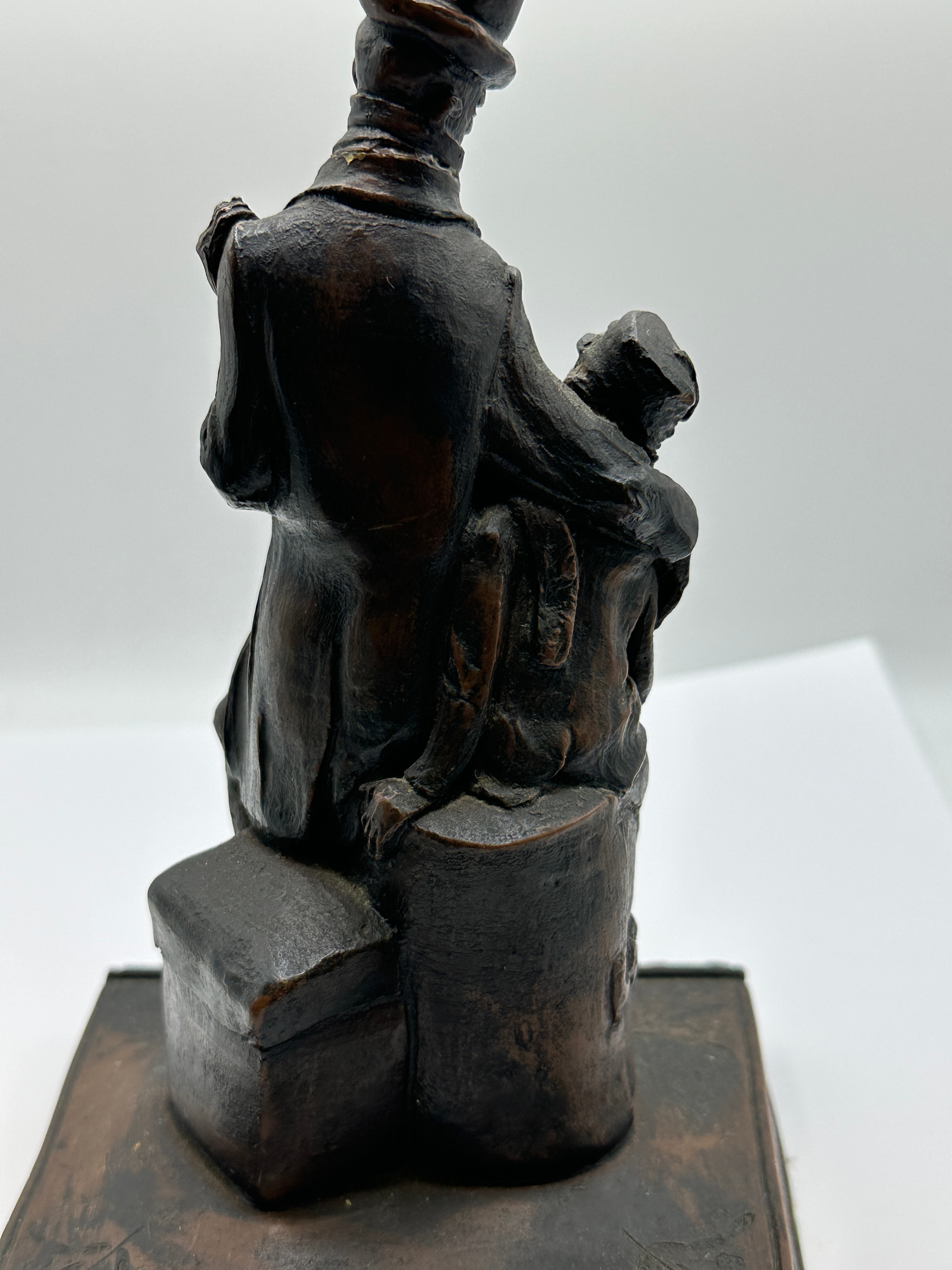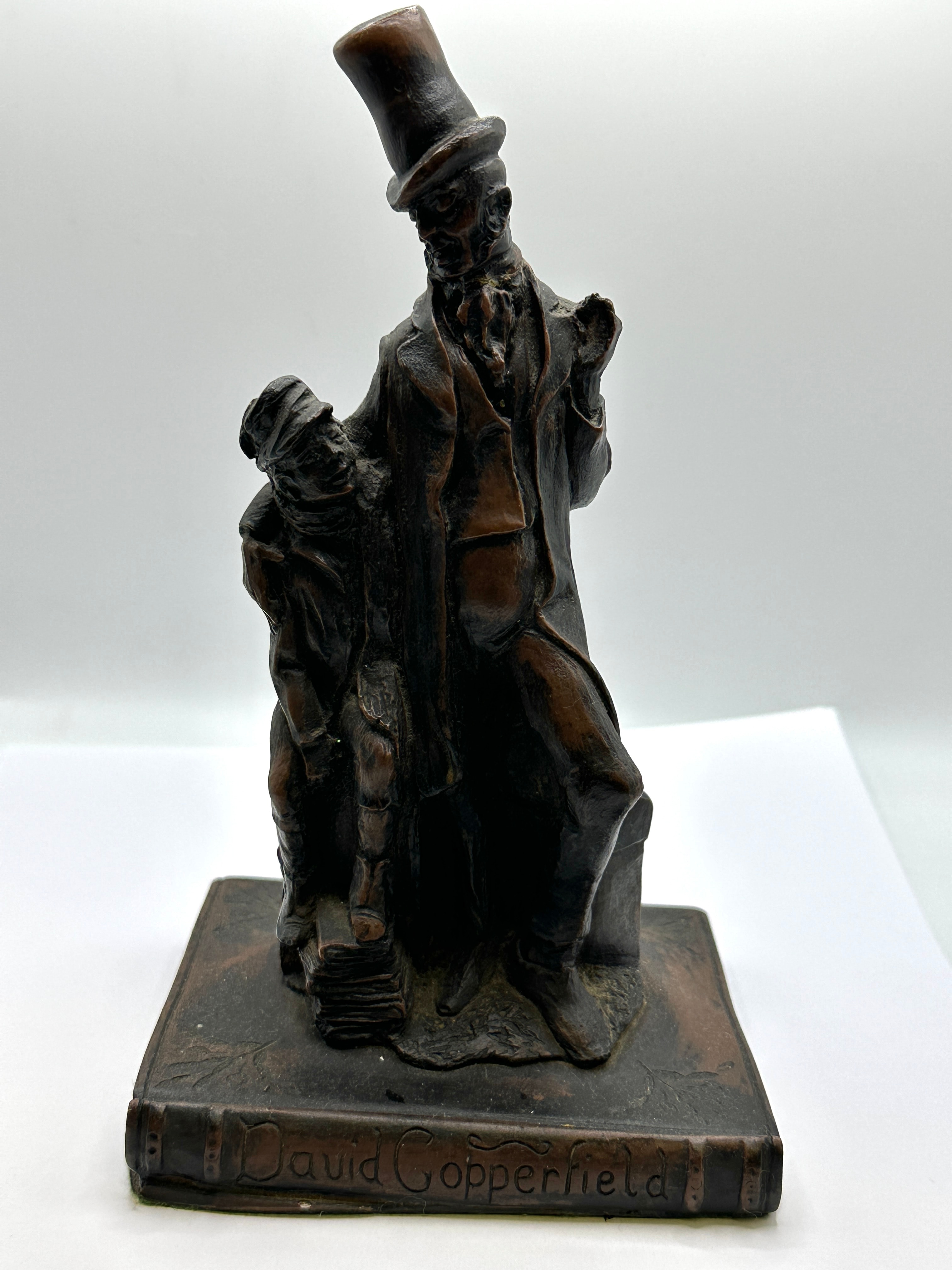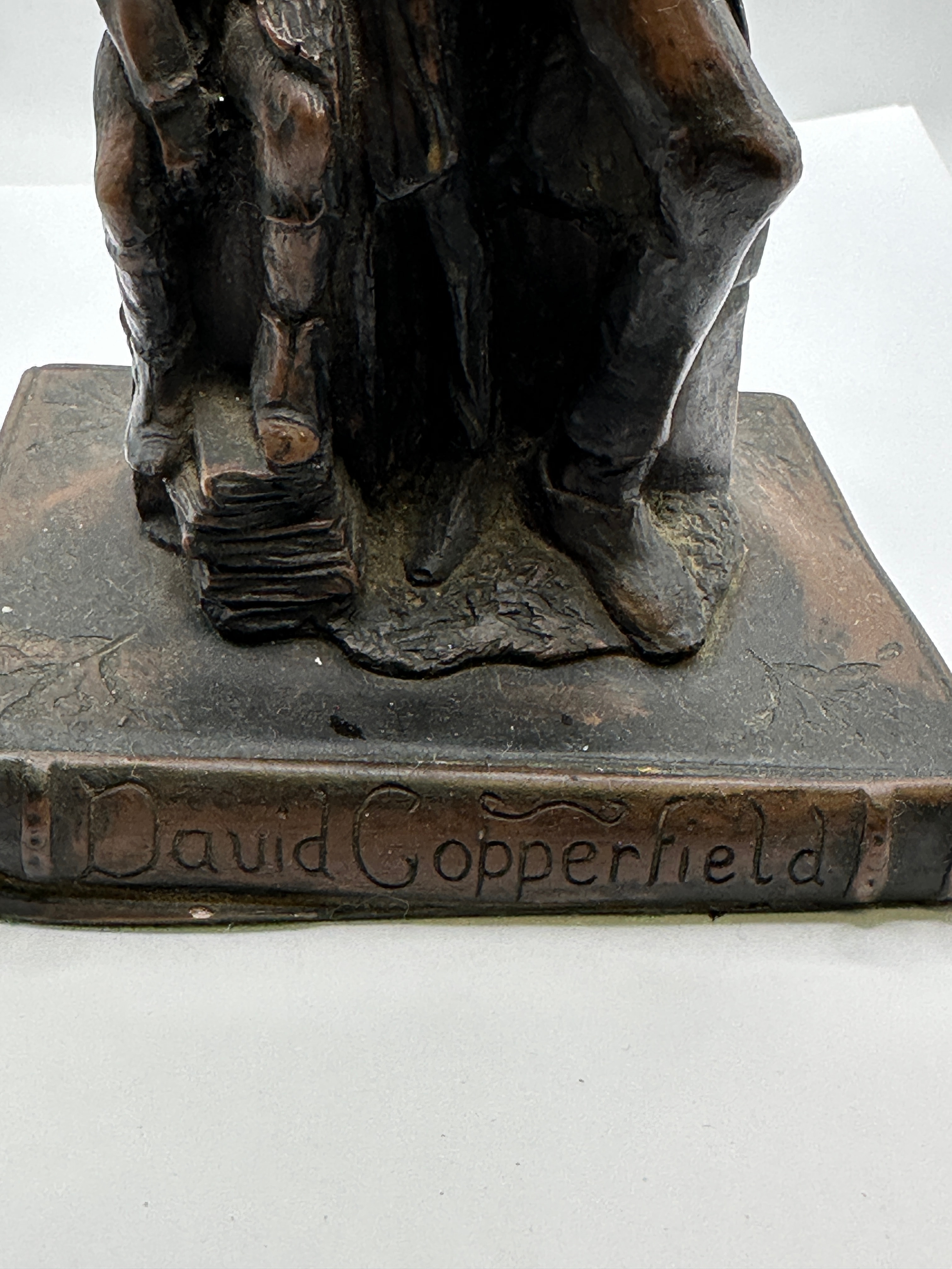 A figurative statuette depicting two male figures, an older gentleman in a top hat and long coat, alongside a smaller, younger figure, possibly a boy, with a stack of books at his feet. The base is designed to resemble a book spine, bearing the clearly legible inscription “David Copperfield” in relief. The piece is likely cast metal such as spelter, or a resin composite with a bronzed finish, evoking late 19th to early 20th-century Victorian literary themes.