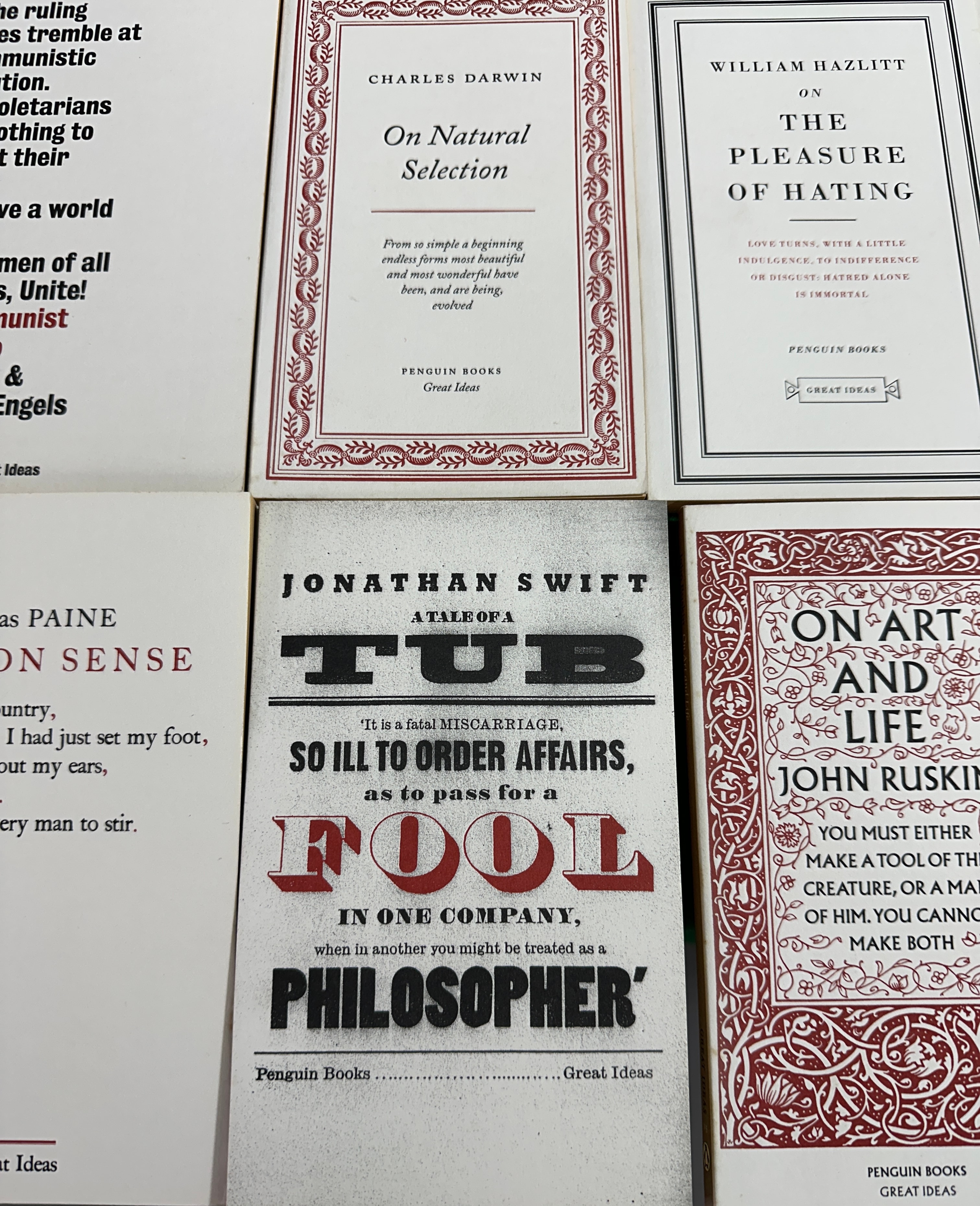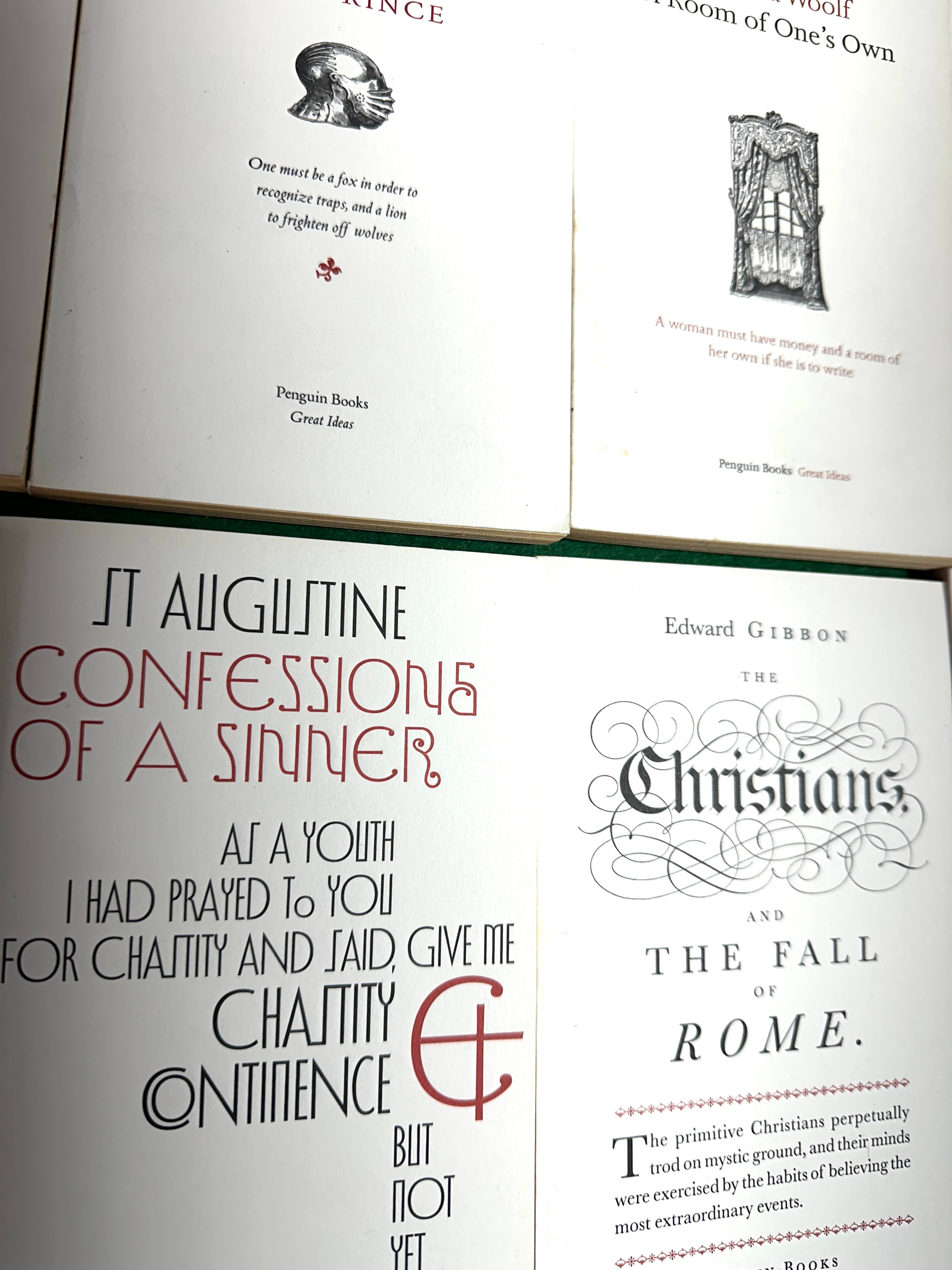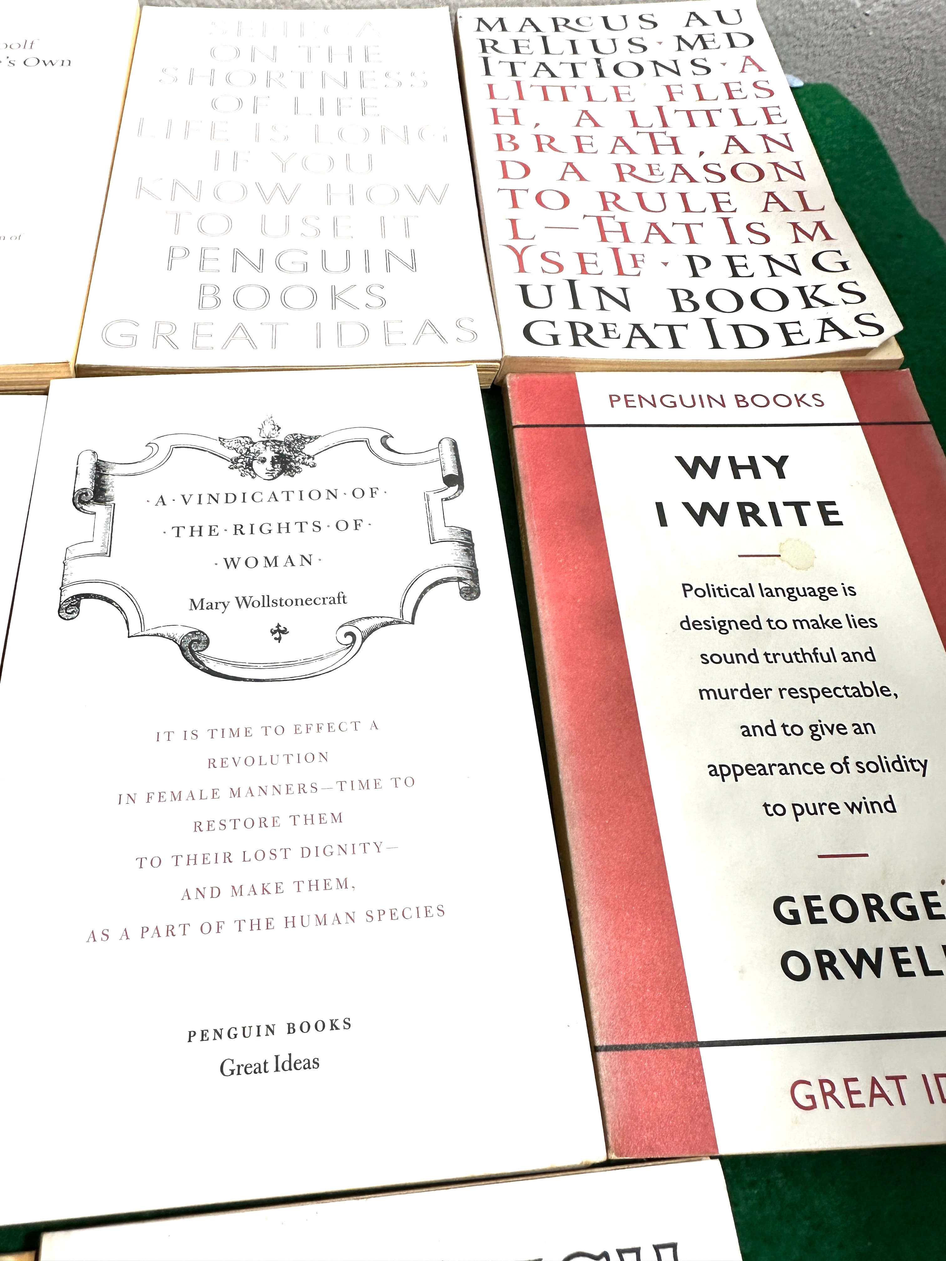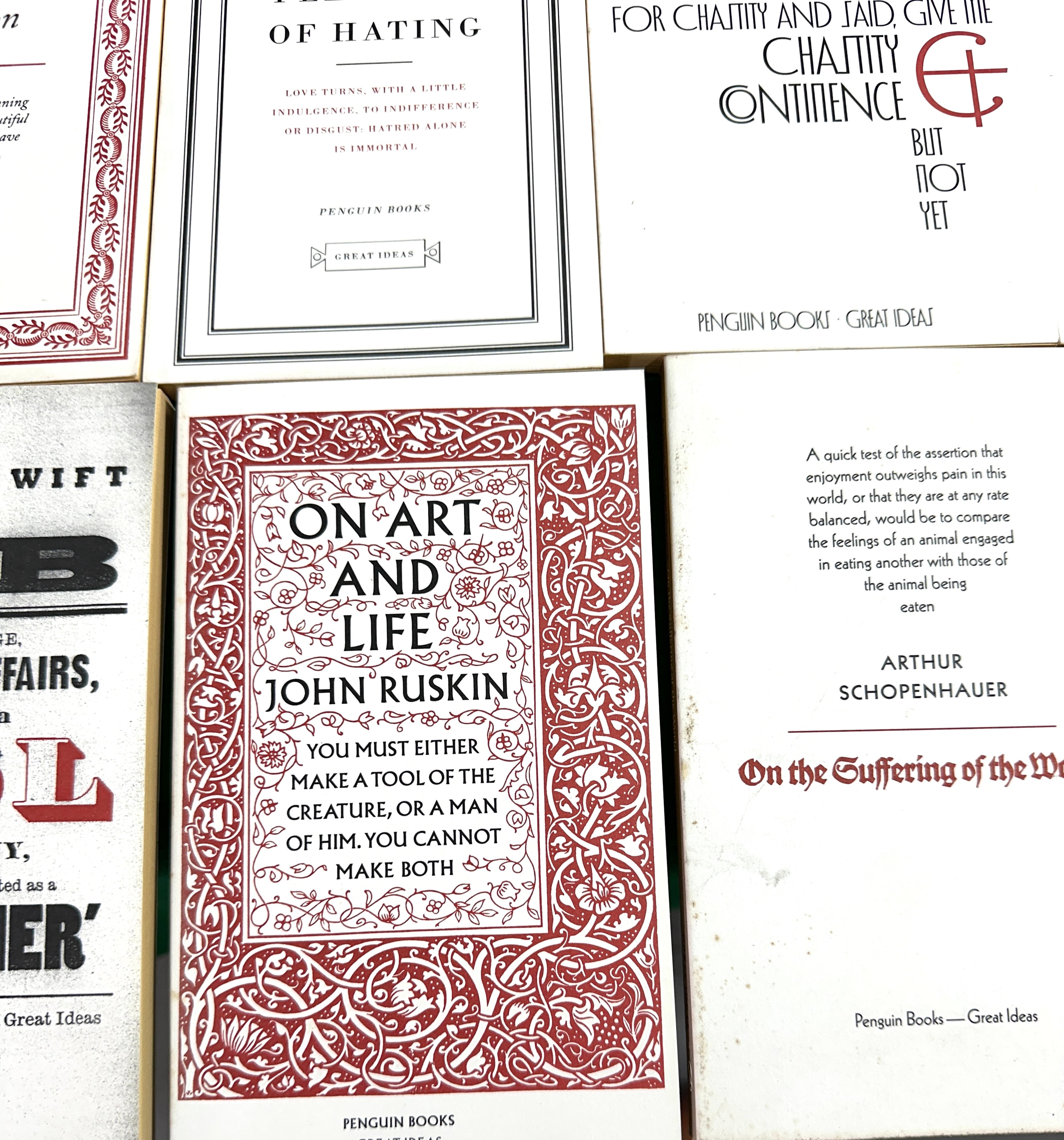 A collection of nineteen paperback books from the ‘Penguin Books Great Ideas’ series. These books feature a uniform modern design, primarily with cream or white covers, black and red typography, and decorative borders or central illustrations often rendered in a classical or historical style. The collection includes works by Michel de Montaigne, Sigmund Freud, Thomas à Kempis, Niccolò Machiavelli, Virginia Woolf, Seneca, Marcus Aurelius, Charles Darwin, William Hazlitt, St. Augustine, Edward Gibbon, Mary Wollstonecraft, George Orwell, Jonathan Swift, John Ruskin, Arthur Schopenhauer, Jean-Jacques Rousseau, Friedrich Nietzsche, and Thomas Paine. Many covers feature prominent quotes or excerpts from the respective texts.