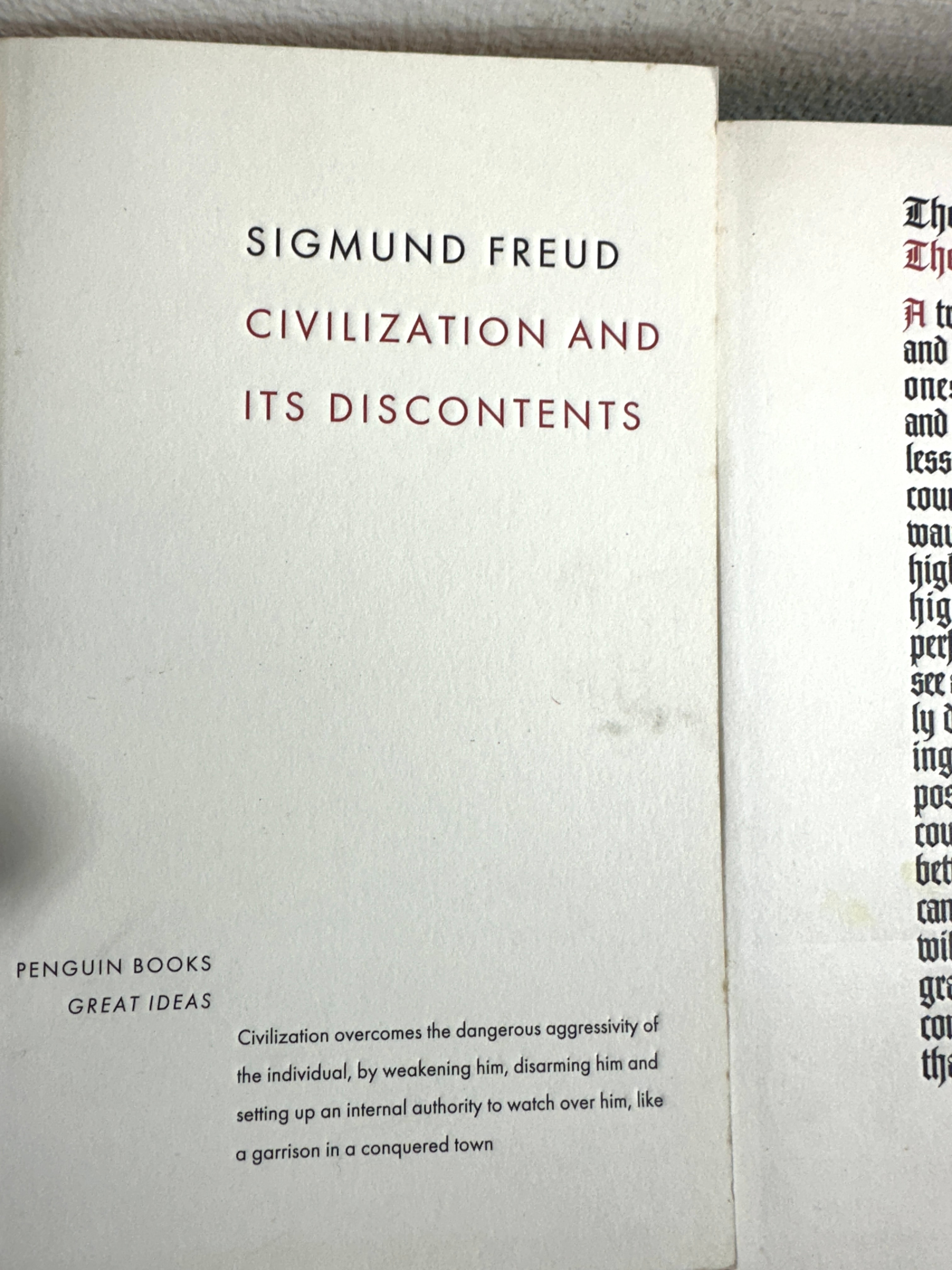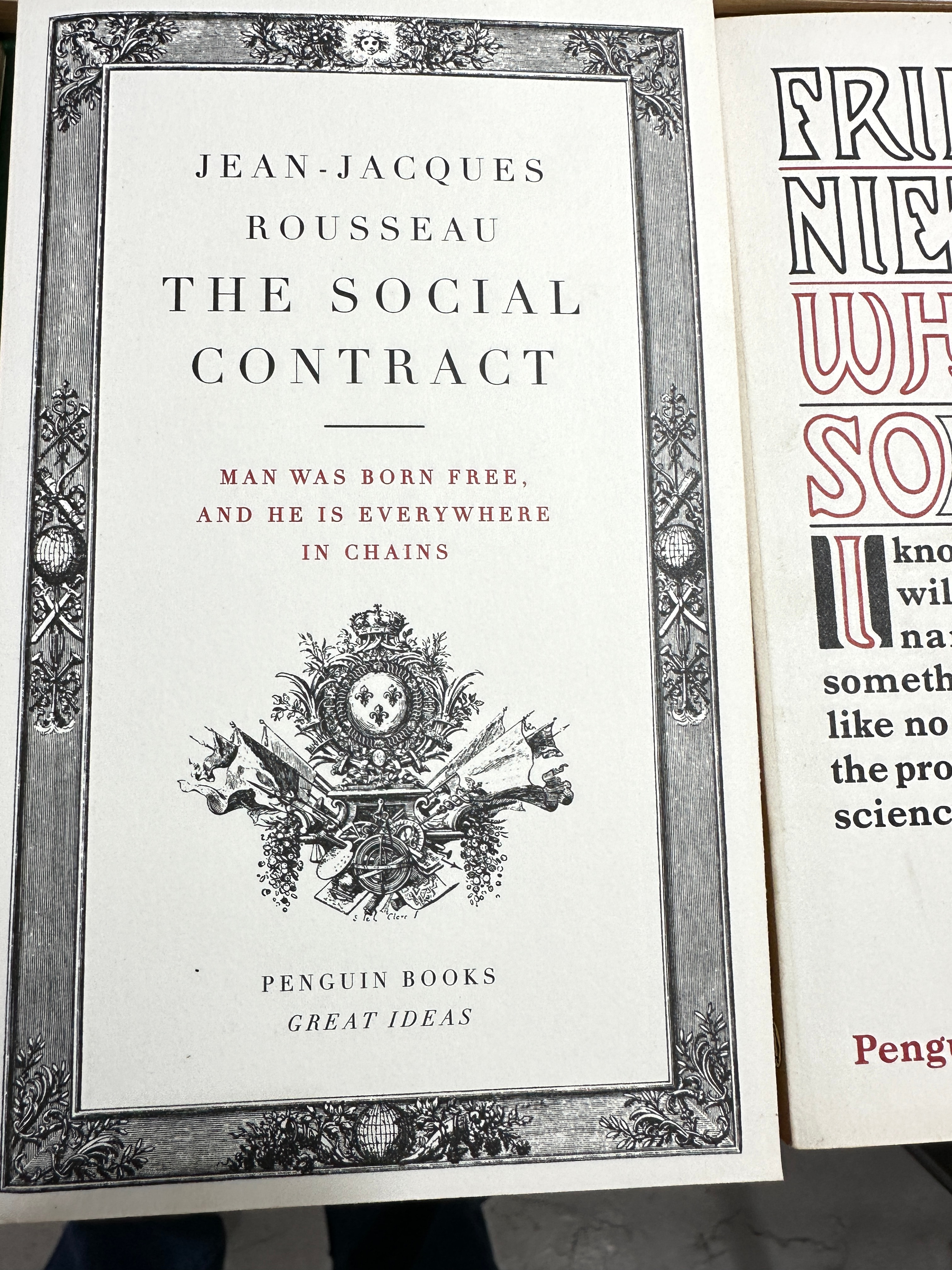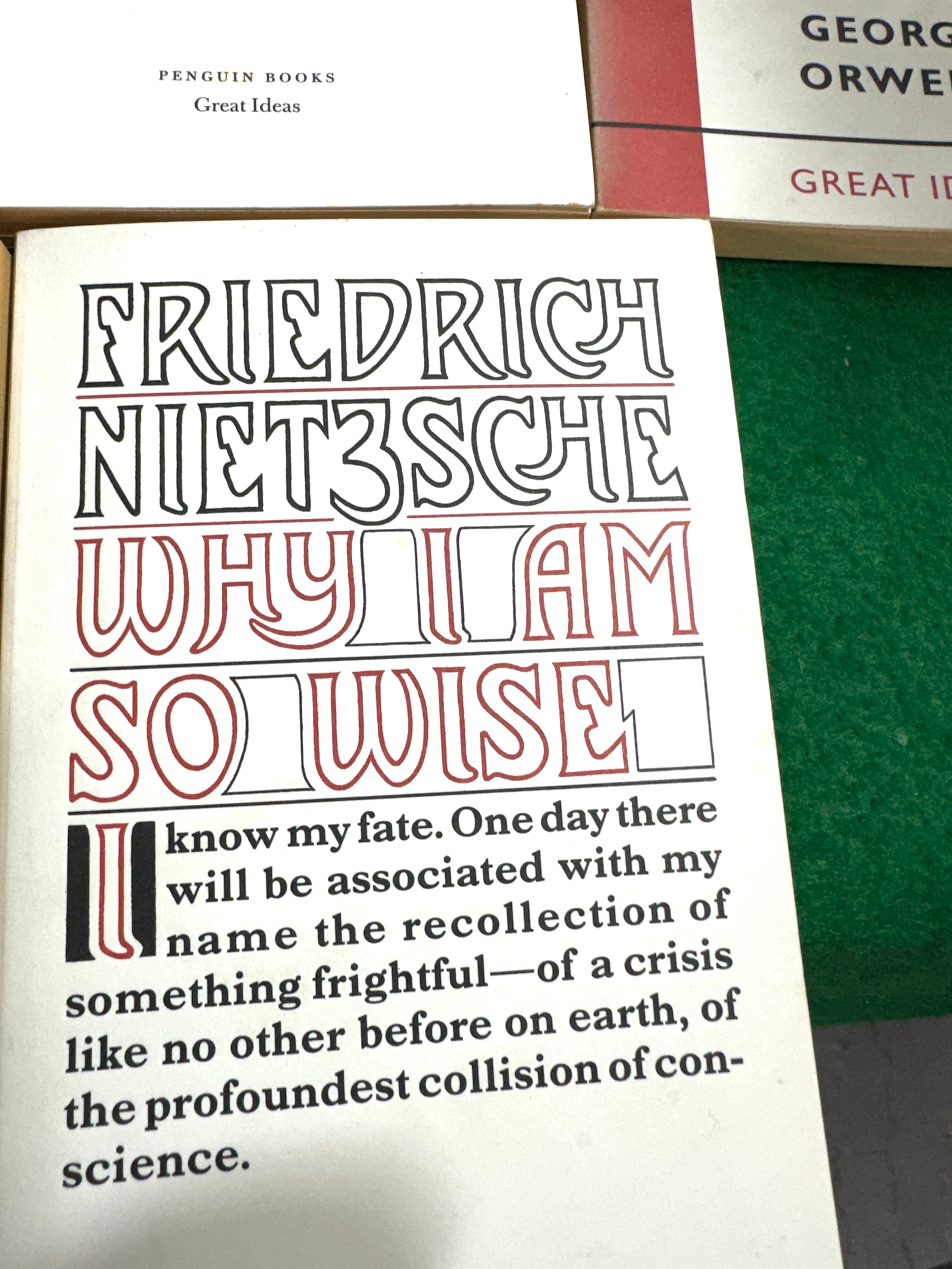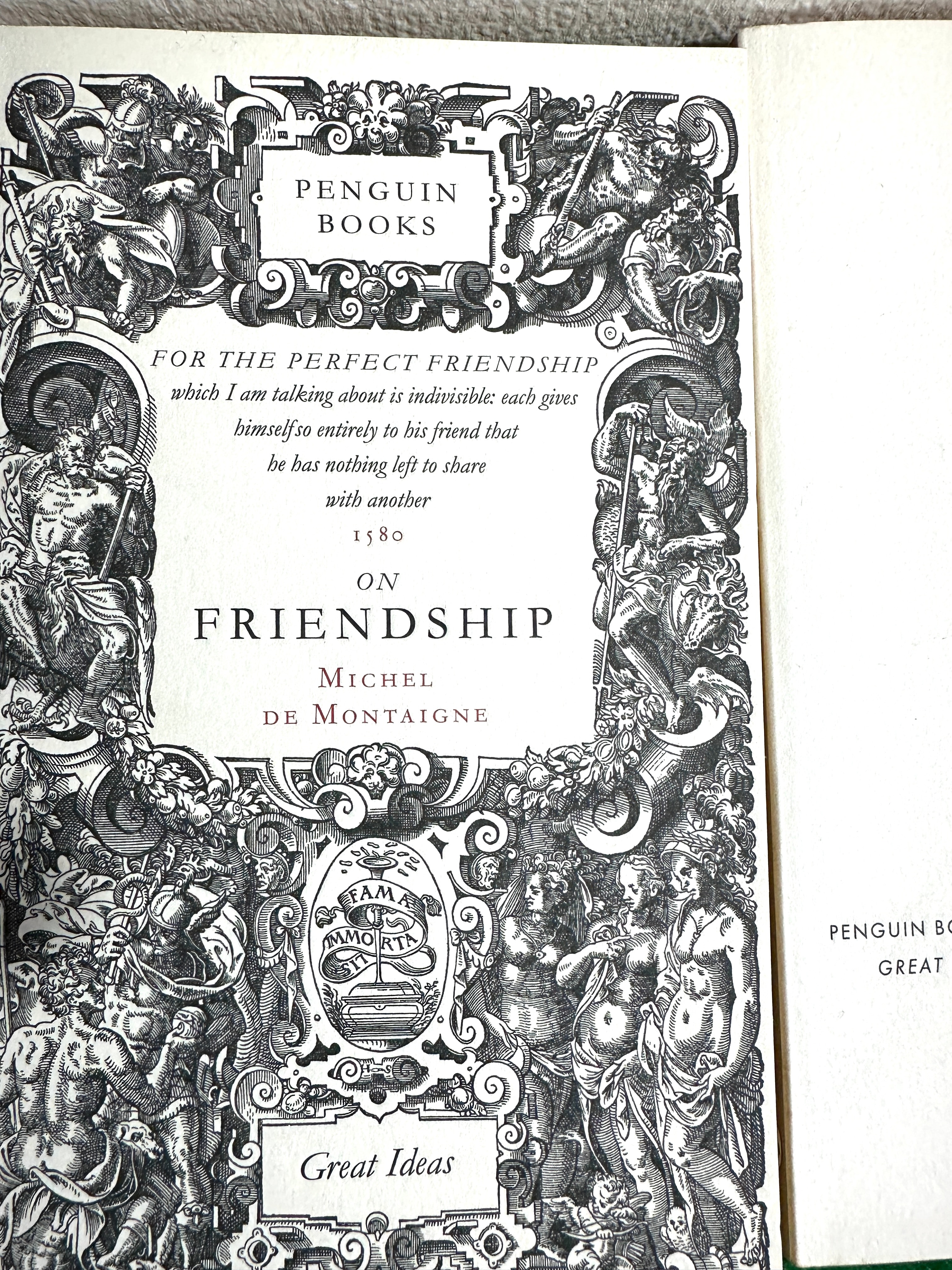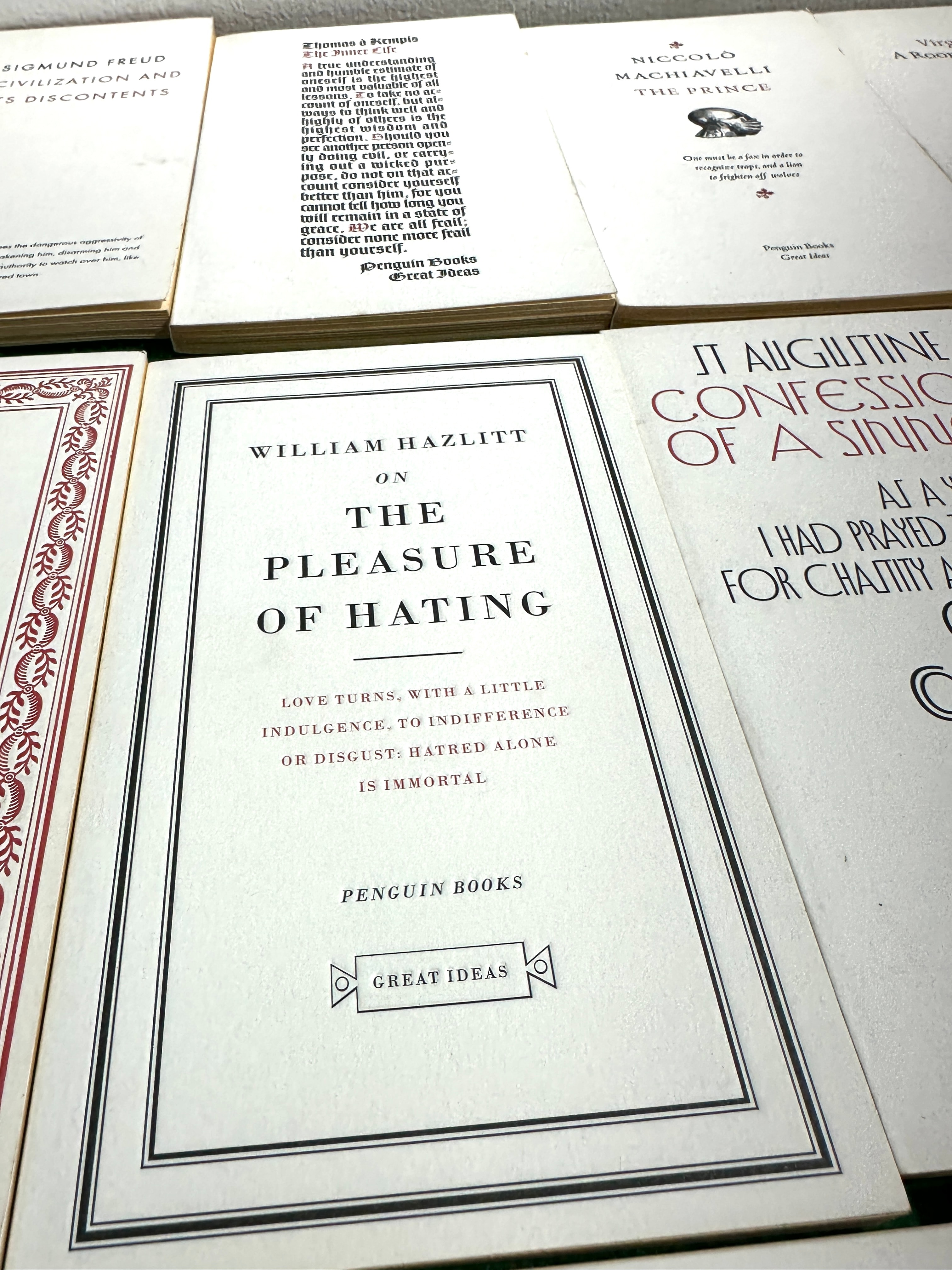A collection of nineteen paperback books from the ‘Penguin Books Great Ideas’ series. These books feature a uniform modern design, primarily with cream or white covers, black and red typography, and decorative borders or central illustrations often rendered in a classical or historical style. The collection includes works by Michel de Montaigne, Sigmund Freud, Thomas à Kempis, Niccolò Machiavelli, Virginia Woolf, Seneca, Marcus Aurelius, Charles Darwin, William Hazlitt, St. Augustine, Edward Gibbon, Mary Wollstonecraft, George Orwell, Jonathan Swift, John Ruskin, Arthur Schopenhauer, Jean-Jacques Rousseau, Friedrich Nietzsche, and Thomas Paine. Many covers feature prominent quotes or excerpts from the respective texts.