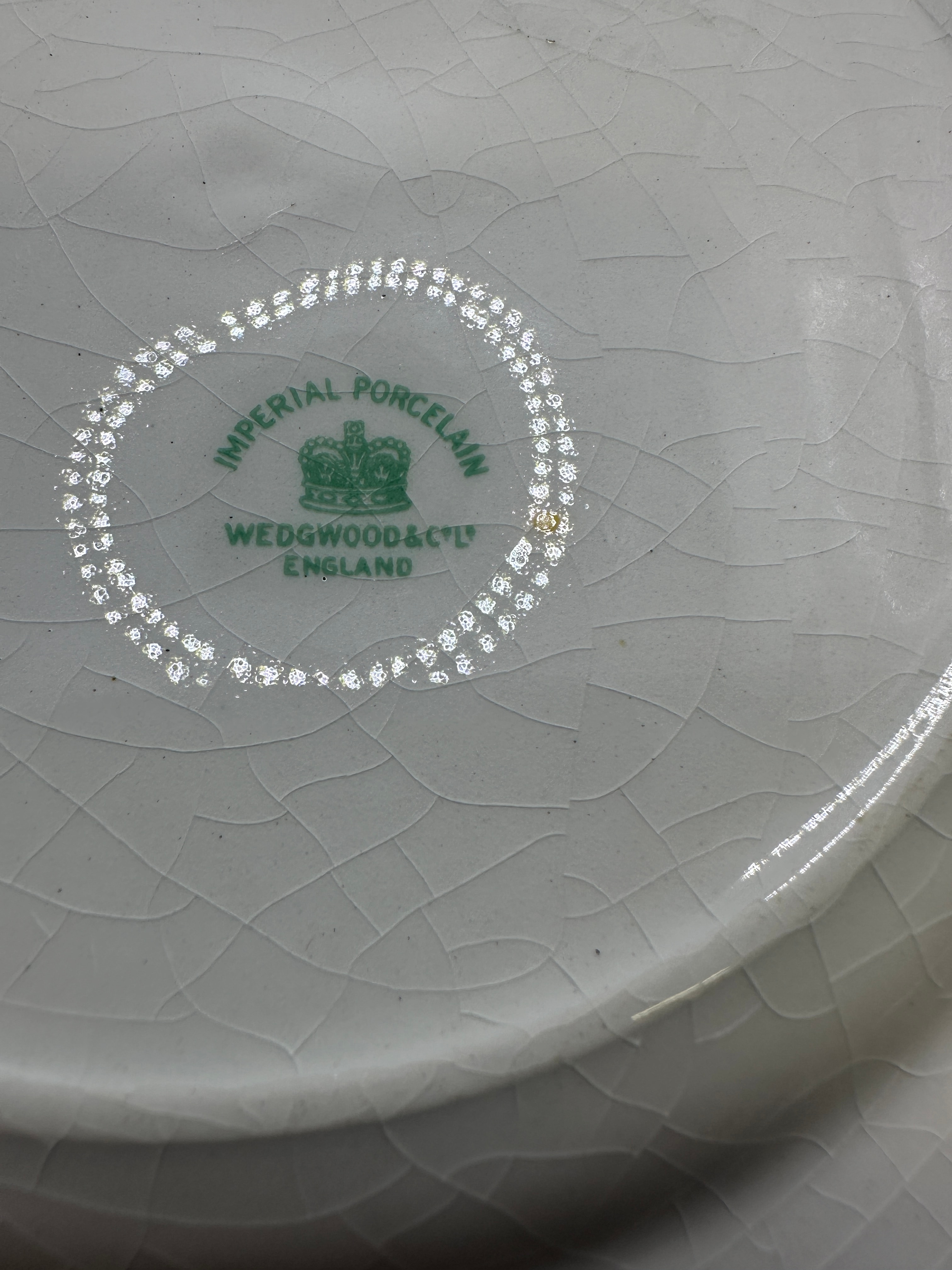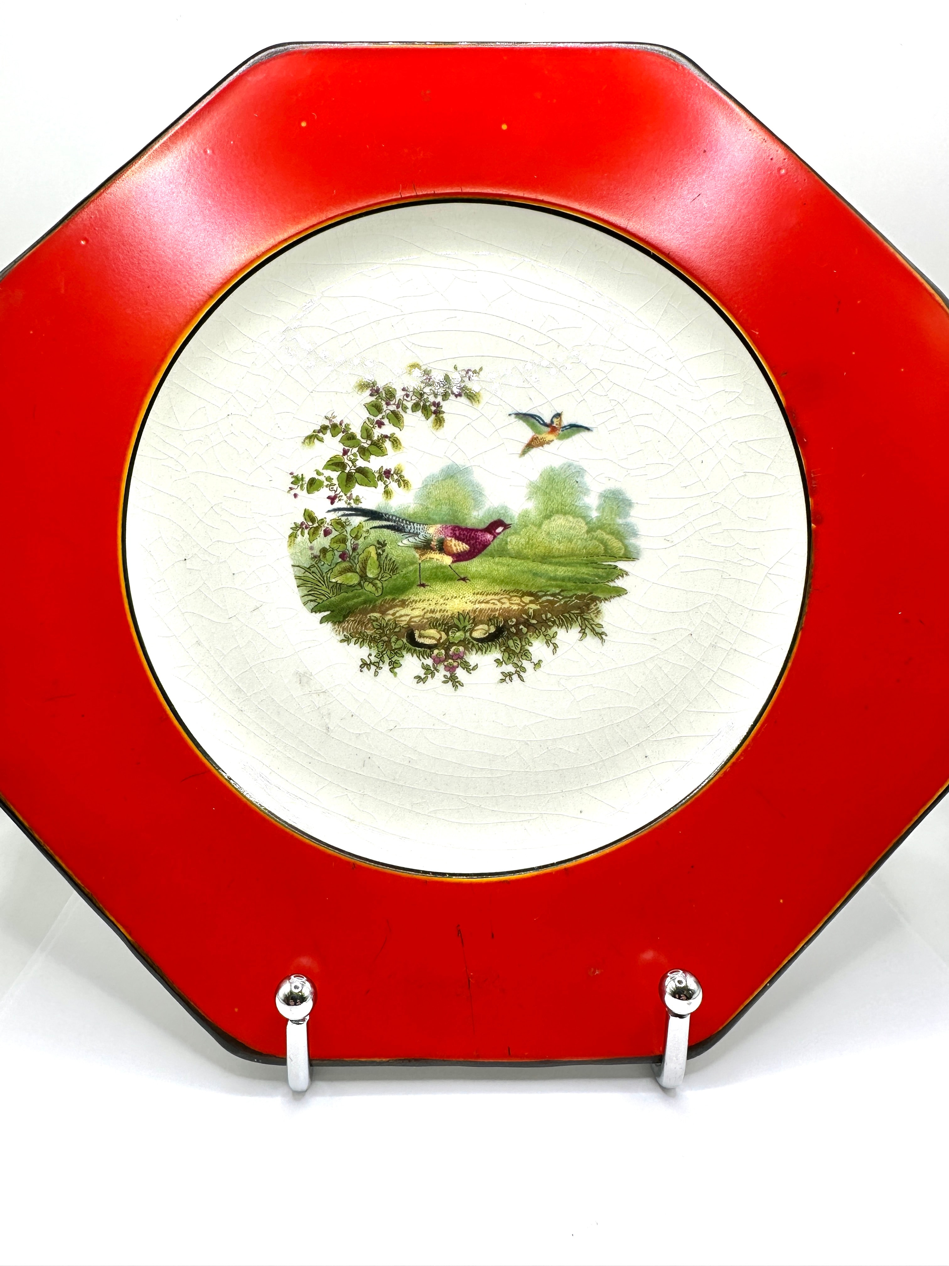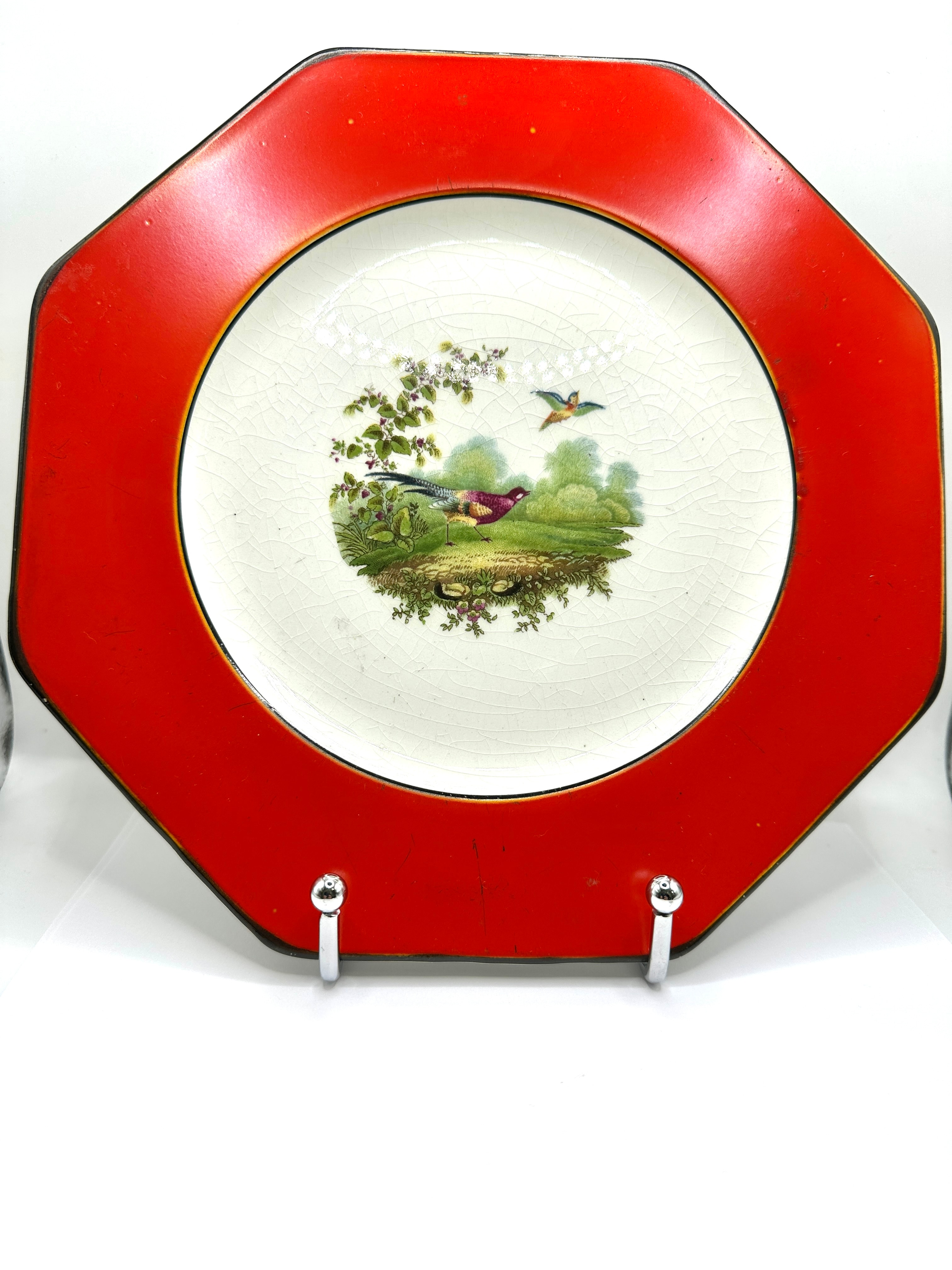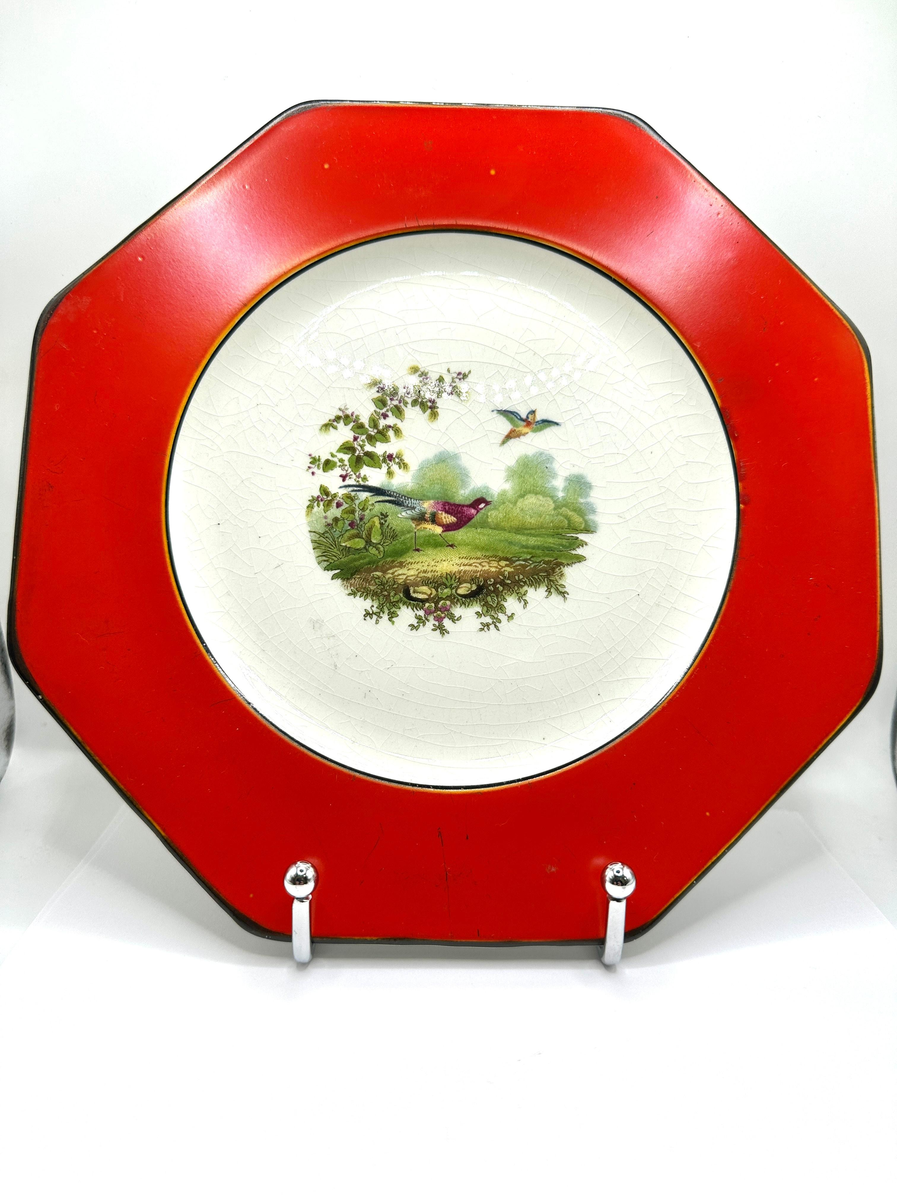An Imperial Porcelain Wedgwood & Co. Ltd. octagonal charger, featuring a central pastoral scene depicting two pheasants. The off-white ceramic well is adorned with one pheasant on the ground amid foliage and another in flight, rendered in a colorful, naturalistic style. This central motif is framed by a bright red outer rim. The reverse side bears a green printed mark ‘IMPERIAL PORCELAIN’ above a crown, with ‘WEDGWOOD & C° L’ and ‘ENGLAND’ below.