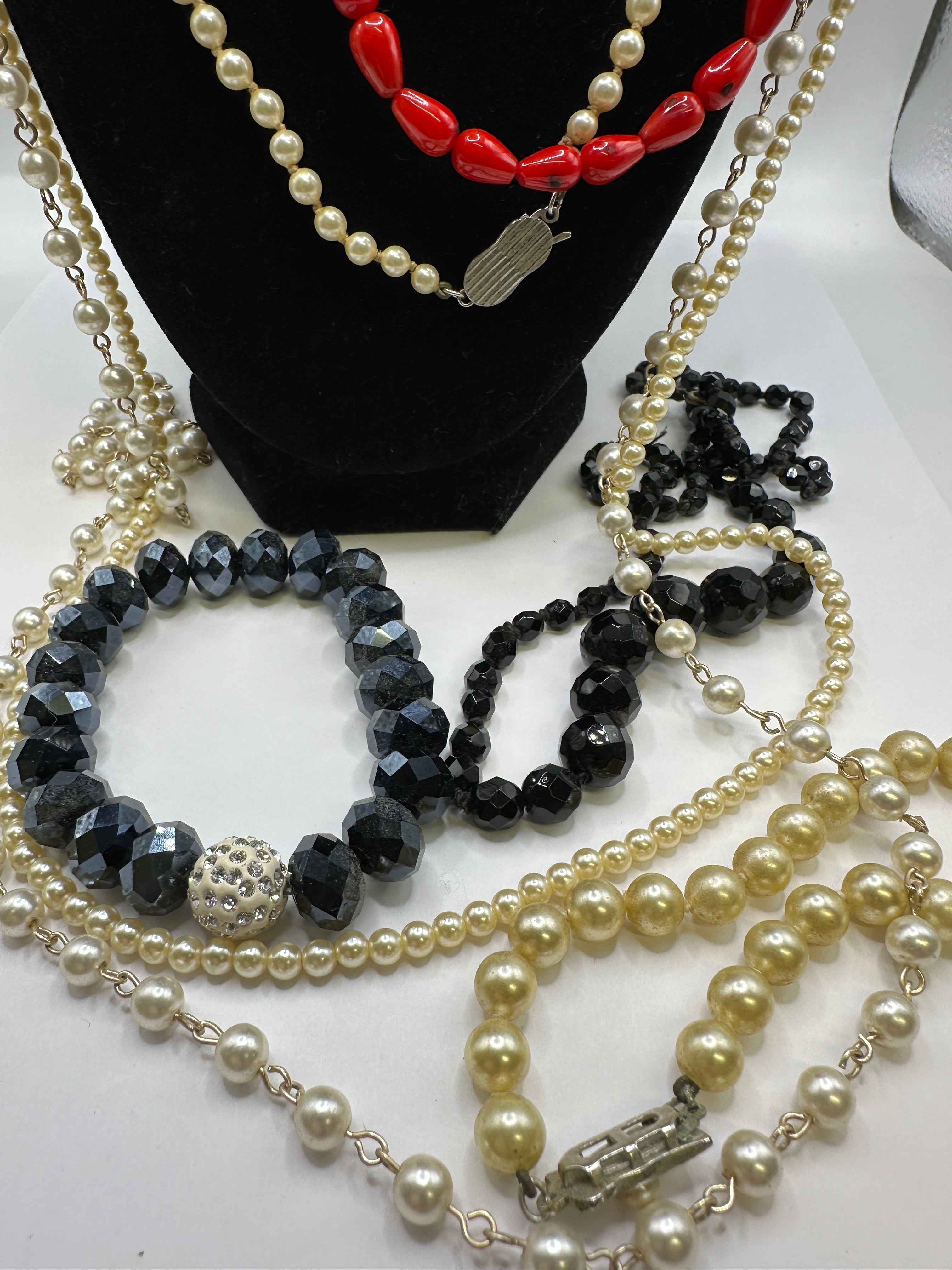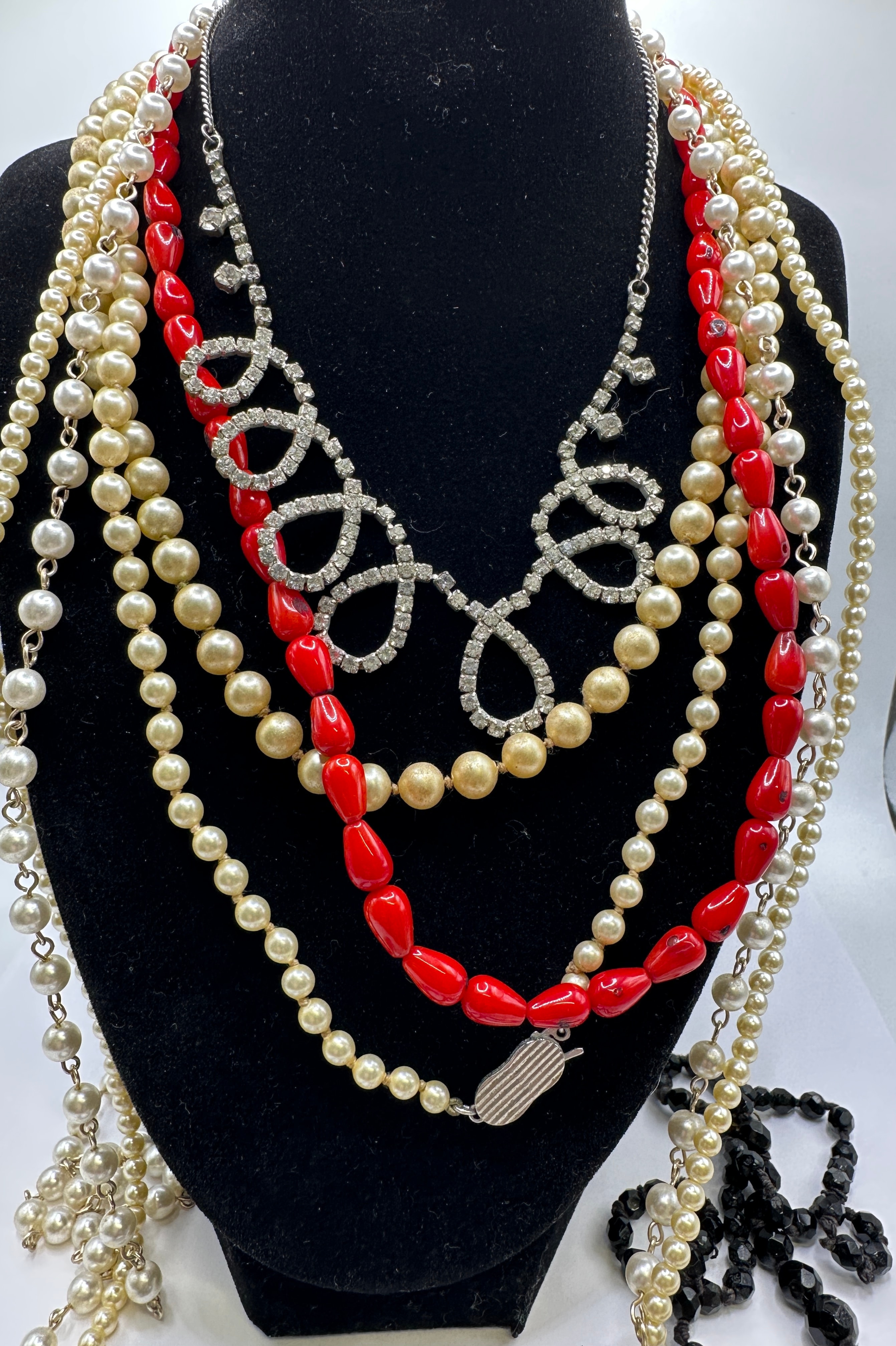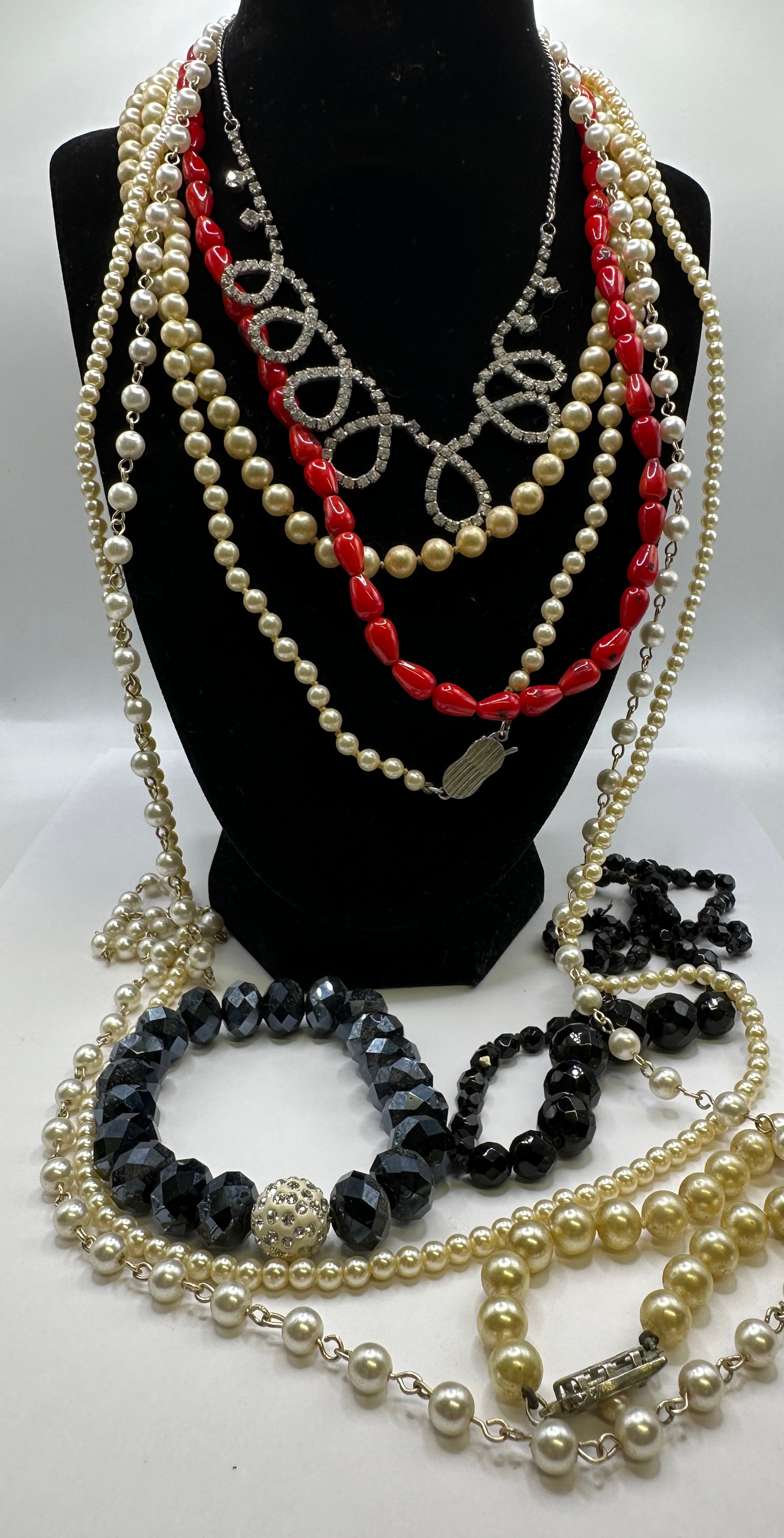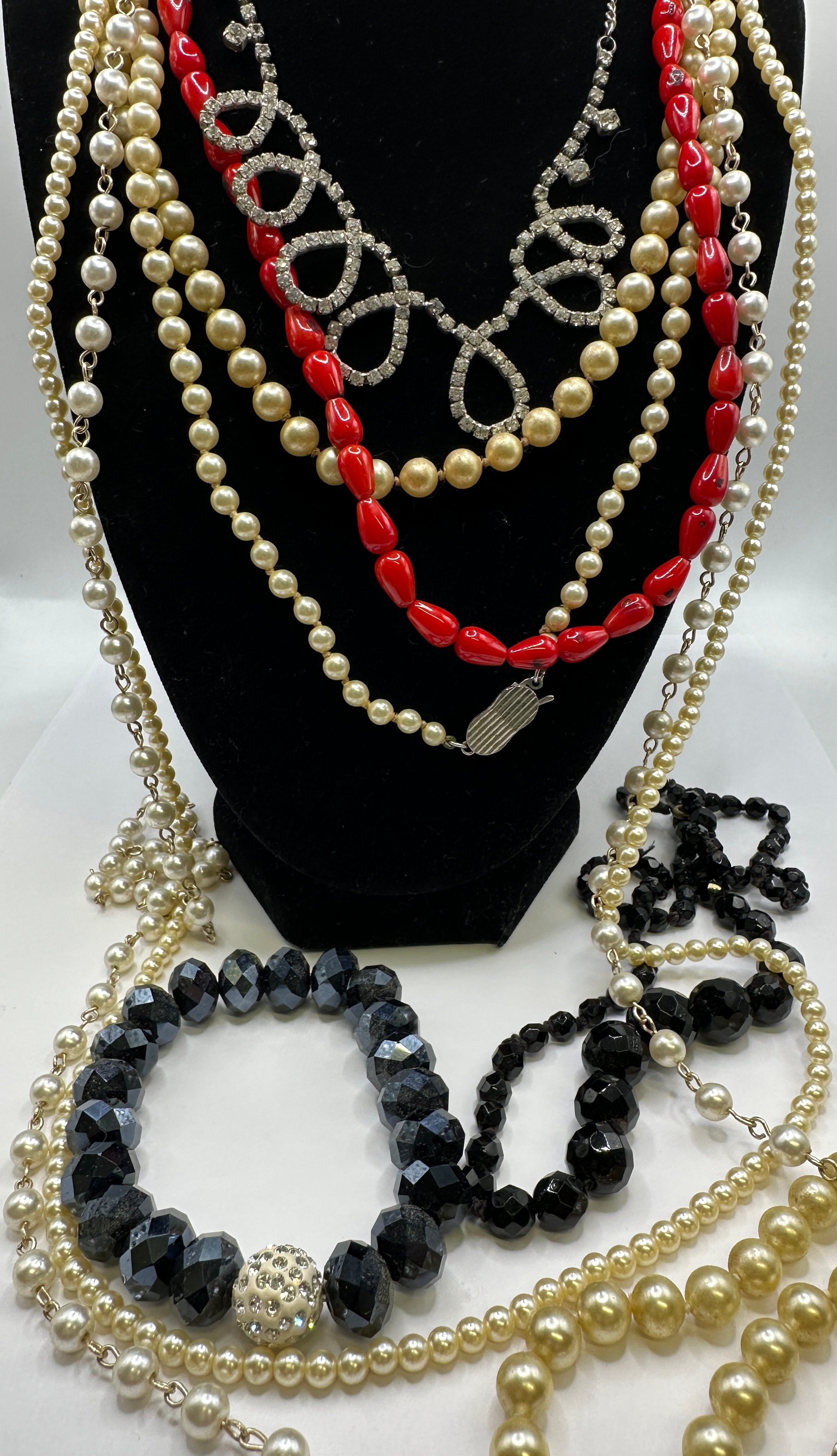A collection of costume jewelry, primarily comprising necklaces and bracelets, in various styles. The assortment includes several multi-strand faux pearl necklaces in white and cream/gold tones, a necklace composed of elongated red plastic or glass beads with a silver-tone box clasp, and a silver-tone statement necklace featuring looping elements set with clear rhinestones. Also present are various black beaded pieces, including bracelets with faceted beads (one incorporating a pave rhinestone spacer bead) and necklaces with varied black bead shapes. Materials appear to be faux pearls (likely glass or plastic), glass or plastic beads, clear rhinestones, and base metal findings. No manufacturer’s marks or textual identifiers are discernible.