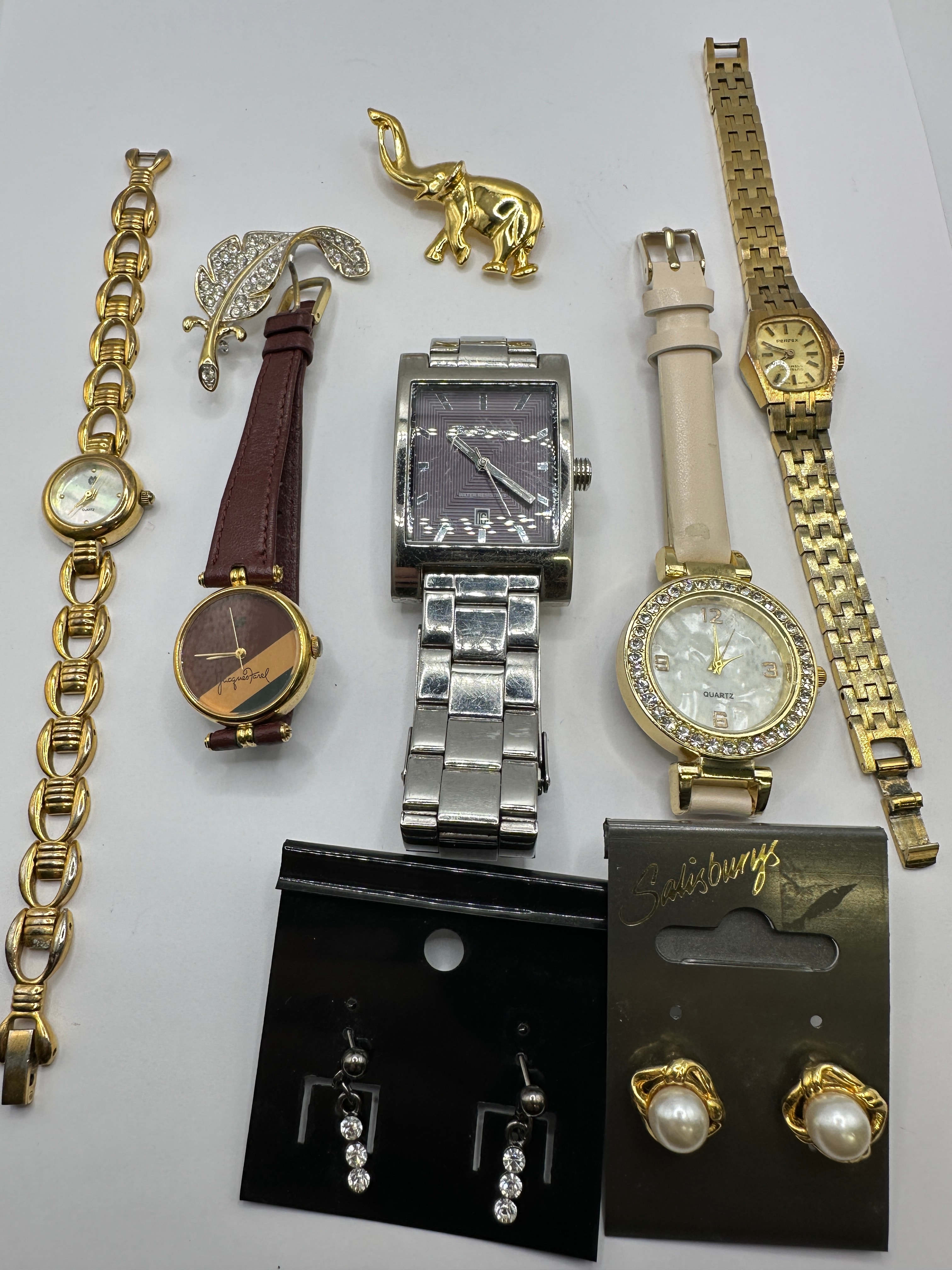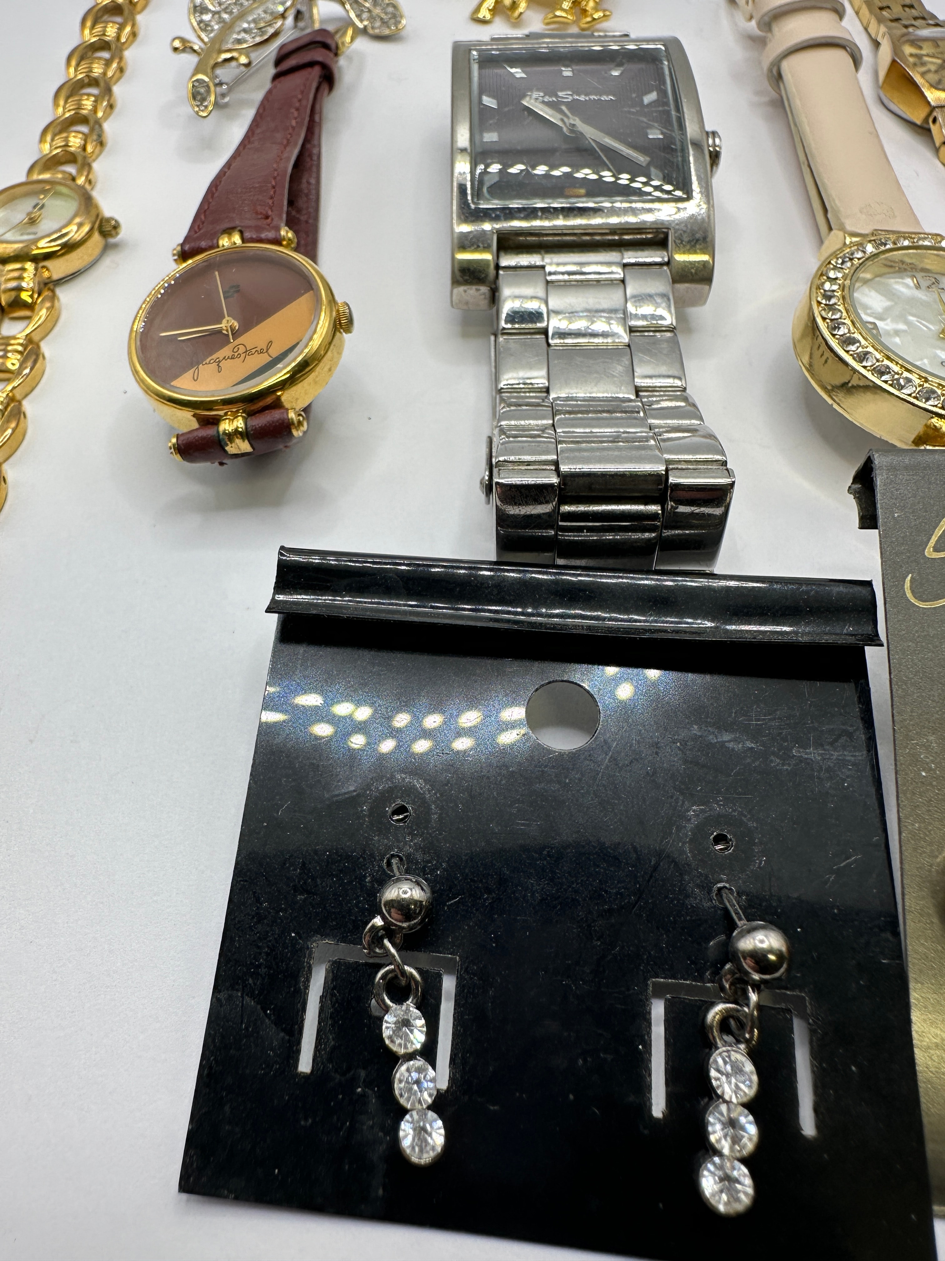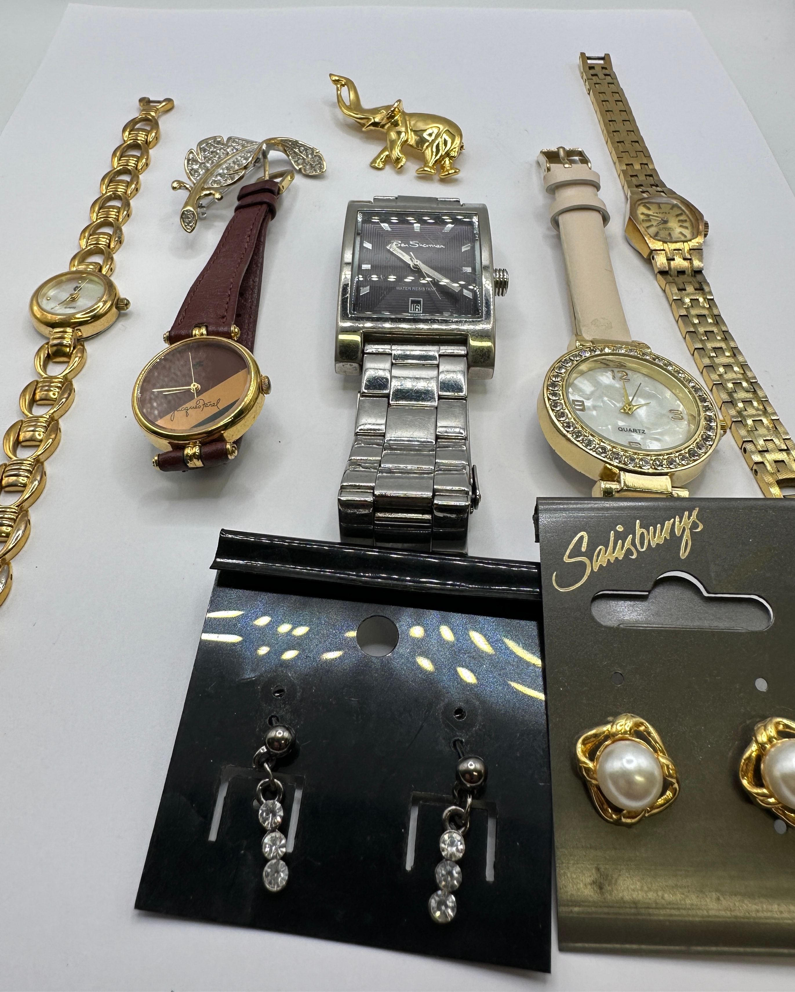 This lot presents a collection of contemporary fashion jewelry comprising five distinct watches, two brooches, and two pairs of earrings. The collection includes a silver-tone rectangular cased watch with a matching bracelet and dark patterned dial, marked “Ben Sherman”, “WATER RESISTANT”, and displaying the date “16”. Also present are a gold-tone bracelet watch with a round mother-of-pearl dial marked “QUARTZ”; a gold-tone watch with a brown leather-look strap and two-tone brown dial inscribed “Jacques Varel”; a gold-tone watch with a cream-colored leather-look strap, rhinestone-encrusted bezel, and mother-of-pearl dial marked “QUARTZ”; and a gold-tone integrated bracelet watch with a small rectangular dial, possibly branded “TIMEX”. The brooches consist of a gold-tone elephant and a gold-tone feather design embellished with clear rhinestones. Two pairs of new earrings are presented on cards: silver-tone dangle earrings with graduated clear rhinestones, and gold-tone stud earrings featuring faux pearls, displayed on a card labeled “Salisburys”.