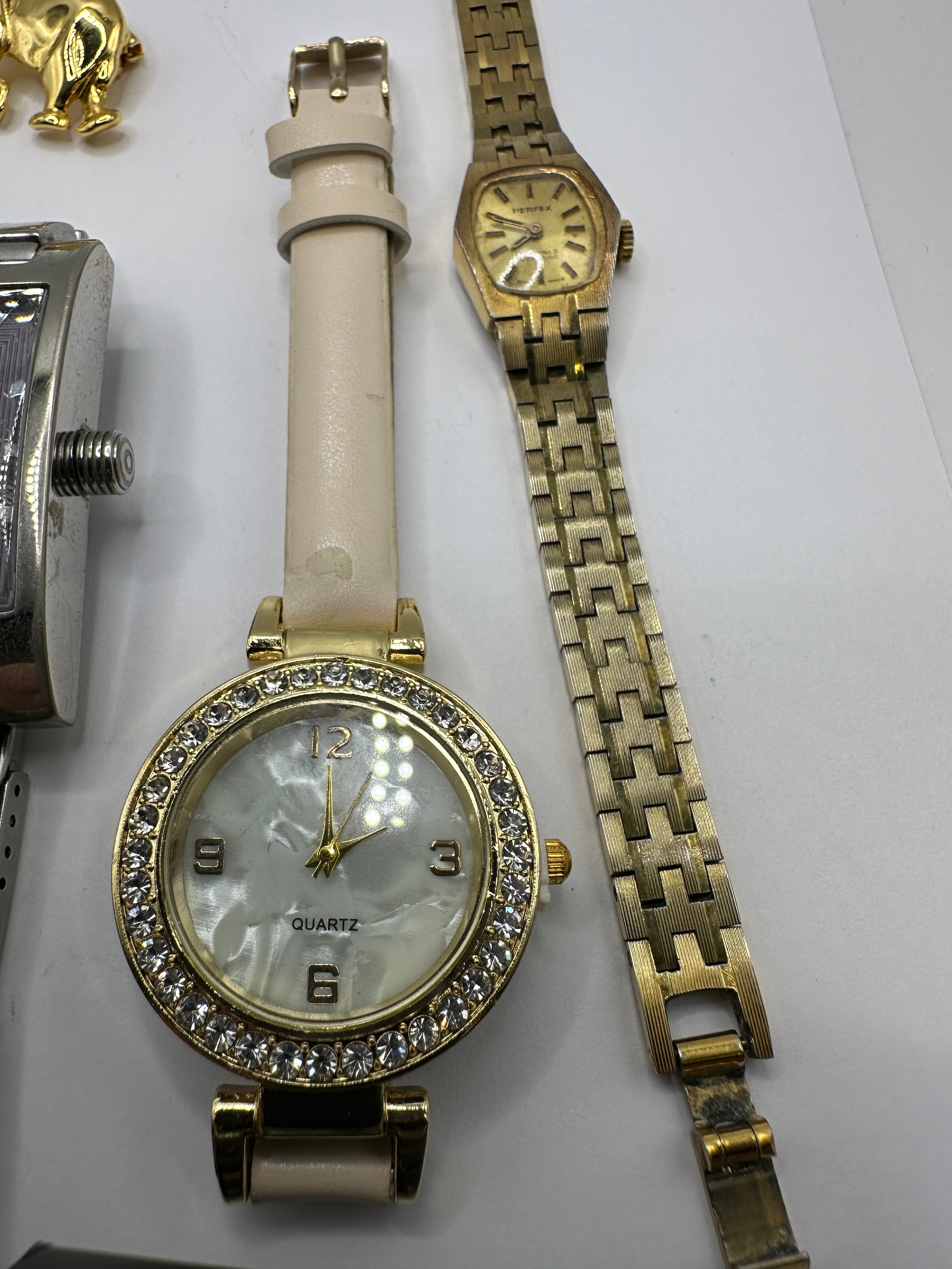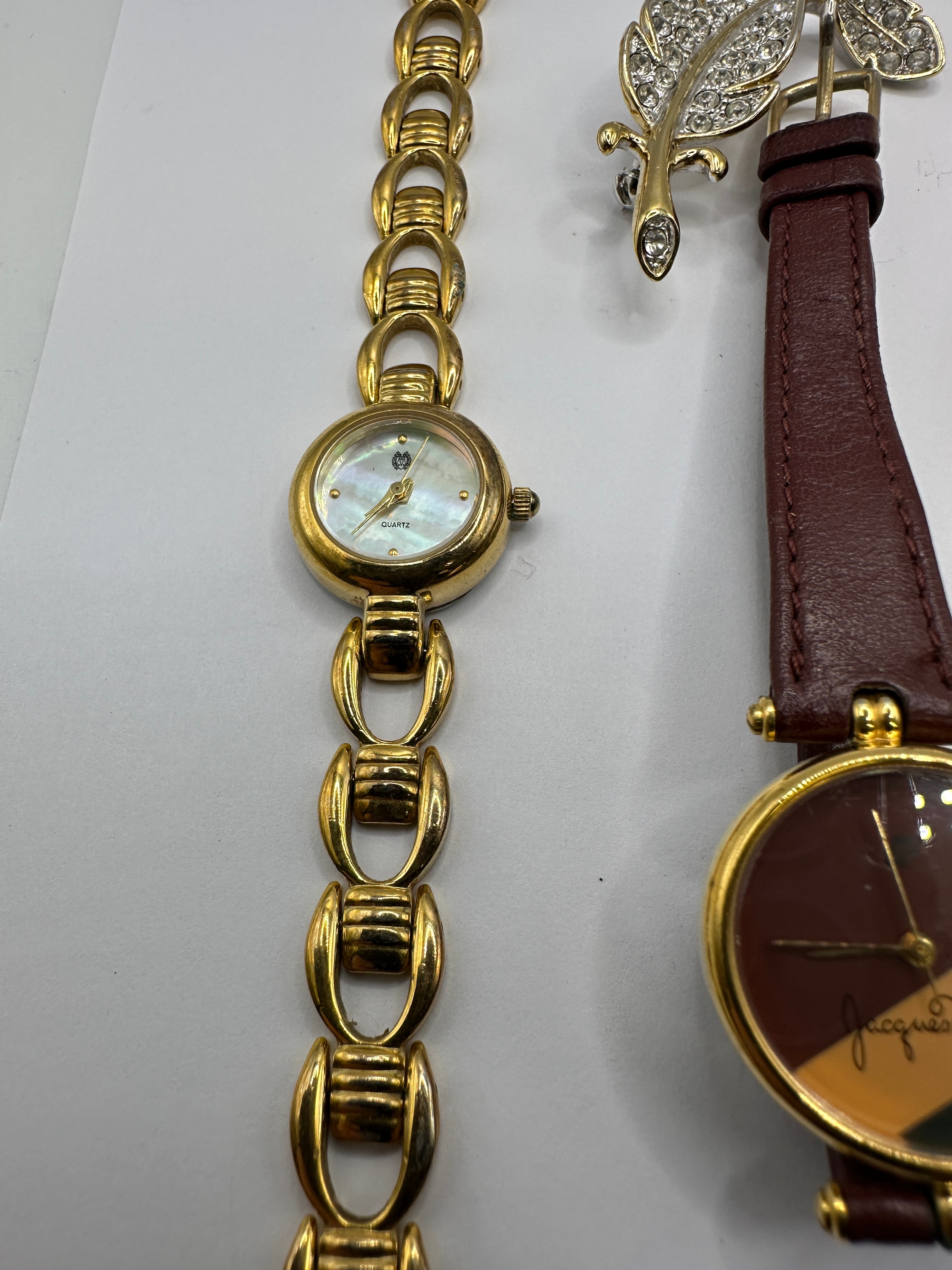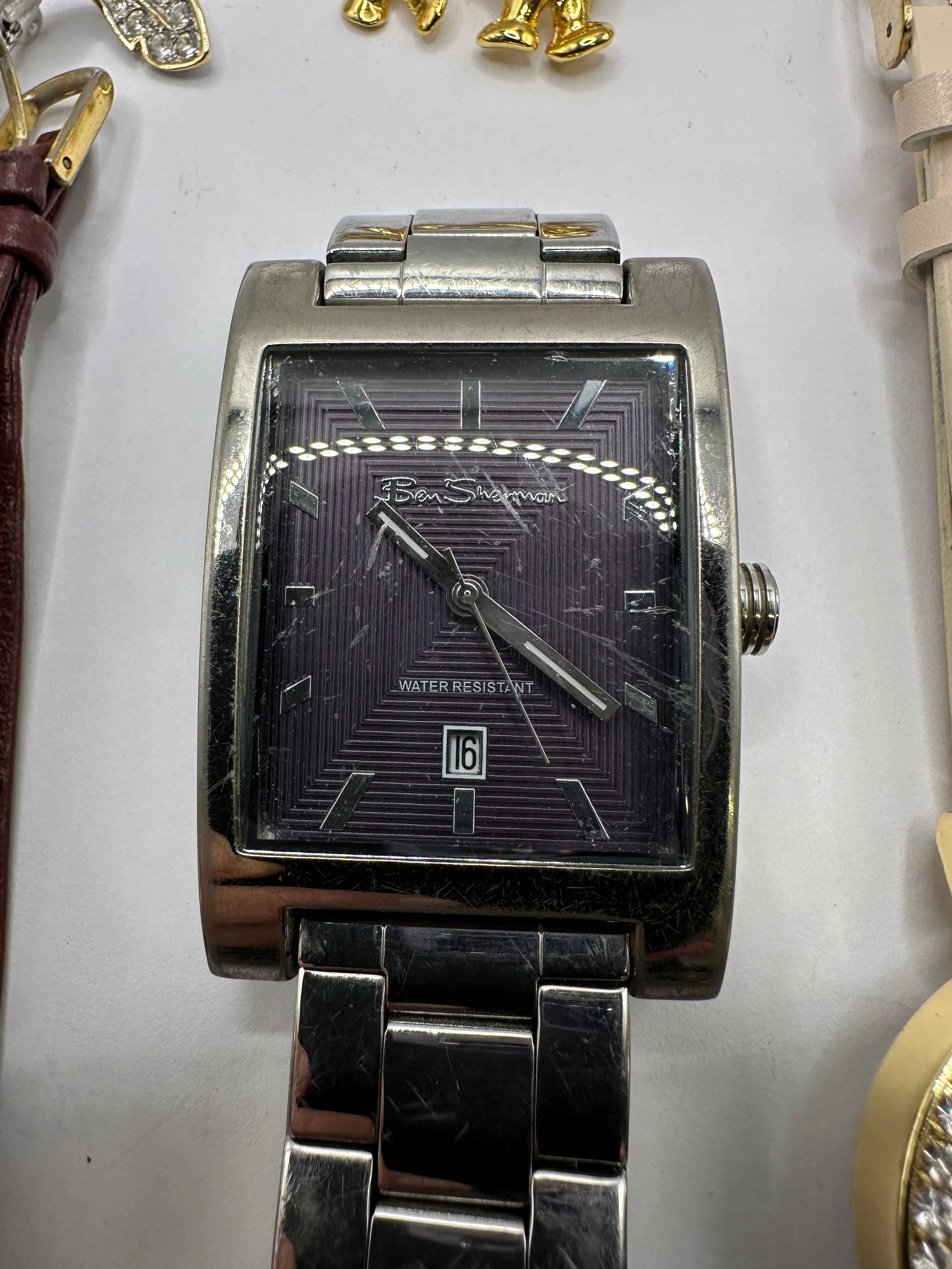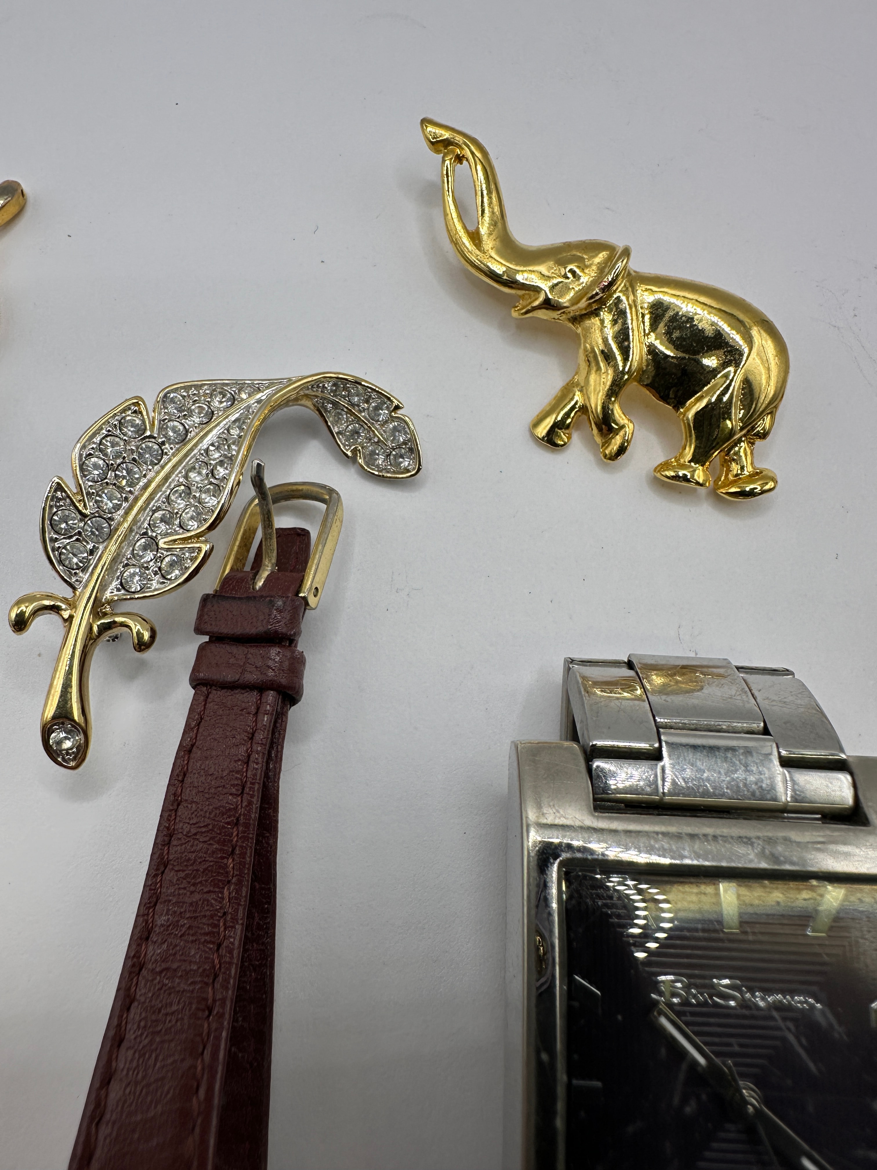 This lot presents a collection of contemporary fashion jewelry comprising five distinct watches, two brooches, and two pairs of earrings. The collection includes a silver-tone rectangular cased watch with a matching bracelet and dark patterned dial, marked “Ben Sherman”, “WATER RESISTANT”, and displaying the date “16”. Also present are a gold-tone bracelet watch with a round mother-of-pearl dial marked “QUARTZ”; a gold-tone watch with a brown leather-look strap and two-tone brown dial inscribed “Jacques Varel”; a gold-tone watch with a cream-colored leather-look strap, rhinestone-encrusted bezel, and mother-of-pearl dial marked “QUARTZ”; and a gold-tone integrated bracelet watch with a small rectangular dial, possibly branded “TIMEX”. The brooches consist of a gold-tone elephant and a gold-tone feather design embellished with clear rhinestones. Two pairs of new earrings are presented on cards: silver-tone dangle earrings with graduated clear rhinestones, and gold-tone stud earrings featuring faux pearls, displayed on a card labeled “Salisburys”.