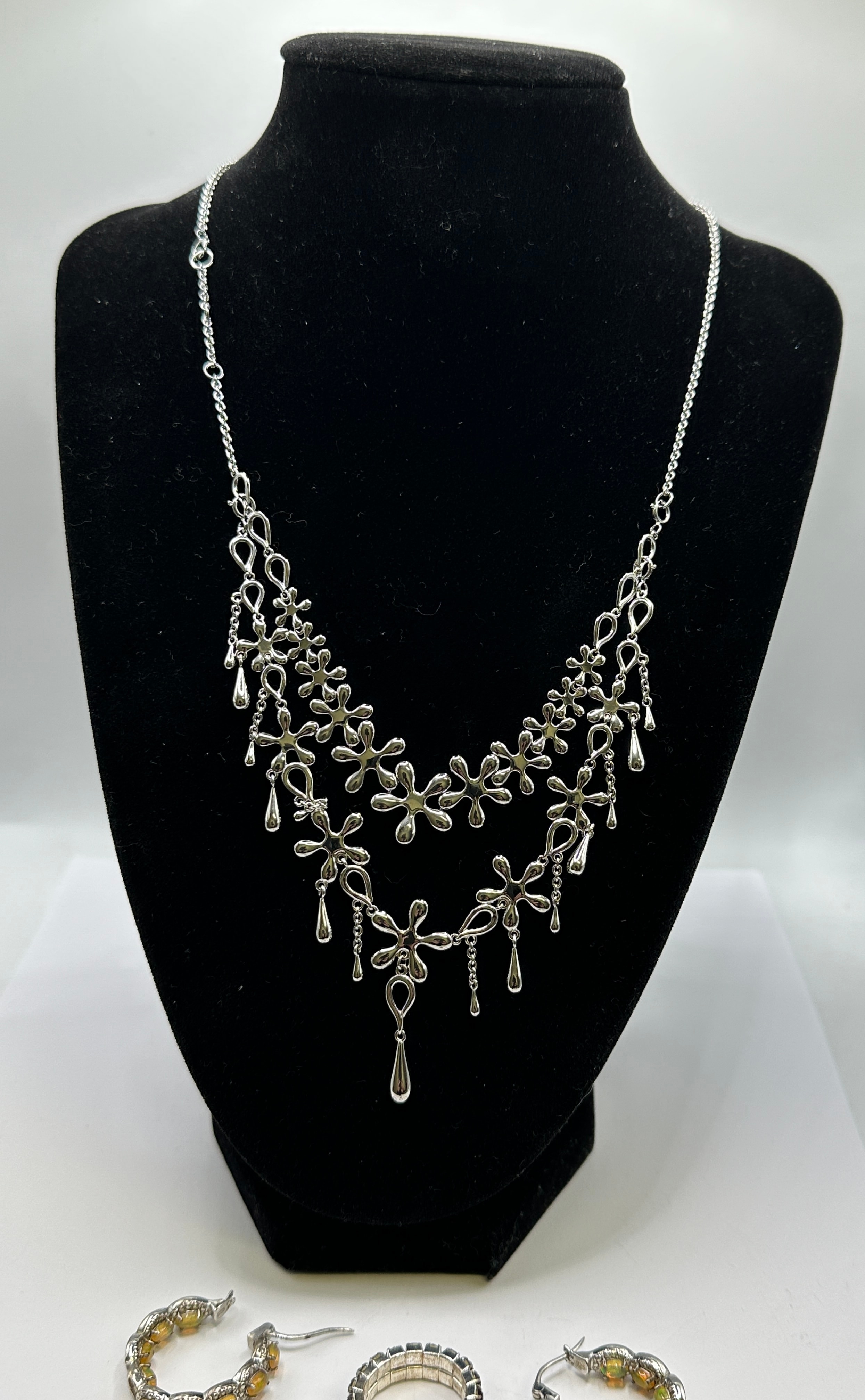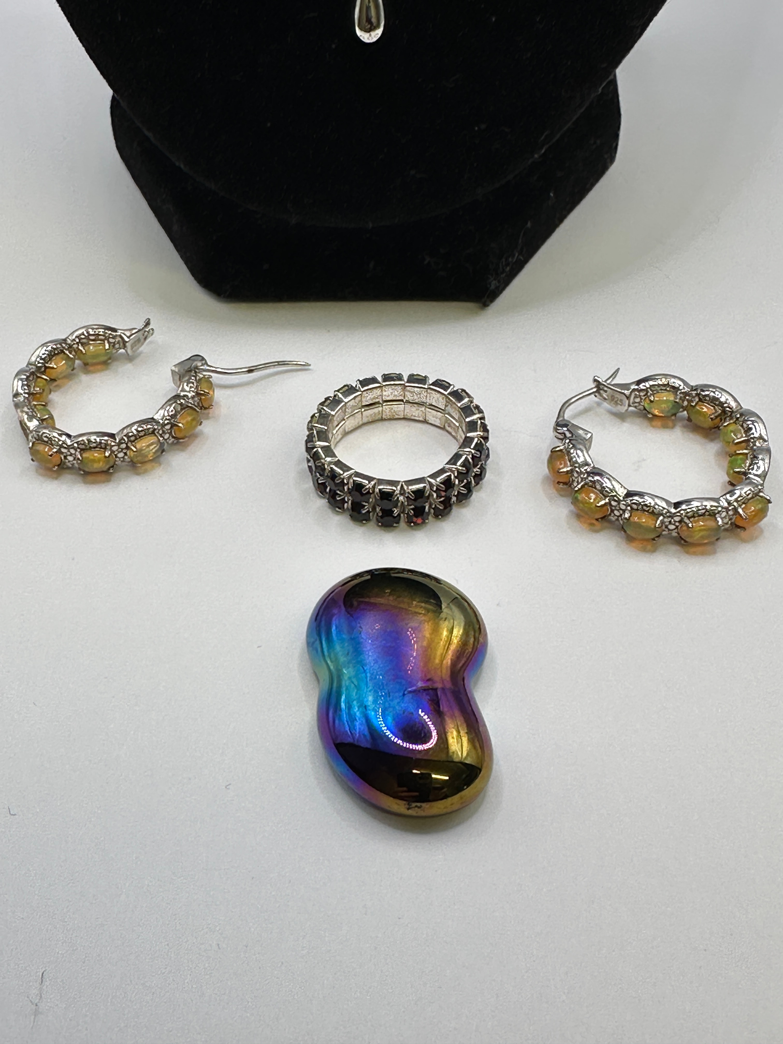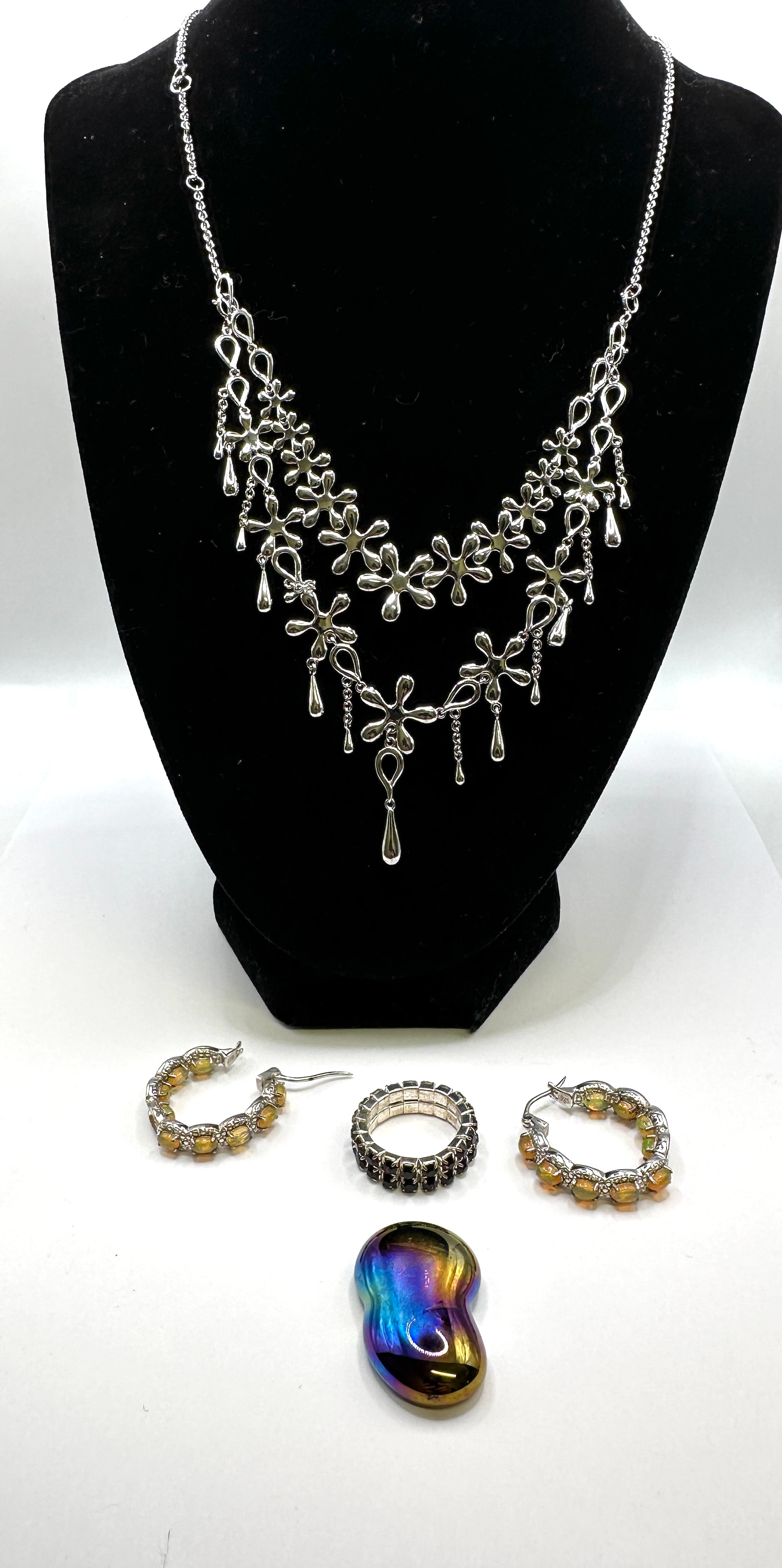 A collection of jewelry and a decorative object. The primary piece is a silver-tone statement necklace, presenting a multi-tiered arrangement of stylized floral or clover-like links adorned with small teardrop pendants. Accompanying this are a pair of silver-tone hoop earrings, visibly marked “925” indicating sterling silver, each set with multiple oval cabochon opalescent stones exhibiting yellow, orange, and green hues. Also included is a silver-tone stretch ring in an eternity band style, continuously set with dark faceted stones. The collection is completed by a small, irregularly shaped decorative object, possibly glass or ceramic, with a vibrant iridescent finish displaying a spectrum of metallic blues, greens, purples, and golds.