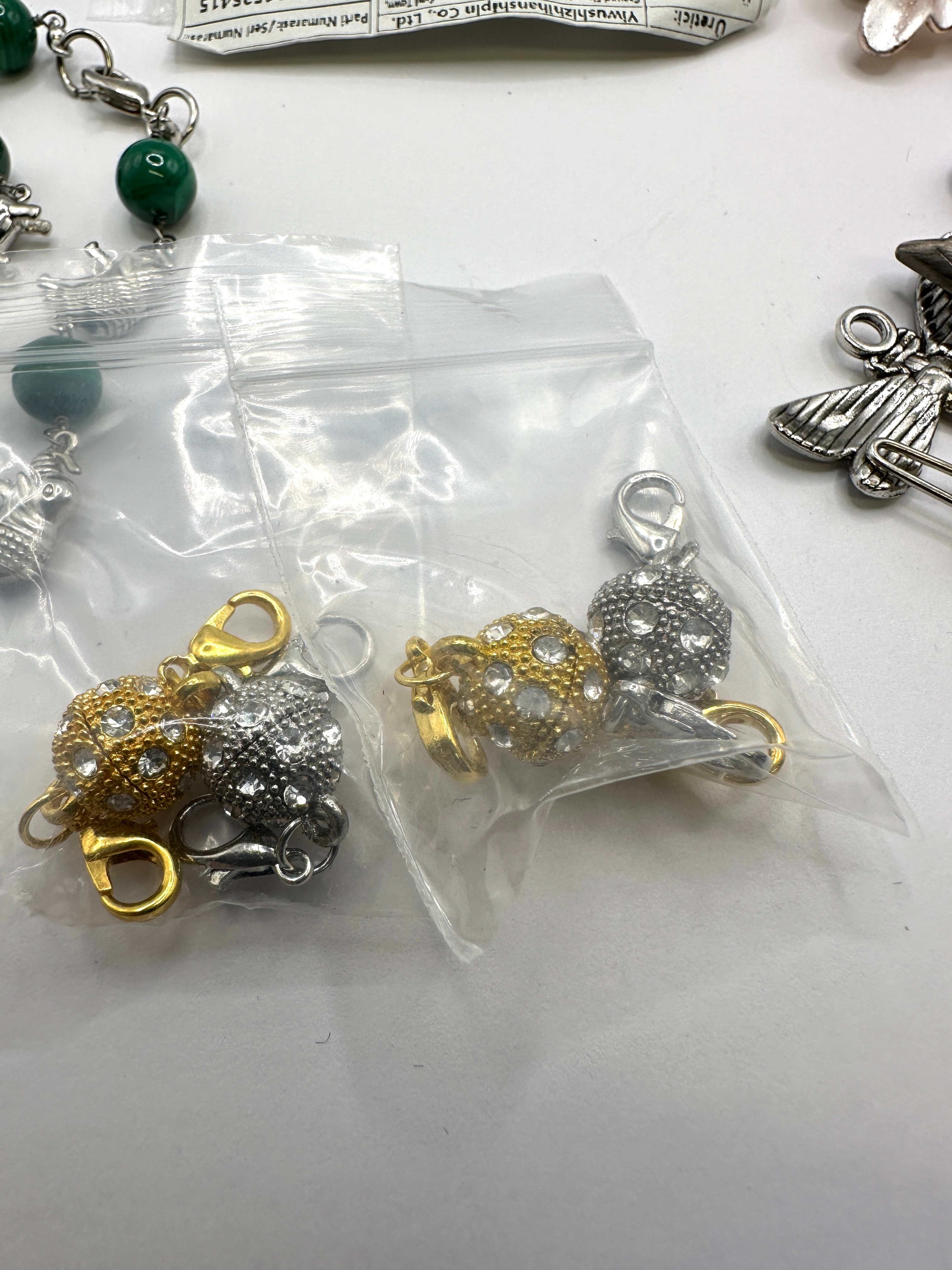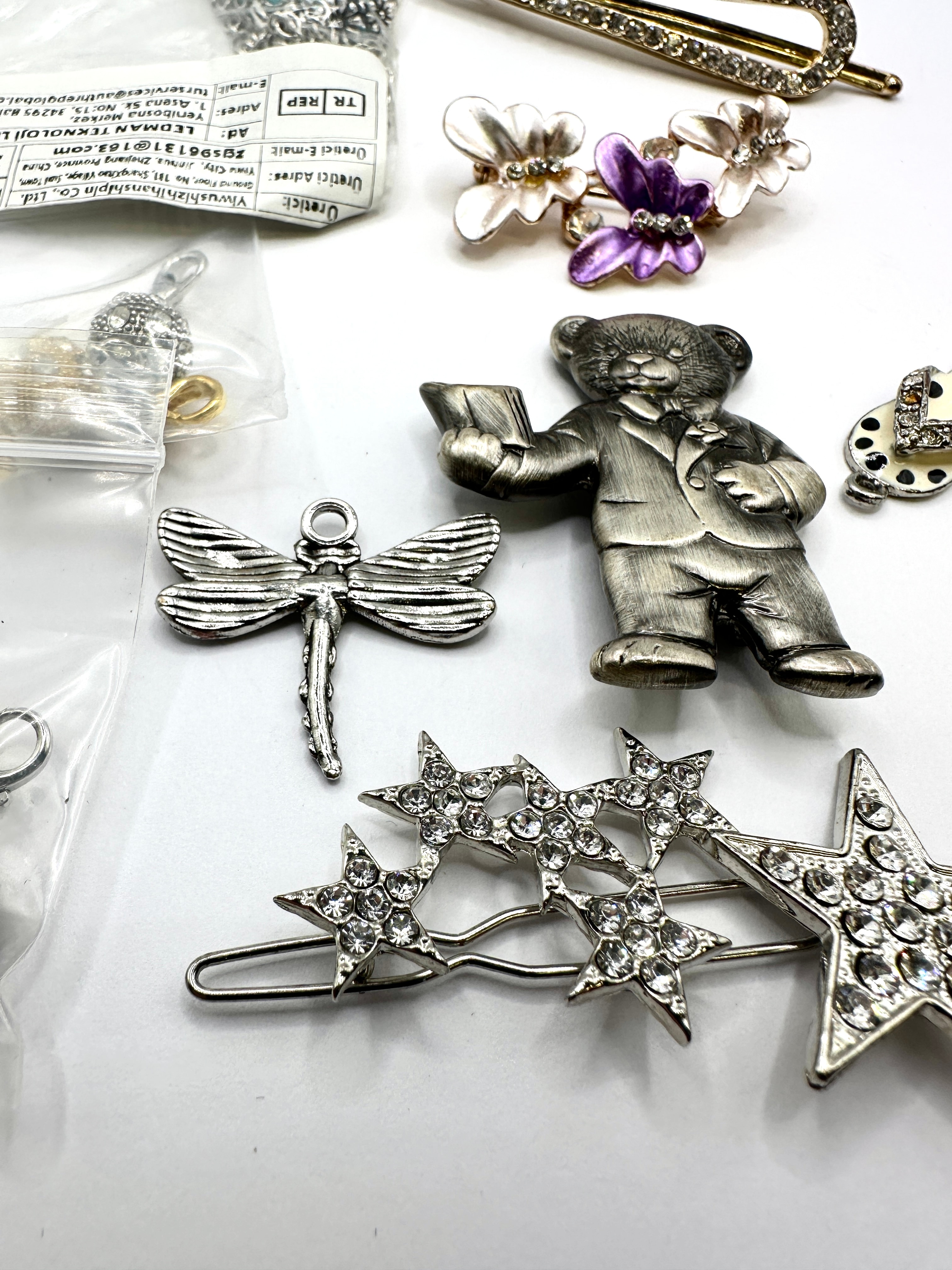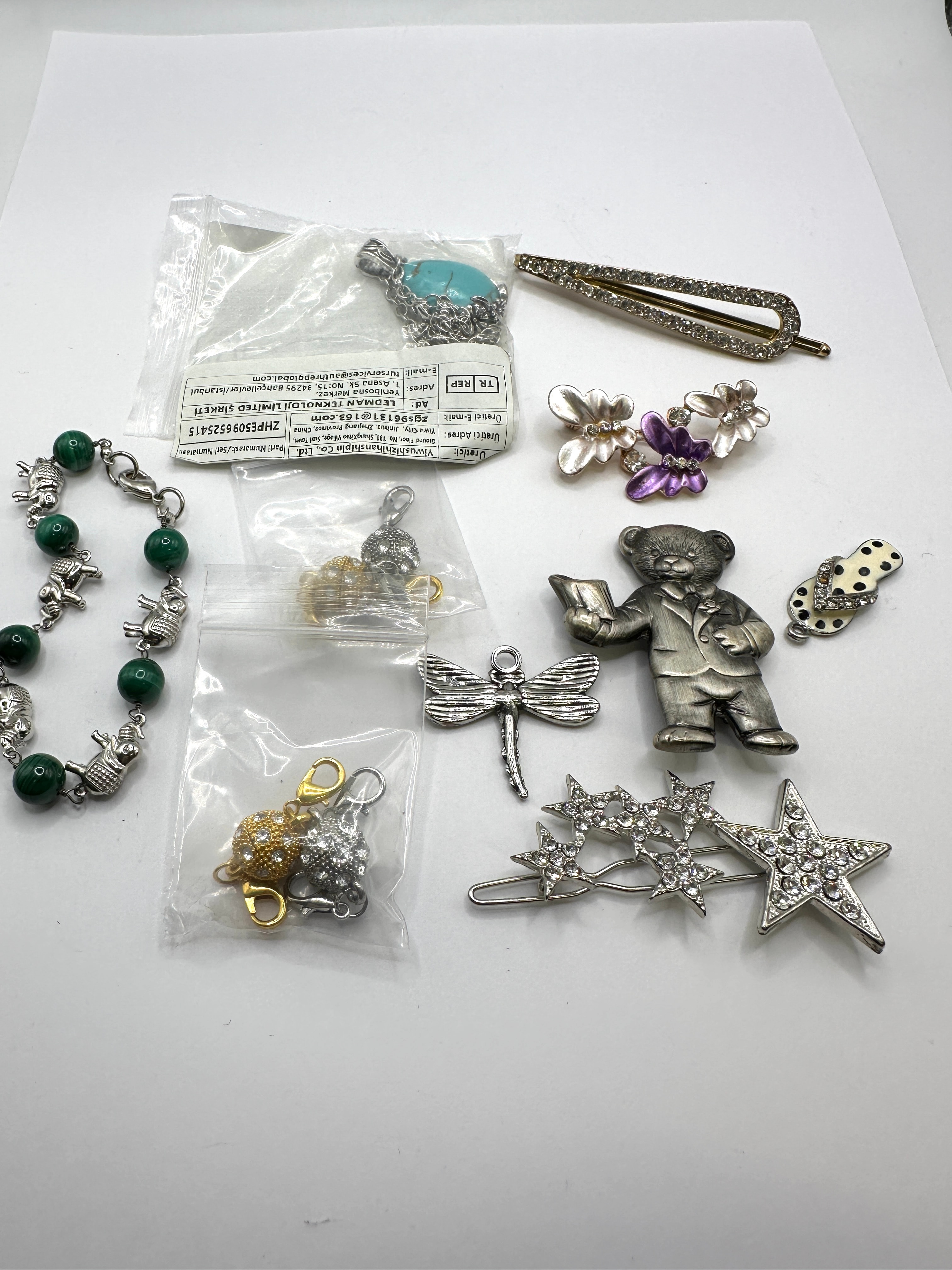 A collection of contemporary costume jewelry and findings, comprising a silver-tone bracelet with green spherical beads and elephant charms, and various hair clips/pins including one gold-tone barrette adorned with clear rhinestones, one silver-tone barrette with five clear rhinestone stars, and a floral motif pin with white, purple, and cream enamel details. Also included are several charms, pendants, and pins: a silver-tone teddy bear figure in a suit holding a book (likely a brooch), a silver-tone dragonfly, a small flip-flop sandal charm with white enamel and black polka dots, and a silver-tone pendant featuring a turquoise-colored oval stone on a chain. Additionally, two small bags contain pairs of spherical magnetic clasps/charms, one gold-tone and one silver-tone, both encrusted with clear rhinestones, and another bag contains general silver-tone jewelry findings. Packaging labels indicate the manufacturer as “Yiwushizhanshipin Co., Ltd.” in Yiwu City, Jinhua, Zhejiang Province, China, with a Turkish representative “LEOMAN TEKNOLOJI LIMITED ŞIRKETI” in Istanbul, and a batch/serial number Z H P E 5 0 9 6 5 2 5 4 1 5.