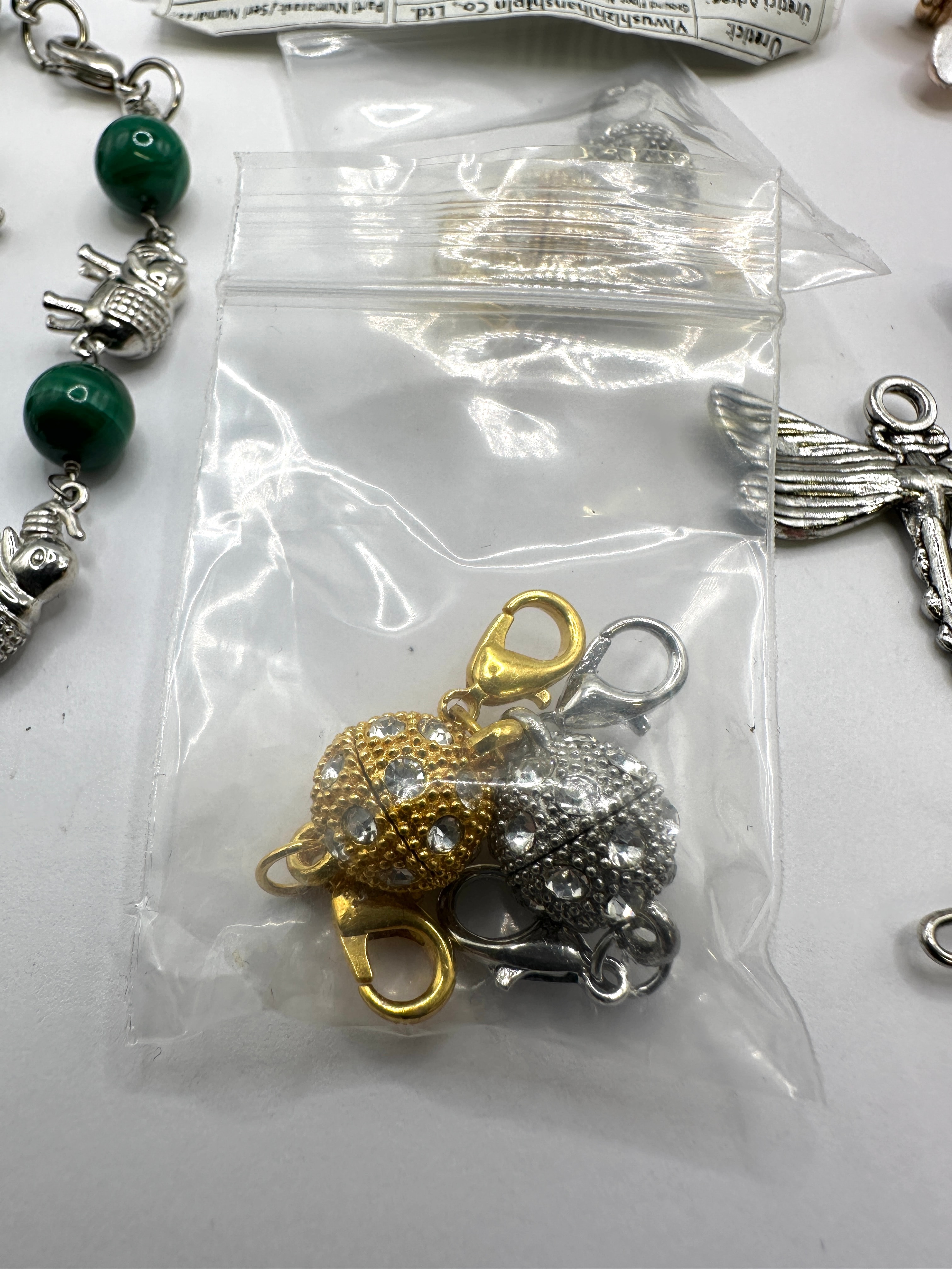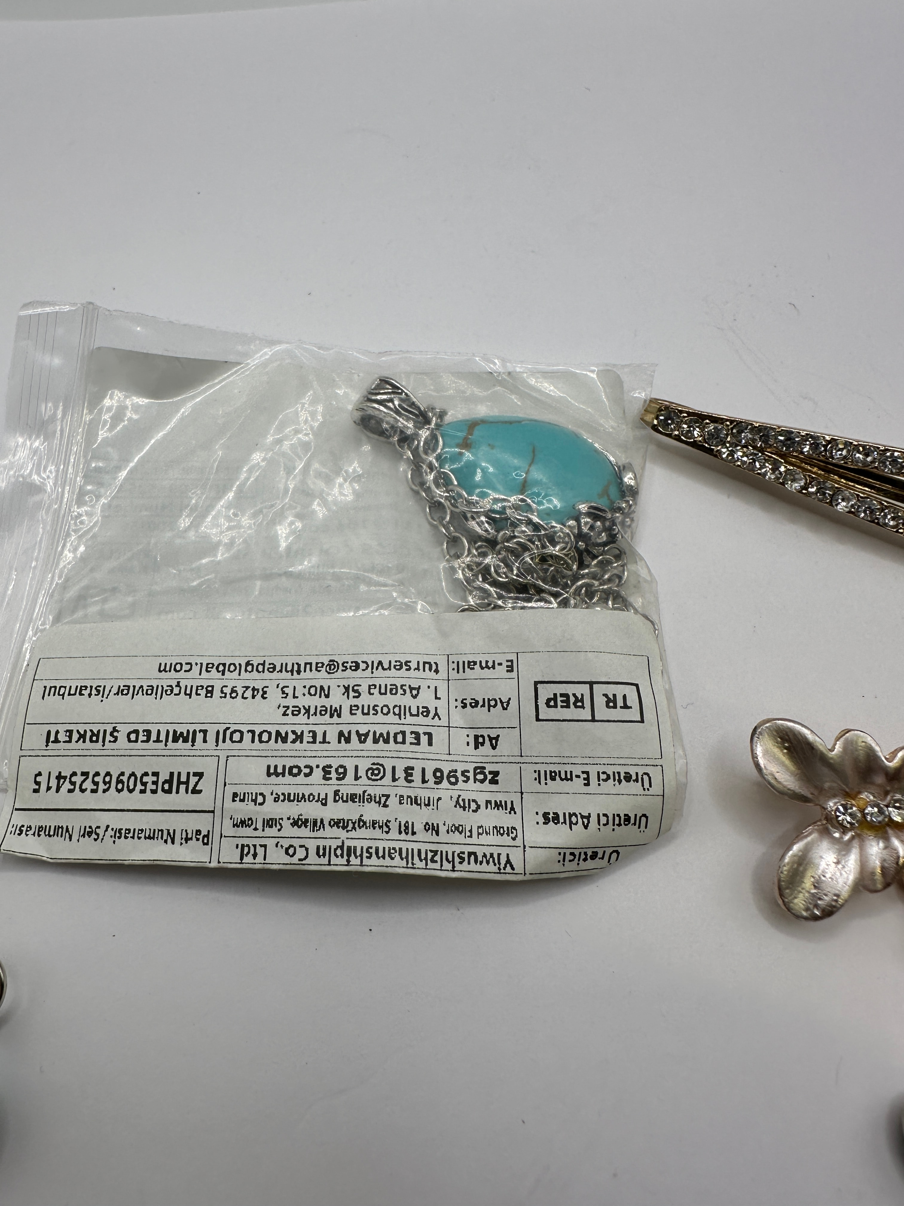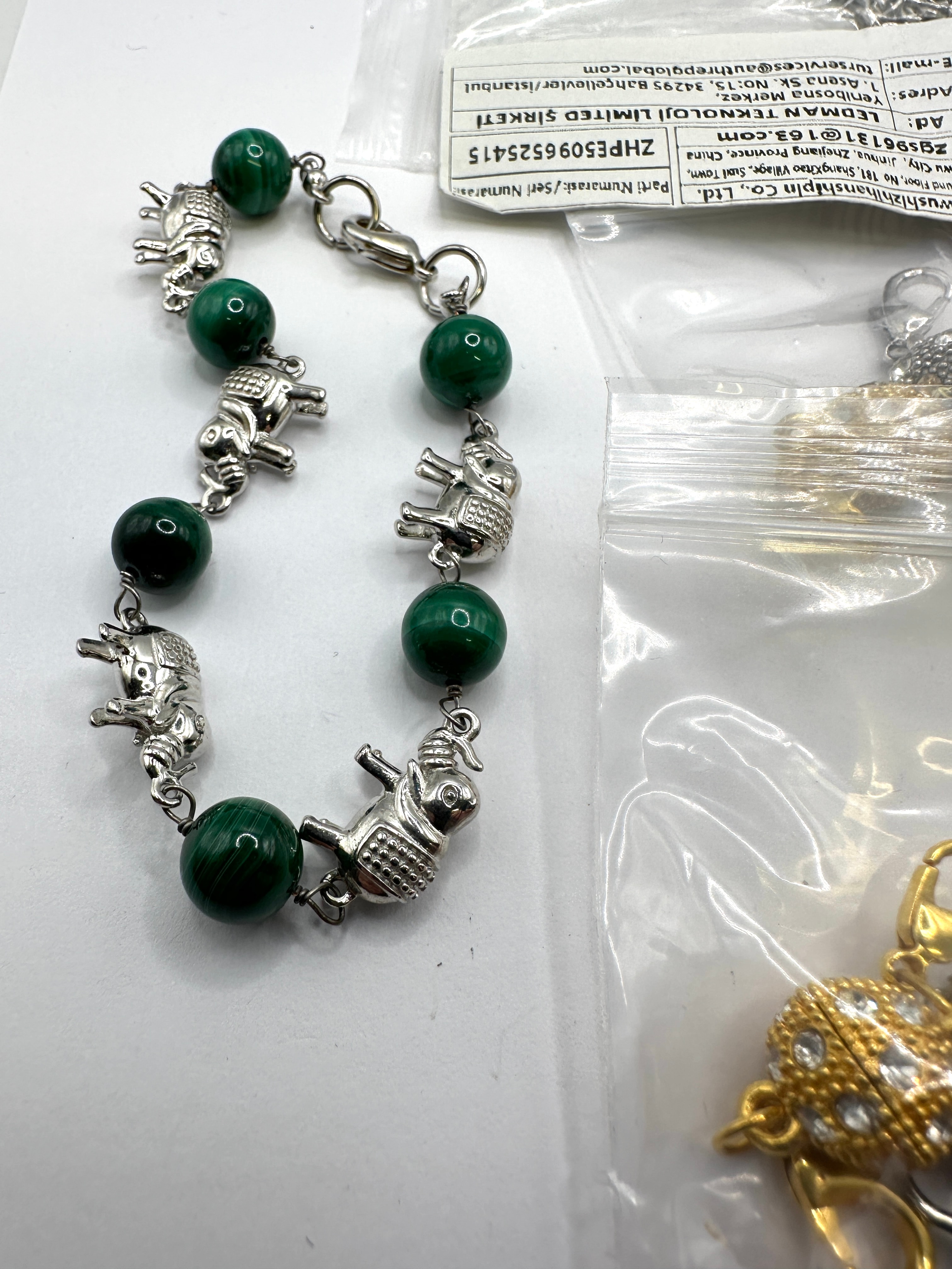 A collection of contemporary costume jewelry and findings, comprising a silver-tone bracelet with green spherical beads and elephant charms, and various hair clips/pins including one gold-tone barrette adorned with clear rhinestones, one silver-tone barrette with five clear rhinestone stars, and a floral motif pin with white, purple, and cream enamel details. Also included are several charms, pendants, and pins: a silver-tone teddy bear figure in a suit holding a book (likely a brooch), a silver-tone dragonfly, a small flip-flop sandal charm with white enamel and black polka dots, and a silver-tone pendant featuring a turquoise-colored oval stone on a chain. Additionally, two small bags contain pairs of spherical magnetic clasps/charms, one gold-tone and one silver-tone, both encrusted with clear rhinestones, and another bag contains general silver-tone jewelry findings. Packaging labels indicate the manufacturer as “Yiwushizhanshipin Co., Ltd.” in Yiwu City, Jinhua, Zhejiang Province, China, with a Turkish representative “LEOMAN TEKNOLOJI LIMITED ŞIRKETI” in Istanbul, and a batch/serial number Z H P E 5 0 9 6 5 2 5 4 1 5.