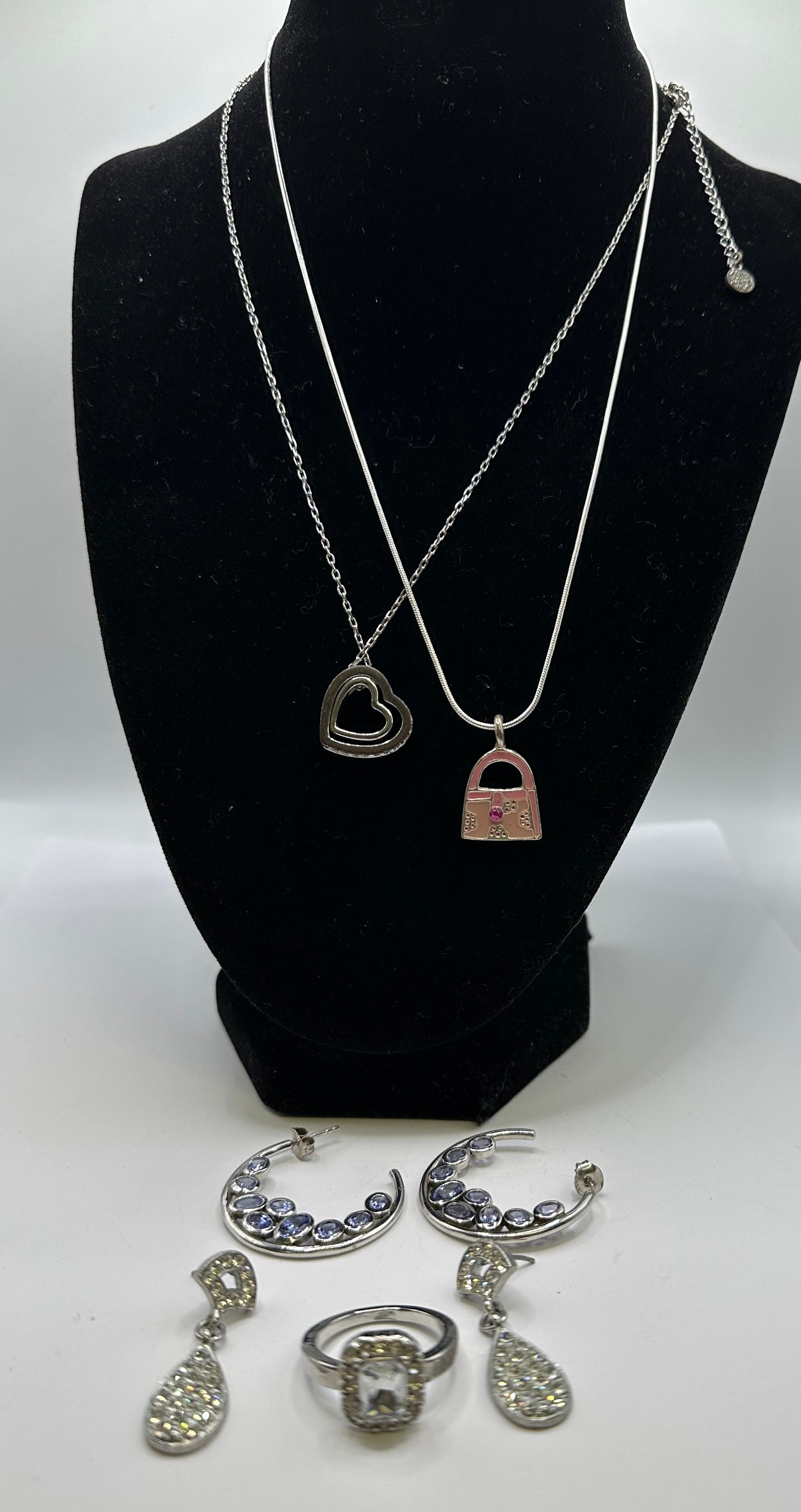 A Michael Kors silver-tone double-heart pendant necklace on a delicate chain, and a Michael Kors silver-tone snake chain necklace featuring a pink enamel handbag-shaped pendant detailed with small clear simulated stones and minute stylized text, possibly “Paris”. A small “C” mark is visible on the clasp of the snake chain. This collection also includes two pairs of silver-tone earrings: crescent-shaped hoops set with purple-hued simulated stones, and dangle earrings with pave-set clear simulated stones forming a teardrop design. Completing the ensemble is a silver-tone ring featuring a central rectangular-cut clear simulated stone surrounded by a halo of smaller clear simulated stones. All items are crafted in silver-tone metal and adorned with clear and purple-hued simulated stones.