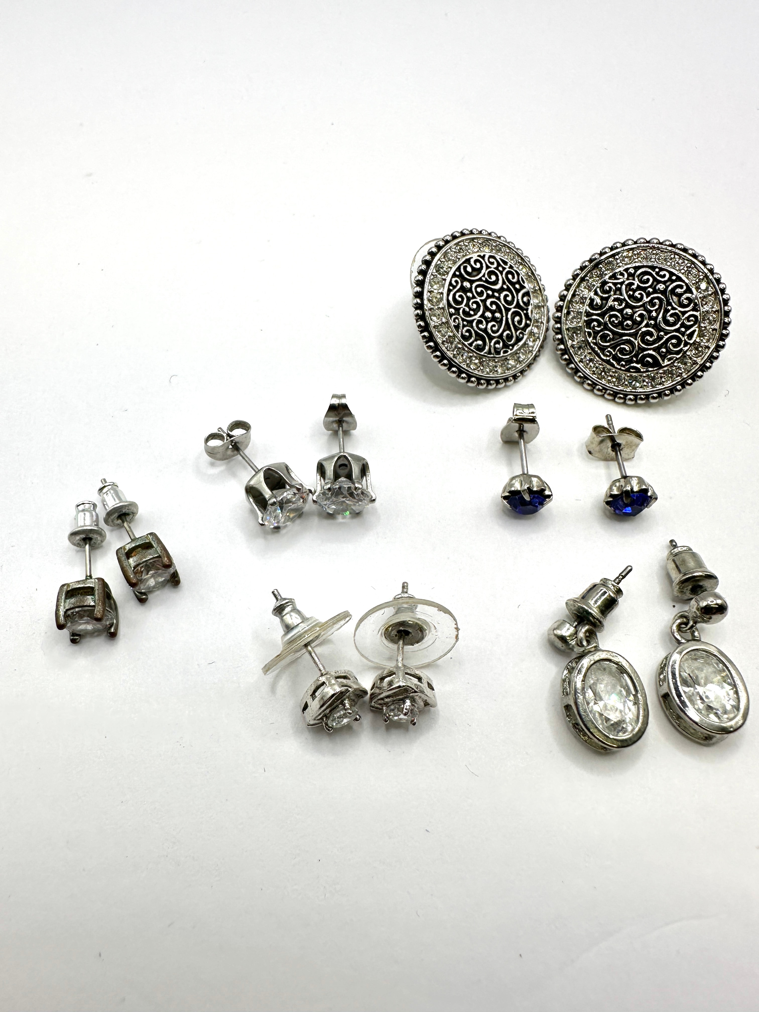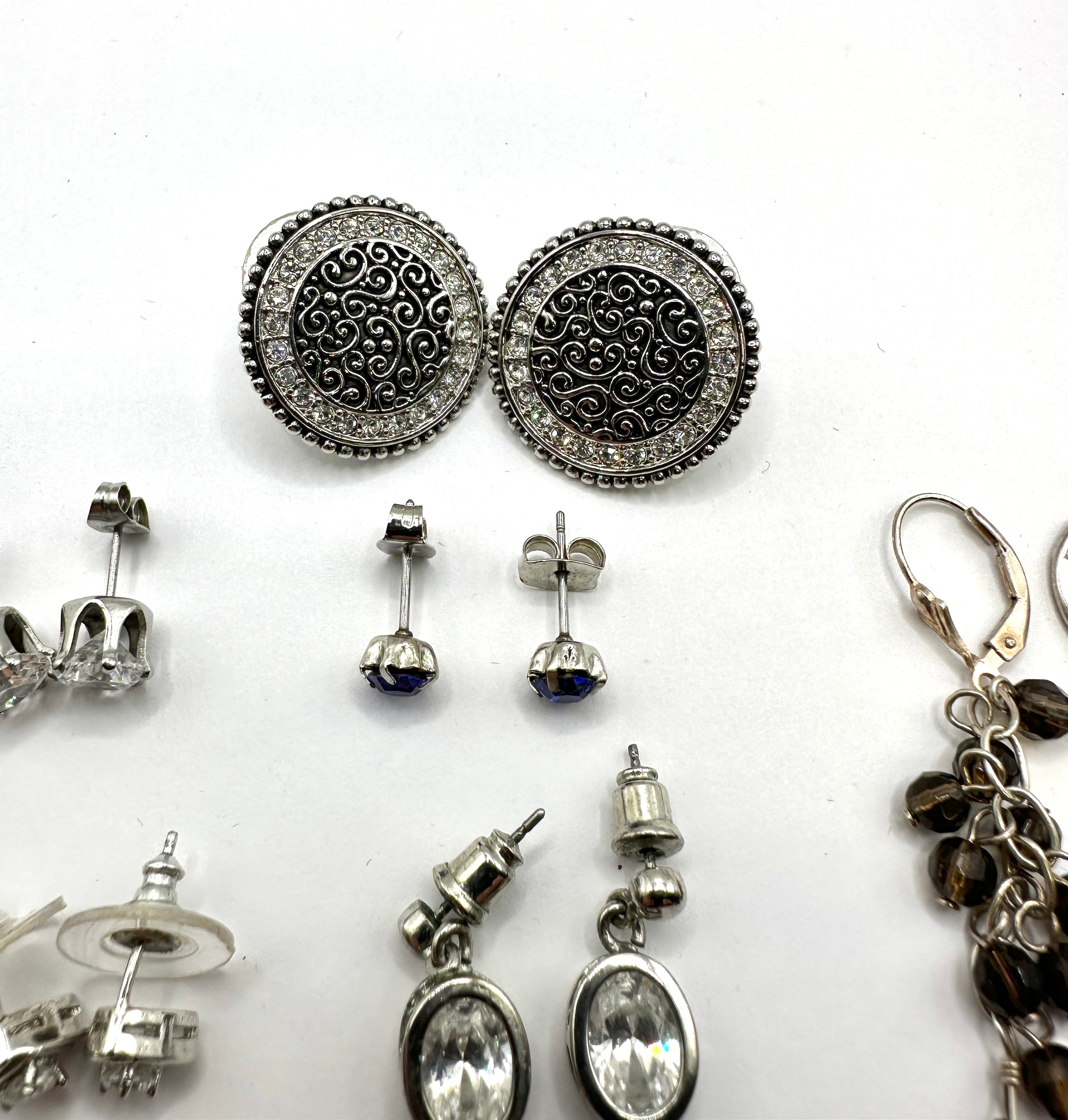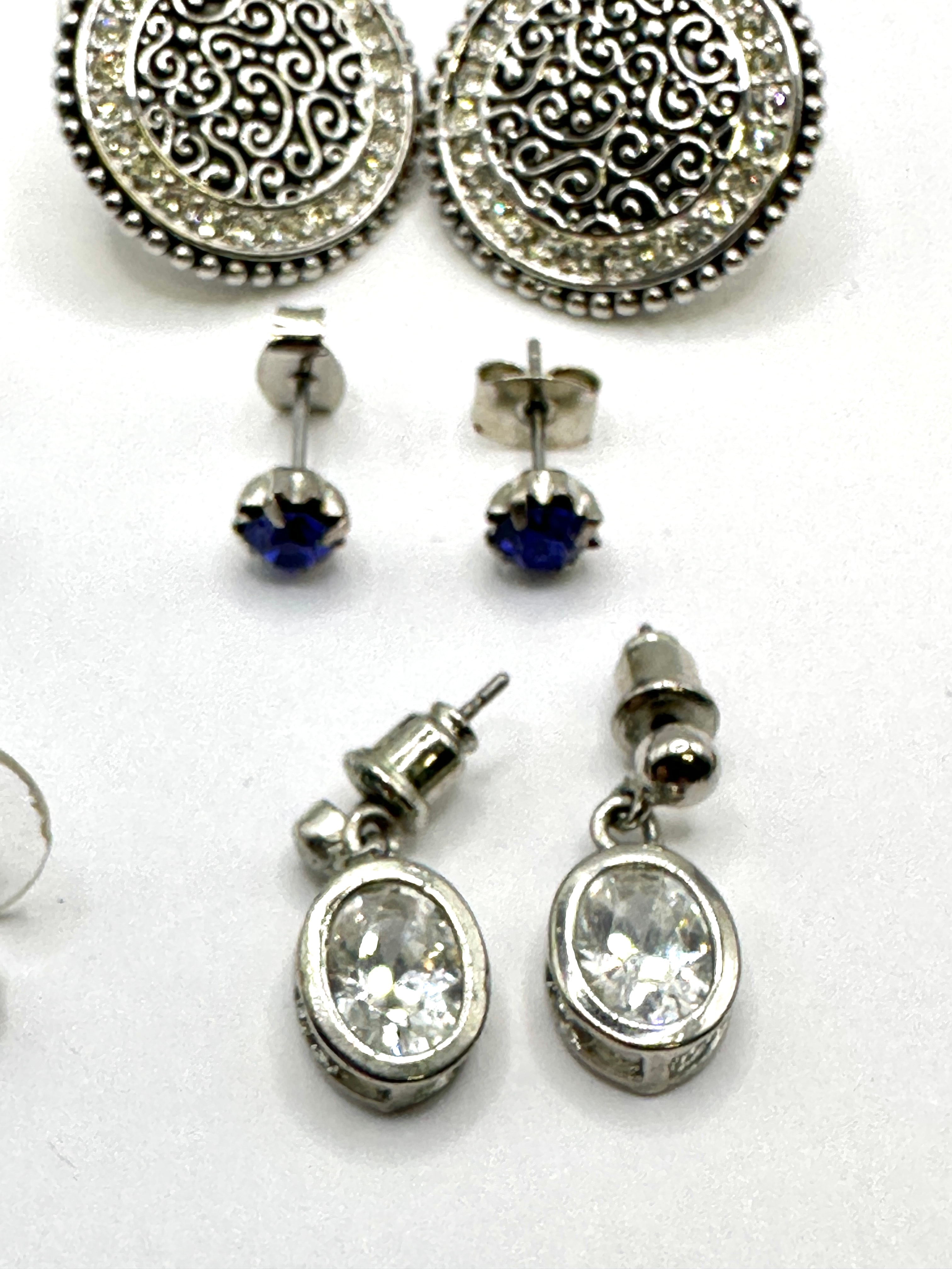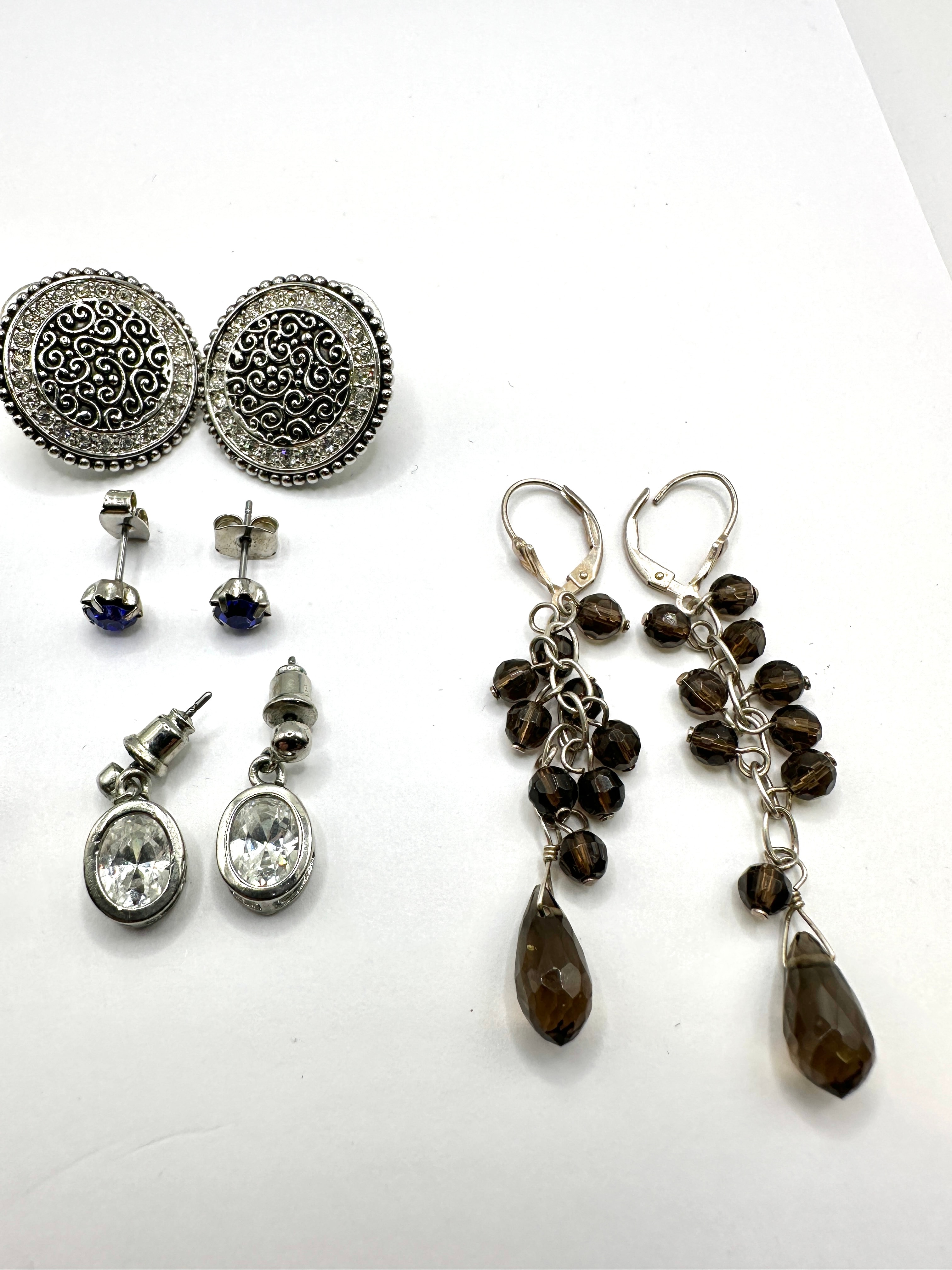 A collection of six pairs of assorted fashion earrings. This lot comprises one large pair of circular earrings featuring an ornate black enamel scrollwork design encircled by clear rhinestones and a beaded border. Also present are one pair of small round blue rhinestone stud earrings, one pair of oval clear rhinestone drop earrings, and two additional pairs of clear rhinestone stud earrings, one with plastic backings. The final pair consists of long dangle earrings with lever-back closures, adorned with clusters of small faceted dark brown beads culminating in a larger faceted dark brown teardrop-shaped bead. The earrings are predominantly crafted from silver-tone metal. No discernible manufacturer’s marks, hallmarks, or text are visible on any pieces.