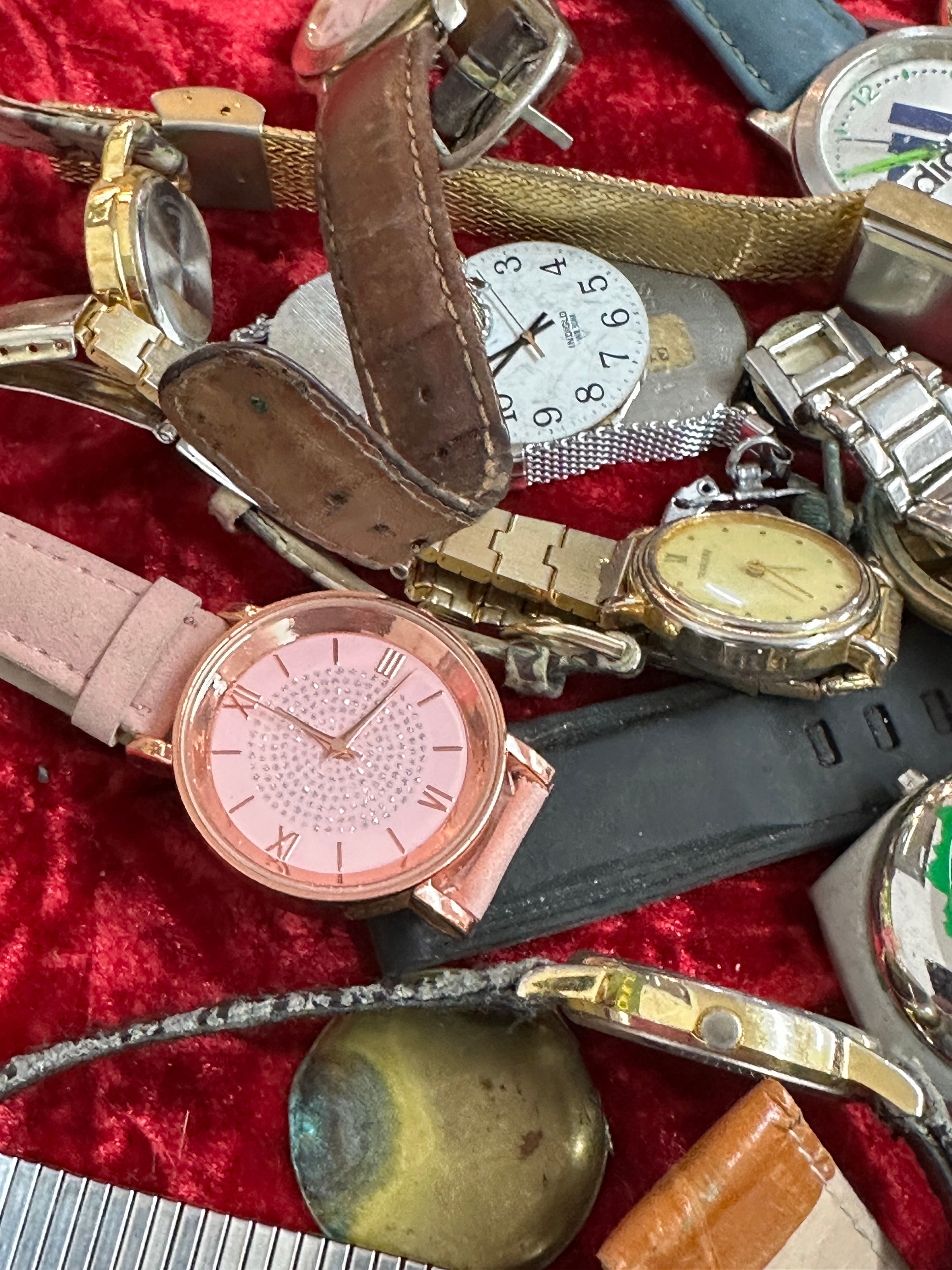 A large collection of approximately 30-40 wristwatches, encompassing a variety of styles, materials, and designs, likely spanning from the late 20th century to contemporary periods. The lot includes both analog and at least one digital watch, with cases and bracelets made from various metals (silver-tone, gold-tone) and straps from leather and synthetic materials. Visible brand names include “adidas” (on multiple watches), “GUCCI” (on a rectangular silver-tone watch), and “RIDER” (on a gold-tone watch), while one digital watch also displays “MODERN DATE.” Dials vary, featuring Arabic or Roman numerals, and some include decorative elements like crystals on a pink-faced watch.