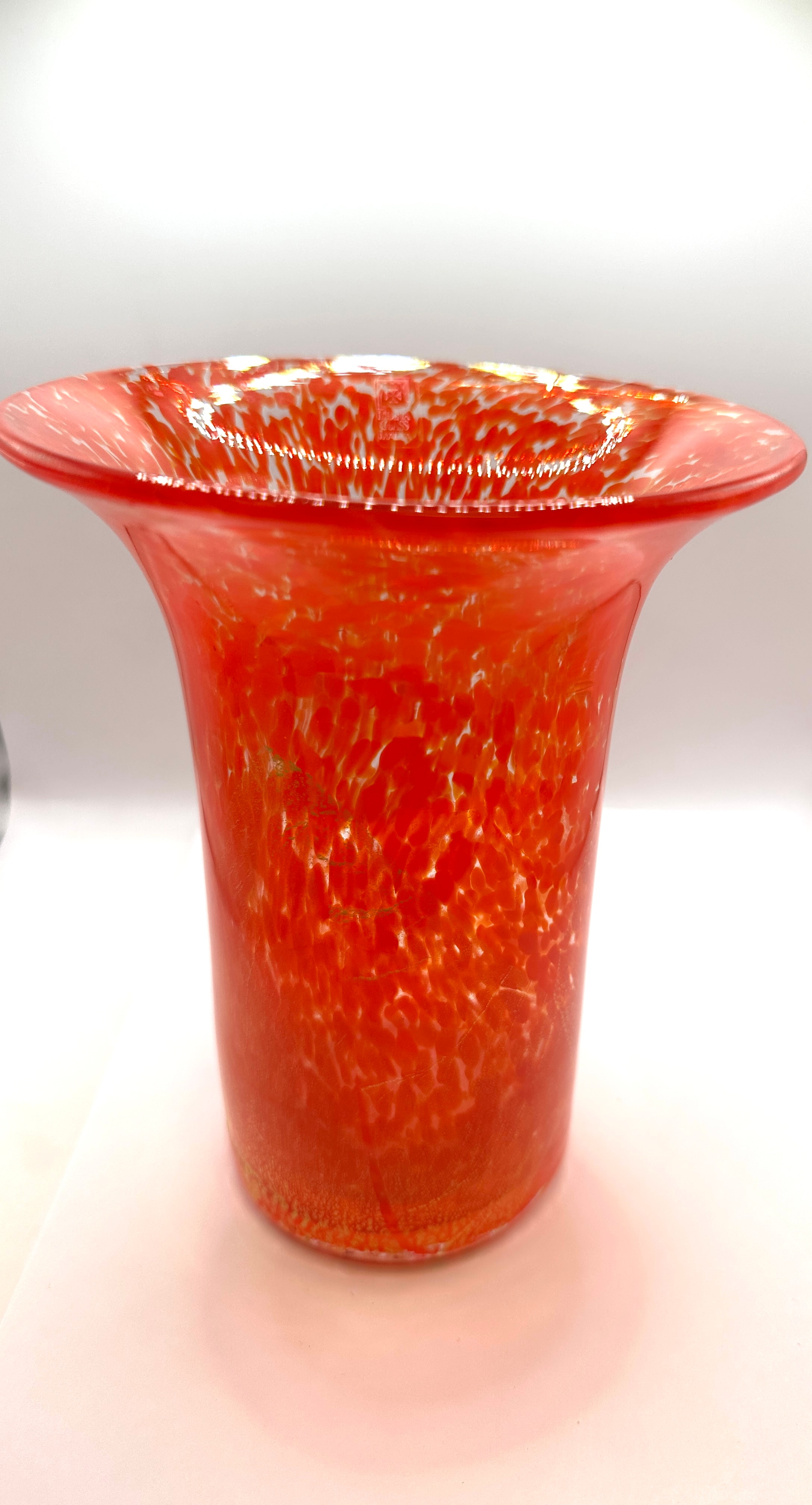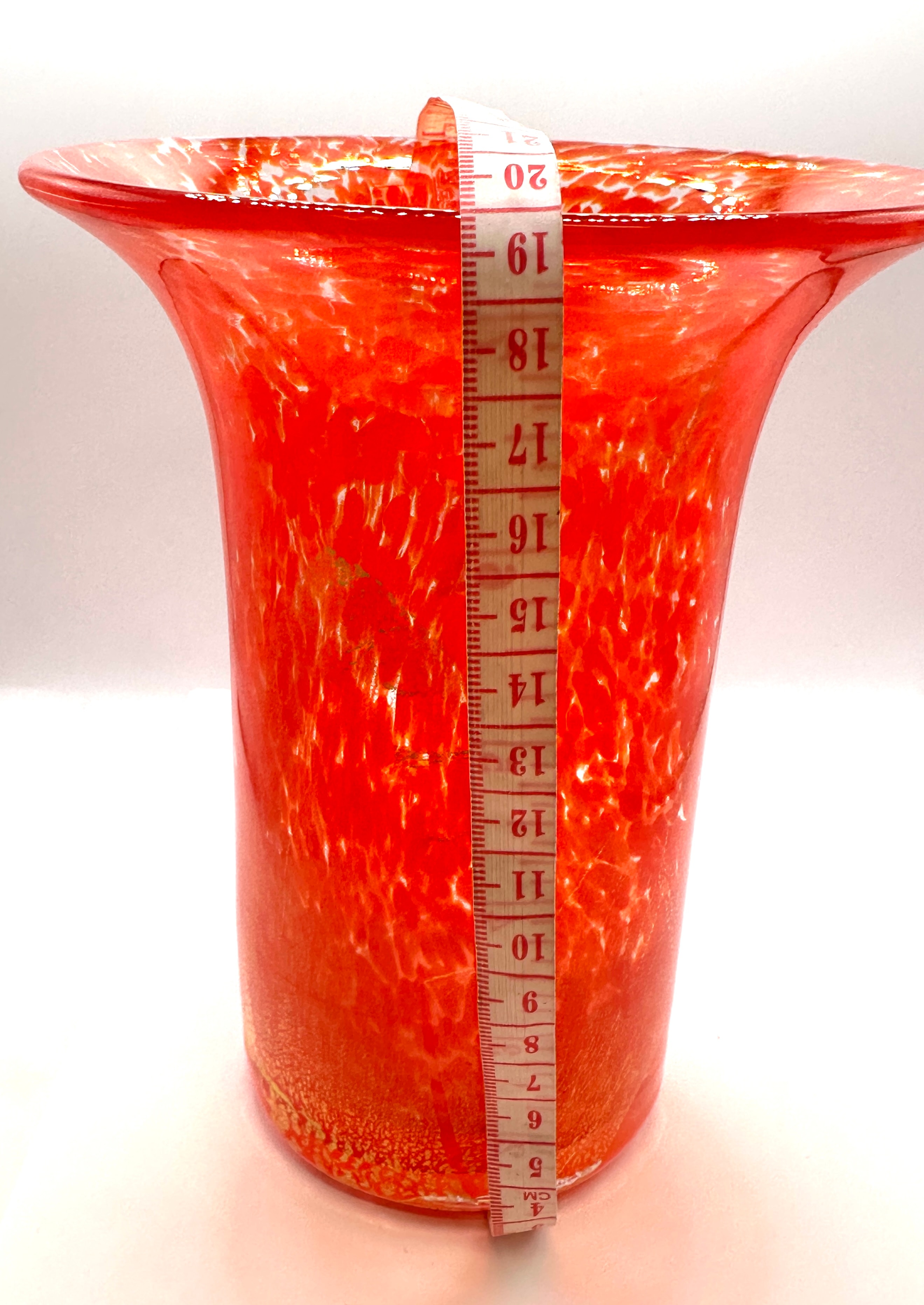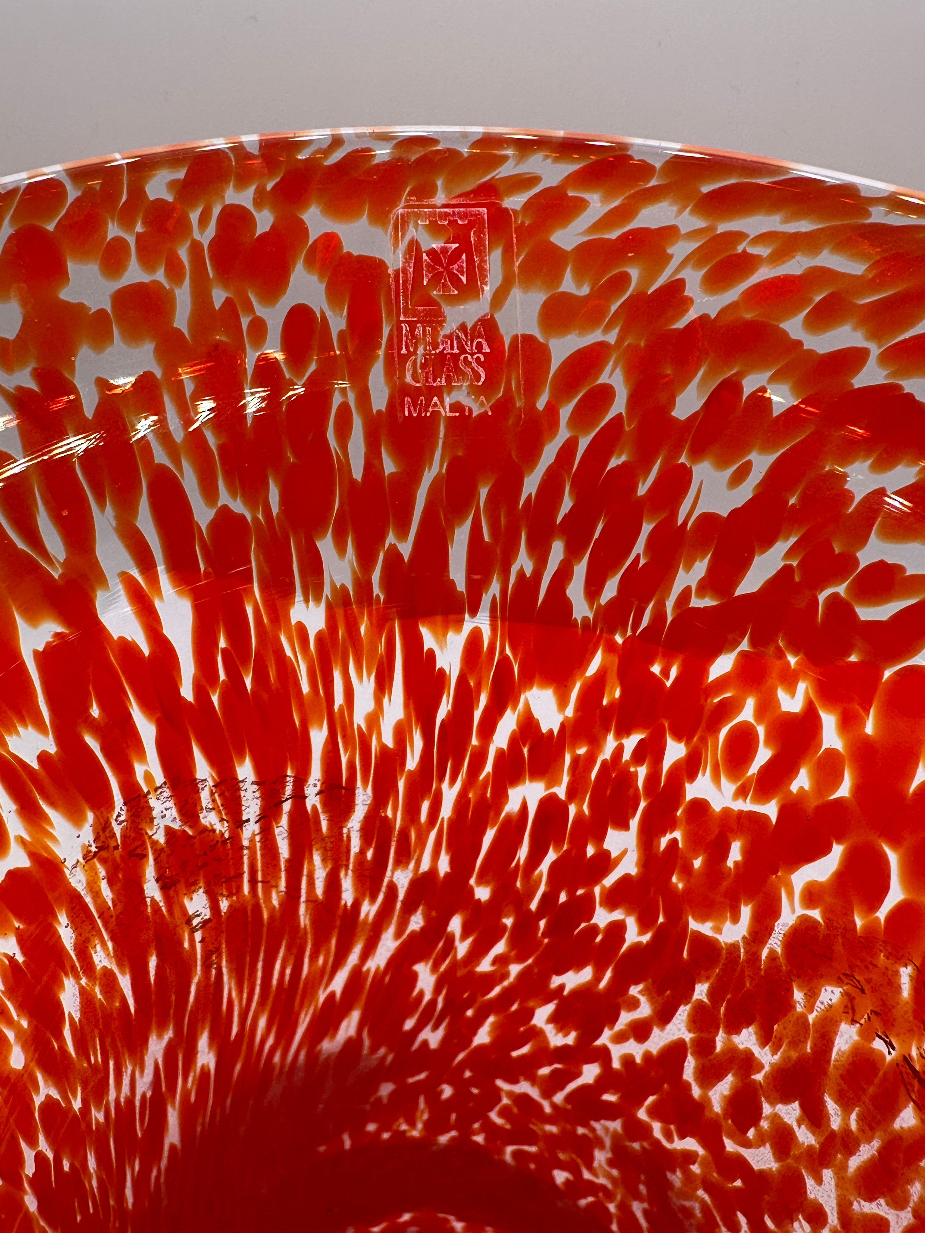 A Mdina Glass art glass vase, crafted in Malta. The vessel features a vibrant orange-red body infused with a distinct white frit or speckle pattern throughout its surface. It has a wide, flared rim that tapers down to a cylindrical body. The interior rim is etched with the clear markings ‘MDINA GLASS’ above a Maltese cross logo, with ‘MALTA’ below, confirming its origin.