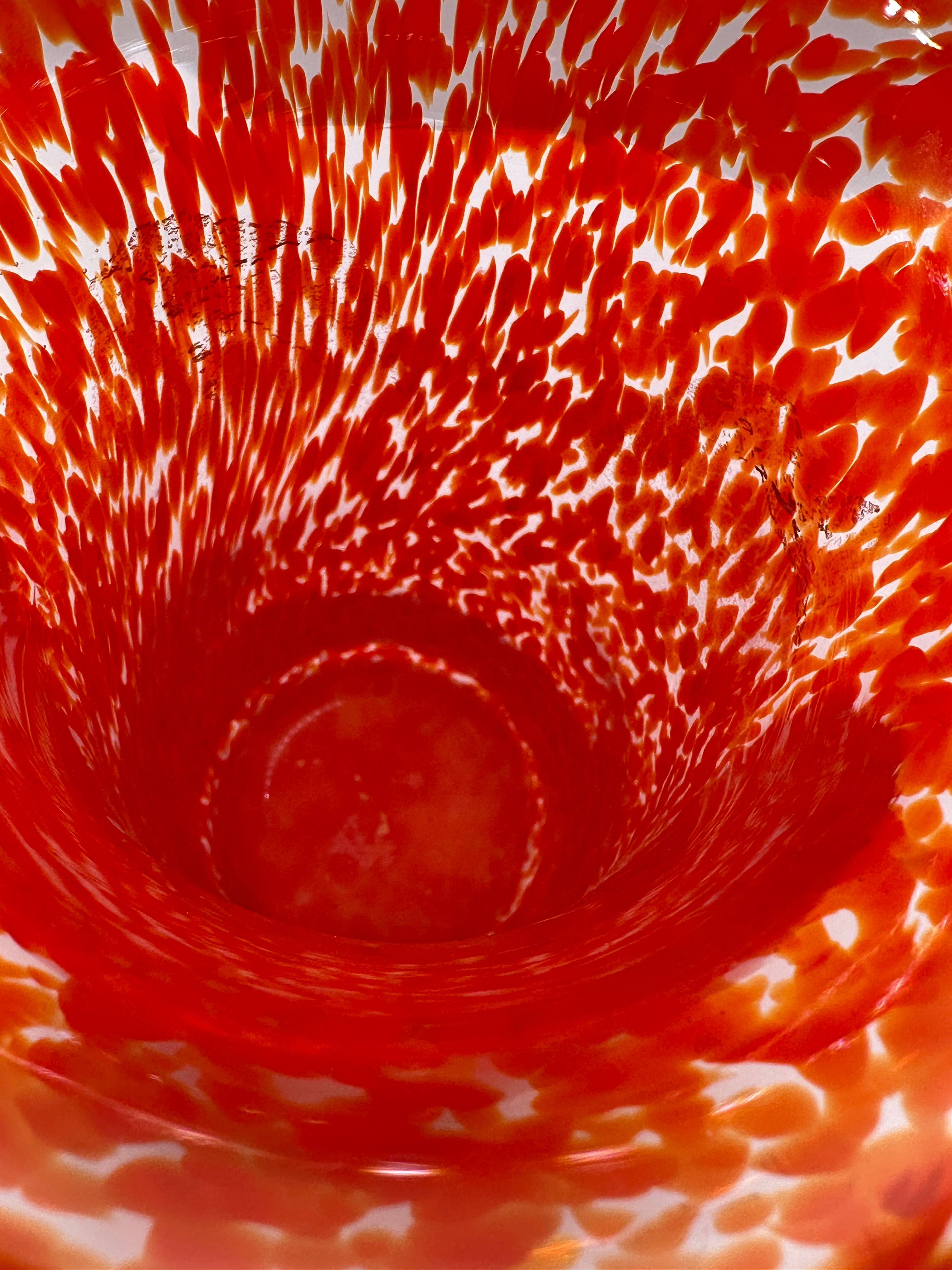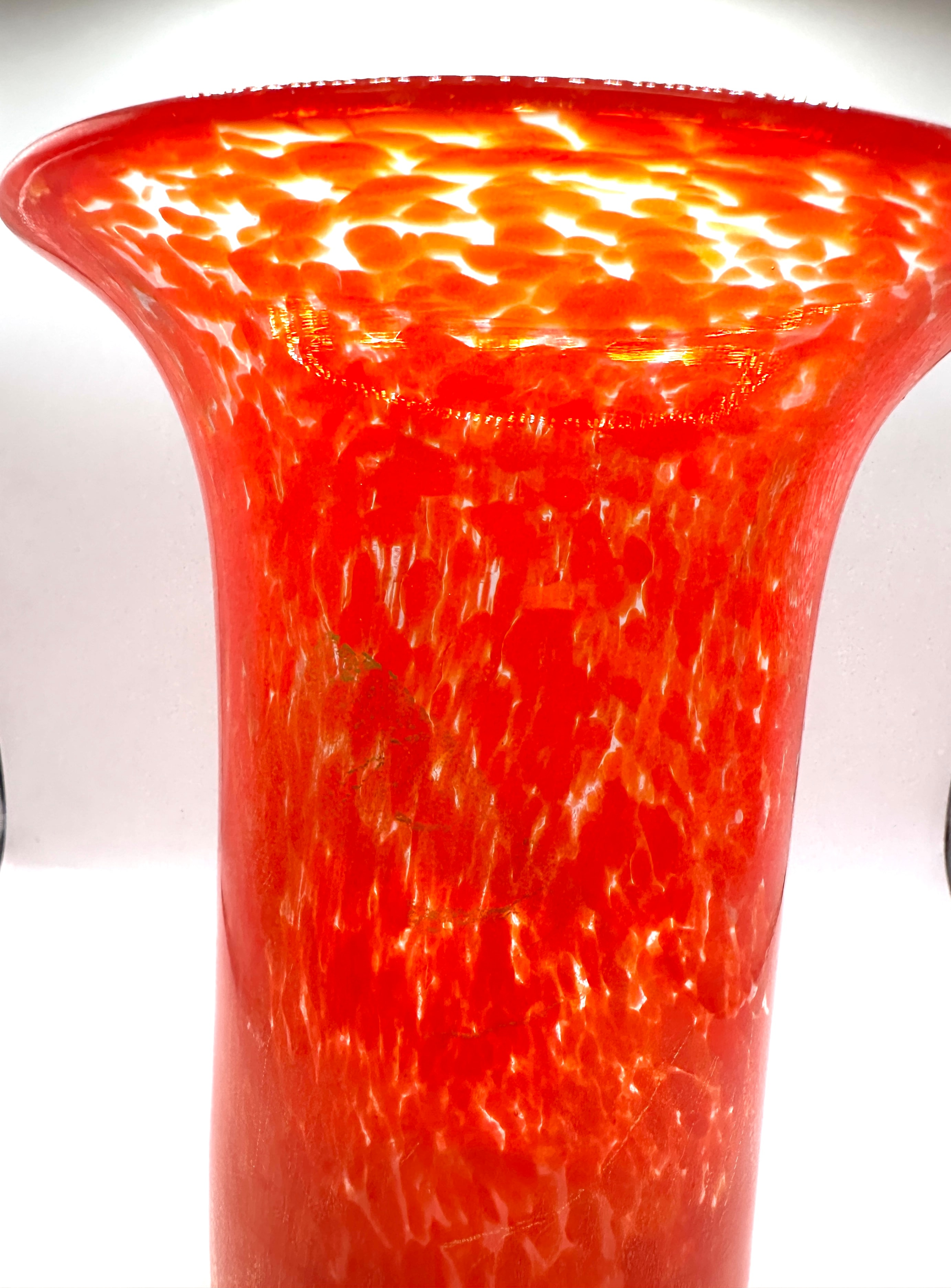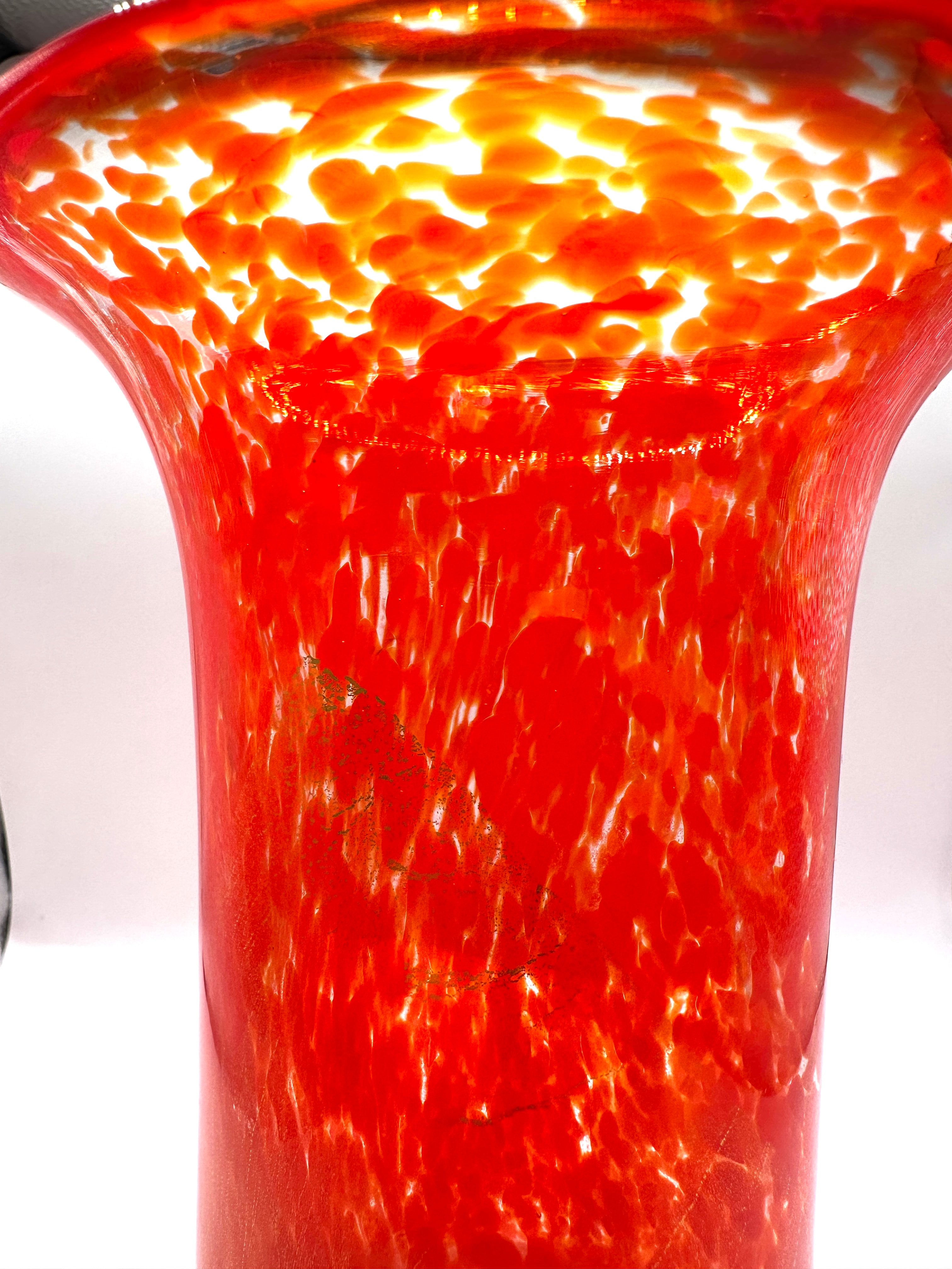 A Mdina Glass art glass vase, crafted in Malta. The vessel features a vibrant orange-red body infused with a distinct white frit or speckle pattern throughout its surface. It has a wide, flared rim that tapers down to a cylindrical body. The interior rim is etched with the clear markings ‘MDINA GLASS’ above a Maltese cross logo, with ‘MALTA’ below, confirming its origin.