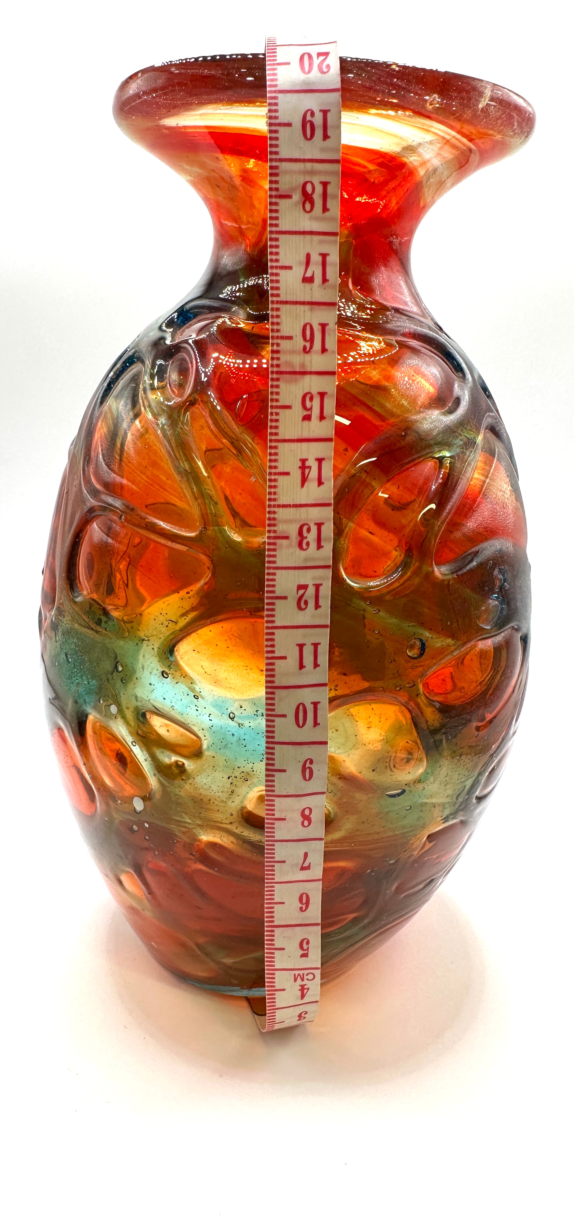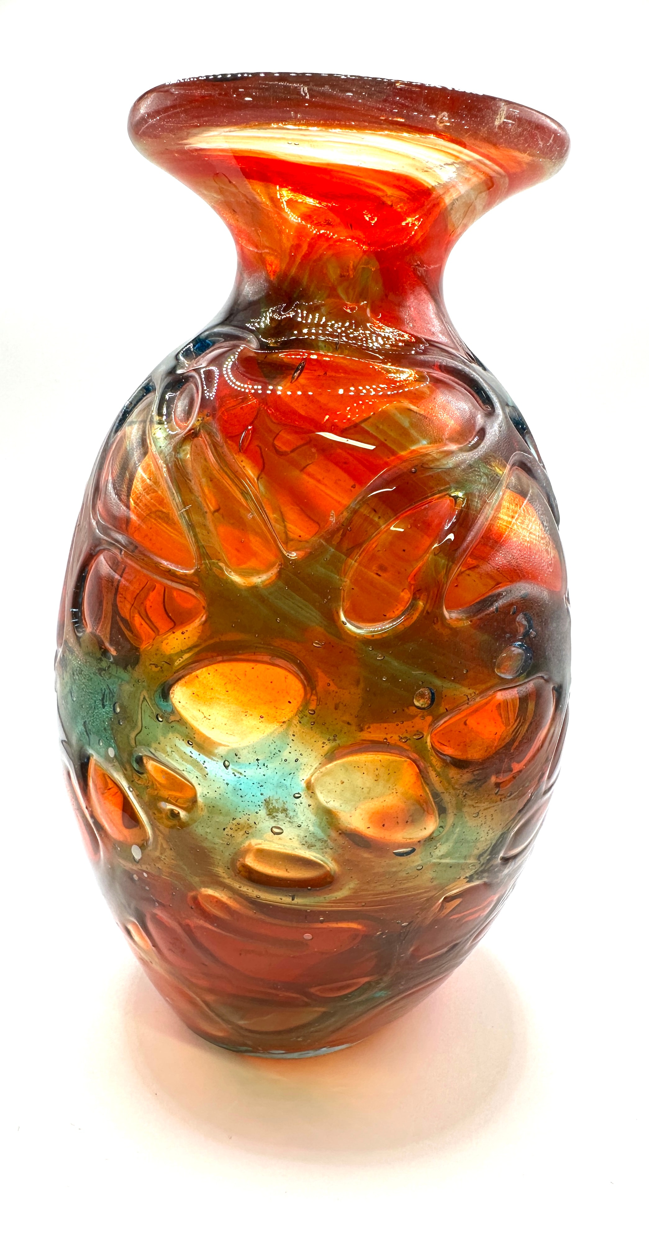 A Mdina art glass vase, featuring a globular body that tapers to a flared rim. Constructed from blown glass, it showcases vibrant, swirling colors of deep red, orange, and amber intermingled with areas of teal and blue. The surface is extensively textured with an applied or layered pattern of irregular, overlapping oval-shaped reliefs, consistent with Mdina’s ‘strap work’ design.