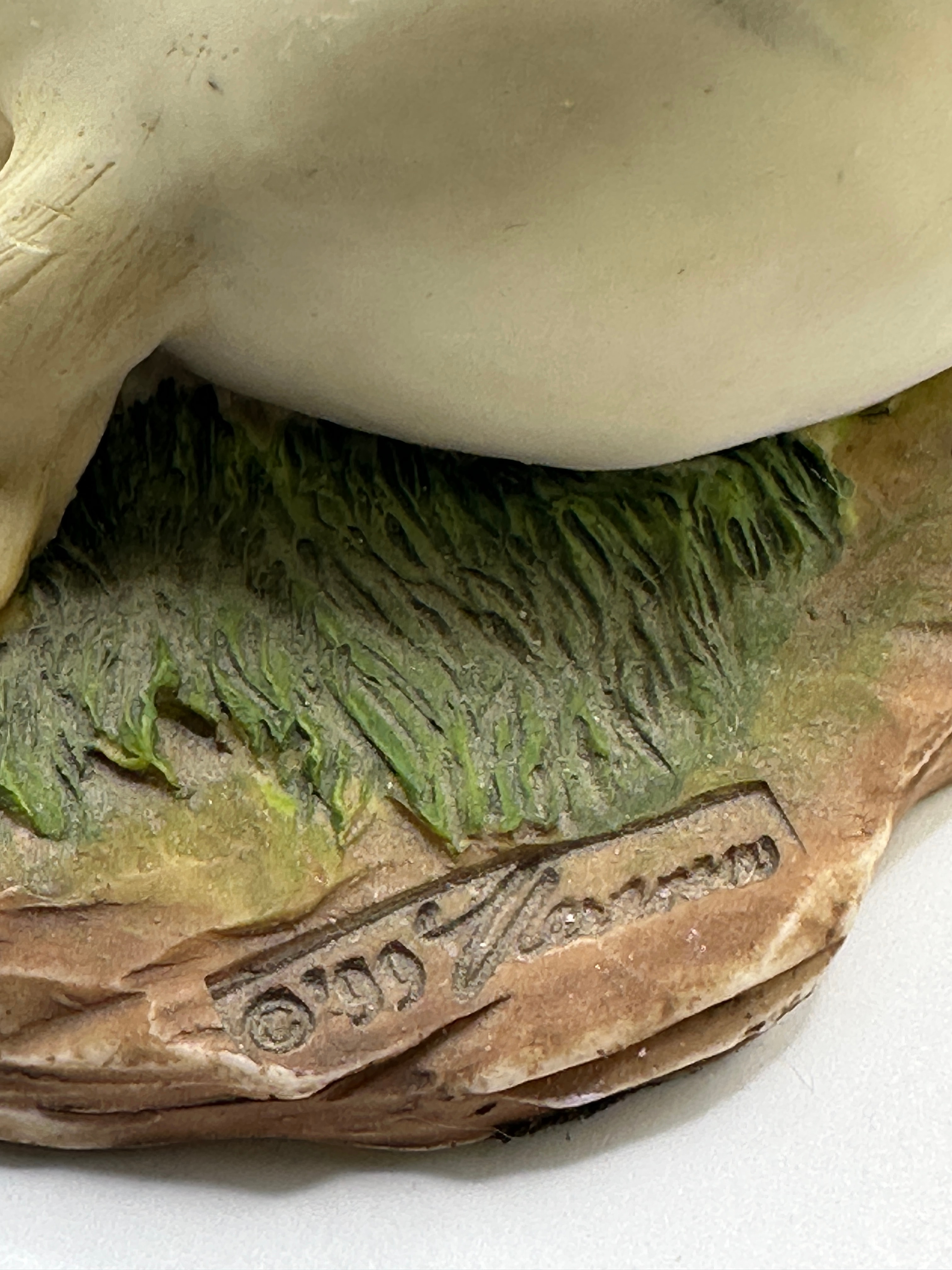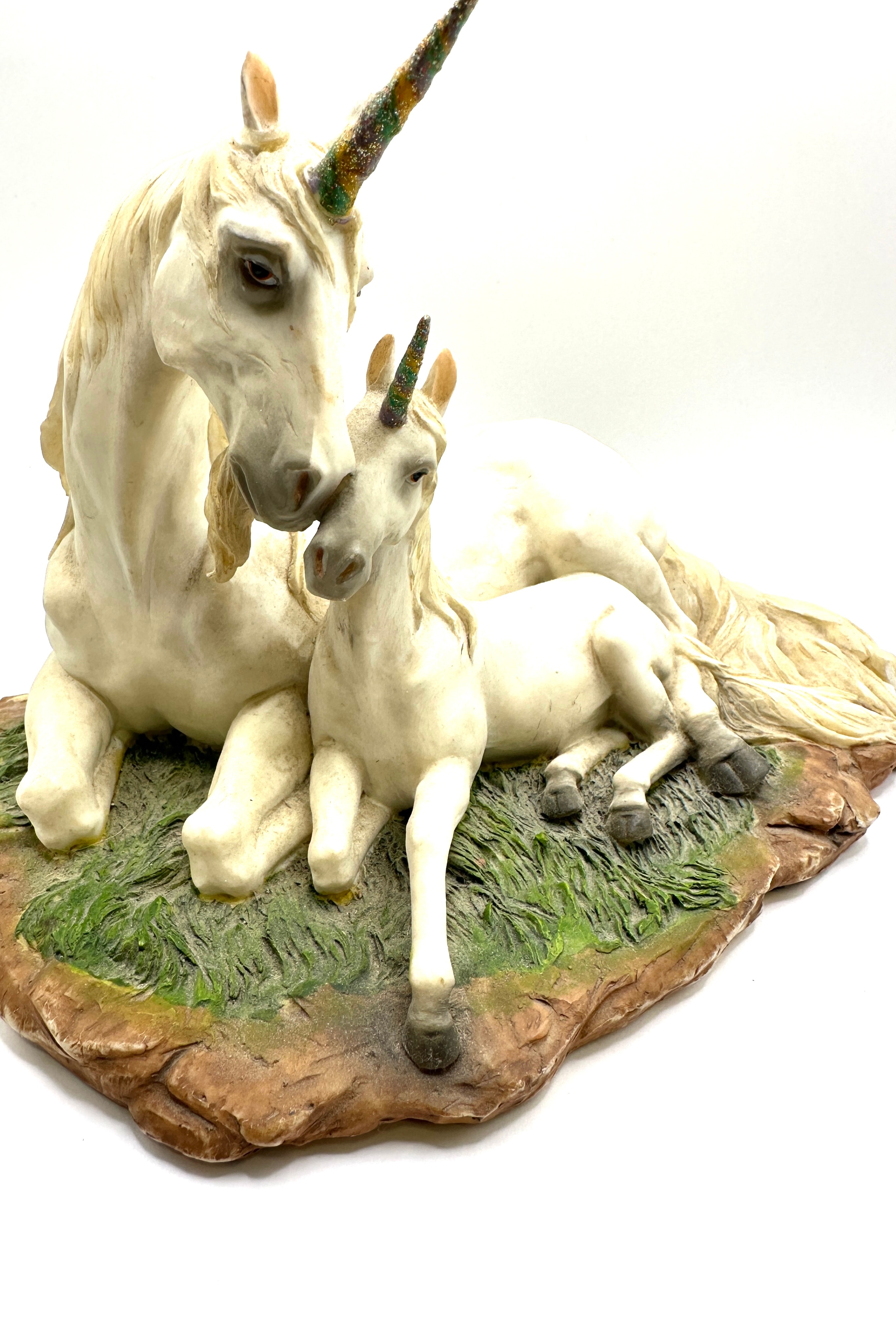 A resin figurine from the Summit Collection, depicting an adult unicorn and a foal nestled together on a naturalistic base, designed by L. Vanacore and dated 1999. The piece is cast from resin, exhibiting an off-white, matte finish for the unicorns, complemented by iridescent glitter on their horns. The base depicts grass and rock formations in muted green and brown tones. An embossed copyright mark, “© ’99”, and a signature reading “L. Vanacore” are visible on the base.