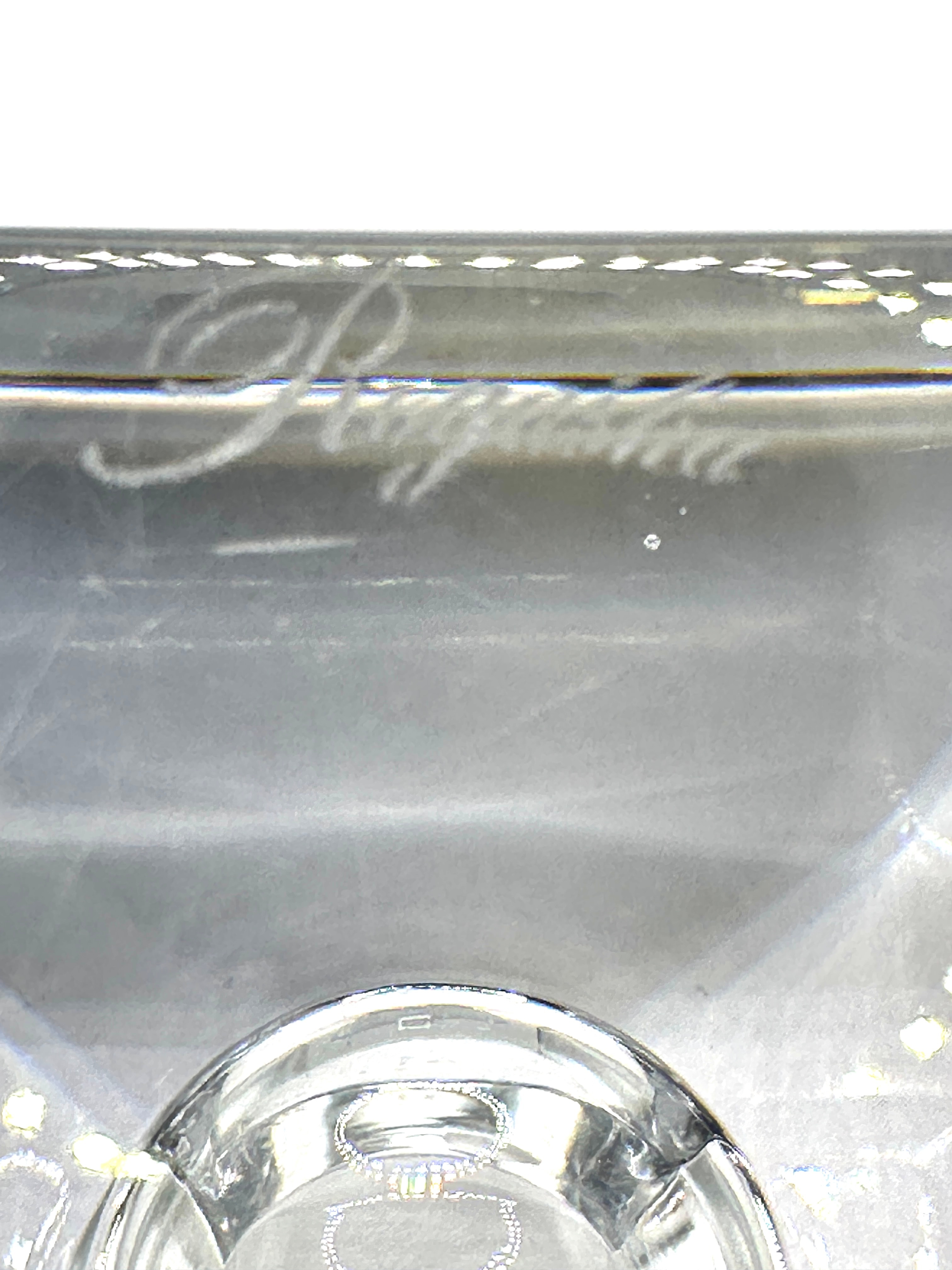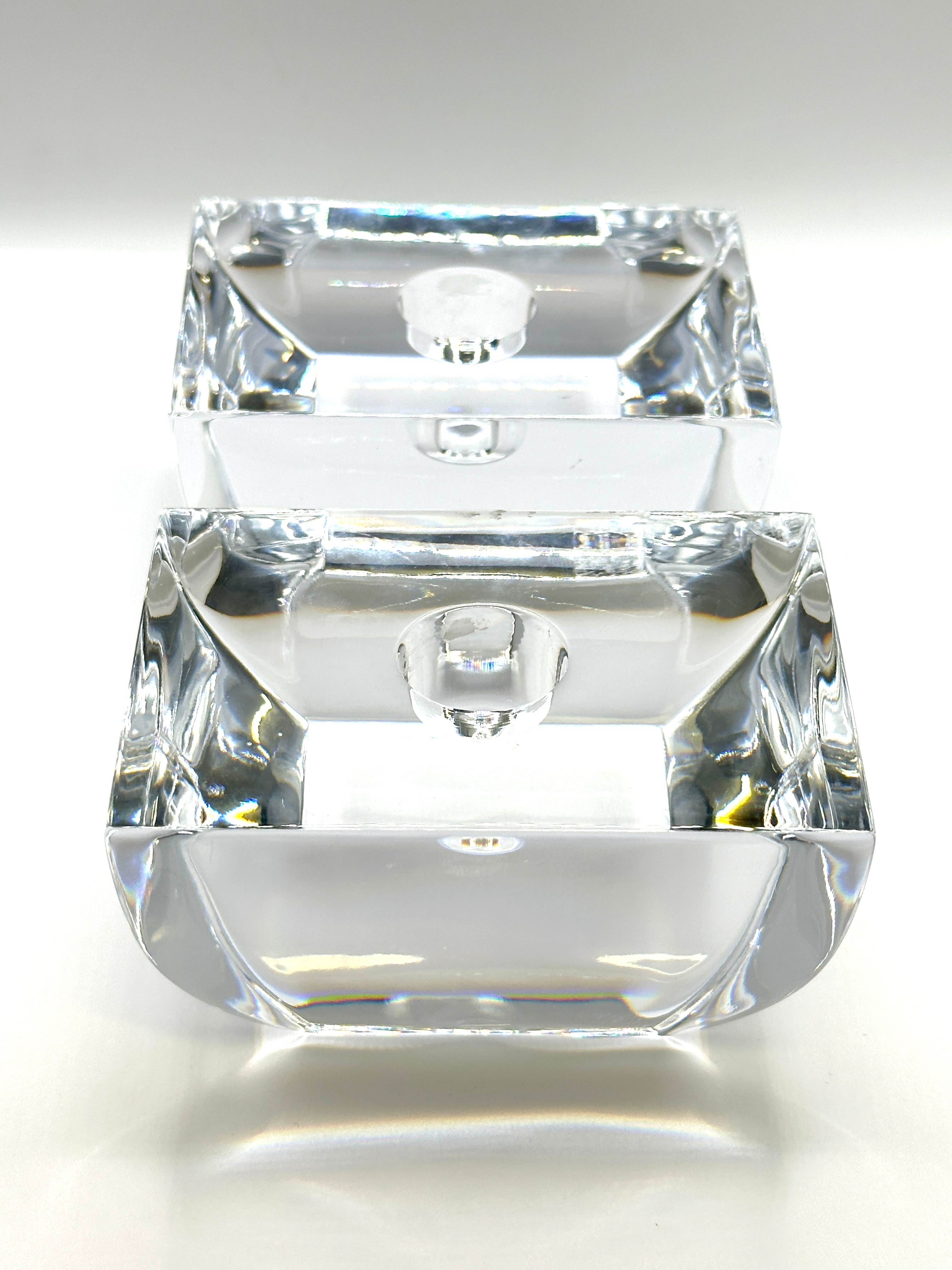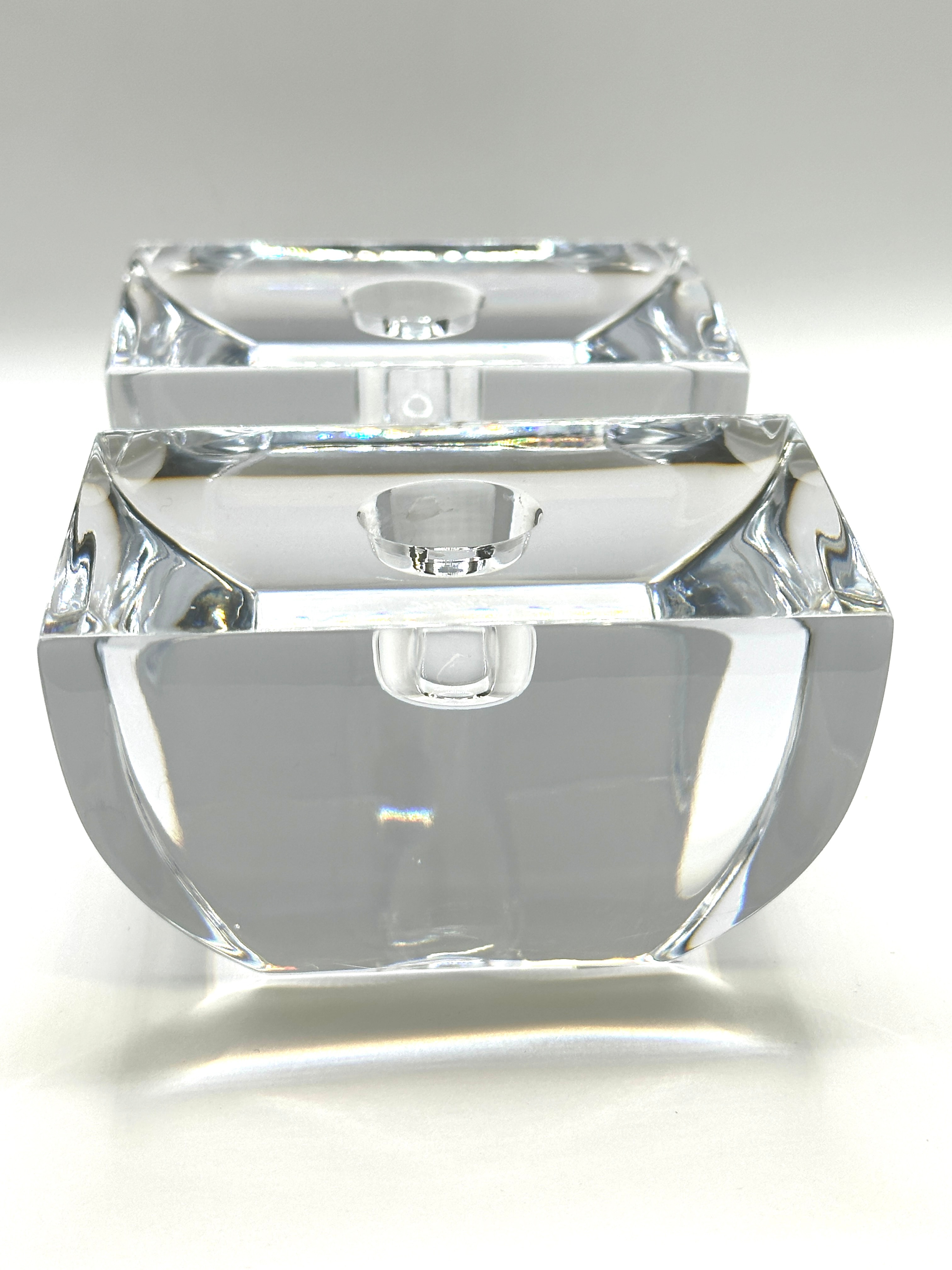 A pair of clear, colorless crystal tea light or votive candle holders, distinguished by their modern, geometric design featuring faceted sides and a substantial, polished square form with a central circular indentation. One of the pieces bears a visible etched ‘Baccarat’ signature on its upper surface.