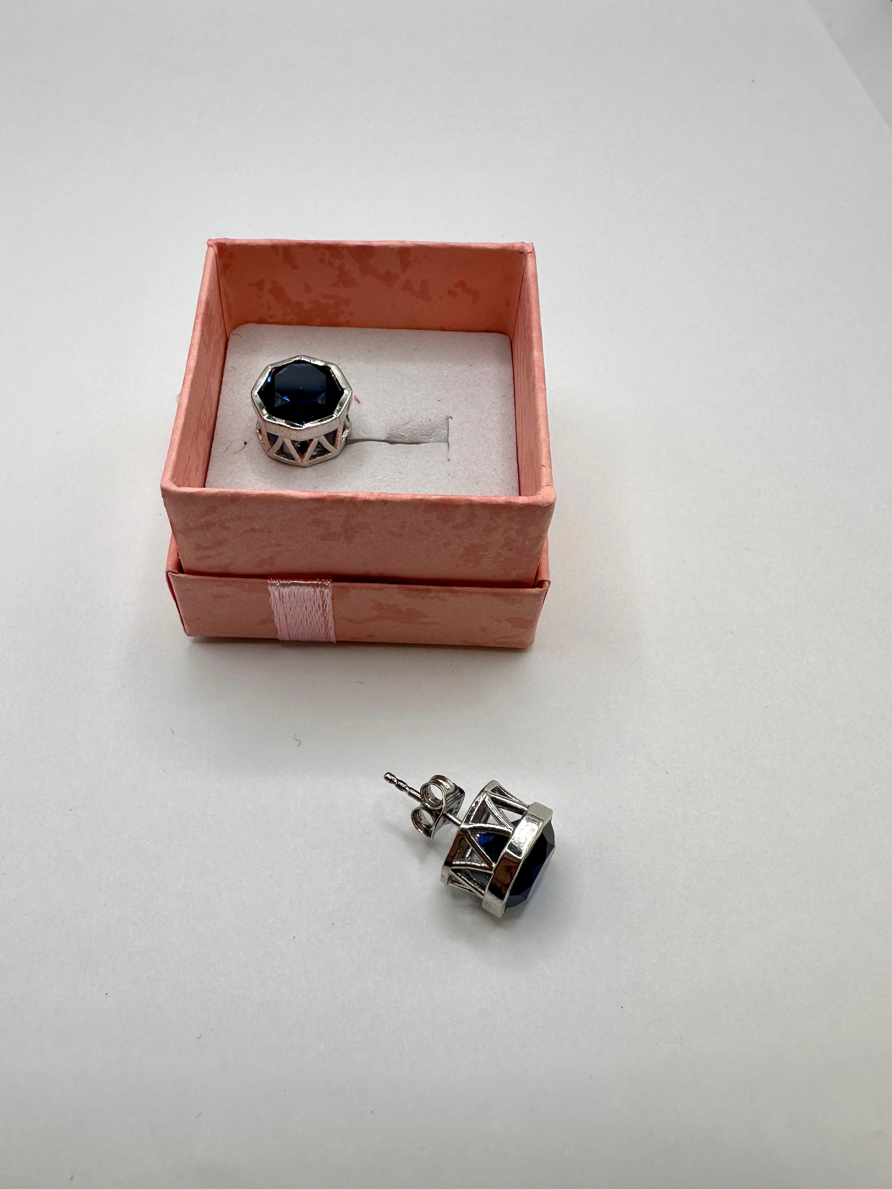A pair of modern-style stud earrings, each featuring an octagonal, faceted dark blue stone set within a silver-toned openwork metal cage. The reverse of one earring is clearly marked “S925,” indicating sterling silver for the metal components. The stones appear to be faceted glass or synthetic gemstones. The items are presented with one earring in an open pink cardboard gift box.